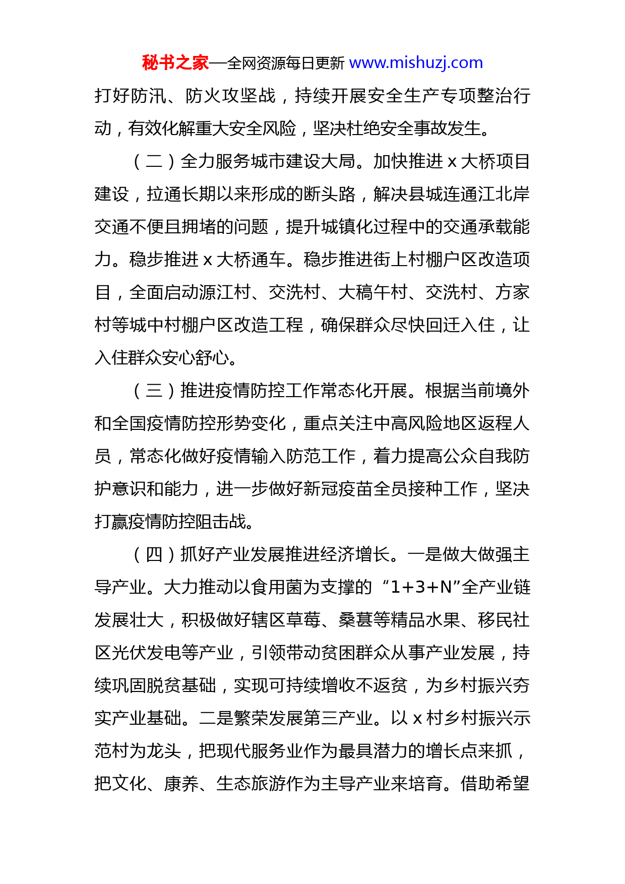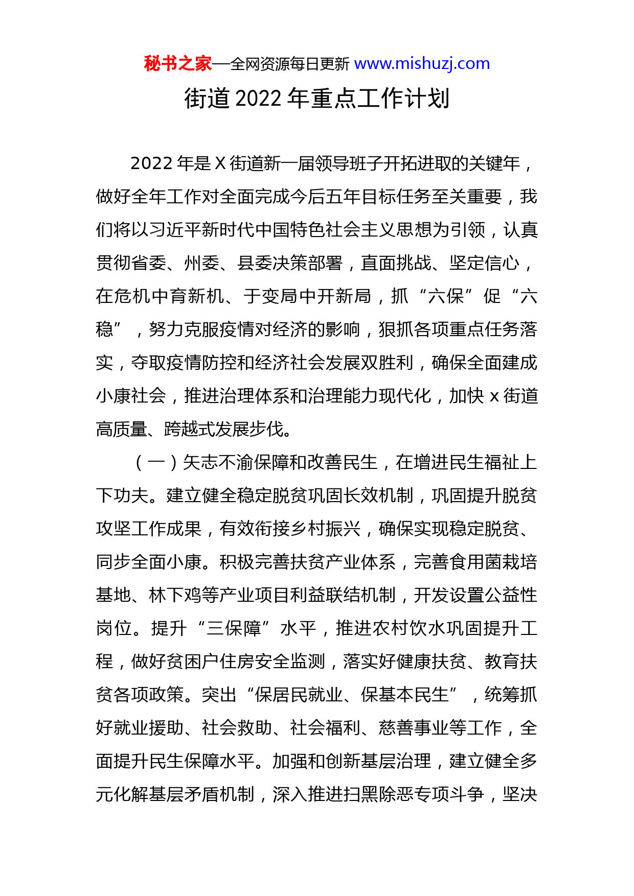 秘书之家—全网资源每日更新www.mishuzj.com街道2022年重点工作计划2022年是X街道新一届领导班子开拓进取的关键年,做好全年工作对全面完成今后五年目标任务至关重要,我们将以习近平新时代中国特色社会主义思想为引领,认真贯彻省委、州委、县委决策部署,直面挑战、坚定信心,在危机中育新机、于变局中开新局,抓“六保”促“六稳”,努力克服疫情对经济的影响,狠抓各项重点任务落实,夺取疫情防控和经济社会发展双胜利,确保全面建成小康社会,推进治理体系和治理能力现代化,加快x街道高质量、跨越式发展步伐。(一)矢志不渝保障和改善民生,在增进民生福祉上下功夫。建立健全稳定脱贫巩固长效机制,巩固提升脱贫攻坚工作成果,有效衔接乡村振兴,确保实现稳定脱贫、同步全面小康。积极完善扶贫产业体系,完善食用菌栽培基地、林下鸡等产业项目利益联结机制,开发设置公益性岗位。提升“三保障”水平,推进农村饮水巩固提升工程,做好贫困户住房安全监测,落实好健康扶贫、教育扶贫各项政策。突出“保居民就业、保基本民生”,统筹抓好就业援助、社会救助、社会福利、慈善事业等工作,全面提升民生保障水平。加强和创新基层治理,建立健全多元化解基层矛盾机制,深入推进扫黑除恶专项斗争,坚决秘书之家—全网资源每日更新www.mishuzj.com打好防汛、防火攻坚战,持续开展安全生产专项整治行动,有效化解重大安全风险,坚决杜绝安全事故发生。(二)全力服务城市建设大局。加快推进x大桥项目建设,拉通长期以来形成的断头路,解决县城连通江北岸交通不便且拥堵的问题,提升城镇化过程中的交通承载能力。稳步推进x大桥通车。稳步推进街上村棚户区改造项目,全面启动源江村、交洗村、大稿午村、交洗村、方家村等城中村棚户区改造工程,确保群众尽快回迁入住,让入住群众安心舒心。(三)推进疫情防控工作常态化开展。根据当前境外和全国疫情防控形势变化,重点关注中高风险地区返程人员,常态化做好疫情输入防范工作,着力提高公众自我防护意识和能力,进一步做好新冠疫苗全员接种工作,坚决打赢疫情防控阻击战。(四)抓好产业发展推进经济增长。一是做大做强主导产业。大力推动以食用菌为支撑的“1+3+N”全产业链发展壮大,积极做好辖区草莓、桑葚等精品水果、移民社区光伏发电等产业,引领带动贫困群众从事产业发展,持续巩固脱贫基础,实现可持续增收不返贫,为乡村振兴夯实产业基础。二是繁荣发展第三产业。以x村乡村振兴示范村为龙头,把现代服务业作为最具潜力的增长点来抓,把文化、康养、生态旅游作为主导产业来培育。借助希望秘书之家—全网资源每日更新www.mishuzj.com小镇的地理优势,整合资源、精准定位、定向招商。全力推进小镇整体提升突出生态、休闲、度假特色,促进生态旅游和休闲康养深度融合,打造特色康养和休闲度假旅游目的地。(五)推进乡村振兴示范点建设。整合区域资源优势,围绕“产业兴旺、生态宜居、乡风文明、治理有效、生活富裕”的工作总要求,有计划、有规划、有谋划地实施好乡村振兴工作,以实现“农业强、农村美、农民富”为发展宗旨,全面推进x村乡村振兴示范点建设。在基础设施建设上,持续加大x村基础设施建设力度,完善村内道路改扩建、停车场、休闲广场等基础设施建设、进一步完善x村消防水池及管网建设。在产业发展上,继续加大投入力度,打造x村精品水果采摘、生态水产、民宿体验、农家休闲为主的农旅一体化乡村振兴产业试点。(六)推进新型城镇化建设战略,城市管理逐步规范。妥善解决城区居住、环境、为民服务等生活焦点问题。以城市品质建设为导向,常态化开展城中村、城边村、易搬社区、农贸市场环境治理。以提升城区防灾减灾能力为目标,积极争取资源建设城区居民楼消防管网建设;以生态环境保护为向导,实施城区污水管网改造工程,健全完善污水垃圾收运体系,严控面源污染,推动形成绿色发展方式和生活方式。秘书之家—全网资源每日更新www.mishuzj.com(七)推进党风政风建设。紧紧围绕县委、县政府党风廉政建设的总体思路和安排部署,深入学习贯彻党的十九大和省州县三级纪委全会精神,进一步健全完善党风廉政建设责任制,全面落实党风廉政建设制度,增强党务、政务公开的时效性和透明度,切实增强两个主体责任的落实,进一步加强党员干部反腐倡廉教育,落实一级对一级负责、一级对一级承诺的要求。按照有案必查、有查必严的要求,充分发挥街道纪工委监督执纪作用,加强对党风廉政建设责任制实施过程的督促检查,对群众反映、上级转办的各类线索,发现一起,查处一起,坚决扭转侵占挪用、虚报冒领、扶贫不实等涉农扶贫领域作风和腐败问题,推进作风建设制度化、常态化。
