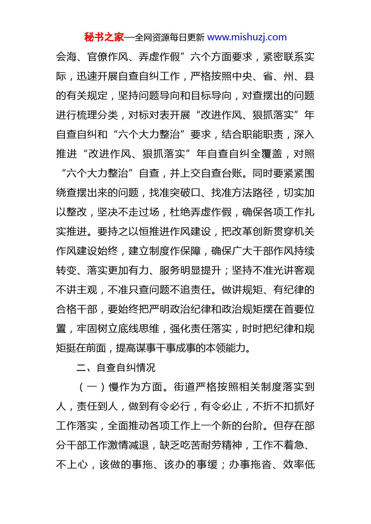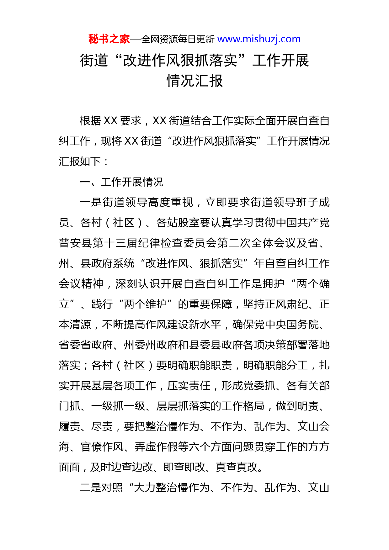 秘书之家—全网资源每日更新www.mishuzj.com街道“改进作风狠抓落实”工作开展情况汇报根据XX要求,XX街道结合工作实际全面开展自查自纠工作,现将XX街道“改进作风狠抓落实”工作开展情况汇报如下:一、工作开展情况一是街道领导高度重视,立即要求街道领导班子成员、各村(社区)、各站股室要认真学习贯彻中国共产党普安县第十三届纪律检查委员会第二次全体会议及省、州、县政府系统“改进作风、狠抓落实”年自查自纠工作会议精神,深刻认识开展自查自纠工作是拥护“两个确立”、践行“两个维护”的重要保障,坚持正风肃纪、正本清源,不断提高作风建设新水平,确保党中央国务院、省委省政府、州委州政府和县委县政府各项决策部署落地落实;各村(社区)要明确职能职责,明确职能分工,扎实开展基层各项工作,压实责任,形成党委抓、各有关部门抓、一级抓一级、层层抓落实的工作格局,做到明责、履责、尽责,要把整治慢作为、不作为、乱作为、文山会海、官僚作风、弄虚作假等六个方面问题贯穿工作的方方面面,及时边查边改、即查即改、真查真改。二是对照“大力整治慢作为、不作为、乱作为、文山秘书之家—全网资源每日更新www.mishuzj.com会海、官僚作风、弄虚作假”六个方面要求,紧密联系实际,迅速开展自查自纠工作,严格按照中央、省、州、县的有关规定,坚持问题导向和目标导向,对查摆出的问题进行梳理分类,对标对表开展“改进作风、狠抓落实”年自查自纠和“六个大力整治”要求,结合职能职责,深入推进“改进作风、狠抓落实”年自查自纠全覆盖,对照“六个大力整治”自查,并上交自查台账。同时要紧紧围绕查摆出来的问题,找准突破口、找准方法路径,切实加以整改,坚决不走过场,杜绝弄虚作假,确保各项工作扎实推进。要持之以恒推进作风建设,把改革创新贯穿机关作风建设始终,建立制度作保障,确保广大干部作风持续转变、落实更加有力、服务明显提升;坚持不准光讲客观不讲主观,不准只查问题不追责任。做讲规矩、有纪律的合格干部,要始终把严明政治纪律和政治规矩摆在首要位置,牢固树立底线思维,强化责任落实,时时把纪律和规矩挺在前面,提高谋事干事成事的本领能力。二、自查自纠情况(一)慢作为方面。街道严格按照相关制度落实到人,责任到人,做到有令必行,有令必止,不折不扣抓好工作落实,全面推动各项工作上一个新的台阶。但存在部分干部工作激情减退,缺乏吃苦耐劳精神,工作不着急、不上心,该做的事拖、该办的事缓;办事拖沓、效率低秘书之家—全网资源每日更新www.mishuzj.com下,表面认真做事,实则“出工不出力”。有的股室室对工作上一些有难度,有压力的事缓办、拖办的现象还不同程度的存在;部分同志面对困难和矛盾,瞻前顾后,存在不求有功、但求无过的思想,工作被动应付,思路不宽、措施不力、办法不多,缺乏锲而不舍、一抓到底的韧劲和狠劲,导致工作推不动、文件难落实、效果无保障。(二)不作为方面。部分干部工作中存在在其位不谋其政,不执行会议纪律,存在迟到、旷会情况。有的干部自由散漫,抱着混日子的心态,遇到事情就“推”,遇到困难就“畏”,遇到责任就“躲”,因素全找遍了,从不反省自身原因。(三)乱作为方面。街道干部严格按照法律、法规和单位规章制度的规定履行职责,经认真梳理,我街道不存在乱作为问题。(四)文山会海方面。我街道对文件、会议情况进行自查自纠。整改治理了文件层层转发情况,需要转发到各村(社区)、站股室的才进行转发,其余未要求转发和制定相关文件或涉及不到相关部门的一律停止转发和印发,按照能简就简、能并就并、能停就停的原则,严格控制各类文件,减少和控制会议次数,经自查,我街道未发现文山文海的情况。(五)官僚作风方面。部分党员干部对工作不负责,秘书之家—全网资源每日更新www.mishuzj.com缺乏事业心和敬业精神。有的表面上作风好了,门也好进,话也好听,但就是擅长踢皮球,对群众急需解决的问题推来推去,打官腔应付;有的延误重大决策的落地生根,阻滞政令通达的渠道。(六)弄虚作假方面。我街道干部在工作中尽职尽责认真帮助每一位到街道办事的群众,绝不做表面文章,绝不欺上瞒下、弄虚作假。三、原因剖析(一)理想信念不坚定。心中想的是党的事业为先,人民利益至上,信奉的是马列主义,但落实在行动上却不自觉变成实用主义和功利主义,理念和实践产生脱节,使理想信念出现扭曲。(二)管理制度存在短板。责任与职权的不匹配和界限模糊不清,是滋生不作为、乱作为基层干部的土壤:基层干部责大但权小是一个长期以来的矛盾,职权不足、协调上级部门难度大,成为许多基层干部不作为的借口;责任界定的模糊不清,提供了基层干部乱作为的机会。(三)成长机制不完善。基层干部在执政的一线,应享有与工作内容相匹配的尊严和权威,但基层发展空间小、工资待遇低,工作任务纷繁复杂,部分基层干部工作消极,甚至信仰缺失,变得不作为或者乱作为,走向群众的对立面。秘书之家—全网资源每日更新www.mishuzj.com四、下步工作打算(一)开展形式多样的思想教育。用好各种特色教育平台、廉政教育基地,就理想信念、宗旨意识、廉政法规等继续开展多角度、大力度、深层次的宣传教育。提高思想干部思想认识,增强干
