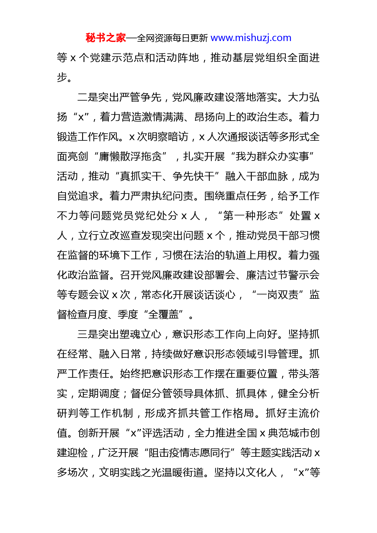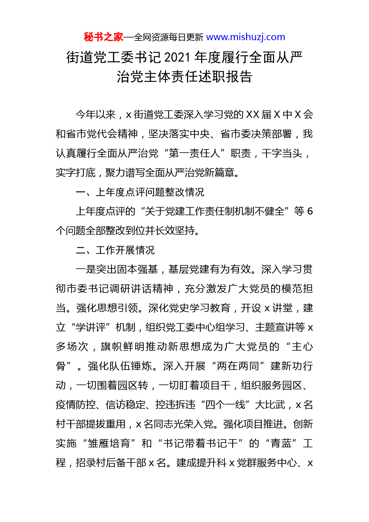 秘书之家—全网资源每日更新www.mishuzj.com街道党工委书记2021年度履行全面从严治党主体责任述职报告今年以来,x街道党工委深入学习党的XX届X中X会和省市党代会精神,坚决落实中央、省市委决策部署,我认真履行全面从严治党“第一责任人”职责,干字当头,实字打底,聚力谱写全面从严治党新篇章。一、上年度点评问题整改情况上年度点评的“关于党建工作责任制机制不健全”等6个问题全部整改到位并长效坚持。二、工作开展情况一是突出固本强基,基层党建有为有效。深入学习贯彻市委书记调研讲话精神,充分激发广大党员的模范担当。强化思想引领。深化党史学习教育,开设x讲堂,建立“学讲评”机制,组织党工委中心组学习、主题宣讲等x多场次,旗帜鲜明推动新思想成为广大党员的“主心骨”。强化队伍锤炼。深入开展“两在两同”建新功行动,一切围着园区转,一切盯着项目干,组织服务园区、疫情防控、信访稳定、控违拆违“四个一线”大比武,x名村干部提拔重用,x名同志光荣入党。强化项目推进。创新实施“雏雁培育”和“书记带着书记干”的“青蓝”工程,招录村后备干部x名。建成提升科x党群服务中心、x秘书之家—全网资源每日更新www.mishuzj.com等x个党建示范点和活动阵地,推动基层党组织全面进步。二是突出严管争先,党风廉政建设落地落实。大力弘扬“x”,着力营造激情满满、昂扬向上的政治生态。着力锻造工作作风。x次明察暗访,x人次通报谈话等多形式全面亮剑“庸懒散浮拖贪”,扎实开展“我为群众办实事”活动,推动“真抓实干、争先快干”融入干部血脉,成为自觉追求。着力严肃执纪问责。围绕重点任务,给予工作不力等问题党员党纪处分x人,“第一种形态”处置x人,立行立改巡查发现突出问题x个,推动党员干部习惯在监督的环境下工作,习惯在法治的轨道上用权。着力强化政治监督。召开党风廉政建设部署会、廉洁过节警示会等专题会议x次,常态化开展谈话谈心,“一岗双责”监督检查月度、季度“全覆盖”。三是突出塑魂立心,意识形态工作向上向好。坚持抓在经常、融入日常,持续做好意识形态领域引导管理。抓严工作责任。始终把意识形态工作摆在重要位置,带头落实,定期调度;督促分管领导具体抓、抓具体,健全分析研判等工作机制,形成齐抓共管工作格局。抓好主流价值。创新开展“x”评选活动,全力推进全国x典范城市创建迎检,广泛开展“阻击疫情志愿同行”等主题实践活动x多场次,文明实践之光温暖街道。坚持以文化人,“x”等秘书之家—全网资源每日更新www.mishuzj.com系列活动、“x”等文化品牌打造,不断满足群众精神文化需求。抓牢风险防控。坚守网络意识形态主战场,高效使用“学习强国”平台,“人人上平台、人人爱学习”氛围浓厚。积极解决民生通平台反映问题x余件,妥善化解处置舆情x起。常态化开展非法宗教“清零行动”,荣获全省侨务工作先进单位。三、存在的主要问题一是党建工作的创新亮点还不够突出;二是履行党风廉政建设“一岗双责”措施还不够扎实;三是意识形态工作新形势新任务的认识还不够深刻。四、下一步工作打算下一步,我们将坚决贯彻本次会议精神和x书记讲话要求,以更高的站位、更强的担当扛起全面从严治党主体责任,为争创国家级开发区,全市“x、x”作出新的更大贡献。一是坚持不懈夯实坚强战斗堡垒。扎实推进“党建强基”三年行动计划,组织实施“红色引擎”十项工程,筑牢建强“硬堡垒”“先锋队”,更好为园区企业提质增效、群众增收致富保驾护航。二是坚持不懈打造过硬工作作风。大力弘扬“x”,深化“四个一线”大比武,激发党员干部勇于捍卫荣誉、敢于争当尖刀,有血性、在状态,热情腾腾干事创业。秘书之家—全网资源每日更新www.mishuzj.com三是坚持不懈汇聚磅礴奋进力量。用好x讲堂,不断引导广大党员干部牢记“国之大者”,坚决捍卫“两个确立”。深化“x”创建评选,持续打造书香品牌,持续增强凝聚力向心力。