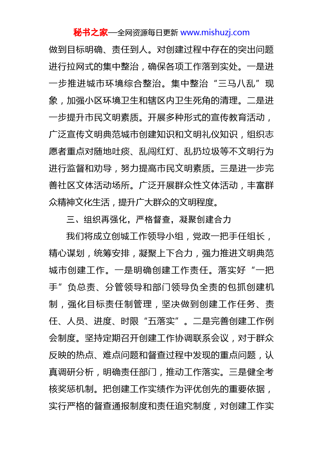 秘书之家—全网资源每日更新www.mishuzj.com街道党工委书记在全区创建全国文明典范城市推进会议上的表态发言各位领导、同志们:我市创建全国文明典范城市已进入关键阶段,X街道将本着高度的政治责任感和使命感,把创建工作摆到党委、办事处当前工作的首要位置,迅速统一思想,调优精神状态,严格按照创建的要求和标准抓落实,抓整改,确保不折不扣做好文明典范城市创建迎检的各项工作。一、认识再提升,全面发动,造浓创建氛围我们将进一步提升认识,开动所有“宣传机器”强化文明典范城市创建宣传,在辖区内围挡、沿街显著位置及小区内安装中国梦、图说我们价值观等内容的宣传板,使广大居民认知、认同并自觉践行社会主义核心价值观。通过发放《致社区居民的一封信》、《丹东市创建全国文明典范城市工作要求》和创城问卷调查等形式提高对文明典范城市创建知识的知晓率,不断增强居民创建意识,引导广大居民争做文明事、说文明话、做文明人,自觉投身到创建工作之中。二、力度再加大,全力以赴,扩大创建成果对照新版《全国文明典范城市测评体系》要求,将我街在创城中所分担的每一项工作逐条逐项再细化再分解,秘书之家—全网资源每日更新www.mishuzj.com做到目标明确、责任到人。对创建过程中存在的突出问题进行拉网式的集中整治,确保各项工作落到实处。一是进一步推进城市环境综合整治。集中整治“三马八乱”现象,加强小区环境卫生和辖区内卫生死角的清理。二是进一步提升市民文明素质。开展多种形式的宣传教育活动,广泛宣传文明典范城市创建知识和文明礼仪知识,组织志愿者重点对随地吐痰、乱闯红灯、乱扔垃圾等不文明行为进行监督和劝导,努力提高市民文明素质。三是进一步完善社区文体活动场所。广泛开展群众性文体活动,丰富群众精神文化生活,提升广大群众的文明程度。三、组织再强化,严格督查,凝聚创建合力我们将成立创城工作领导小组,党政一把手任组长,精心谋划,统筹安排,凝聚上下合力,强力推进文明典范城市创建工作。一是明确创建工作责任。落实好“一把手”负总责、分管领导和部门领导负全责的包抓创建机制,强化目标责任制管理,坚决做到创建工作任务、责任、人员、进度、时限“五落实”。二是完善创建工作例会制度。坚持定期召开创建工作协调联系会议,对于群众反映的热点、难点问题和督查过程中发现的重点问题,认真调研分析,明确责任部门,推动工作落实。三是健全考核奖惩机制。把创建工作实绩作为评优创先的重要依据,实行严格的督查通报制度和责任追究制度,对创建工作实秘书之家—全网资源每日更新www.mishuzj.com行全程督查,以查促干,以查促变,确保各项创建工作扎实推进。对推诿扯皮、工作不力的相关责任人,将“拿起问责武器”严格追究相关责任。各位领导、同志们,创建全国文明典范城市任务艰巨、时不我待,我街将进一步强化问题意识、责任意识、重点意识、执行意识,以饱满的热情、昂扬的斗志、顽强的作风、奉献的精神,全身心地投入到创建工作中去,扎扎实实做好创建工作,向区委、区政府和全街人民交上一份合格的答卷!