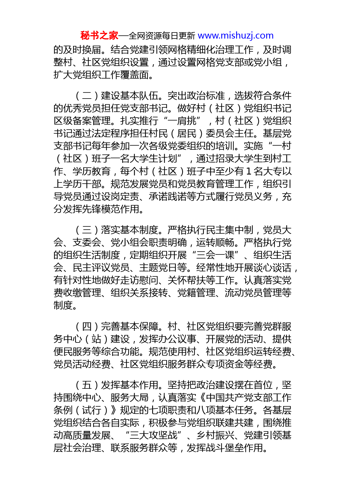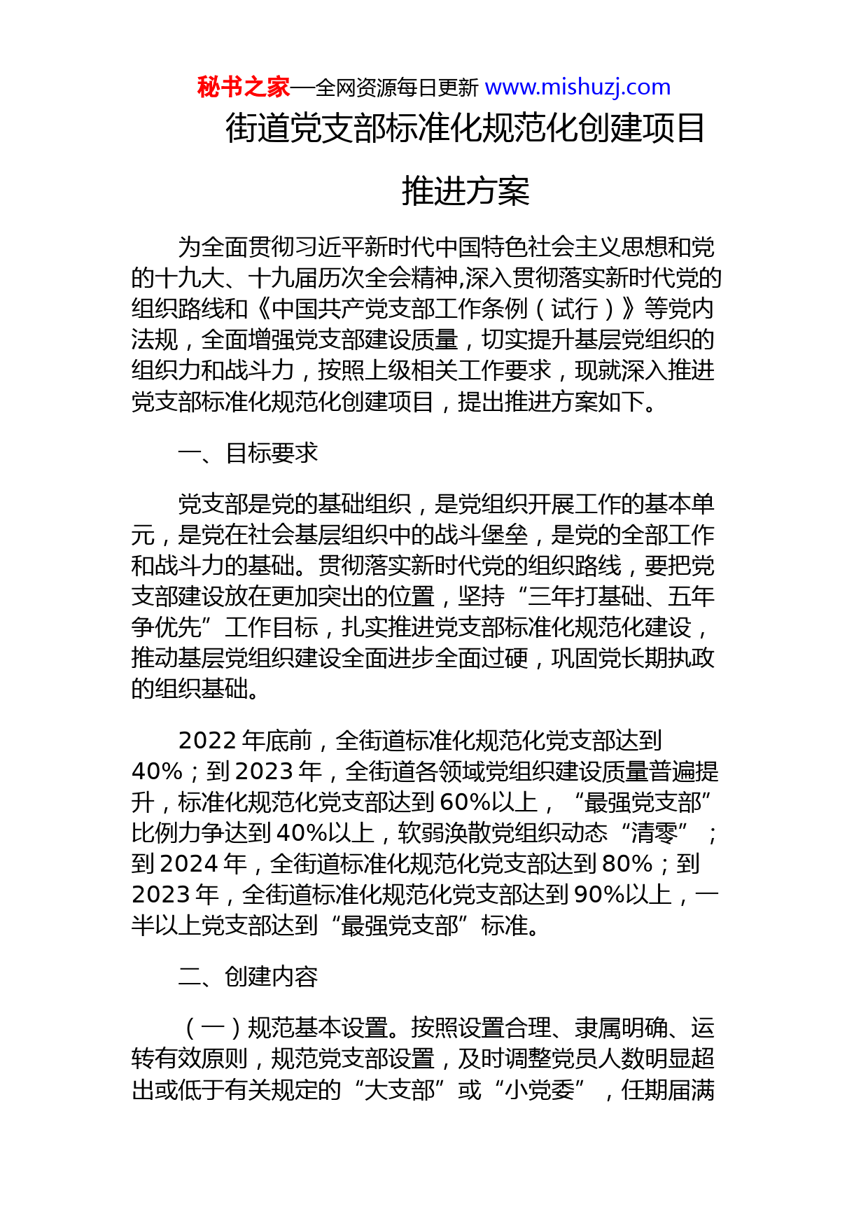 秘书之家—全网资源每日更新www.mishuzj.com街道党支部标准化规范化创建项目推进方案为全面贯彻习近平新时代中国特色社会主义思想和党的十九大、十九届历次全会精神,深入贯彻落实新时代党的组织路线和《中国共产党支部工作条例(试行)》等党内法规,全面增强党支部建设质量,切实提升基层党组织的组织力和战斗力,按照上级相关工作要求,现就深入推进党支部标准化规范化创建项目,提出推进方案如下。一、目标要求党支部是党的基础组织,是党组织开展工作的基本单元,是党在社会基层组织中的战斗堡垒,是党的全部工作和战斗力的基础。贯彻落实新时代党的组织路线,要把党支部建设放在更加突出的位置,坚持“三年打基础、五年争优先”工作目标,扎实推进党支部标准化规范化建设,推动基层党组织建设全面进步全面过硬,巩固党长期执政的组织基础。2022年底前,全街道标准化规范化党支部达到40%;到2023年,全街道各领域党组织建设质量普遍提升,标准化规范化党支部达到60%以上,“最强党支部”比例力争达到40%以上,软弱涣散党组织动态“清零”;到2024年,全街道标准化规范化党支部达到80%;到2023年,全街道标准化规范化党支部达到90%以上,一半以上党支部达到“最强党支部”标准。二、创建内容(一)规范基本设置。按照设置合理、隶属明确、运转有效原则,规范党支部设置,及时调整党员人数明显超出或低于有关规定的“大支部”或“小党委”,任期届满秘书之家—全网资源每日更新www.mishuzj.com的及时换届。结合党建引领网格精细化治理工作,及时调整村、社区党组织设置,通过设置网格党支部或党小组,扩大党组织工作覆盖面。(二)建设基本队伍。突出政治标准,选拔符合条件的优秀党员担任党支部书记。做好村(社区)党组织书记区级备案管理。扎实推行“一肩挑”,村(社区)党组织书记通过法定程序担任村民(居民)委员会主任。基层党支部书记每年参加一次各级党委组织的培训。实施“一村(社区)班子一名大学生计划”,通过招录大学生到村工作、学历教育,每个村(社区)班子中至少有1名大专以上学历干部。规范发展党员和党员教育管理工作,组织引导党员通过设岗定责、承诺践诺等方式履行党员义务,充分发挥先锋模范作用。(三)落实基本制度。严格执行民主集中制,党员大会、支委会、党小组会职责明确,运转顺畅。严格执行党的组织生活制度,定期组织开展“三会一课”、组织生活会、民主评议党员、主题党日等。经常性地开展谈心谈话,有针对性地做好走访慰问、关怀帮扶等工作。认真落实党费收缴管理、组织关系接转、党籍管理、流动党员管理等制度。(四)完善基本保障。村、社区党组织要完善党群服务中心(站)建设,发挥办公议事、开展党的活动、提供便民服务等综合功能。规范使用村、社区党组织运转经费、党员活动经费、社区党组织服务群众专项资金等经费。(五)发挥基本作用。坚持把政治建设摆在首位,坚持围绕中心、服务大局,认真落实《中国共产党支部工作条例(试行)》规定的七项职责和八项基本任务。各基层党组织结合各自实际,积极参与党组织联建共建,围绕推动高质量发展、“三大攻坚战”、乡村振兴、党建引领基层社会治理、联系服务群众等,发挥战斗堡垒作用。秘书之家—全网资源每日更新www.mishuzj.com(六)争创“最强党支部”。在全面开展党支部标准化规范化创建的基础上,对照“政治功能强、队伍建设强、组织生活强、作用发挥强、群众工作强”标准,争创“最强党支部”。(七)持续整顿软弱涣散党支部。坚持问题导向,聚焦党支部弱化、虚化、边缘化等问题,定期组织开展排查,加强工作指导,党建联合体开展联建联学联做联查联改,集中力量实施整顿转化,推动软弱涣散党支部动态“清零”。三、方法步骤按照自治区“三年打基础、五年争优先”的要求,按步骤开展创建工作,持续深入推进。(一)调研摸底。组织开展调研摸底,全面了解掌握所属党支部建设情况,综合研判,分类排队,提出年度创建计划,明确目标任务、工作措施、具体安排和责任主体。各基层党组织要认真对照建设标准进行自评,如实将党组织建设情况向街道党工委汇报。(二)全面自创。各基层党组织对照标准化规范化建设要求,结合自身实际,找不足、补短板、促提升,全面推进创建项目进展。街道党工委加强督促指导,推动党支部建设水平明显提升。(三)考评验收。党支部自评达到标准化规范化后,按照“支部申请—街道党工委考评—区委组织部验收”的程序开展考评验收。街道党工委综合采取组织评定、党员评议、群众评判、社会评价的“四评”工作机制,对参评党组织作出综合评价。1.组织评定。街道党工委根据日常了解和年度述职评议考核情况,对党支部工作予以评定。秘书之家—全网资源每日更新www.mishuzj.com2.党员评议。街道党工委结合党支部实际,合理确定民主评议指标项目,通过党支部民主评议制度予以落实。在各基层党组织开展民主评议时,各基层党支部党建联络员对评议工作进行指导。3.群众评判。在坚持邀请群众代表参与年度述职评议考核的基础上,在服务半径内通过公示、访谈、民意调查、线上评价等方式,扩大群众评价的参与范围,体现更广泛的民主性。4.社会评价。根据党支部所处领域特点,结合实际探索向相