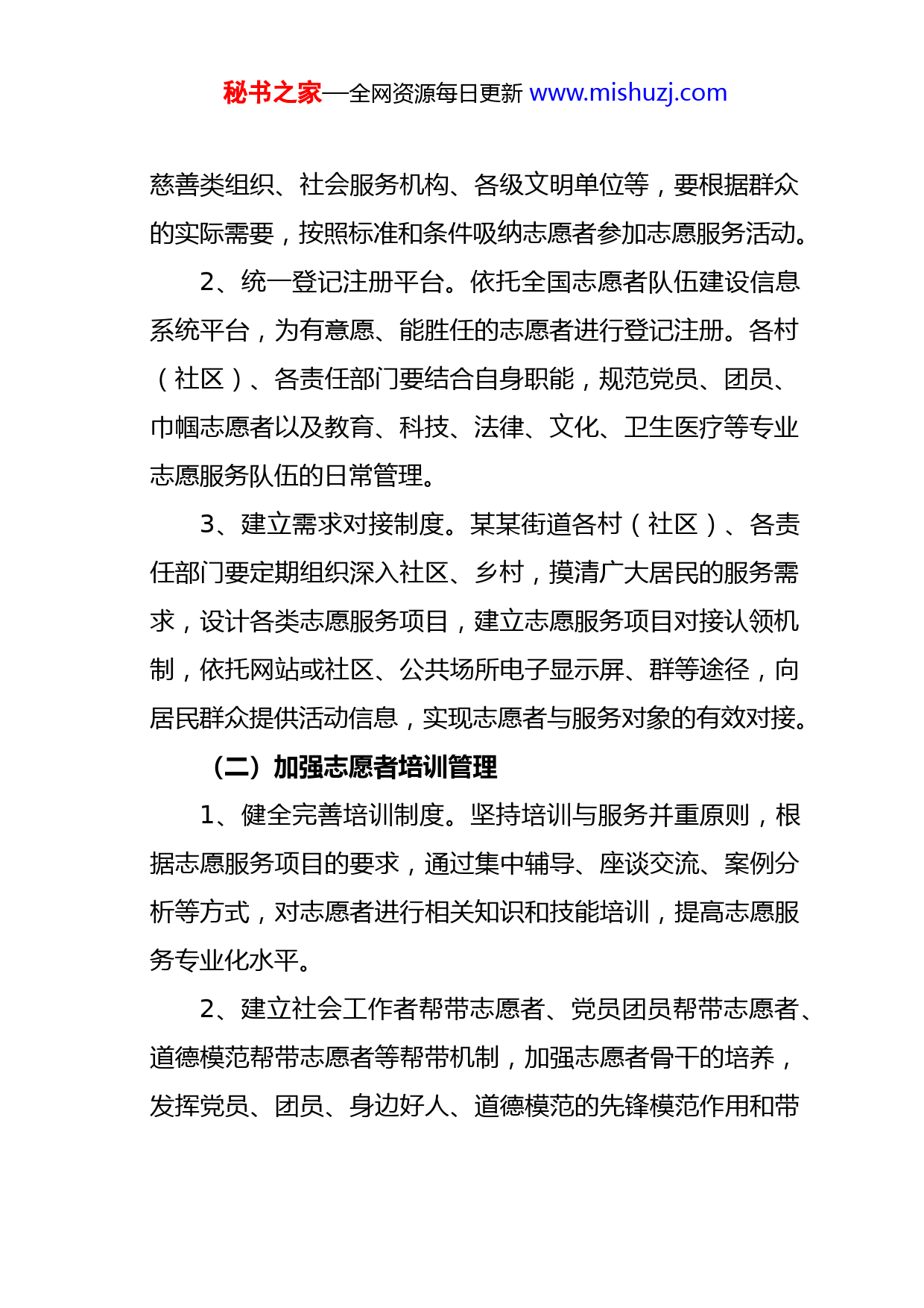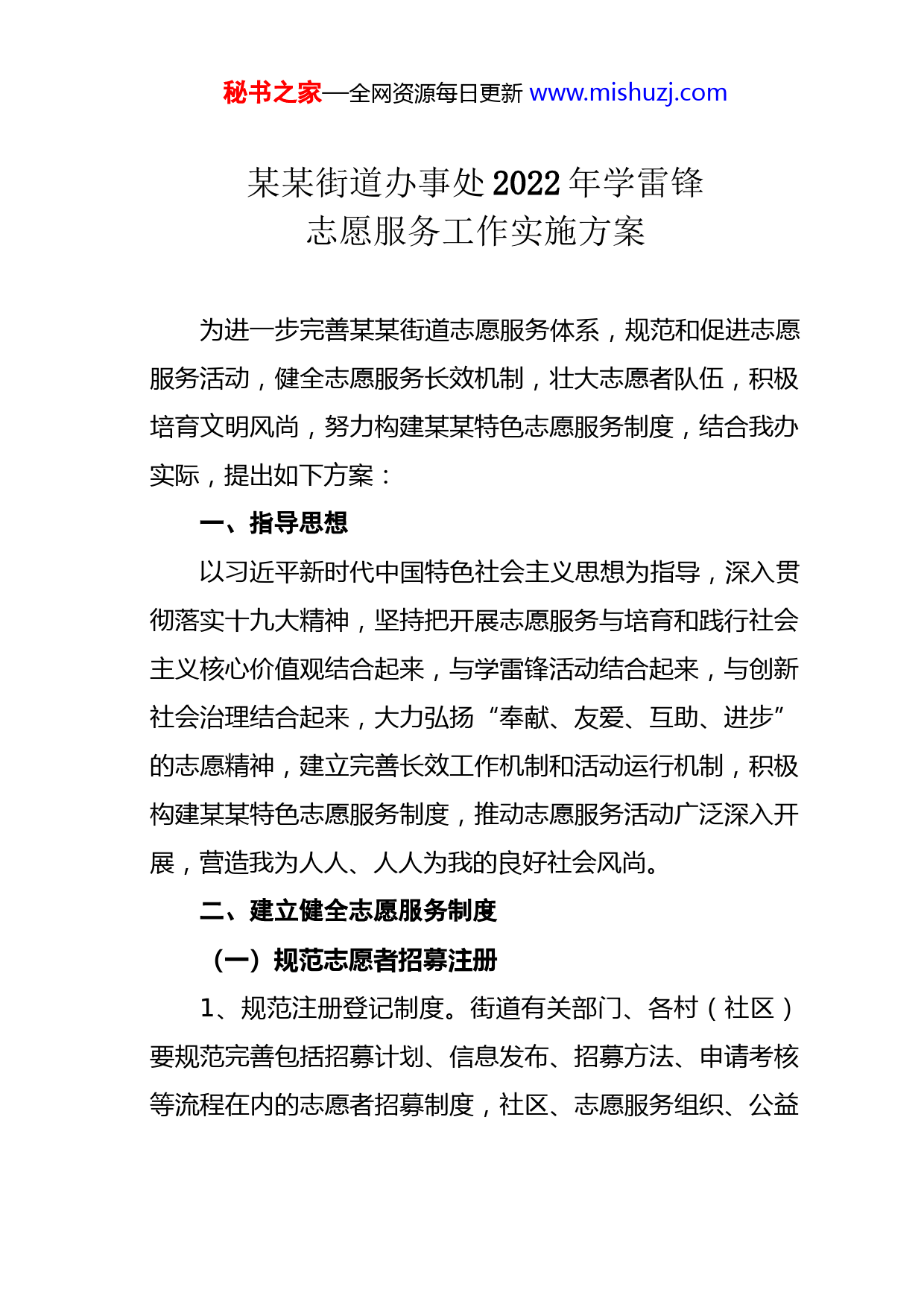 秘书之家—全网资源每日更新www.mishuzj.com某某街道办事处2022年学雷锋志愿服务工作实施方案为进一步完善某某街道志愿服务体系,规范和促进志愿服务活动,健全志愿服务长效机制,壮大志愿者队伍,积极培育文明风尚,努力构建某某特色志愿服务制度,结合我办实际,提出如下方案:一、指导思想以习近平新时代中国特色社会主义思想为指导,深入贯彻落实十九大精神,坚持把开展志愿服务与培育和践行社会主义核心价值观结合起来,与学雷锋活动结合起来,与创新社会治理结合起来,大力弘扬“奉献、友爱、互助、进步”的志愿精神,建立完善长效工作机制和活动运行机制,积极构建某某特色志愿服务制度,推动志愿服务活动广泛深入开展,营造我为人人、人人为我的良好社会风尚。二、建立健全志愿服务制度(一)规范志愿者招募注册1、规范注册登记制度。街道有关部门、各村(社区)要规范完善包括招募计划、信息发布、招募方法、申请考核等流程在内的志愿者招募制度,社区、志愿服务组织、公益秘书之家—全网资源每日更新www.mishuzj.com慈善类组织、社会服务机构、各级文明单位等,要根据群众的实际需要,按照标准和条件吸纳志愿者参加志愿服务活动。2、统一登记注册平台。依托全国志愿者队伍建设信息系统平台,为有意愿、能胜任的志愿者进行登记注册。各村(社区)、各责任部门要结合自身职能,规范党员、团员、巾帼志愿者以及教育、科技、法律、文化、卫生医疗等专业志愿服务队伍的日常管理。3、建立需求对接制度。某某街道各村(社区)、各责任部门要定期组织深入社区、乡村,摸清广大居民的服务需求,设计各类志愿服务项目,建立志愿服务项目对接认领机制,依托网站或社区、公共场所电子显示屏、群等途径,向居民群众提供活动信息,实现志愿者与服务对象的有效对接。(二)加强志愿者培训管理1、健全完善培训制度。坚持培训与服务并重原则,根据志愿服务项目的要求,通过集中辅导、座谈交流、案例分析等方式,对志愿者进行相关知识和技能培训,提高志愿服务专业化水平。2、建立社会工作者帮带志愿者、党员团员帮带志愿者、道德模范帮带志愿者等帮带机制,加强志愿者骨干的培养,发挥党员、团员、身边好人、道德模范的先锋模范作用和带秘书之家—全网资源每日更新www.mishuzj.com动作用。三、加强对志愿服务制度化的组织推动(一)切实加强志愿服务领导1、加强志愿服务的总体规划、协调指导、督促检查,各村(社区)、各责任部门要把志愿服务融入到社会治理,作为加强精神文明建设、培育和践行社会主义核心价值观的重要任务,切实抓紧抓好。2、各村(社区)、各责任部门要发挥自身优势,制定相关政策措施,各负其责、密切配合,形成共同推进志愿服务制度化的良好局面。3、支持和发展各类志愿服务组织,推动机关、企业、学校、医院等成立志愿服务队进社区服务,引导公益慈善类、城乡社区服务类社会组织到社区开展志愿服务。(二)大力弘扬志愿服务文化1、大力弘扬中华传统美德,弘扬志愿服务精神,普及志愿服务理念,培育全社会志愿服务文化自觉。发挥新闻媒体传播社会主流价值的主渠道作用,发挥精神文化产品育人化人的重要功能,积极营造有利于志愿服务的舆论文化环境。2、切实做好志愿服务宣传报道工作,及时通过政府网、精神文明建设专题、以及各类媒体加强宣传报道。秘书之家—全网资源每日更新www.mishuzj.com3、大力挖掘、培育党员、团员、身边好人等各种志愿者先进典型,在全社会营造人人参与志愿服务的浓厚氛围。积极推荐参评志愿服务典型。(三)搭建拓宽志愿服务平台1、充分发挥志愿服务的主导作用,依托新时代文明实践所(站)等综合服务设施,建立学雷锋志愿服务工作站(点),搭建志愿者、服务对象和服务项目对接平台。2、以村(社区)为重点,利用学雷锋志愿服务工作站(点)、新时代文明实践所(站、广场、基地)等有效载体,以空巢老人、留守儿童、残障人士为服务对象,围绕家政服务、文化健身、心理疏导、医疗保健、法律服务等内容,有针对性地开展活动,力争覆盖群众所需的各种服务。3、针对宣传思想文化工作和精神文明建设工作短板弱项,探索完善“开门询单、所制单、群众点单、志愿接单、社会评单”等有效机制,真心服务群众、教育引导群众、回应群众需求,把志愿服务活动做进基层、做进社区、做进家庭。4、健全党员、团员和机关干部带头开展志愿服务制度,发挥共产党员、共青团员的示范带头作用,评选各类先进工作者时,应将积极参与志愿服务情况作为评选参考条件。秘书之家—全网资源每日更新www.mishuzj.com5、立足社会发展和人民群众愿望,充分发挥好人优势,让更多的好人成为志愿服务的领军人物,打造特色志愿服务品牌。积极搭建志愿服务活动平台,不断拓展志愿服务领域,扩大志愿服务覆盖面,为百姓分忧,为政府助力。