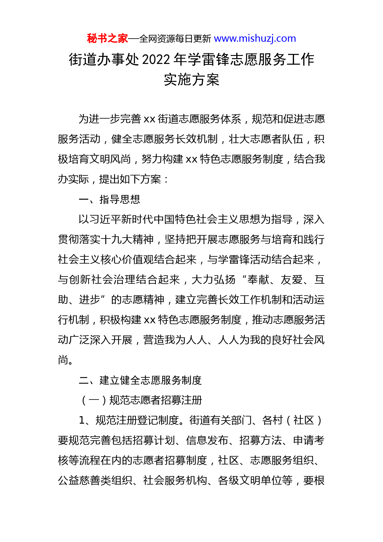秘书之家—全网资源每日更新www.mishuzj.com街道办事处2022年学雷锋志愿服务工作实施方案为进一步完善xx街道志愿服务体系,规范和促进志愿服务活动,健全志愿服务长效机制,壮大志愿者队伍,积极培育文明风尚,努力构建xx特色志愿服务制度,结合我办实际,提出如下方案:一、指导思想以习近平新时代中国特色社会主义思想为指导,深入贯彻落实十九大精神,坚持把开展志愿服务与培育和践行社会主义核心价值观结合起来,与学雷锋活动结合起来,与创新社会治理结合起来,大力弘扬“奉献、友爱、互助、进步”的志愿精神,建立完善长效工作机制和活动运行机制,积极构建xx特色志愿服务制度,推动志愿服务活动广泛深入开展,营造我为人人、人人为我的良好社会风尚。二、建立健全志愿服务制度(一)规范志愿者招募注册1、规范注册登记制度。街道有关部门、各村(社区)要规范完善包括招募计划、信息发布、招募方法、申请考核等流程在内的志愿者招募制度,社区、志愿服务组织、公益慈善类组织、社会服务机构、各级文明单位等,要根秘书之家—全网资源每日更新www.mishuzj.com据群众的实际需要,按照标准和条件吸纳志愿者参加志愿服务活动。2、统一登记注册平台。依托全国志愿者队伍建设信息系统平台,为有意愿、能胜任的志愿者进行登记注册。各村(社区)、各责任部门要结合自身职能,规范党员、团员、巾帼志愿者以及教育、科技、法律、文化、卫生医疗等专业志愿服务队伍的日常管理。3、建立需求对接制度。xx街道各村(社区)、各责任部门要定期组织深入社区、乡村,摸清广大居民的服务需求,设计各类志愿服务项目,建立志愿服务项目对接认领机制,依托网站或社区、公共场所电子显示屏、QQ群等途径,向居民群众提供活动信息,实现志愿者与服务对象的有效对接。(二)加强志愿者培训管理1、健全完善培训制度。坚持培训与服务并重原则,根据志愿服务项目的要求,通过集中辅导、座谈交流、案例分析等方式,对志愿者进行相关知识和技能培训,提高志愿服务专业化水平。2、建立社会工作者帮带志愿者、党员团员帮带志愿者、道德模范帮带志愿者等帮带机制,加强志愿者骨干的培养,发挥党员、团员、身边好人、道德模范的先锋模范作用和带动作用。秘书之家—全网资源每日更新www.mishuzj.com三、加强对志愿服务制度化的组织推动(一)切实加强志愿服务领导1、加强志愿服务的总体规划、协调指导、督促检查,各村(社区)、各责任部门要把志愿服务融入到社会治理,作为加强精神文明建设、培育和践行社会主义核心价值观的重要任务,切实抓紧抓好。2、各村(社区)、各责任部门要发挥自身优势,制定相关政策措施,各负其责、密切配合,形成共同推进志愿服务制度化的良好局面。3、支持和发展各类志愿服务组织,推动机关、企业、学校、医院等成立志愿服务队进社区服务,引导公益慈善类、城乡社区服务类社会组织到社区开展志愿服务。(二)大力弘扬志愿服务文化1、大力弘扬中华传统美德,弘扬志愿服务精神,普及志愿服务理念,培育全社会志愿服务文化自觉。发挥新闻媒体传播社会主流价值的主渠道作用,发挥精神文化产品育人化人的重要功能,积极营造有利于志愿服务的舆论文化环境。2、切实做好志愿服务宣传报道工作,及时通过政府网、精神文明建设专题、以及各类媒体加强宣传报道。3、大力挖掘、培育党员、团员、身边好人等各种志愿者先进典型,在全社会营造人人参与志愿服务的浓厚氛秘书之家—全网资源每日更新www.mishuzj.com围。积极推荐参评志愿服务典型。(三)搭建拓宽志愿服务平台1、充分发挥志愿服务的主导作用,依托新时代文明实践所(站)等综合服务设施,建立学雷锋志愿服务工作站(点),搭建志愿者、服务对象和服务项目对接平台。2、以村(社区)为重点,利用学雷锋志愿服务工作站(点)、新时代文明实践所(站、广场、基地)等有效载体,以空巢老人、留守儿童、残障人士为服务对象,围绕家政服务、文化健身、心理疏导、医疗保健、法律服务等内容,有针对性地开展活动,力争覆盖群众所需的各种服务。3、针对宣传思想文化工作和精神文明建设工作短板弱项,探索完善“开门询单、所制单、群众点单、志愿接单、社会评单”等有效机制,真心服务群众、教育引导群众、回应群众需求,把志愿服务活动做进基层、做进社区、做进家庭。4、健全党员、团员和机关干部带头开展志愿服务制度,发挥共产党员、共青团员的示范带头作用,评选各类先进工作者时,应将积极参与志愿服务情况作为评选参考条件。5、立足社会发展和人民群众愿望,充分发挥好人优势,让更多的好人成为志愿服务的领军人物,打造特色志秘书之家—全网资源每日更新www.mishuzj.com愿服务品牌。积极搭建志愿服务活动平台,不断拓展志愿服务领域,扩大志愿服务覆盖面,为百姓分忧,为政府助力。