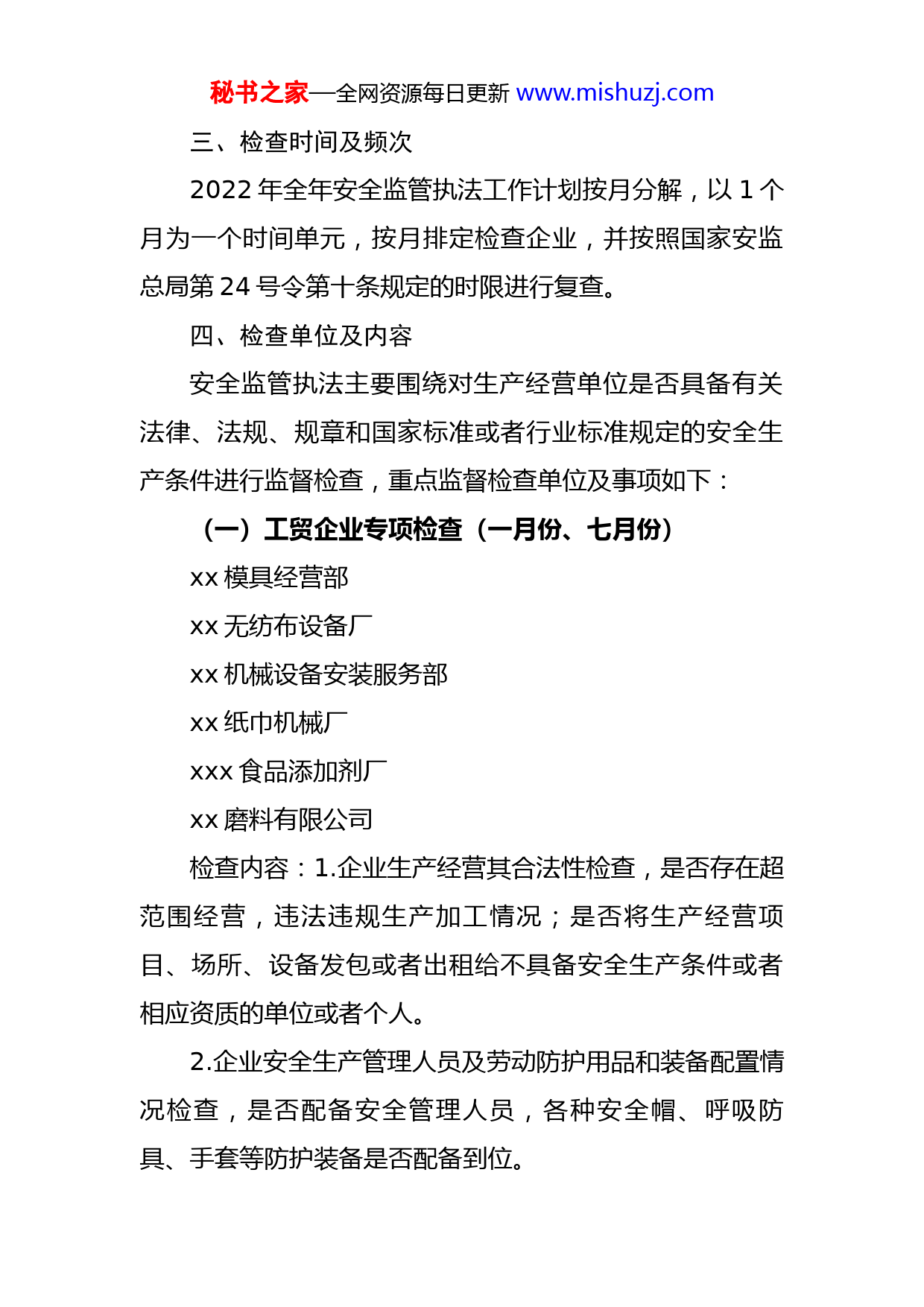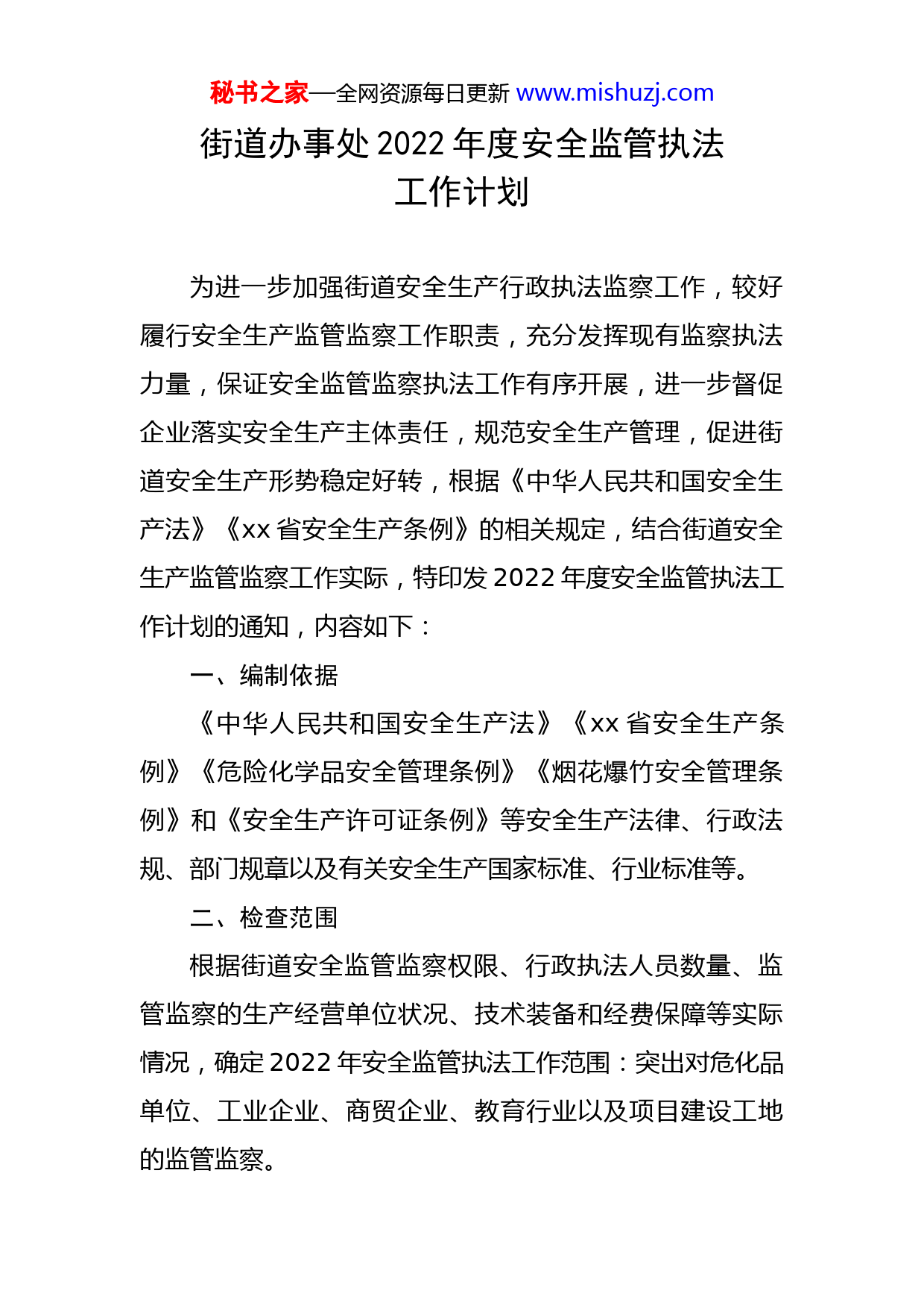 秘书之家—全网资源每日更新www.mishuzj.com街道办事处2022年度安全监管执法工作计划为进一步加强街道安全生产行政执法监察工作,较好履行安全生产监管监察工作职责,充分发挥现有监察执法力量,保证安全监管监察执法工作有序开展,进一步督促企业落实安全生产主体责任,规范安全生产管理,促进街道安全生产形势稳定好转,根据《中华人民共和国安全生产法》《xx省安全生产条例》的相关规定,结合街道安全生产监管监察工作实际,特印发2022年度安全监管执法工作计划的通知,内容如下:一、编制依据《中华人民共和国安全生产法》《xx省安全生产条例》《危险化学品安全管理条例》《烟花爆竹安全管理条例》和《安全生产许可证条例》等安全生产法律、行政法规、部门规章以及有关安全生产国家标准、行业标准等。二、检查范围根据街道安全监管监察权限、行政执法人员数量、监管监察的生产经营单位状况、技术装备和经费保障等实际情况,确定2022年安全监管执法工作范围:突出对危化品单位、工业企业、商贸企业、教育行业以及项目建设工地的监管监察。秘书之家—全网资源每日更新www.mishuzj.com三、检查时间及频次2022年全年安全监管执法工作计划按月分解,以1个月为一个时间单元,按月排定检查企业,并按照国家安监总局第24号令第十条规定的时限进行复查。四、检查单位及内容安全监管执法主要围绕对生产经营单位是否具备有关法律、法规、规章和国家标准或者行业标准规定的安全生产条件进行监督检查,重点监督检查单位及事项如下:(一)工贸企业专项检查(一月份、七月份)xx模具经营部xx无纺布设备厂xx机械设备安装服务部xx纸巾机械厂xxx食品添加剂厂xx磨料有限公司检查内容:1.企业生产经营其合法性检查,是否存在超范围经营,违法违规生产加工情况;是否将生产经营项目、场所、设备发包或者出租给不具备安全生产条件或者相应资质的单位或者个人。2.企业安全生产管理人员及劳动防护用品和装备配置情况检查,是否配备安全管理人员,各种安全帽、呼吸防具、手套等防护装备是否配备到位。秘书之家—全网资源每日更新www.mishuzj.com3.企业主体责任落实情况检查,是否落实主要负责人对本单位安全生产工作共同承担领导责任;是否落实安全管理力量,配齐配强专业安全管理人员。4.企业隐患排查治理情况检查,是否建立健全生产安全事故隐患排查治理制度,及时发现并消除事故隐患,事故隐患排查治理情况应当如实记录。(二)建筑工地专项检查(二月份、八月份)xx建筑工地xx小学扩建建筑工地xx建筑工地xx建筑工地xx建筑工地xx建筑工地xx建筑工地xx建筑工地检查内容:1.现场管理情况检查,是否存在违章指挥、冒险作业、违法操作规程的行为;是否为施工人员提供安全帽、安全绳等符合国家标准或者行业标准的劳动防护用品,并监督、教育按照使用规则佩戴。2.作业场所情况检查,施工单位应向从业人员如实告知作业场所和工作岗位存在的危险因素、防范措施以及事故应急措施;员工宿舍应当设有符合紧急疏散要求、标志明秘书之家—全网资源每日更新www.mishuzj.com显、保持畅通的出口,禁止锁闭、封堵员工宿舍的出口。3.安全设备情况检查,是否对安全设备进行经常性维护、保养,并定期检测,保证正常运转;不得使用应当淘汰的危及生产安全的工艺、设备;当有较大危险因素的有关设施、设备上,应设置明显的安全警示标志。(三)幼儿园专项检查(三月份、九月份)xx国际幼儿园xx幼儿园xx幼儿园xx幼儿园xx幼儿园检查内容:1.消安安全情况检查,园内是否建设微型消防站,是否按规定要求配置各类消防器材;是否经营性检查消防水管、消防栓状态,有检查、维修保养材料;园内各类用房按规定设置防火隔离门和疏散通道。2.食品安全情况检查,食堂工作人员须“两证”齐全,工作时须穿戴工作衣帽;生熟食品必须分开,无过期变质食品;清洗、消毒要有标记,食堂要有灭蝇灭鼠设施。(四)宾馆酒店等住宿单位专项检查(四月份、十月份)xx酒店xx酒店秘书之家—全网资源每日更新www.mishuzj.comxx酒店xx酒店xx大酒店(xx酒店)xx酒店(xx路汽车站店)xx酒店检查内容:1.基础管理情况检查,是否对消防栓、喷淋、应急照明灯及消控室等设施设备安全性能检测检验;是否定期组织单位员工开展应急救援疏散演练活动;2.教育培训情况检查,企业主要负责人和安全生产管理人员,是否具备与本单位相适应的安全生产管理能力;是否对单位员工进行符合国家和行业有关规定的安全教育培训;3.经营场所情况检查,是否在显著位置张贴放置应急疏散图、灭火器、防烟面具等设施设备;消防通道是否通畅,疏散指示标志是否清晰。(五)危化品及烟花爆竹单位专项检查(五月份、十一月份)xxx化学试剂有限公司xxx科学仪器有限公司xxx化工有限公司xx贸易有限公司xx烟花店秘书之家—全网资源每日更新www.mishuzj.com检查内容:1.经营场所情况检查,专柜与其他柜台保持一定距离,且安全通道畅通;经营场所无生火、抽烟等明火以及电线、灯具不合格等隐患。2.安全设施情况检查,经营场所配备有必要的消防器材,张贴有明显的安全警示标志。3.产品存放情况,产品堆放是否堆放整齐、稳定,不超高;存放产品数量不超过许可证载明限量;烟花爆竹产品包装箱上粘贴流向登记标识码。(六)重点餐饮场所专项