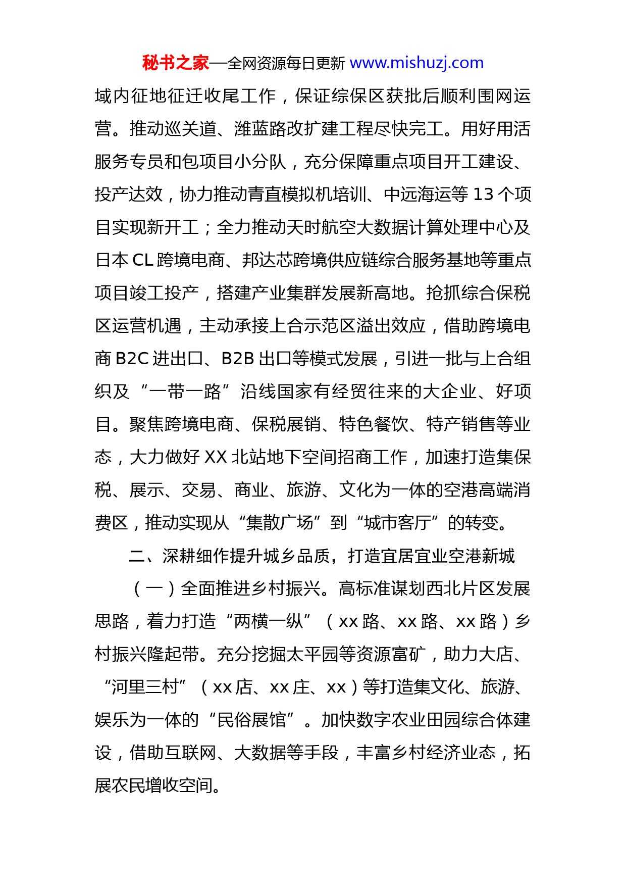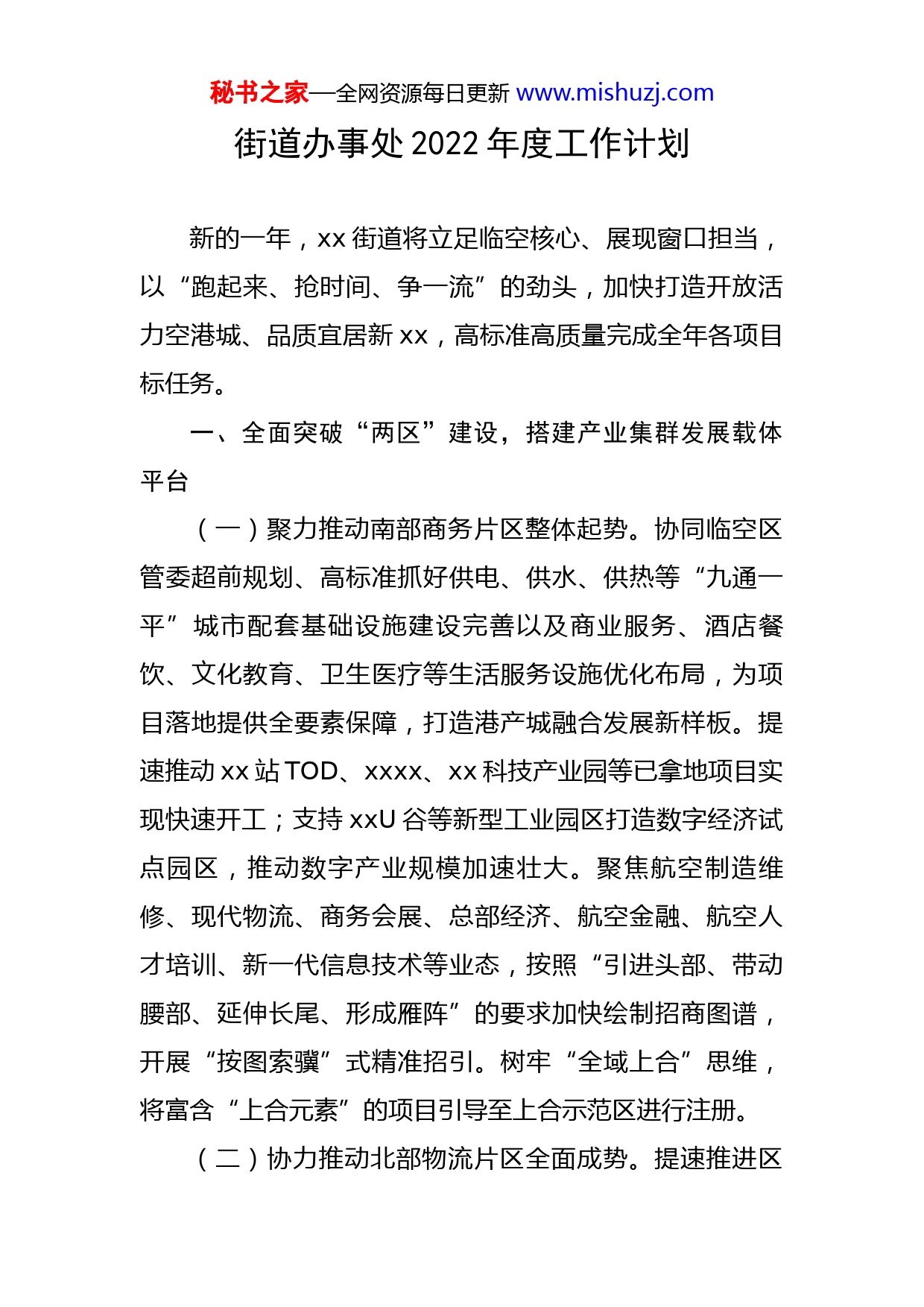 秘书之家—全网资源每日更新www.mishuzj.com街道办事处2022年度工作计划新的一年,xx街道将立足临空核心、展现窗口担当,以“跑起来、抢时间、争一流”的劲头,加快打造开放活力空港城、品质宜居新xx,高标准高质量完成全年各项目标任务。一、全面突破“两区”建设,搭建产业集群发展载体平台(一)聚力推动南部商务片区整体起势。协同临空区管委超前规划、高标准抓好供电、供水、供热等“九通一平”城市配套基础设施建设完善以及商业服务、酒店餐饮、文化教育、卫生医疗等生活服务设施优化布局,为项目落地提供全要素保障,打造港产城融合发展新样板。提速推动xx站TOD、xxxx、xx科技产业园等已拿地项目实现快速开工;支持xxU谷等新型工业园区打造数字经济试点园区,推动数字产业规模加速壮大。聚焦航空制造维修、现代物流、商务会展、总部经济、航空金融、航空人才培训、新一代信息技术等业态,按照“引进头部、带动腰部、延伸长尾、形成雁阵”的要求加快绘制招商图谱,开展“按图索骥”式精准招引。树牢“全域上合”思维,将富含“上合元素”的项目引导至上合示范区进行注册。(二)协力推动北部物流片区全面成势。提速推进区秘书之家—全网资源每日更新www.mishuzj.com域内征地征迁收尾工作,保证综保区获批后顺利围网运营。推动巡关道、潍蓝路改扩建工程尽快完工。用好用活服务专员和包项目小分队,充分保障重点项目开工建设、投产达效,协力推动青直模拟机培训、中远海运等13个项目实现新开工;全力推动天时航空大数据计算处理中心及日本CL跨境电商、邦达芯跨境供应链综合服务基地等重点项目竣工投产,搭建产业集群发展新高地。抢抓综合保税区运营机遇,主动承接上合示范区溢出效应,借助跨境电商B2C进出口、B2B出口等模式发展,引进一批与上合组织及“一带一路”沿线国家有经贸往来的大企业、好项目。聚焦跨境电商、保税展销、特色餐饮、特产销售等业态,大力做好XX北站地下空间招商工作,加速打造集保税、展示、交易、商业、旅游、文化为一体的空港高端消费区,推动实现从“集散广场”到“城市客厅”的转变。二、深耕细作提升城乡品质,打造宜居宜业空港新城(一)全面推进乡村振兴。高标准谋划西北片区发展思路,着力打造“两横一纵”(xx路、xx路、xx路)乡村振兴隆起带。充分挖掘太平园等资源富矿,助力大店、“河里三村”(xx店、xx庄、xx)等打造集文化、旅游、娱乐为一体的“民俗展馆”。加快数字农业田园综合体建设,借助互联网、大数据等手段,丰富乡村经济业态,拓展农民增收空间。秘书之家—全网资源每日更新www.mishuzj.com(二)配优公共服务资源。推动xx小学、xx一小有序纳入集团化管理,提速空港中小学、其欣小学建设进度,提升区域办学水平。实施xx卫生院标准化建设,积极争创国家级卒中中心。培育壮大居家社区养老服务行业,全域推广签约家庭养老床位,为辖区失能半失能老人提供上门服务、精准服务。深入开展移风易俗行动,弘扬时代新风,构建文明风尚。(三)补齐污水治理短板。大力实施乡村建设行动,聚焦“一步到位、应纳尽纳”目标要求,将全处剩余XX个未接入污水管网的村庄一体纳入农村污水管网优化升级,全部进入污水处理厂,彻底解决农村生活污水排放问题。(四)擦靓扮美窗口形象。扎实推进农村人居环境整治提升,倾力抓好于家村以及站前大道沿线村庄村居风貌提质改造,有序提升“两高两铁”xx段沿线净化、绿化、美化水平,新增绿化面积XX万平方米以上。启动蓝谷至xx国际机场快速通道工程、潍蓝路改扩建工程等3项交通配套工程征迁工作,集中整治顺昌路、纬五十二路、龙秀山庄西侧道路等5条微循环道路,畅通机场周边路网结构、构建便捷舒适城乡界面。三、妥善化解转场衍生问题,筑牢更高水平开放强大支撑(一)持续守牢疫情防控关口。树牢“一稳皆稳,一秘书之家—全网资源每日更新www.mishuzj.com失皆失”理念,严格落实常态化疫情防控各项举措,全力做好冷链、非冷链管控工作,抓牢疫情防控“七条工作线”,常态化做好xxxx名在xx住、租机场从业人员的分类管理工作,坚决筑牢机场疫情防控“首道防线”。(二)持续加强社会治安管控。深化平安xx、法治xx建设,依托“1+2+9+N”治安防控体系,打造街面巡防“升级版”,最大限度挤压违法犯罪空间,切实保障国际机场驻地安全稳定。(三)持续做好噪音监测治理。聚焦噪音等声值线范围外,特别是府新花园、万豪xx首府、新天地国际新城等小区未纳入降噪范围内群众的“急难愁盼”,在前期开展三轮噪音监测的基础上,提请并配合青岛机场办等做好噪音跟踪监测和补充施工范围界定等工作,切实做到“应测尽测、能降尽降”,维护好机场转场后的稳定大局。四、充分发挥党建引领作用,全面提升基层治理效能(一)聚力兜住稳定底线。稳妥做好机场第一阶段、第二阶段征迁村庄预留安置房分配工作。加强对重点对象和隐患人员的问题纾解,逐一落实“多包一”稳控措施。把握“四个到位”总体原则,扎实做好征迁遗留问题分类化解,力争年内实现机场以及南部商务区一期项目征(搬)迁遗留问题“动态清零”。(二)聚力绷紧安全底线。以安全生产大排查、大整秘书之家—全网资源每日更新www.mishuzj.com治活动为抓手,以问题隐患清零为