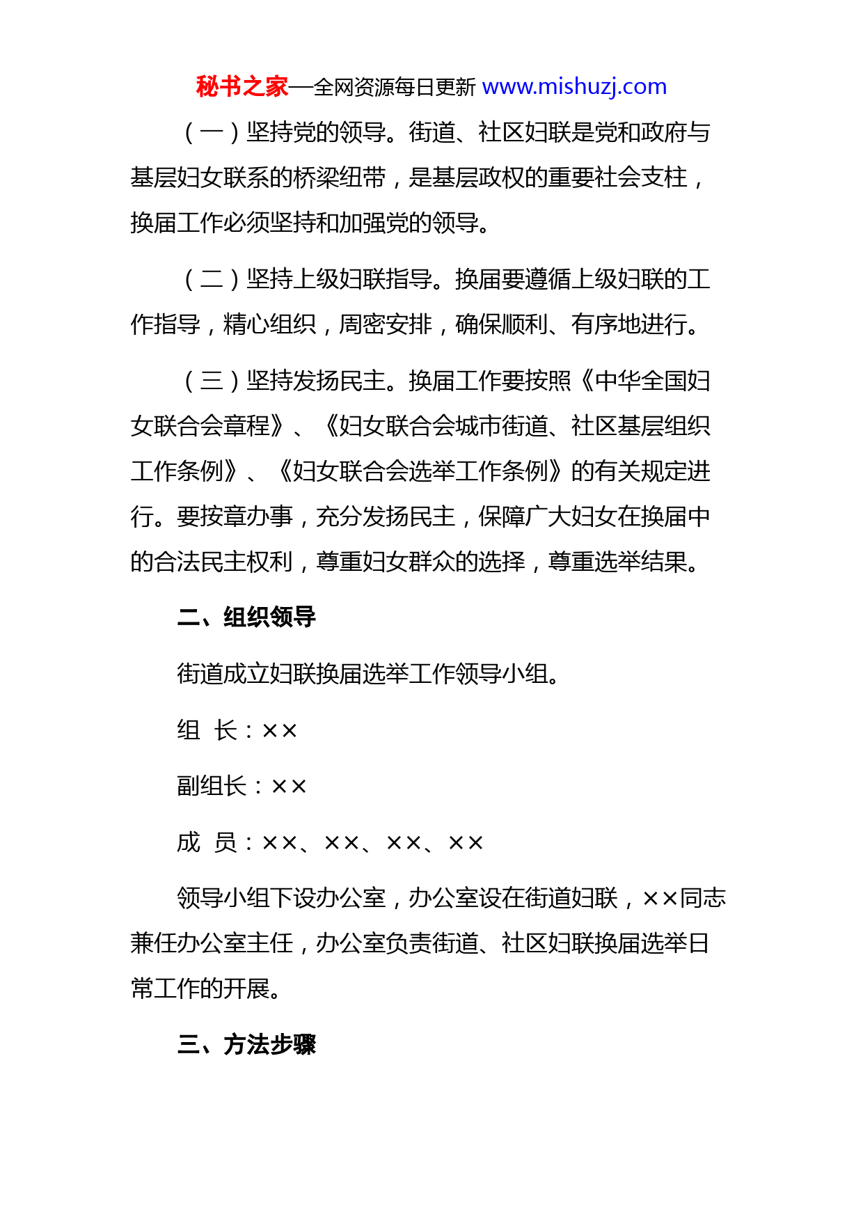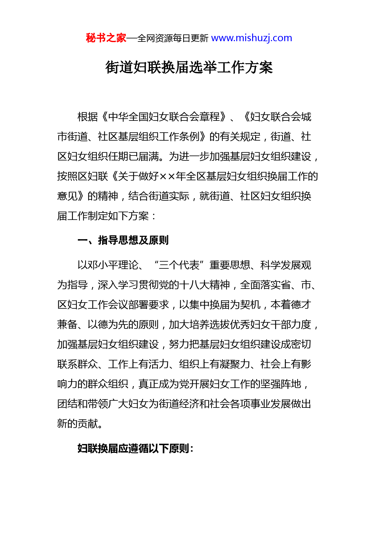 秘书之家—全网资源每日更新www.mishuzj.com街道妇联换届选举工作方案根据《中华全国妇女联合会章程》、《妇女联合会城市街道、社区基层组织工作条例》的有关规定,街道、社区妇女组织任期已届满。为进一步加强基层妇女组织建设,按照区妇联《关于做好××年全区基层妇女组织换届工作的意见》的精神,结合街道实际,就街道、社区妇女组织换届工作制定如下方案:一、指导思想及原则以邓小平理论、“三个代表”重要思想、科学发展观为指导,深入学习贯彻党的十八大精神,全面落实省、市、区妇女工作会议部署要求,以集中换届为契机,本着德才兼备、以德为先的原则,加大培养选拔优秀妇女干部力度,加强基层妇女组织建设,努力把基层妇女组织建设成密切联系群众、工作上有活力、组织上有凝聚力、社会上有影响力的群众组织,真正成为党开展妇女工作的坚强阵地,团结和带领广大妇女为街道经济和社会各项事业发展做出新的贡献。妇联换届应遵循以下原则:秘书之家—全网资源每日更新www.mishuzj.com(一)坚持党的领导。街道、社区妇联是党和政府与基层妇女联系的桥梁纽带,是基层政权的重要社会支柱,换届工作必须坚持和加强党的领导。(二)坚持上级妇联指导。换届要遵循上级妇联的工作指导,精心组织,周密安排,确保顺利、有序地进行。(三)坚持发扬民主。换届工作要按照《中华全国妇女联合会章程》、《妇女联合会城市街道、社区基层组织工作条例》、《妇女联合会选举工作条例》的有关规定进行。要按章办事,充分发扬民主,保障广大妇女在换届中的合法民主权利,尊重妇女群众的选择,尊重选举结果。二、组织领导街道成立妇联换届选举工作领导小组。组长:××副组长:××成员:××、××、××、××领导小组下设办公室,办公室设在街道妇联,××同志兼任办公室主任,办公室负责街道、社区妇联换届选举日常工作的开展。三、方法步骤秘书之家—全网资源每日更新www.mishuzj.com分三个阶段进行:第一阶段:准备阶段(7月22日——7月28日)第二阶段:实施阶段(7月29日——8月25日)第三阶段:总结阶段(8月26日——8月底)街道、社区妇联换届工作于××年××月××日前结束,具体安排见附表。四、基层妇女组织架构(一)街道妇联组织架构。街道妇联执委会原则上由13-17人构成,其中设主席1名,由街道女性副职领导兼任,在此基础上街道配备妇联专干1名。可吸纳辖区内优秀女性担任兼职副主席或执委。(二)社区妇联组织架构。社区妇联执委会原则上由5-9人构成,社区妇联设主席1名,妇联专干1名。社区妇联主席应由社区党委或居委会成员担任。可吸纳辖区内优秀女性担任兼职副主席或执委。五、基层妇联主席任职条件(一)政治素质好。拥护党的领导,坚持贯彻执行党的路线、方针、政策,具有开拓创新、与时俱进的精神和参政议政能力。秘书之家—全网资源每日更新www.mishuzj.com(二)思想积极上进。具有较强的事业心和责任感,工作认真负责,办事公道正派,并具有较好的组织协调能力。(三)乐于奉献。热爱妇女事业,热心妇女工作,能紧密联系妇女,在妇女群众中有较高的威信。六、工作要求1、加强领导。党组织要充分重视妇女工作的重要性,加强对妇女组织换届工作的领导。街道、社区妇联要在所在单位党组织领导下,认真贯彻落实相关工作。2、把握重点。基层妇女组织换届,关键是选好一套基层妇女组织班子,特别是选出一批热心为妇女儿童办实事,代表和维护妇女儿童合法权益的领头人。要摸清情况,把握思想动态,分析苗头性问题,倾听妇女群众和妇女代表的心声,做深做细思想工作,及时化解不和谐因素,营造有利于换届工作的环境,确保整个换届工作合法有序、积极稳妥地进行。3、严肃纪律。妇联组织严格按照《中华全国妇女联合会章程》、《妇女联合会城市街道,社区基层组织工作条例》、《妇女联合会选举工作条例》有关规定做好换届工秘书之家—全网资源每日更新www.mishuzj.com作,防止影响和破坏换届工作的各种现象发生,确保换届工作风清气正。4、做好离岗妇女干部的思想工作。要积极做好因年龄等原因离岗的妇女干部的思想工作,引导离岗干部继续发挥好作用,帮助、支持新一届基层妇女组织班子开展工作,共同营造团结合作、开拓进取的工作环境和氛围。对新上任的妇女干部要及时加强岗位培训,使她们尽快适应新的工作岗位。