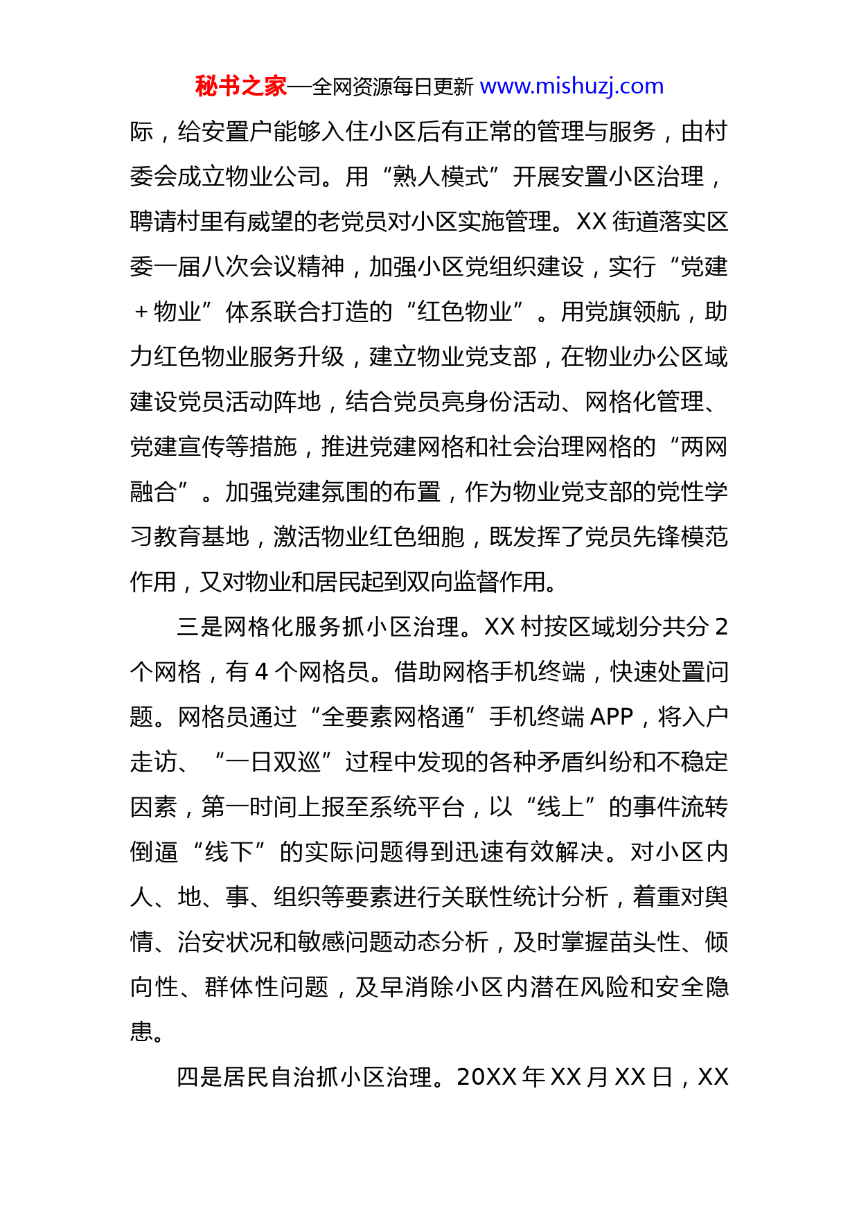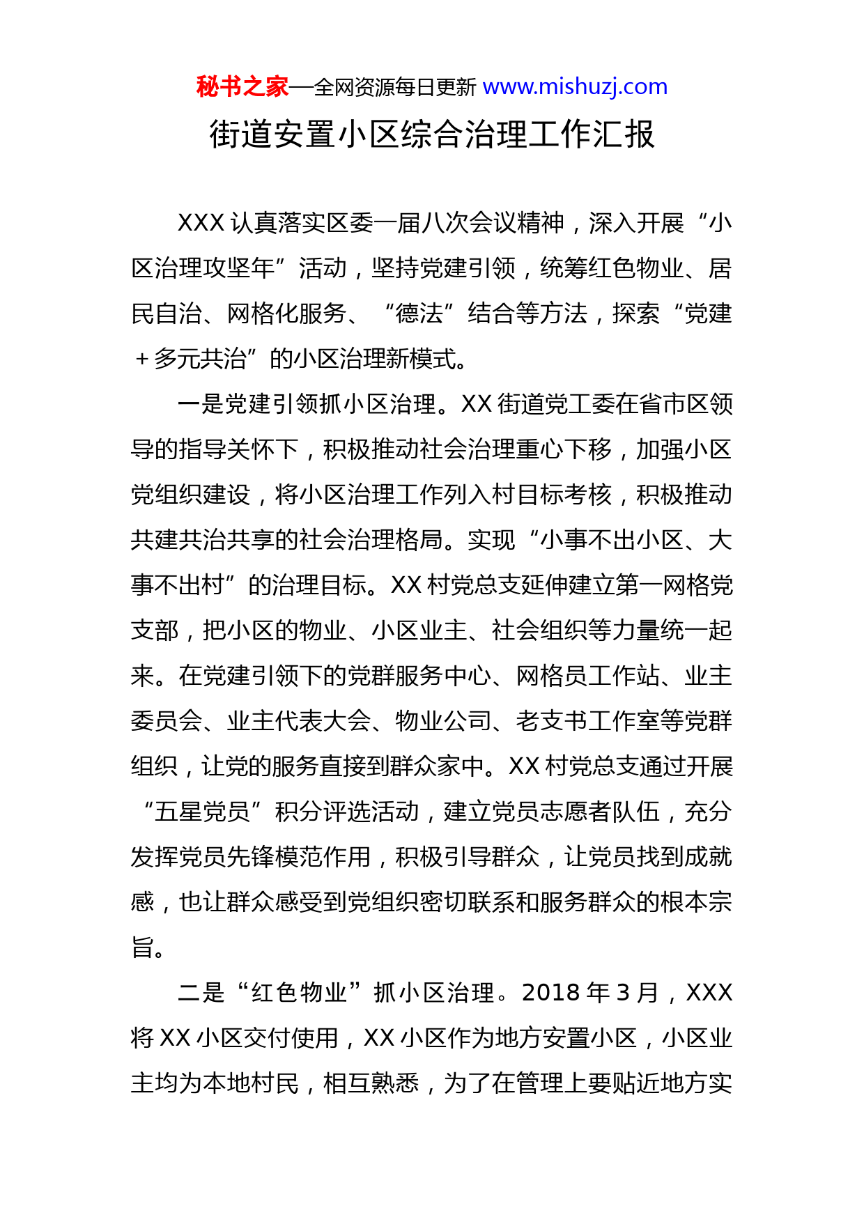 秘书之家—全网资源每日更新www.mishuzj.com街道安置小区综合治理工作汇报XXX认真落实区委一届八次会议精神,深入开展“小区治理攻坚年”活动,坚持党建引领,统筹红色物业、居民自治、网格化服务、“德法”结合等方法,探索“党建+多元共治”的小区治理新模式。一是党建引领抓小区治理。XX街道党工委在省市区领导的指导关怀下,积极推动社会治理重心下移,加强小区党组织建设,将小区治理工作列入村目标考核,积极推动共建共治共享的社会治理格局。实现“小事不出小区、大事不出村”的治理目标。XX村党总支延伸建立第一网格党支部,把小区的物业、小区业主、社会组织等力量统一起来。在党建引领下的党群服务中心、网格员工作站、业主委员会、业主代表大会、物业公司、老支书工作室等党群组织,让党的服务直接到群众家中。XX村党总支通过开展“五星党员”积分评选活动,建立党员志愿者队伍,充分发挥党员先锋模范作用,积极引导群众,让党员找到成就感,也让群众感受到党组织密切联系和服务群众的根本宗旨。二是“红色物业”抓小区治理。2018年3月,XXX将XX小区交付使用,XX小区作为地方安置小区,小区业主均为本地村民,相互熟悉,为了在管理上要贴近地方实秘书之家—全网资源每日更新www.mishuzj.com际,给安置户能够入住小区后有正常的管理与服务,由村委会成立物业公司。用“熟人模式”开展安置小区治理,聘请村里有威望的老党员对小区实施管理。XX街道落实区委一届八次会议精神,加强小区党组织建设,实行“党建+物业”体系联合打造的“红色物业”。用党旗领航,助力红色物业服务升级,建立物业党支部,在物业办公区域建设党员活动阵地,结合党员亮身份活动、网格化管理、党建宣传等措施,推进党建网格和社会治理网格的“两网融合”。加强党建氛围的布置,作为物业党支部的党性学习教育基地,激活物业红色细胞,既发挥了党员先锋模范作用,又对物业和居民起到双向监督作用。三是网格化服务抓小区治理。XX村按区域划分共分2个网格,有4个网格员。借助网格手机终端,快速处置问题。网格员通过“全要素网格通”手机终端APP,将入户走访、“一日双巡”过程中发现的各种矛盾纠纷和不稳定因素,第一时间上报至系统平台,以“线上”的事件流转倒逼“线下”的实际问题得到迅速有效解决。对小区内人、地、事、组织等要素进行关联性统计分析,着重对舆情、治安状况和敏感问题动态分析,及时掌握苗头性、倾向性、群体性问题,及早消除小区内潜在风险和安全隐患。四是居民自治抓小区治理。20XX年XX月XX日,XX秘书之家—全网资源每日更新www.mishuzj.com小区选举产生32名楼栋长,组成业主代表,成立了业主代表大会,选举首届业主委员会,表决通过XX小区《小区管理规约和业主代表大会议事规则》。XX小区的业主自治模式,为农房改善即将投入使用的多个安置小区开展自治工作起到了示范引领作用!业主通过业主代表大会制度,对业主反映的民生实事、集体规划、群众矛盾等热难点问题参与到小区管理决策中来。业委会成立以来共调解矛盾纠纷23起。针对群众反映激烈的毁绿种菜、散养宠物犬、飞线充电等问题,已得到初步解决。五是“德法”结合抓小区治理。XX小区坚持“德治”抓小区治理,通过制定小区居民公约、新村规民约等,立下规矩,破除歪风邪气。利用文化广场、道德讲堂等文化活动阵地,广泛开展弘扬社会主义核心价值观主题文化活动,引导居民崇德向善。通过“文明户”、“文明家庭”等评选活动,使先进典型引领带动大家学典型、当典型,使真善美成为大家认同的价值取向。XX小区坚持“法治”抓小区治理,XX街道定期开展法律进小区活动,组织司法所工作人员和志愿者为居民提供法律咨询、人民调解、公正引导等服务活动。引导业主学法用法,向业主宣传防盗、防诈骗、禁毒、安全等内容,倡导业主加强防范意识。让小区居民在“不经意间学法、潜移默化中守法、水到渠成中用法”。达到邻里间和谐相处,家庭之间和谐相秘书之家—全网资源每日更新www.mishuzj.com处,发挥“小区间”维护“大和谐”作用。六是多元共治抓小区治理。XX村党总支践行“234”小区治理新模式,在此基础上通过“警网”联动、聘请顾问、部门指挥、志愿者参与、人防技防联动、网格员进格、人民调解等多方联动,打造了小区治理“七巧板”。XX第一网格党支部建立每季度定期召开、遇重大事件及时召开的联席会议制度,让越来越多的服务主动贴近居民。形成了多元协商议事机制,及时沟通、协调、处理涉及小区治理的各类具体问题。XX村党总支将进一步落实区委一届八次会议精神,深入开展“小区治理攻坚年”活动,深化小区治理“234”模式,健全小区自治、法治与德治相结合的治理体系,在此基础上因地制宜、自主探索“6治理7巧板”的新模式,探寻自治活力、法治精神和德治正气,加强农村基层基础工作建设,实现无为而治,为党建引领下的社会治理工作谱新篇章!