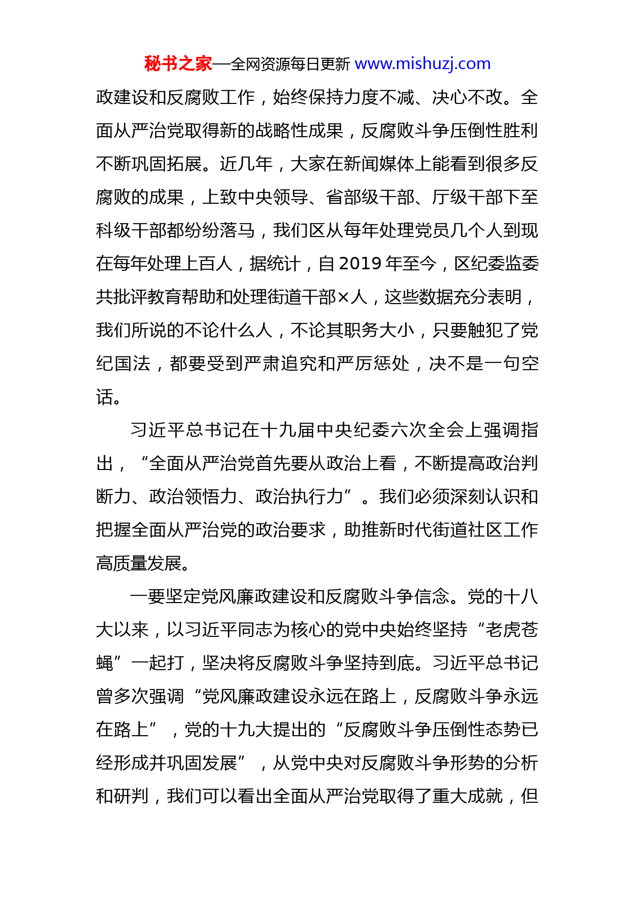 秘书之家—全网资源每日更新www.mishuzj.com街道廉政党课讲稿同志们:根据提高能力改变作风工作要求,经请示委领导同意,今天很高兴有机会和大家一起学习、共同提高。近年来,街道社区的发展大家有目共睹,街道建设呈现新气象、展现新面貌。我们街道在经济发展、社会事务、党的建设、综合治理等各项工作中有了很大提升,特别在疫情防控工作上也走在全区前列。在肯定成绩的同时,我们也清醒看到,部分街道党员干部能力作风与肩负使命还有一定差距,开展警示教育非常必要。党的十八大以来,党中央高度重视党风廉政建设和反腐败工作,明确提出对腐败行为“零容忍、全覆盖、无禁区”,充分展示了全面从严治党的坚强决心和必胜信心。本次警示教育的目的就是以案示警、以案明纪、以案为鉴、警钟长鸣,教育引导街道党员干部慎微慎独,在法纪面前不得越雷池半步,在权力面前如履薄冰,在思想上增强廉洁自律意识、筑牢拒腐防变底线。下面,我从以下三个方面,与大家进行交流:第一方面、清醒认识党风廉政建设和反腐败斗争形式依然严峻复杂党的十八大以来,党中央狠抓全面从严治党、党风廉秘书之家—全网资源每日更新www.mishuzj.com政建设和反腐败工作,始终保持力度不减、决心不改。全面从严治党取得新的战略性成果,反腐败斗争压倒性胜利不断巩固拓展。近几年,大家在新闻媒体上能看到很多反腐败的成果,上致中央领导、省部级干部、厅级干部下至科级干部都纷纷落马,我们区从每年处理党员几个人到现在每年处理上百人,据统计,自2019年至今,区纪委监委共批评教育帮助和处理街道干部×人,这些数据充分表明,我们所说的不论什么人,不论其职务大小,只要触犯了党纪国法,都要受到严肃追究和严厉惩处,决不是一句空话。习近平总书记在十九届中央纪委六次全会上强调指出,“全面从严治党首先要从政治上看,不断提高政治判断力、政治领悟力、政治执行力”。我们必须深刻认识和把握全面从严治党的政治要求,助推新时代街道社区工作高质量发展。一要坚定党风廉政建设和反腐败斗争信念。党的十八大以来,以习近平同志为核心的党中央始终坚持“老虎苍蝇”一起打,坚决将反腐败斗争坚持到底。习近平总书记曾多次强调“党风廉政建设永远在路上,反腐败斗争永远在路上”,党的十九大提出的“反腐败斗争压倒性态势已经形成并巩固发展”,从党中央对反腐败斗争形势的分析和研判,我们可以看出全面从严治党取得了重大成就,但秘书之家—全网资源每日更新www.mishuzj.com反腐败斗争形式在这一历史阶段仍然严峻复杂。中国共产党走过了百年历史,管党治党工作始终作为重要工作来抓,在党的建设方面取得了举世瞩目的成就,反腐倡廉深得民心,特别是十八大以后,始终保持反腐败斗争高压态势,政治生态不断好转,人民满意度不断提高。反腐败斗争胜利成果的取得来之不易,需要全体党员干部共同保持和呵护。二要清醒认识党风廉政建设和反腐败斗争严峻形势。十九届中央纪委六次全会上提出“尽管党风廉政建设和反腐败斗争取得了历史性成就,但形势依然严峻复杂。”现阶段我们还必须清醒认识到,腐败问题的严峻性、顽固性、隐蔽性、长期性。党的执政靠人来完成,人生观、价值观、世界观的弱化和缺失会直接或间接导致腐败问题的发生。政治问题和经济问题交织、传统腐败和新型腐败交织、腐败问题和不正之风交织的一系列案件警示我们,腐蚀和反腐蚀斗争仍然长期存在。当前取得的压倒性胜利并不是彻底胜利,全面从严治党永远在路上。腐败仍然是党面临的最大风险、最大威胁、最大挑战,腐败问题随着反腐败斗争工作的开展,不断隐形变异,发现和查处的难度不断加大,尤其是面对政治问题和经济问题交织,风险挑战和腐败问题关联,传统领域腐败和新兴领域腐败叠加,党员干部时刻面临被“围猎”、被腐蚀的风险。秘书之家—全网资源每日更新www.mishuzj.com三要深刻领会开展基层党风廉政建设的重要意义。加强基层党风廉政建设是贯彻习近平总书记重要讲话、重要指示批示精神以及党中央和省市区委决策部署的现实需要。目前综合整治三年行动、优化营商环境专项治理、煤矿领域“打非治违”等重点工作作为检验干部能力作风建设的“练兵场”和“主战场”,对于促进基层党员干部改进工作作风、提高执行政策的意识和能力,增强基层党组织的创造力、凝聚力和战斗力,推动基层经济又好又快的发展,具有十分重要的意义。街道干部作为联系党和群众的纽带,是基层组织的中坚力量,是党和府政的‘代言人’,更要不断提高对党风廉政建设重要性的认识,把党风廉政放在心上,把廉洁从政体现在行动上,做遵规守矩、遵纪守法的表率。第二方面、以案为鉴,深刻吸取基层违纪违法案件惨痛教训近年来,纪检监察机关不断加大整治群众身边腐败问题力度,一些基层的“害群之马”纷纷被揪了出来,受到党纪国法的严惩,在这里我给大家介绍几个街道发生的案例,希望大家吸取教训、引以为戒。案例1:2020年8月,我区某街道工作人员蒋某在征兵期间向应征对象家长索要1.5万元,有索贿的行为,属于受贿罪中的承诺行为,未达成受贿的结果,不构成受贿秘书之家—全网资源每日更新www.mishuzj.com罪,但构成违纪。2020年10月,蒋某受到党内警告