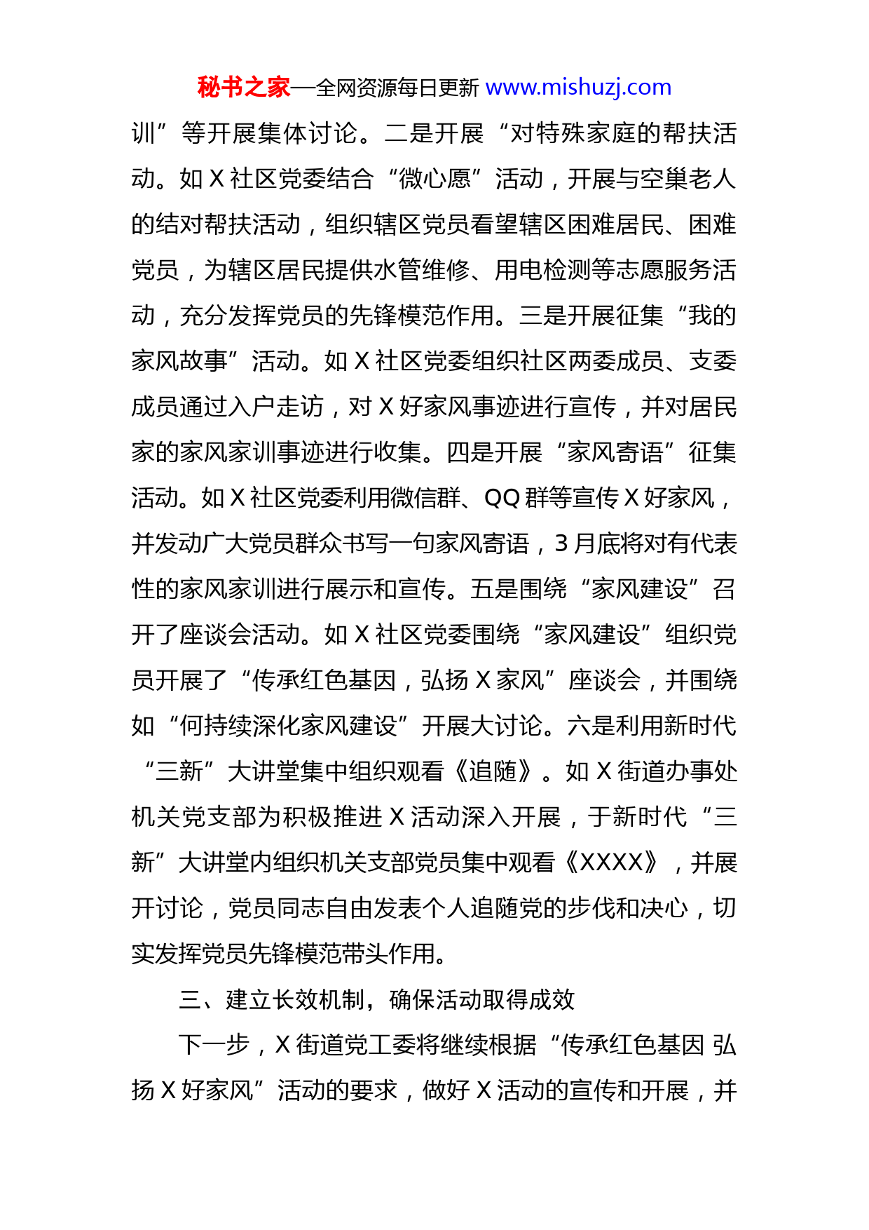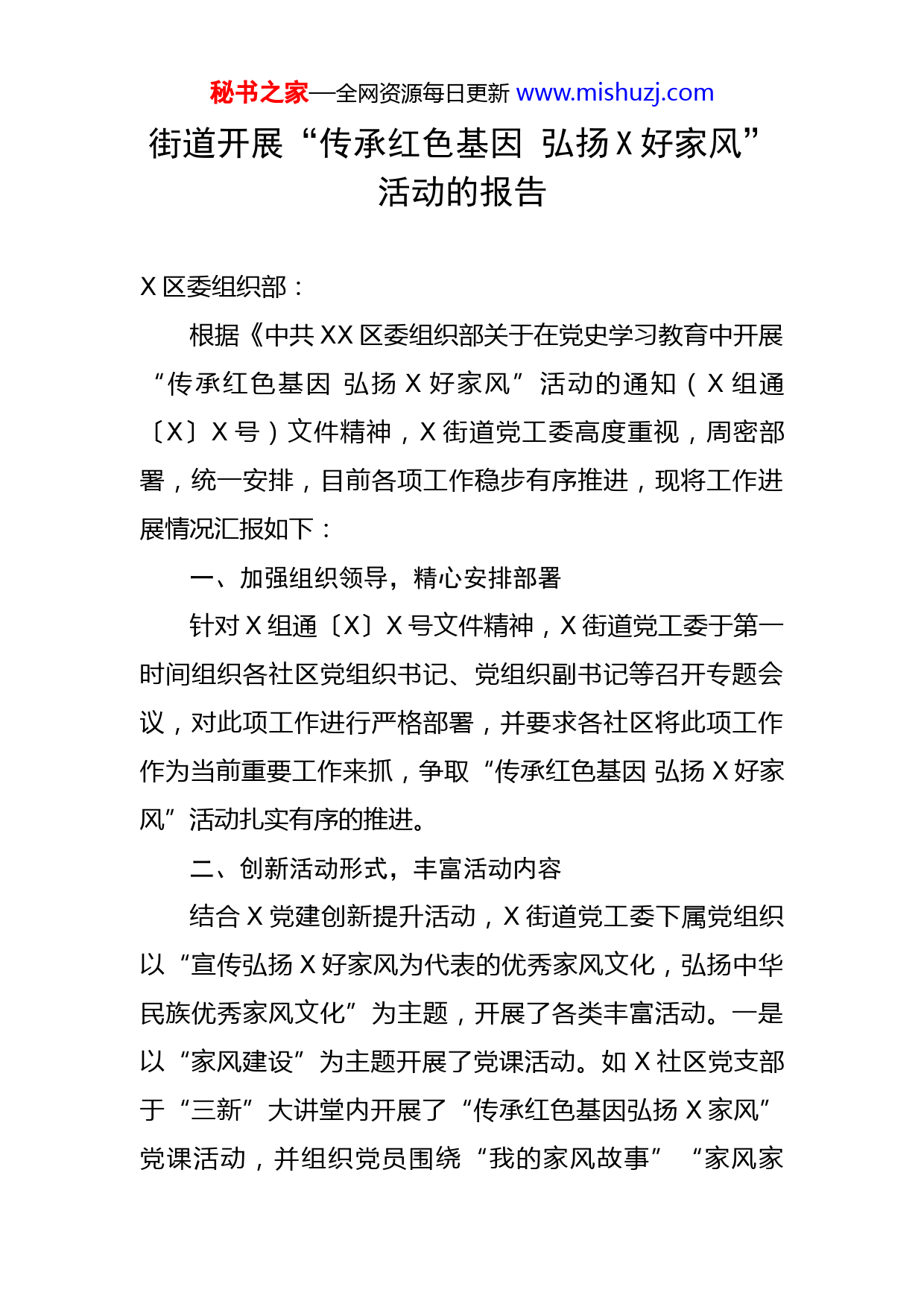 秘书之家—全网资源每日更新www.mishuzj.com街道开展“传承红色基因弘扬X好家风”活动的报告X区委组织部:根据《中共XX区委组织部关于在党史学习教育中开展“传承红色基因弘扬X好家风”活动的通知(X组通〔X〕X号)文件精神,X街道党工委高度重视,周密部署,统一安排,目前各项工作稳步有序推进,现将工作进展情况汇报如下:一、加强组织领导,精心安排部署针对X组通〔X〕X号文件精神,X街道党工委于第一时间组织各社区党组织书记、党组织副书记等召开专题会议,对此项工作进行严格部署,并要求各社区将此项工作作为当前重要工作来抓,争取“传承红色基因弘扬X好家风”活动扎实有序的推进。二、创新活动形式,丰富活动内容结合X党建创新提升活动,X街道党工委下属党组织以“宣传弘扬X好家风为代表的优秀家风文化,弘扬中华民族优秀家风文化”为主题,开展了各类丰富活动。一是以“家风建设”为主题开展了党课活动。如X社区党支部于“三新”大讲堂内开展了“传承红色基因弘扬X家风”党课活动,并组织党员围绕“我的家风故事”“家风家秘书之家—全网资源每日更新www.mishuzj.com训”等开展集体讨论。二是开展“对特殊家庭的帮扶活动。如X社区党委结合“微心愿”活动,开展与空巢老人的结对帮扶活动,组织辖区党员看望辖区困难居民、困难党员,为辖区居民提供水管维修、用电检测等志愿服务活动,充分发挥党员的先锋模范作用。三是开展征集“我的家风故事”活动。如X社区党委组织社区两委成员、支委成员通过入户走访,对X好家风事迹进行宣传,并对居民家的家风家训事迹进行收集。四是开展“家风寄语”征集活动。如X社区党委利用微信群、QQ群等宣传X好家风,并发动广大党员群众书写一句家风寄语,3月底将对有代表性的家风家训进行展示和宣传。五是围绕“家风建设”召开了座谈会活动。如X社区党委围绕“家风建设”组织党员开展了“传承红色基因,弘扬X家风”座谈会,并围绕如“何持续深化家风建设”开展大讨论。六是利用新时代“三新”大讲堂集中组织观看《追随》。如X街道办事处机关党支部为积极推进X活动深入开展,于新时代“三新”大讲堂内组织机关支部党员集中观看《XXXX》,并展开讨论,党员同志自由发表个人追随党的步伐和决心,切实发挥党员先锋模范带头作用。三、建立长效机制,确保活动取得成效下一步,X街道党工委将继续根据“传承红色基因弘扬X好家风”活动的要求,做好X活动的宣传和开展,并秘书之家—全网资源每日更新www.mishuzj.com依托新时代“三新”大讲堂建设,将“传承红色基因弘扬X好家风”活动持续深入推进,把学习弘扬“X好家风”作为一种使命、责任和追求,融入骨髓、形成自觉、成为习惯。