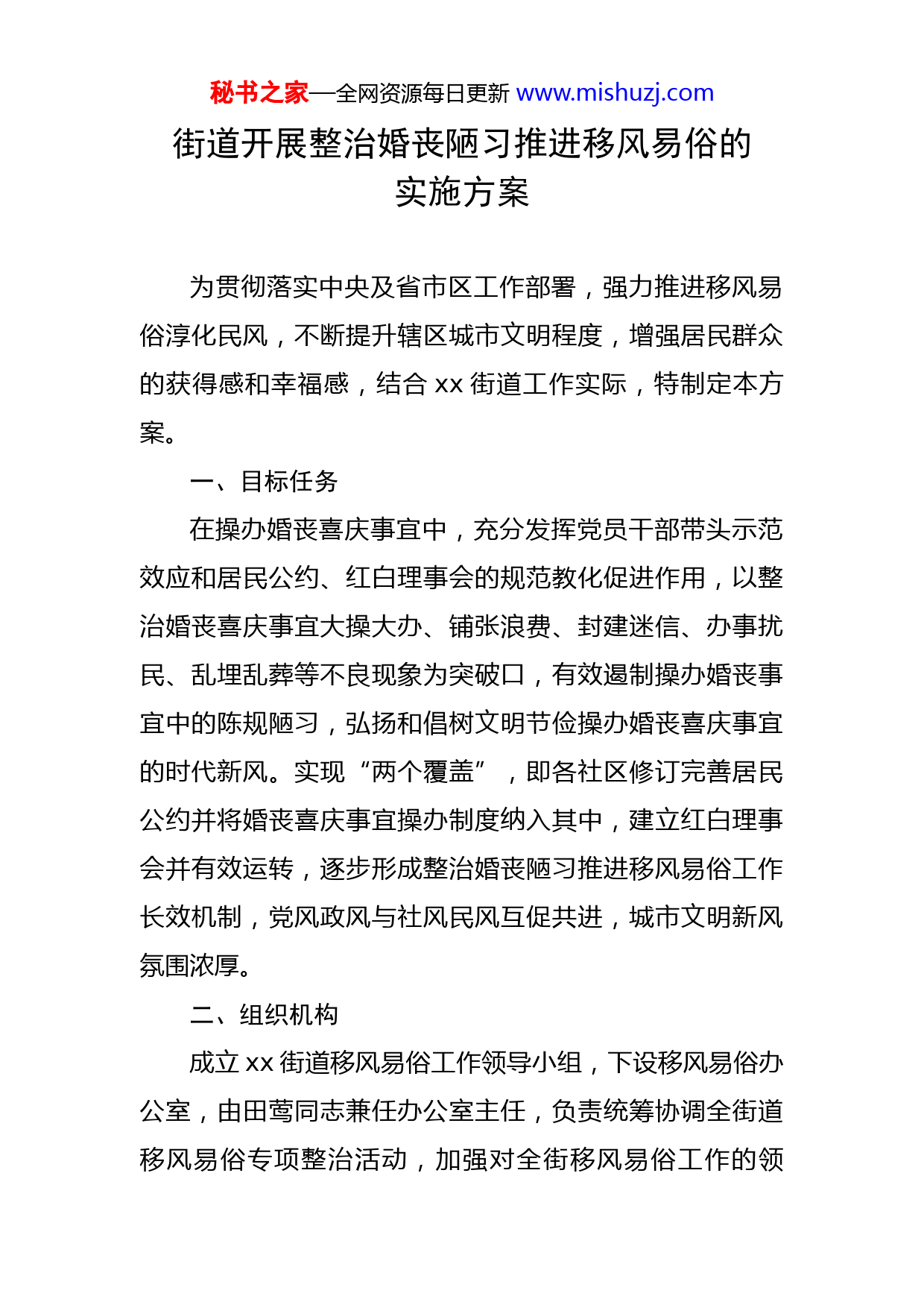 秘书之家—全网资源每日更新www.mishuzj.com街道开展整治婚丧陋习推进移风易俗的实施方案为贯彻落实中央及省市区工作部署,强力推进移风易俗淳化民风,不断提升辖区城市文明程度,增强居民群众的获得感和幸福感,结合xx街道工作实际,特制定本方案。一、目标任务在操办婚丧喜庆事宜中,充分发挥党员干部带头示范效应和居民公约、红白理事会的规范教化促进作用,以整治婚丧喜庆事宜大操大办、铺张浪费、封建迷信、办事扰民、乱埋乱葬等不良现象为突破口,有效遏制操办婚丧事宜中的陈规陋习,弘扬和倡树文明节俭操办婚丧喜庆事宜的时代新风。实现“两个覆盖”,即各社区修订完善居民公约并将婚丧喜庆事宜操办制度纳入其中,建立红白理事会并有效运转,逐步形成整治婚丧陋习推进移风易俗工作长效机制,党风政风与社风民风互促共进,城市文明新风氛围浓厚。二、组织机构成立xx街道移风易俗工作领导小组,下设移风易俗办公室,由田莺同志兼任办公室主任,负责统筹协调全街道移风易俗专项整治活动,加强对全街移风易俗工作的领秘书之家—全网资源每日更新www.mishuzj.com导。组长:副组长:成员单位:党政综合办、基层党建办、财政所、城市管理办、公共安全办、公共服务办、网格化综合服务中心、政务服务中心、各社区三、主要内容(一)发挥党员干部的带头示范作用党员干部要充分发挥先锋模范作用,严格执行落实“四项严禁”“三项推进”“三项程序”要求,为群众树立标杆,做出表率。1、严格执行“四项严禁”。一是严禁变相收(送)礼和铺张浪费。二是严禁封建迷信活动和办事扰民。三是严禁使用一次性不可降解塑料制品。四是严禁违规修建墓地。2、积极倡导“三项推进”。推进婚事新办,提倡现代文明婚礼仪式。推进丧事简办,提倡文明治丧礼仪。推进孝老爱亲,传承和弘扬孝老敬亲、厚养薄葬、慎终追远等优秀传统文化和家庭美德。3、全面落实“两项程序”。实施“一承诺”“两报告”的规定:“一承诺”,即围绕落实“四项严禁”“三项推进”要求,组织党员干部100%完成承诺书签订工秘书之家—全网资源每日更新www.mishuzj.com作。“两报告”,即党员干部应当在操办婚礼10个工作日前向所在单位报告,说明操办事宜、时间、地点、邀请人数及范围等情况,并于事后10个工作日内报告遵守承诺情况。操办葬礼的,应于事后10个工作日内报告实际情况。(二)引导居民群众积极参与移风易俗工作街道重视居民自治的促进作用,指导社区成立红白理事会,将整治婚丧陋习推进移风易俗的目标任务和工作要求纳入居民公约和红白理事会章程,全面推进“七项倡导”,以点带面,教育引导群众参与整治婚丧陋习推进移风易俗。在群众中推行“七项倡导”:一是倡导限制请客名目和规模。二是倡导禁放限放烟花鞭炮。三是倡导不使用一次性不可降解塑料制品。四是倡导不搞封建迷信活动。五是倡导在公益性墓地集中安葬。六是倡导摒弃繁文缛节。七是倡导办事不扰民。(三)进一步完善基层自治组织切实发挥群众主体作用,按照“因地制宜,便于落实”的原则,进一步完善居自治组织,完善居民公约,形成自治约束力量。重点抓好“三项工作”:1、制定居民公约。引导群众广泛参与制定、补充、修改居民公约,各社区制定完善符合社区实际的居民公约,将整治婚丧陋习推进移风易俗内容纳入其中,并通过居民代表大会进行表决,加强群众的自我约束力,倡导婚事新秘书之家—全网资源每日更新www.mishuzj.com办、丧事简办、其他不办的文明新风。2、成立红白理事会。各社区按程序成立红白理事会,并做好登记备案、培训管理相关工作。红白理事会要制定婚丧事项操办章程,明确违约责任,建立并落实群众操办婚丧喜庆事项的信息管理、责任落实、上门监督、全程跟踪等工作制度。各社区要将理事会成员公示上墙,广大群众办理婚丧喜庆事宜,要先向理事会报备,由理事会发放告知书并拿出具体操办审核意见,自觉接受红白理事会的监督。3.明确奖惩办法。街道纪检监察室、公共服务办对社区婚丧喜庆事宜办理情况进行常态化督查,对大操大办的行为要及时劝导制止并通报,对文明节俭操办的先进典型予以鼓励。各社区居民委员会和红白理事会根据居民公约以“红黑榜”等各种形式对大操大办等正反面典型进行奖励鼓励和批评惩戒,并辅以取消低保补助、评先评优等行之有效的惩戒措施。四、工作要求(一)加强组织领导。移风易俗领导小组加强领导协调,实行“一社一策”,各联点干部要深入联点单位指导、督促移风易俗工作。各社区要认真传达落实本方案要求,把移风易俗工作纳入工作总体安排,加强对红白理事会的领导和监管,有序推进移风易俗工作。秘书之家—全网资源每日更新www.mishuzj.com(二)明确工作责任。社区要明确工作目标、细化工作任务,明确时间要求,确保责任到人。要根据实际,广泛征求群众意见,制定契合实际的居民公约,完善红白事会操作程序等,让移风易俗成为群众自己的责任。(三)强化宣传教育。大力开展“移风易俗我承诺、我践行”活动,组织短信、微信群、横幅、宣传栏、上户宣传等形式大力宣传移风易俗相关规定,开展“好邻居”“好公婆”评选和寻找“最美家庭”等活动,讲好感人故事,传播家庭美德,形成浓厚的舆论氛围