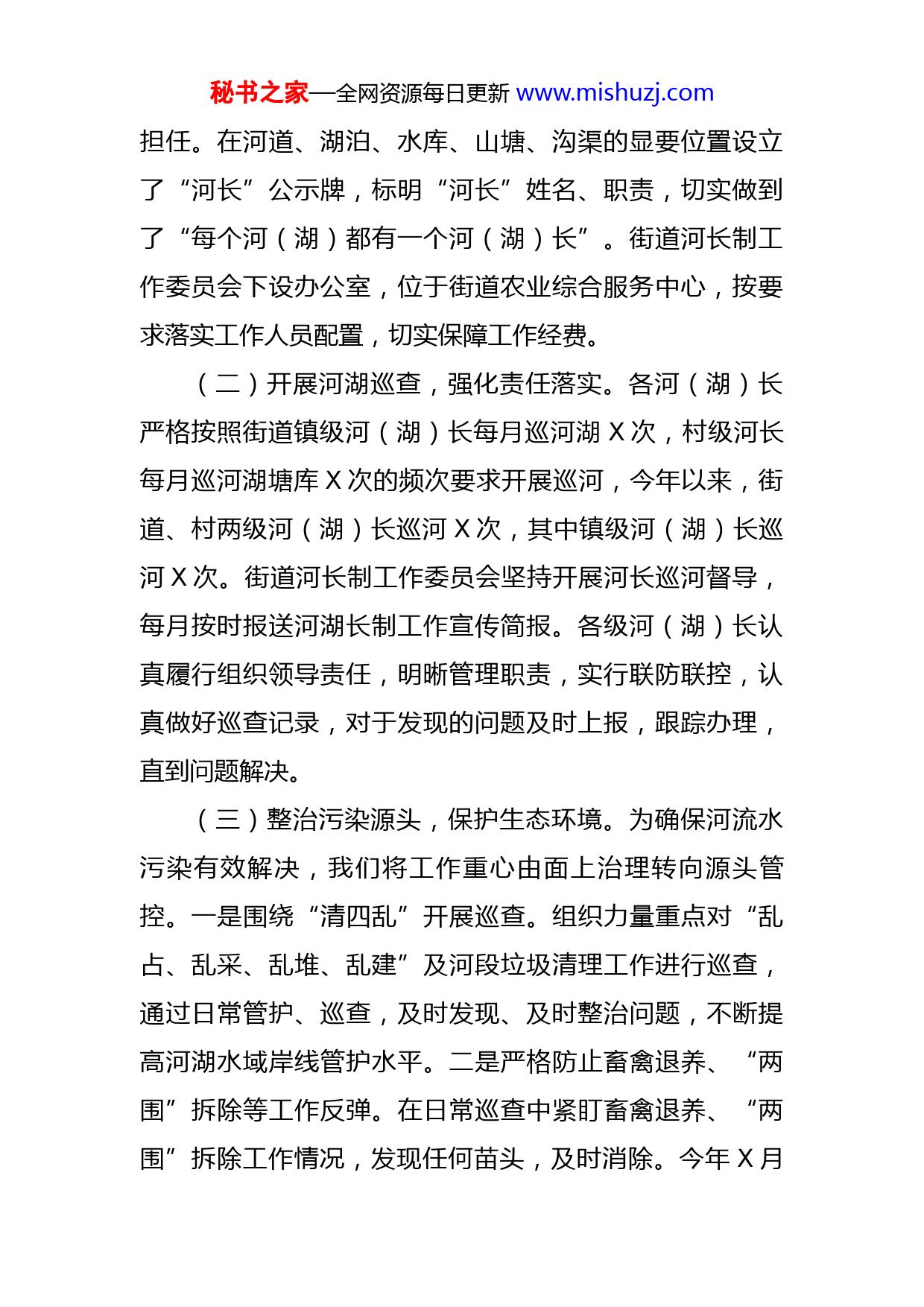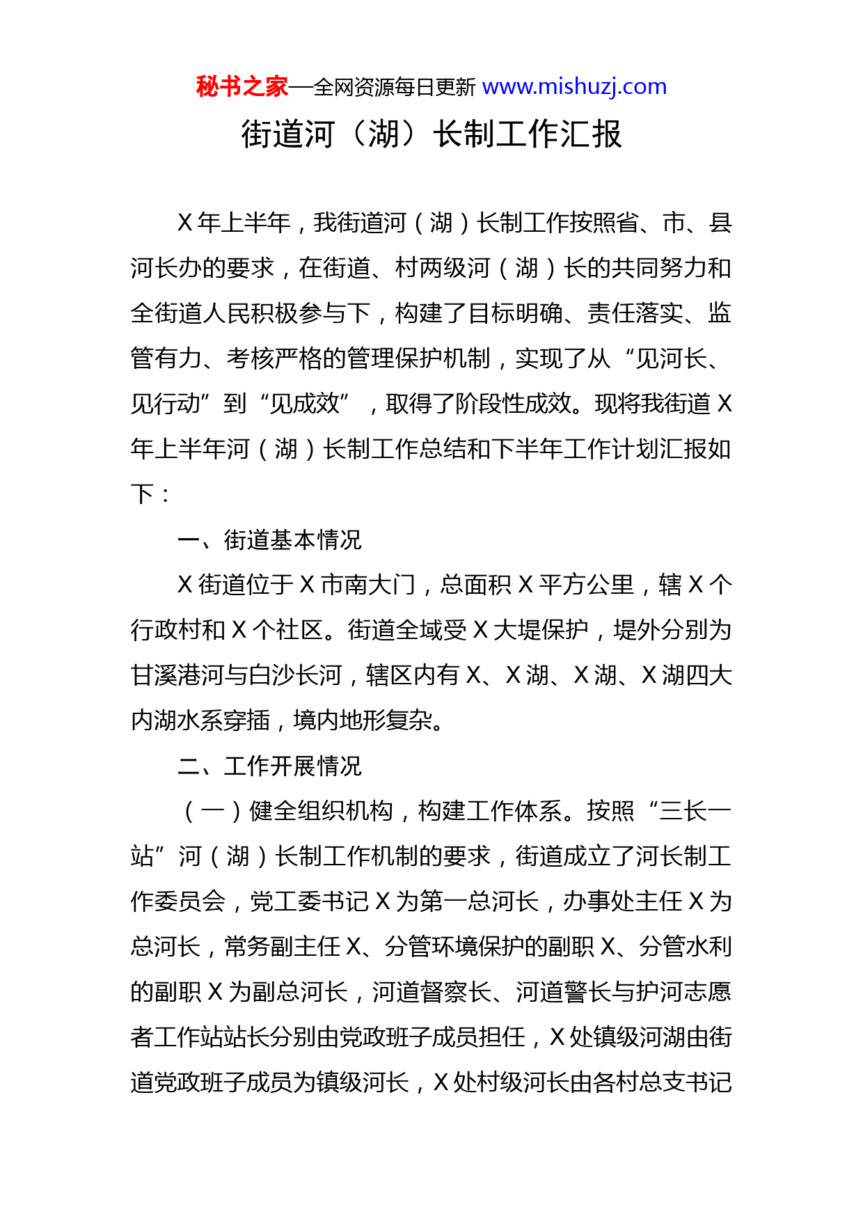 秘书之家—全网资源每日更新www.mishuzj.com街道河(湖)长制工作汇报X年上半年,我街道河(湖)长制工作按照省、市、县河长办的要求,在街道、村两级河(湖)长的共同努力和全街道人民积极参与下,构建了目标明确、责任落实、监管有力、考核严格的管理保护机制,实现了从“见河长、见行动”到“见成效”,取得了阶段性成效。现将我街道X年上半年河(湖)长制工作总结和下半年工作计划汇报如下:一、街道基本情况X街道位于X市南大门,总面积X平方公里,辖X个行政村和X个社区。街道全域受X大堤保护,堤外分别为甘溪港河与白沙长河,辖区内有X、X湖、X湖、X湖四大内湖水系穿插,境内地形复杂。二、工作开展情况(一)健全组织机构,构建工作体系。按照“三长一站”河(湖)长制工作机制的要求,街道成立了河长制工作委员会,党工委书记X为第一总河长,办事处主任X为总河长,常务副主任X、分管环境保护的副职X、分管水利的副职X为副总河长,河道督察长、河道警长与护河志愿者工作站站长分别由党政班子成员担任,X处镇级河湖由街道党政班子成员为镇级河长,X处村级河长由各村总支书记秘书之家—全网资源每日更新www.mishuzj.com担任。在河道、湖泊、水库、山塘、沟渠的显要位置设立了“河长”公示牌,标明“河长”姓名、职责,切实做到了“每个河(湖)都有一个河(湖)长”。街道河长制工作委员会下设办公室,位于街道农业综合服务中心,按要求落实工作人员配置,切实保障工作经费。(二)开展河湖巡查,强化责任落实。各河(湖)长严格按照街道镇级河(湖)长每月巡河湖X次,村级河长每月巡河湖塘库X次的频次要求开展巡河,今年以来,街道、村两级河(湖)长巡河X次,其中镇级河(湖)长巡河X次。街道河长制工作委员会坚持开展河长巡河督导,每月按时报送河湖长制工作宣传简报。各级河(湖)长认真履行组织领导责任,明晰管理职责,实行联防联控,认真做好巡查记录,对于发现的问题及时上报,跟踪办理,直到问题解决。(三)整治污染源头,保护生态环境。为确保河流水污染有效解决,我们将工作重心由面上治理转向源头管控。一是围绕“清四乱”开展巡查。组织力量重点对“乱占、乱采、乱堆、乱建”及河段垃圾清理工作进行巡查,通过日常管护、巡查,及时发现、及时整治问题,不断提高河湖水域岸线管护水平。二是严格防止畜禽退养、“两围”拆除等工作反弹。在日常巡查中紧盯畜禽退养、“两围”拆除工作情况,发现任何苗头,及时消除。今年X月秘书之家—全网资源每日更新www.mishuzj.com份完成龙飞船厂彻底拆除清理和长江委交办的谢家坝疑似矮围鉴定,通过提供详实资料,证明谢家坝不属矮围,已销号处理。三是积极开展河道保洁和保护绿化等工作。由保洁公司负责辖区内的X、浩江湖、大小黄家湖、榨南湖、白沙长河、甘溪港河水面日常保洁,所在村负责岸上绿化保护。今年来,共清理河面水草、垃圾、漂浮物及岸坡垃圾X百余吨。将生活垃圾按环保要求进行处理,保洁公司对全街道所有村(社区)全部配备保洁员、保洁车,将生活垃圾运至专门的填埋场进行处理。四是全面推动农村面源污染防治。通过农村居民改厕、黑臭水体整治、农药化肥减量等工作,减少面源污染,加强水体管护。五是加强沟渠、塘坝清淤疏浚。通过工程建设对沟渠、塘坝进行清淤,全力消除沟渠塘坝淤塞、排灌不畅等问题。(四)加大宣传力度,提高环保意识。通过制作河湖长制政策展示板、悬挂宣传标语、发放宣传单、村村响广播宣传等方式,对周边百姓进行切实有效的宣传教育,提高群众保护生态的意识,提高河湖长制知晓率,引导群众参与到河长制工作中来,共同营造整洁、优美、健康的河湖环境。三、下步工作计划1.加大宣传力度。营造全街道人民参与爱护河湖就是爱护家园的宣传氛围。秘书之家—全网资源每日更新www.mishuzj.com2.注重能力建设。在进一步加强街道河长办工作力量同时,落实好村级河长办专职人员,通过组织各村级河长办人员业务培训,提高工作能力。3.打造样板河湖。针对今年街道申报的样板河湖(小黄家湖)加大建设力度,进一步加强岸线环境美化以及日常维护和保洁工作。4.突出专项整治。按照河长制工作方案以及“清四乱”工作的要求,梳理出问题,通过开展专项整治行动的方式,在沟渠清淤疏浚、河岸绿化、河湖面漂浮垃圾清理整治、入河排污口监测与治理、乡村人居环境整治等方面加大力度,采取有效措施,抓出成效,使我街道河湖、沟塘面貌得到明显改观,让广大人民群众切实感受到河长制工作阶段性成果,努力打造“河畅、水清、岸绿、景美”的河湖沟塘生态新格局。