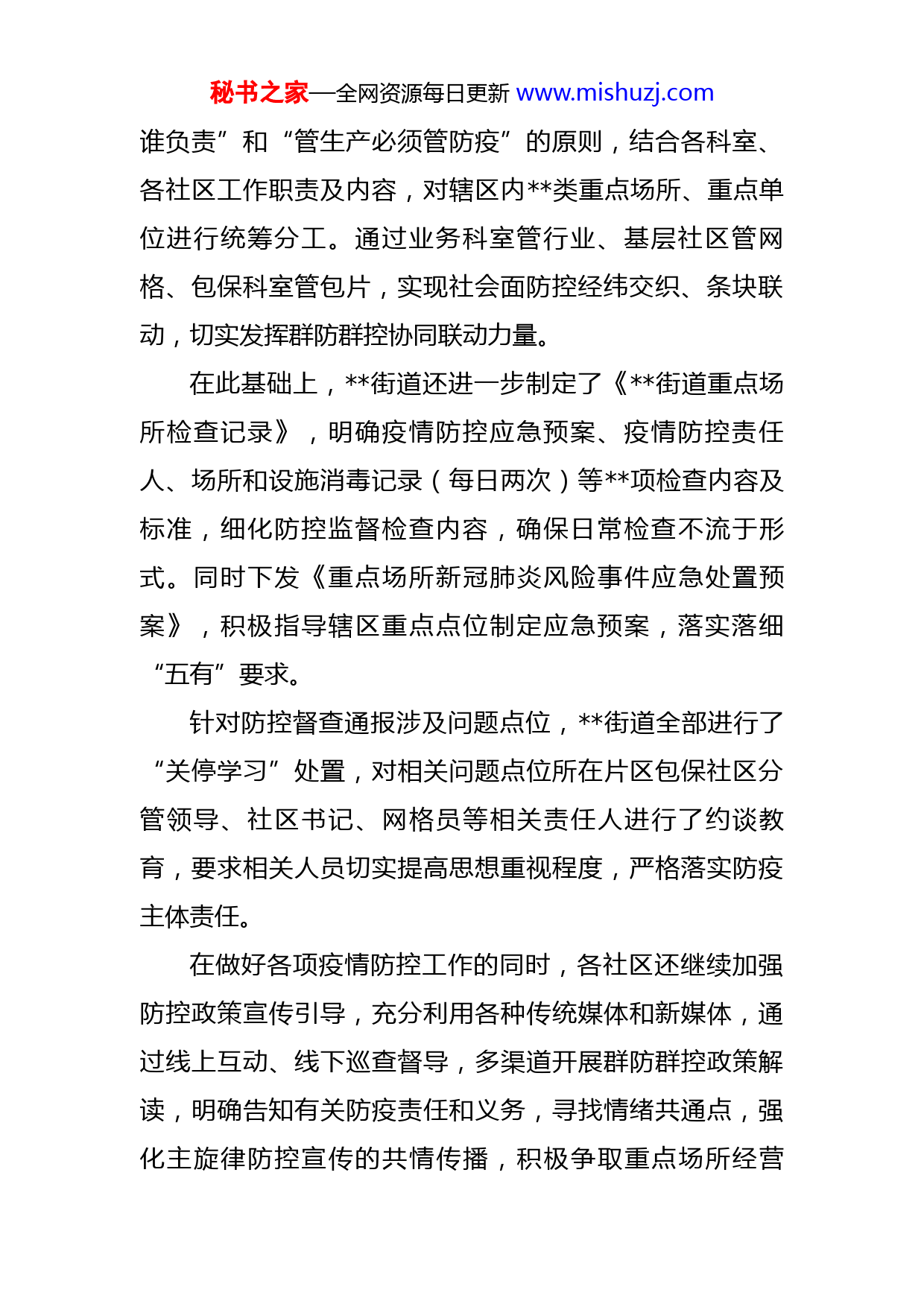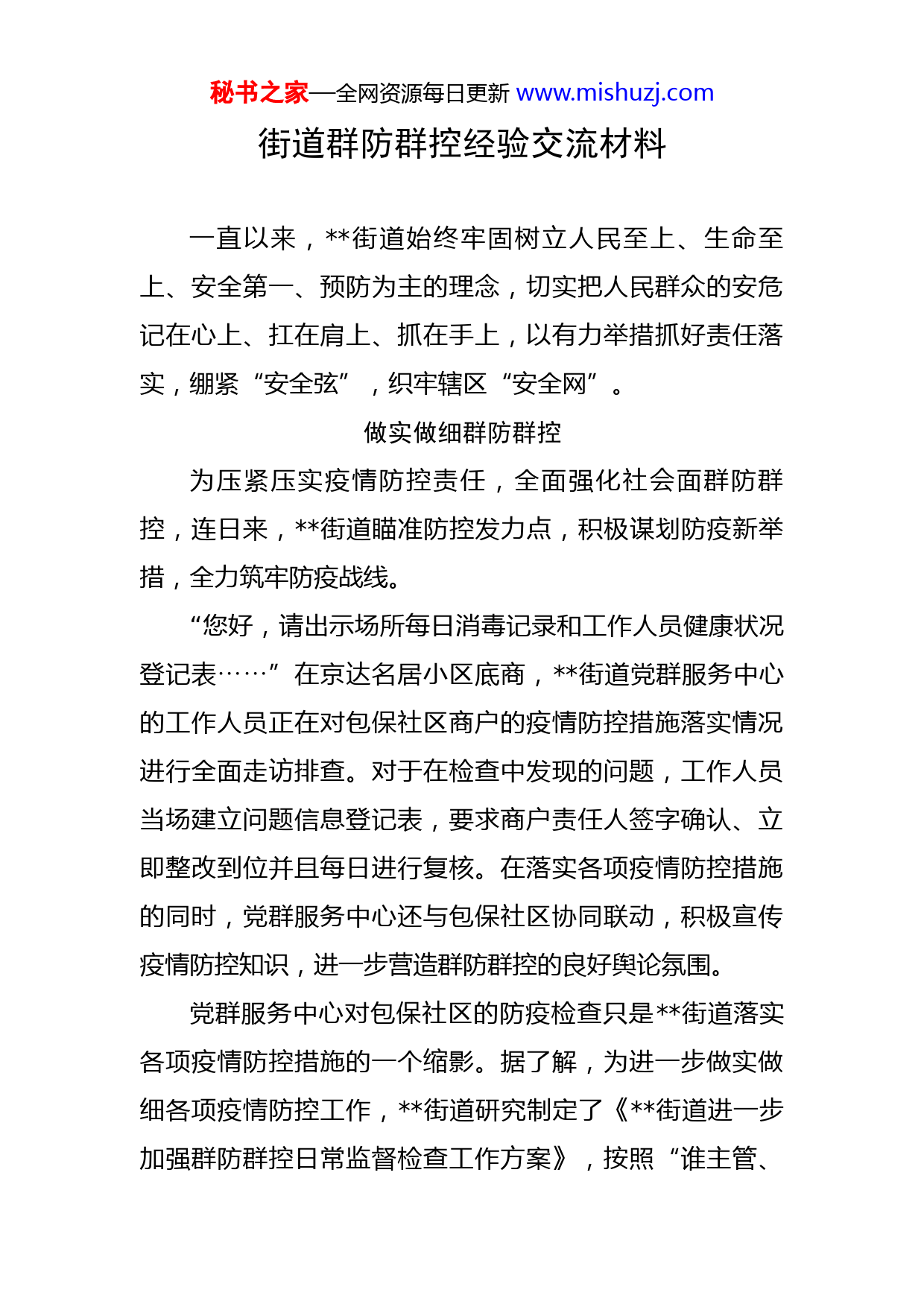 秘书之家—全网资源每日更新www.mishuzj.com街道群防群控经验交流材料一直以来,街道始终牢固树立人民至上、生命至上、安全第一、预防为主的理念,切实把人民群众的安危记在心上、扛在肩上、抓在手上,以有力举措抓好责任落实,绷紧“安全弦”,织牢辖区“安全网”。做实做细群防群控为压紧压实疫情防控责任,全面强化社会面群防群控,连日来,街道瞄准防控发力点,积极谋划防疫新举措,全力筑牢防疫战线。“您好,请出示场所每日消毒记录和工作人员健康状况登记表”在京达名居小区底商,⋯⋯街道党群服务中心的工作人员正在对包保社区商户的疫情防控措施落实情况进行全面走访排查。对于在检查中发现的问题,工作人员当场建立问题信息登记表,要求商户责任人签字确认、立即整改到位并且每日进行复核。在落实各项疫情防控措施的同时,党群服务中心还与包保社区协同联动,积极宣传疫情防控知识,进一步营造群防群控的良好舆论氛围。党群服务中心对包保社区的防疫检查只是街道落实各项疫情防控措施的一个缩影。据了解,为进一步做实做细各项疫情防控工作,街道研究制定了《街道进一步加强群防群控日常监督检查工作方案》,按照“谁主管、秘书之家—全网资源每日更新www.mishuzj.com谁负责”和“管生产必须管防疫”的原则,结合各科室、各社区工作职责及内容,对辖区内类重点场所、重点单位进行统筹分工。通过业务科室管行业、基层社区管网格、包保科室管包片,实现社会面防控经纬交织、条块联动,切实发挥群防群控协同联动力量。在此基础上,街道还进一步制定了《街道重点场所检查记录》,明确疫情防控应急预案、疫情防控责任人、场所和设施消毒记录(每日两次)等项检查内容及标准,细化防控监督检查内容,确保日常检查不流于形式。同时下发《重点场所新冠肺炎风险事件应急处置预案》,积极指导辖区重点点位制定应急预案,落实落细“五有”要求。针对防控督查通报涉及问题点位,街道全部进行了“关停学习”处置,对相关问题点位所在片区包保社区分管领导、社区书记、网格员等相关责任人进行了约谈教育,要求相关人员切实提高思想重视程度,严格落实防疫主体责任。在做好各项疫情防控工作的同时,各社区还继续加强防控政策宣传引导,充分利用各种传统媒体和新媒体,通过线上互动、线下巡查督导,多渠道开展群防群控政策解读,明确告知有关防疫责任和义务,寻找情绪共通点,强化主旋律防控宣传的共情传播,积极争取重点场所经营秘书之家—全网资源每日更新www.mishuzj.com者、从业者的理解、支持和配合,落实好重点场所防疫主体责任,坚决杜绝防控不力现象发生。加强排查除隐患近日,街道各社区组织多批次巡查行动,不放过任何蛛丝马迹,不遗漏任何一个角落,用“火眼金睛”排查各类安全隐患,为社区居民健康安全保驾护航。随着网购的普及,很多小区都建立了菜鸟驿站。然而它在方便人们购物的同时,因存放大量纸箱快件,也存在着巨大的安全隐患。近日,南河底社区工作人员对辖区内的快递驿站进行了全面的排查走访。每到一处,工作人员都明确要求驿站负责人高度重视消防安全,严格落实消防工作要求。对于排查中发现的问题,工作人员当场责令驿站负责人立即整改到位,同时还要求驿站确定消防安全责任人和管理人,明确应急处置流程,有效提升快递驿站消防安全水平。社区毗邻铁路,为有效避免消防安全隐患,确保铁路安全畅通,四季风情社区每年都会对辖区的铁路周边进行多次巡查,排查环境安全及火灾隐患。春季来临,针对风大、气候干燥的特点,铁路巡查成为社区人员必不可少的重要工作内容。巡查期间,工作人员查看铁路周边杂草情况以及周围的垃圾堆放情况,并根据需要铲除杂草及堆放的生活垃圾,避免引起火灾等威胁生命财产安全的事秘书之家—全网资源每日更新www.mishuzj.com故。同时社区还结合综治宣传月,积极开展铁路护路宣传动员,切实让人民群众把铁路护路治安联防工作转化为自觉行动。在进行安全隐患排查的同时,四季风情社区还加大了对辖区内禁种毒品原植物以及反宣品的清查力度,确保辖区清查行动全覆盖。在清查过程中,工作人员同时向沿途的居民宣传种植毒品原植物以及邪教的危害性,使居民远离毒品、反对邪教,自觉维护辖区安全稳定。