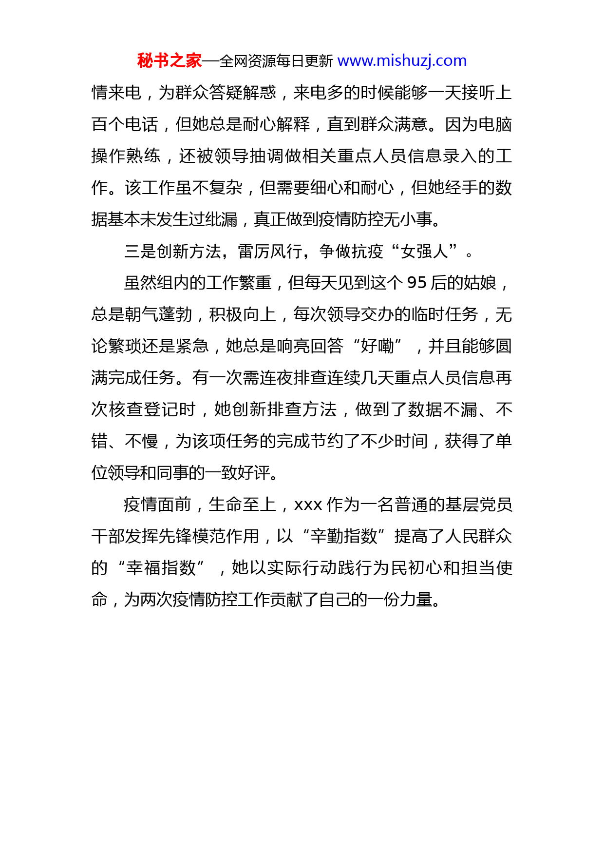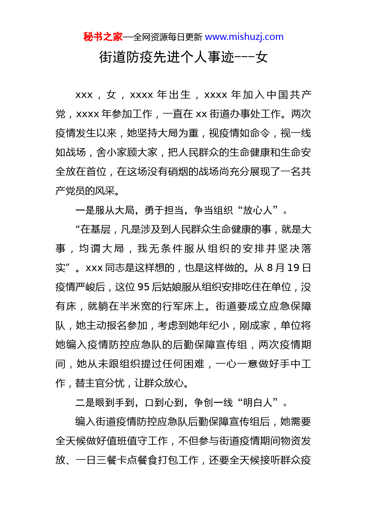 秘书之家—全网资源每日更新www.mishuzj.com街道防疫先进个人事迹---女xxx,女,xxxx年出生,xxxx年加入中国共产党,xxxx年参加工作,一直在xx街道办事处工作。两次疫情发生以来,她坚持大局为重,视疫情如命令,视一线如战场,舍小家顾大家,把人民群众的生命健康和生命安全放在首位,在这场没有硝烟的战场尚充分展现了一名共产党员的风采。一是服从大局,勇于担当,争当组织“放心人”。“在基层,凡是涉及到人民群众生命健康的事,就是大事,均谓大局,我无条件服从组织的安排并坚决落实”。xxx同志是这样想的,也是这样做的。从8月19日疫情严峻后,这位95后姑娘服从组织安排吃住在单位,没有床,就躺在半米宽的行军床上。街道要成立应急保障队,她主动报名参加,考虑到她年纪小,刚成家,单位将她编入疫情防控应急队的后勤保障宣传组,两次疫情期间,她从未跟组织提过任何困难,一心一意做好手中工作,替主官分忧,让群众放心。二是眼到手到,口到心到,争创一线“明白人”。编入街道疫情防控应急队后勤保障宣传组后,她需要全天候做好值班值守工作,不但参与街道疫情期间物资发放、一日三餐卡点餐食打包工作,还要全天候接听群众疫秘书之家—全网资源每日更新www.mishuzj.com情来电,为群众答疑解惑,来电多的时候能够一天接听上百个电话,但她总是耐心解释,直到群众满意。因为电脑操作熟练,还被领导抽调做相关重点人员信息录入的工作。该工作虽不复杂,但需要细心和耐心,但她经手的数据基本未发生过纰漏,真正做到疫情防控无小事。三是创新方法,雷厉风行,争做抗疫“女强人”。虽然组内的工作繁重,但每天见到这个95后的姑娘,总是朝气蓬勃,积极向上,每次领导交办的临时任务,无论繁琐还是紧急,她总是响亮回答“好嘞”,并且能够圆满完成任务。有一次需连夜排查连续几天重点人员信息再次核查登记时,她创新排查方法,做到了数据不漏、不错、不慢,为该项任务的完成节约了不少时间,获得了单位领导和同事的一致好评。疫情面前,生命至上,xxx作为一名普通的基层党员干部发挥先锋模范作用,以“辛勤指数”提高了人民群众的“幸福指数”,她以实际行动践行为民初心和担当使命,为两次疫情防控工作贡献了自己的一份力量。