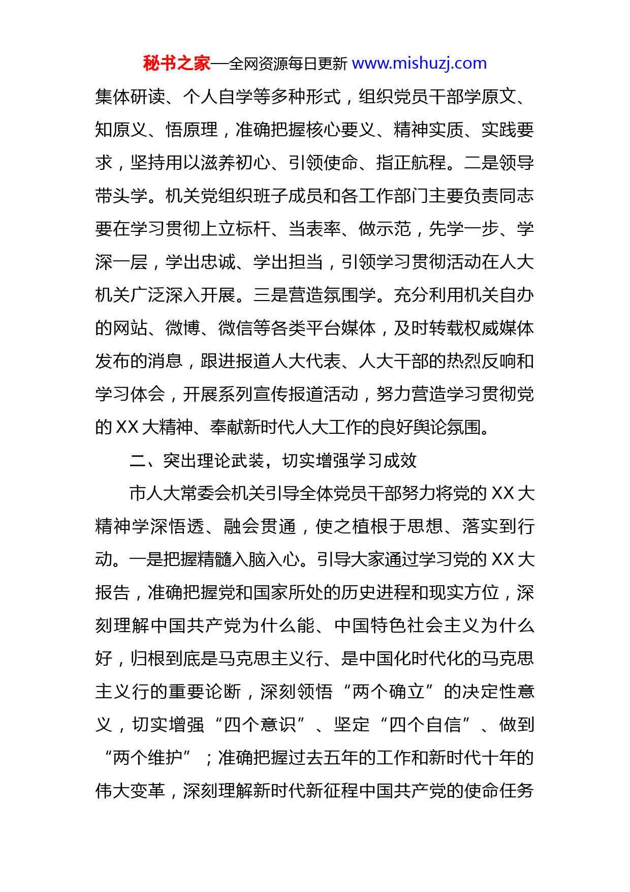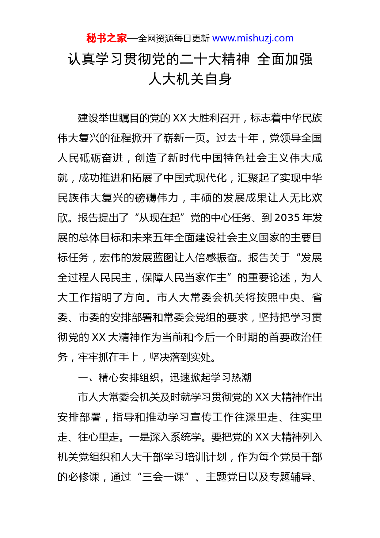 秘书之家—全网资源每日更新www.mishuzj.com认真学习贯彻党的二十大精神全面加强人大机关自身建设举世瞩目的党的XX大胜利召开,标志着中华民族伟大复兴的征程掀开了崭新一页。过去十年,党领导全国人民砥砺奋进,创造了新时代中国特色社会主义伟大成就,成功推进和拓展了中国式现代化,汇聚起了实现中华民族伟大复兴的磅礴伟力,丰硕的发展成果让人无比欢欣。报告提出了“从现在起”党的中心任务、到2035年发展的总体目标和未来五年全面建设社会主义国家的主要目标任务,宏伟的发展蓝图让人倍感振奋。报告关于“发展全过程人民民主,保障人民当家作主”的重要论述,为人大工作指明了方向。市人大常委会机关将按照中央、省委、市委的安排部署和常委会党组的要求,坚持把学习贯彻党的XX大精神作为当前和今后一个时期的首要政治任务,牢牢抓在手上,坚决落到实处。一、精心安排组织,迅速掀起学习热潮市人大常委会机关及时就学习贯彻党的XX大精神作出安排部署,指导和推动学习宣传工作往深里走、往实里走、往心里走。一是深入系统学。要把党的XX大精神列入机关党组织和人大干部学习培训计划,作为每个党员干部的必修课,通过“三会一课”、主题党日以及专题辅导、秘书之家—全网资源每日更新www.mishuzj.com集体研读、个人自学等多种形式,组织党员干部学原文、知原义、悟原理,准确把握核心要义、精神实质、实践要求,坚持用以滋养初心、引领使命、指正航程。二是领导带头学。机关党组织班子成员和各工作部门主要负责同志要在学习贯彻上立标杆、当表率、做示范,先学一步、学深一层,学出忠诚、学出担当,引领学习贯彻活动在人大机关广泛深入开展。三是营造氛围学。充分利用机关自办的网站、微博、微信等各类平台媒体,及时转载权威媒体发布的消息,跟进报道人大代表、人大干部的热烈反响和学习体会,开展系列宣传报道活动,努力营造学习贯彻党的XX大精神、奉献新时代人大工作的良好舆论氛围。二、突出理论武装,切实增强学习成效市人大常委会机关引导全体党员干部努力将党的XX大精神学深悟透、融会贯通,使之植根于思想、落实到行动。一是把握精髓入脑入心。引导大家通过学习党的XX大报告,准确把握党和国家所处的历史进程和现实方位,深刻理解中国共产党为什么能、中国特色社会主义为什么好,归根到底是马克思主义行、是中国化时代化的马克思主义行的重要论断,深刻领悟“两个确立”的决定性意义,切实增强“四个意识”、坚定“四个自信”、做到“两个维护”;准确把握过去五年的工作和新时代十年的伟大变革,深刻理解新时代新征程中国共产党的使命任务秘书之家—全网资源每日更新www.mishuzj.com及中国式现代化的科学内涵、本质要求、目标任务,进一步增强沿着党指引的方向,推动中华民族伟大复兴号巨轮扬帆远航的思想自觉、政治自觉和行动自觉;准确把握未来五年推动高质量发展的总体布局和各项事业发展的具体要求,深刻理解全面从严治党的现实需要和时代要求,进一步坚定走好新时代的赶考之路,以良好精神状态做好本职工作的决心和信心。二是结合实际深入思考。引导大家自觉把学习贯彻党的XX大精神与学习贯彻中央、省委人大工作会议精神紧密结合起来,与学习贯彻省、市党代会精神紧密结合起来,与XXX的市情实际和人大的工作实践结合起来,通过深入学习思考,切实把思想和行动统一到党的XX大精神上来,把力量凝聚到做好新时代人大工作上来。三是立足工作研讨交流。要求大家在学习思考的基础上,积极撰写心得体会,特别是党员领导干部要从分管和联系的工作出发,找准切入点和落脚点,精心撰写理论研讨文章,力争形成一批理论成果。四是着眼实践转化成果。要求大家对标报告中关于发展全过程人民民主、保障人民当家作主、坚持全面依法治国、推进法治中国建设等重要论述,把自己摆进去、把职责摆进去、把实践摆进去,把相关理论学懂弄通,用以指导工作实践,提前思考谋划明年的各项工作,真正把学习成果转化为谋划和推动新时代地方人大工作的实际成效。秘书之家—全网资源每日更新www.mishuzj.com三、坚持学以致用,全面加强和改进人大机关建设市人大常委会机关将坚持以党的XX大精神为指导,紧紧围绕习近平总书记在中央人大工作会议上提出的“四个机关”的新要求,全面加强和改进自身建设,努力打造一支政治坚定、服务人民、尊崇法治、发扬民主、勤勉尽责的人大工作队伍,力争以优质高效的机关工作服务市人大及其常委会更好地依法履职。一要突出政治机关建设,始终坚持正确工作方向。要抓好理论武装不放松,进一步增强做好人大工作的自觉性、主动性、积极性,努力营造良好的人大工作氛围;要坚持党的领导不动摇,坚决贯彻党的路线、方针、政策,始终与党中央在思想上、政治上、工作上保持一致,努力做到与市委和市人大常委会党组同心、同向、同声、同步;要争取市委支持不懈怠,积极争取市委支持人大机关完善工作机构,优化队伍结构。二要突出权力机关建设,切实保障人民当家作主。全力服务常委会履行好四项法定职权:坚持科学立法、开门立法、依法立法,制定出台务实管用的地方性法规;依法决定推动经济社会高质量发展的重大事项,把市委的意