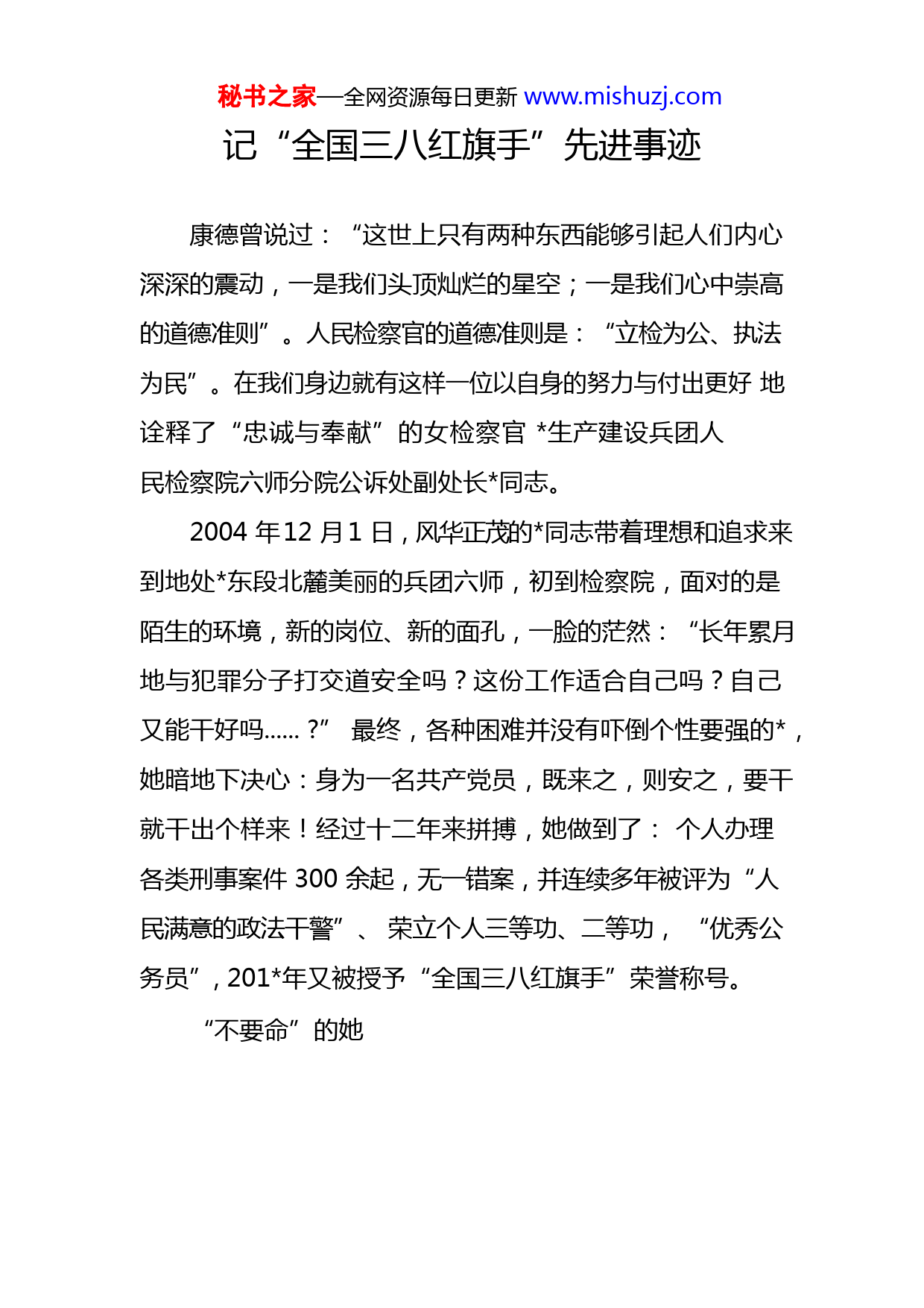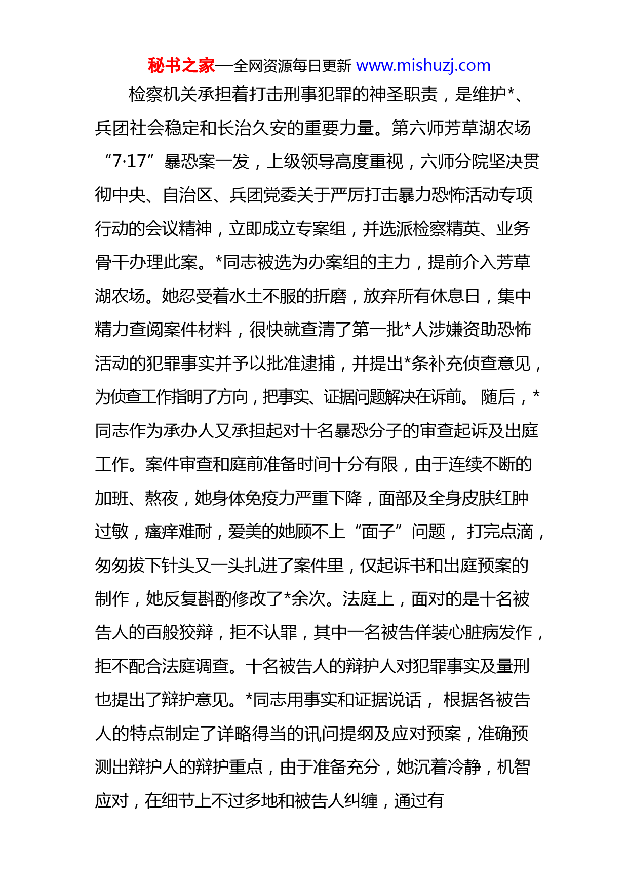 秘书之家—全网资源每日更新www.mishuzj.com记“全国三八红旗手”先进事迹康德曾说过:“这世上只有两种东西能够引起人们内心深深的震动,一是我们头顶灿烂的星空;一是我们心中崇高的道德准则”。人民检察官的道德准则是:“立检为公、执法为民”。在我们身边就有这样一位以自身的努力与付出更好地诠释了“忠诚与奉献”的女检察官生产建设兵团人民检察院六师分院公诉处副处长同志。2004年12月1日,风华正茂的同志带着理想和追求来到地处东段北麓美丽的兵团六师,初到检察院,面对的是陌生的环境,新的岗位、新的面孔,一脸的茫然:“长年累月地与犯罪分子打交道安全吗?这份工作适合自己吗?自己又能干好吗......?”最终,各种困难并没有吓倒个性要强的,她暗地下决心:身为一名共产党员,既来之,则安之,要干就干出个样来!经过十二年来拼搏,她做到了:个人办理各类刑事案件300余起,无一错案,并连续多年被评为“人民满意的政法干警”、荣立个人三等功、二等功,“优秀公务员”,201年又被授予“全国三八红旗手”荣誉称号。“不要命”的她秘书之家—全网资源每日更新www.mishuzj.com检察机关承担着打击刑事犯罪的神圣职责,是维护、兵团社会稳定和长治久安的重要力量。第六师芳草湖农场“7·17”暴恐案一发,上级领导高度重视,六师分院坚决贯彻中央、自治区、兵团党委关于严厉打击暴力恐怖活动专项行动的会议精神,立即成立专案组,并选派检察精英、业务骨干办理此案。同志被选为办案组的主力,提前介入芳草湖农场。她忍受着水土不服的折磨,放弃所有休息日,集中精力查阅案件材料,很快就查清了第一批人涉嫌资助恐怖活动的犯罪事实并予以批准逮捕,并提出条补充侦查意见,为侦查工作指明了方向,把事实、证据问题解决在诉前。随后,同志作为承办人又承担起对十名暴恐分子的审查起诉及出庭工作。案件审查和庭前准备时间十分有限,由于连续不断的加班、熬夜,她身体免疫力严重下降,面部及全身皮肤红肿过敏,瘙痒难耐,爱美的她顾不上“面子”问题,打完点滴,匆匆拔下针头又一头扎进了案件里,仅起诉书和出庭预案的制作,她反复斟酌修改了余次。法庭上,面对的是十名被告人的百般狡辩,拒不认罪,其中一名被告佯装心脏病发作,拒不配合法庭调查。十名被告人的辩护人对犯罪事实及量刑也提出了辩护意见。同志用事实和证据说话,根据各被告人的特点制定了详略得当的讯问提纲及应对预案,准确预测出辩护人的辩护重点,由于准备充分,她沉着冷静,机智应对,在细节上不过多地和被告人纠缠,通过有秘书之家—全网资源每日更新www.mishuzj.com条不紊、层次清晰地用证据展示案情和分析论证,掌握了庭审主动,有力驳斥了被告人及其辩护人的辩解,有些犯罪分子面对败露的罪行,恶狠狠地威胁到:“我活着嘛,出来整死你呢”,她义正辞严地警告他们:“有胆量你就来,犯法就要受到严惩”。最终,一审法院对公诉机关指控事实、出示证据,适用法律全部予以采纳,并当庭对十名被告人做出有罪判决。该案的成功办理得到了上级领导的高度评价和社会各界的普遍好评。201年,同志被兵团政法委授予“个人二等功”。“不畏难”的她公诉工作是清苦而艰辛的,要做好这份工作,付出的努力和遇到的坎坷,有时是超乎常人想象的。尤其在案件量已攀升至兵团近四分之一,疑难复杂案件陡增,办案压力巨大的六师,更是难上加难。同志刚入检察院就被领导看中,将其分到公诉部门,一干就是十二个年头。工作中同志总是冲在第一线,主动承担起办理重大疑难案件和新类型、新手法以及社会关注度高、政治敏感性强、政策把握难的案件。先后参与办理六师首例诈骗;贪污余万元巨额社保基金案;系列贷款诈骗案及王某某等人虚开用于抵扣税款发票、虚开增值税专用发票涉税大案;国家林业局督办的公司毁林开荒上诉案;六师首例暴恐案;多起特大贩毒案;媒体及网络广泛传播和关注的“继母摔童案”;市首例赵某等人诈秘书之家—全网资源每日更新www.mishuzj.com骗政府余万元危房安置补偿款等重大、疑难、复杂刑事案件。同事有时开玩笑:“,你这些年办案写的材料都可以出好几本书了!”一个个大要案的成功办理凝结了她不为人知的辛勤付出与汗水,多少次撰写审结报告至凌晨深夜,多少次因思考案件而夜不能寐,多少次因长期伏案工作,颈椎和腰椎旧疾复发,多少人劝她:“作为女同志,这么拼命干什么,工作差不多就行了”。同志却坚定的说:“工作不分男女,既然选择了检察官这个职业,就是选择了忠诚与奉献,就要承担起守护公平与正义的神圣使命”。她办理的首例涉及内地近家开票企业,骗取国家出口退税款近亿元的兵团涉税大案,是由公安部、国家税务总局进行督办的,仅公安机关移送的刑事卷宗和会计账簿就近余册,整整箱,受到师市党委和政法委的高度关注。从接案的那一天起,她把办公室当成了自己的家,吃、住、办案都在这里,几次因颈椎严重压迫神经呕吐不止,晕倒在堆积如山的案卷材料上。为了梳理余个账户的资金流向,她白天翻阅堆积如山的财务凭证,晚上制表汇总,经过多个日日夜夜的奋战,终于撰写完成余页万余字的审结报告,给公安机关提出补充侦查意见条,形成补充侦查卷宗册,为出庭公诉打下了坚实的基础。最终成功地办理此案。“不着家”