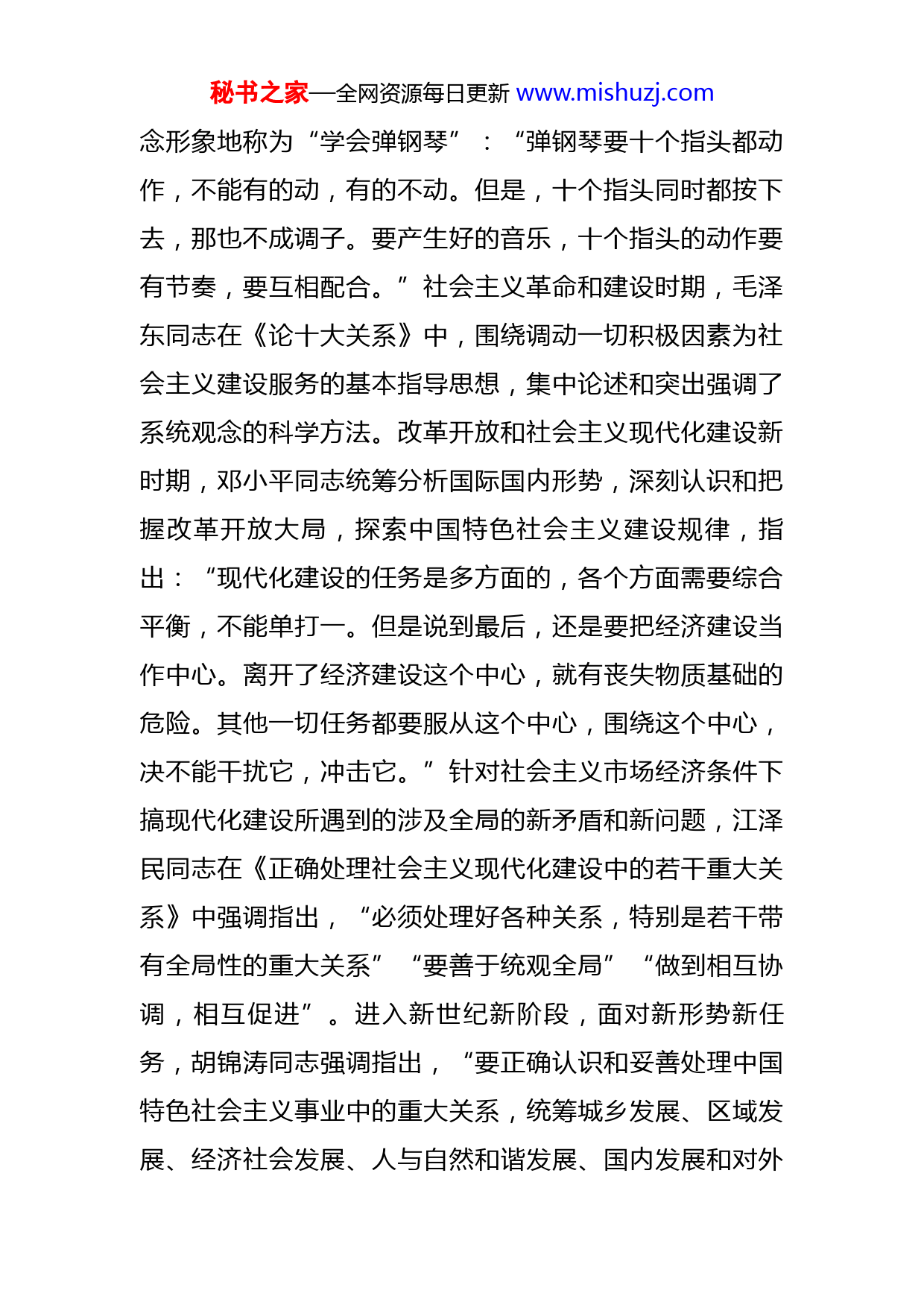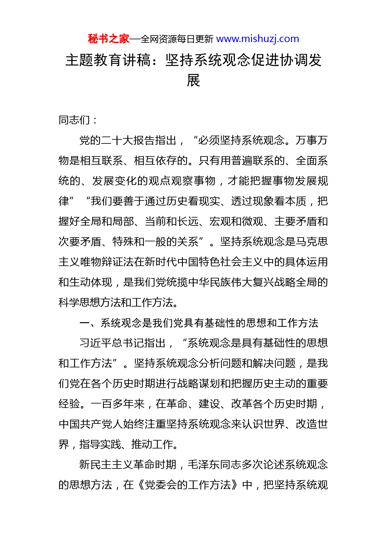 秘书之家—全网资源每日更新www.mishuzj.com主题教育讲稿:坚持系统观念促进协调发展同志们:党的二十大报告指出,“必须坚持系统观念。万事万物是相互联系、相互依存的。只有用普遍联系的、全面系统的、发展变化的观点观察事物,才能把握事物发展规律”“我们要善于通过历史看现实、透过现象看本质,把握好全局和局部、当前和长远、宏观和微观、主要矛盾和次要矛盾、特殊和一般的关系”。坚持系统观念是马克思主义唯物辩证法在新时代中国特色社会主义中的具体运用和生动体现,是我们党统揽中华民族伟大复兴战略全局的科学思想方法和工作方法。一、系统观念是我们党具有基础性的思想和工作方法习近平总书记指出,“系统观念是具有基础性的思想和工作方法”。坚持系统观念分析问题和解决问题,是我们党在各个历史时期进行战略谋划和把握历史主动的重要经验。一百多年来,在革命、建设、改革各个历史时期,中国共产党人始终注重坚持系统观念来认识世界、改造世界,指导实践、推动工作。新民主主义革命时期,毛泽东同志多次论述系统观念的思想方法,在《党委会的工作方法》中,把坚持系统观秘书之家—全网资源每日更新www.mishuzj.com念形象地称为“学会弹钢琴”:“弹钢琴要十个指头都动作,不能有的动,有的不动。但是,十个指头同时都按下去,那也不成调子。要产生好的音乐,十个指头的动作要有节奏,要互相配合。”社会主义革命和建设时期,毛泽东同志在《论十大关系》中,围绕调动一切积极因素为社会主义建设服务的基本指导思想,集中论述和突出强调了系统观念的科学方法。改革开放和社会主义现代化建设新时期,邓小平同志统筹分析国际国内形势,深刻认识和把握改革开放大局,探索中国特色社会主义建设规律,指出:“现代化建设的任务是多方面的,各个方面需要综合平衡,不能单打一。但是说到最后,还是要把经济建设当作中心。离开了经济建设这个中心,就有丧失物质基础的危险。其他一切任务都要服从这个中心,围绕这个中心,决不能干扰它,冲击它。”针对社会主义市场经济条件下搞现代化建设所遇到的涉及全局的新矛盾和新问题,江泽民同志在《正确处理社会主义现代化建设中的若干重大关系》中强调指出,“必须处理好各种关系,特别是若干带有全局性的重大关系”“要善于统观全局”“做到相互协调,相互促进”。进入新世纪新阶段,面对新形势新任务,胡锦涛同志强调指出,“要正确认识和妥善处理中国特色社会主义事业中的重大关系,统筹城乡发展、区域发展、经济社会发展、人与自然和谐发展、国内发展和对外秘书之家—全网资源每日更新www.mishuzj.com开放,统筹中央和地方关系,统筹个人利益和集体利益、局部利益和整体利益、当前利益和长远利益,充分调动各方面积极性”。党的十八大以来,习近平总书记就坚持系统观念作出一系列重要论述和指示要求,成为开展工作、深化改革和推动发展的重要遵循。习近平总书记在十八届中央政治局第二次集体学习时指出:“改革开放是一个系统工程,必须坚持全面改革,在各项改革协同配合中推进。”在党的十八届四中全会第二次全体会议上指出:“全面推进依法治国是一项庞大的系统工程,必须统筹兼顾、把握重点、整体谋划,在共同推进上着力,在一体建设上用劲。”在省部级主要领导干部学习贯彻党的十八届五中全会精神专题研讨班上指出:“创新是一个复杂的社会系统工程,涉及经济社会各个领域。”在哲学社会科学工作座谈会上指出:“构建中国特色哲学社会科学是一个系统工程,是一项极其繁重的任务,要加强顶层设计,统筹各方面力量协同推进。”在中央军民融合发展委员会第二次全体会议上指出,“推动军民融合发展是一个系统工程,要善于运用系统科学、系统思维、系统方法研究解决问题”。在全国生态环境保护大会上指出:“环境治理是系统工程,需要综合运用行政、市场、法治、科技等多种手段。”改革发展稳定、内政外交国防、治党治国治军各领域各方面的系秘书之家—全网资源每日更新www.mishuzj.com统工程,都需要坚持系统观念、强化系统思维,统筹兼顾、整体施策、多措并举。以习近平同志为核心的党中央坚持系统谋划、统筹推进党和国家各项事业。中国特色社会主义事业涉及经济、政治、文化、社会、生态等各个领域,各个领域之间相互联系、相互制约,推进伟大事业绝不是某一领域的单打独斗,任何一个领域的发展都有可能牵动其他领域,同时也需要其他领域的密切配合。在社会主义现代化建设进程中,我们党团结带领全国各族人民坚持系统观念,以巨大的政治勇气全面深化改革,冲破思想观念束缚,突破利益固化藩篱,坚决破除各方面体制机制弊端,各领域基础性制度框架基本建立,许多领域实现历史性变革、系统性重塑、整体性重构。党和国家事业取得举世瞩目的成就,在于坚持系统观念牢牢把握我国发展的阶段性特征,在改革发展实践中增强各项措施的关联性和耦合性,防止畸重畸轻、单兵突进、顾此失彼,在整体推进的基础上抓主要矛盾和矛盾的主要方面,采取有针对性的具体措施,努力做到全局和局部相配套、治本和治标相结合、渐进和突破相衔接,实现整体推进和重点突破相统一。二、坚持系统观念加强前瞻性思考、全局