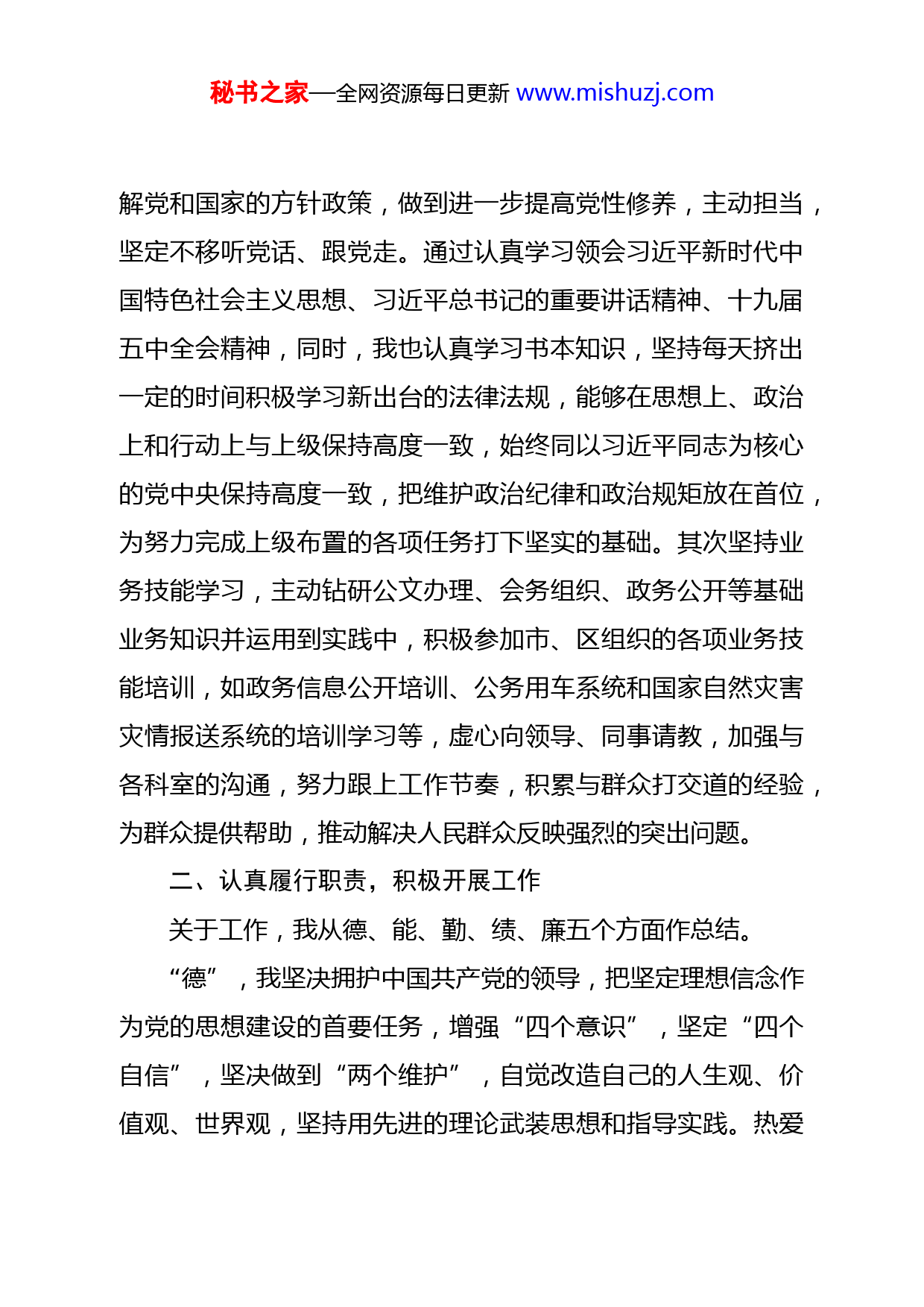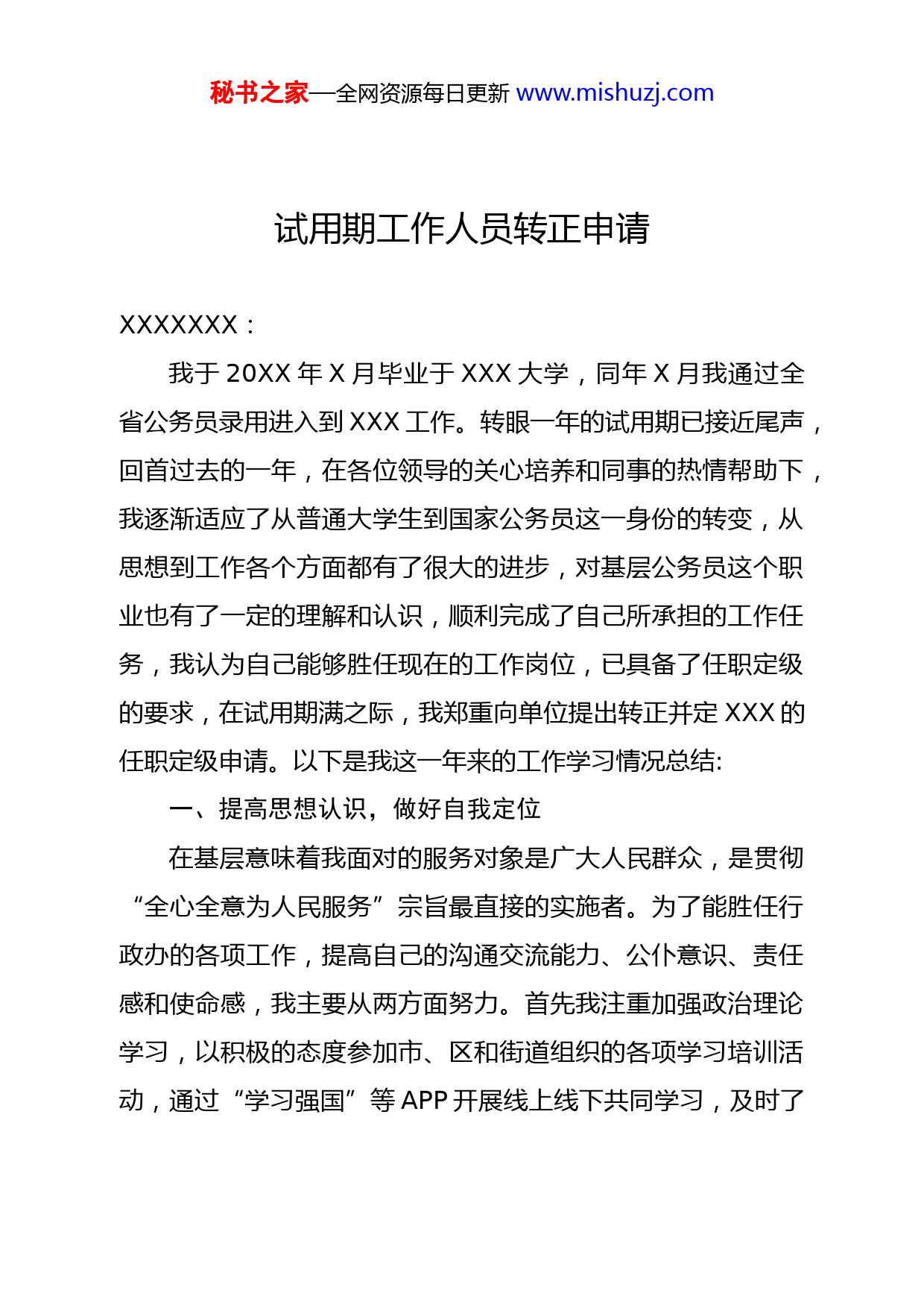 秘书之家—全网资源每日更新www.mishuzj.com试用期工作人员转正申请XXXXXXX:我于20XX年X月毕业于XXX大学,同年X月我通过全省公务员录用进入到XXX工作。转眼一年的试用期已接近尾声,回首过去的一年,在各位领导的关心培养和同事的热情帮助下,我逐渐适应了从普通大学生到国家公务员这一身份的转变,从思想到工作各个方面都有了很大的进步,对基层公务员这个职业也有了一定的理解和认识,顺利完成了自己所承担的工作任务,我认为自己能够胜任现在的工作岗位,已具备了任职定级的要求,在试用期满之际,我郑重向单位提出转正并定XXX的任职定级申请。以下是我这一年来的工作学习情况总结:一、提高思想认识,做好自我定位在基层意味着我面对的服务对象是广大人民群众,是贯彻“全心全意为人民服务”宗旨最直接的实施者。为了能胜任行政办的各项工作,提高自己的沟通交流能力、公仆意识、责任感和使命感,我主要从两方面努力。首先我注重加强政治理论学习,以积极的态度参加市、区和街道组织的各项学习培训活动,通过“学习强国”等APP开展线上线下共同学习,及时了秘书之家—全网资源每日更新www.mishuzj.com解党和国家的方针政策,做到进一步提高党性修养,主动担当,坚定不移听党话、跟党走。通过认真学习领会习近平新时代中国特色社会主义思想、习近平总书记的重要讲话精神、十九届五中全会精神,同时,我也认真学习书本知识,坚持每天挤出一定的时间积极学习新出台的法律法规,能够在思想上、政治上和行动上与上级保持高度一致,始终同以习近平同志为核心的党中央保持高度一致,把维护政治纪律和政治规矩放在首位,为努力完成上级布置的各项任务打下坚实的基础。其次坚持业务技能学习,主动钻研公文办理、会务组织、政务公开等基础业务知识并运用到实践中,积极参加市、区组织的各项业务技能培训,如政务信息公开培训、公务用车系统和国家自然灾害灾情报送系统的培训学习等,虚心向领导、同事请教,加强与各科室的沟通,努力跟上工作节奏,积累与群众打交道的经验,为群众提供帮助,推动解决人民群众反映强烈的突出问题。二、认真履行职责,积极开展工作关于工作,我从德、能、勤、绩、廉五个方面作总结。“德”,我坚决拥护中国共产党的领导,把坚定理想信念作为党的思想建设的首要任务,增强“四个意识”,坚定“四个自信”,坚决做到“两个维护”,自觉改造自己的人生观、价值观、世界观,坚持用先进的理论武装思想和指导实践。热爱秘书之家—全网资源每日更新www.mishuzj.com工作,团结同事,认真对待每一次培训和学习,认真执行单位的各项规章制度,始终以一个优秀共产党员的标准严格要求自己,在思想上、业务上不断完善自我,更新自我。“能”,在单位机构改革后,按照领导安排,我到行政办公室负责办文办会、政务公开、档案管理等工作。行政办是承上启下、协调左右,联系科室的枢纽,也是单位主要的后勤工作地点,它的性质决定了办公室工作的繁杂性。在日常工作中,我能做好办公室电话接听、登记、汇报、处理、转接,按照程序使用登记办事处公章。按照收文要求,严格执行公文处理时效,通过电子政务系统接收办理各类文件,按照公文流转程序,及时送阅、转办、梳理登记,电子版文件归档全面,纸质文件归档有条有理。积极配合同事,按照工作轻重缓急,合理安排,自觉加班加点,在完成任务的同时,持续提高办公效率及工作质量。通过自己的扎实付出,确保了政令及时上传下达。在熟悉工作后,不拘泥于现有的工作处理方法,主动多想多看,从其他单位、部门获取启发,应用到现有工作上来,对目前的工作方法进行创新。“勤”,一年的工作中,我参加了抗击新冠肺炎疫情的防控工作,参与了疫情期间企业复工复产登记整理工作,创文国检期间连续一周坚守一线社区,做好群众入户宣传、社区创文建秘书之家—全网资源每日更新www.mishuzj.com设、居民区安检排查工作。在工作过程中,勤奋踏实,坚守岗位,始终保持积极乐观的工作态度,任劳任怨,不计个人得失。“绩”,一年来,积极撰写党史学习教育工作的有关公文、十九届五中全会精神学习报告、党建活动总结及计划等。对于会务工作,能做到细致周密,确保会议通知、会场会标桌牌布置等会前筹备准备工作正常开展,做好会中人员考勤签到、会议记录及会后宣传报道材料撰写、督查会议决定事项的贯彻执行等工作,保证各项会议顺利召开。对于政务信息公开工作,负责“昆明信息港”网站版面内容的更新及正常维护、政务公开的相关材料信息收集、起草定稿。做到及时、准确、全面采编报送政务信息,今年以来,通过该平台累计发布政策政务、工作动态等64篇,完成96128录入问题解答16条,完成2021年政府信息公开工作年度报告、2021年政府网站及政务新媒体管理工作自检自查报告等汇报材料。帮助完成了基层政务公开标准化规范化26个试点领域标准指引目录编制工作。增强了我单位政务活动的公开性和透明度,方便群众了解法规政策、熟悉办事流程。完成上级领导分配的其他工作,如联系广告公司制作布标,派遣公务用车,协助清点采购,协助整理完善财务档案材料、到天然气发生泄漏的施工现场进行实地考察等相关事项,协助做好2021年防灾减灾、安全生产等宣传秘书之家