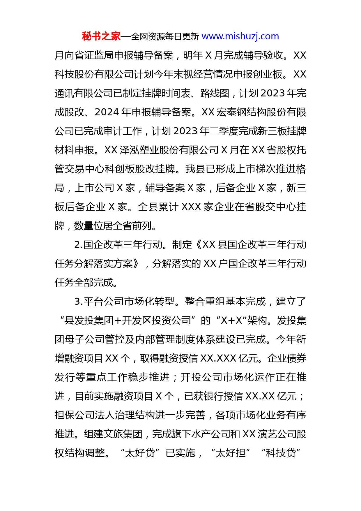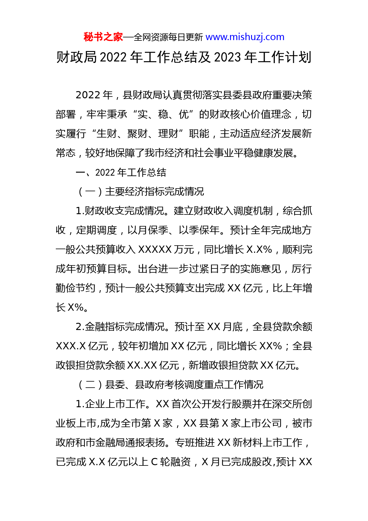 秘书之家—全网资源每日更新www.mishuzj.com财政局2022年工作总结及2023年工作计划2022年,县财政局认真贯彻落实县委县政府重要决策部署,牢牢秉承“实、稳、优”的财政核心价值理念,切实履行“生财、聚财、理财”职能,主动适应经济发展新常态,较好地保障了我市经济和社会事业平稳健康发展。一、2022年工作总结(一)主要经济指标完成情况1.财政收支完成情况。建立财政收入调度机制,综合抓收,定期调度,以月保季、以季保年。预计全年完成地方一般公共预算收入XXXXX万元,同比增长X.X%,顺利完成年初预算目标。出台进一步过紧日子的实施意见,厉行勤俭节约,预计一般公共预算支出完成XX亿元,比上年增长X%。2.金融指标完成情况。预计至XX月底,全县贷款余额XXX.X亿元,较年初增加XX亿元,同比增长XX%;全县政银担贷款余额XX.XX亿元,新增政银担贷款XX亿元。(二)县委、县政府考核调度重点工作情况1.企业上市工作。XX首次公开发行股票并在深交所创业板上市,成为全市第X家,XX县第X家上市公司,被市政府和市金融局通报表扬。专班推进XX新材料上市工作,已完成X.X亿元以上C轮融资,X月已完成股改,预计XX秘书之家—全网资源每日更新www.mishuzj.com月向省证监局申报辅导备案,明年X月完成辅导验收。XX科技股份有限公司计划今年末视经营情况申报创业板。XX通讯有限公司已制定挂牌时间表、路线图,计划2023年完成股改、2024年申报辅导备案。XX宏泰钢结构股份有限公司已完成审计工作,计划2023年二季度完成新三板挂牌材料申报。XX泽泓塑业股份有限公司X月在XX省股权托管交易中心科创板股改挂牌。我县已形成上市梯次推进格局,上市公司X家,辅导备案X家,后备企业X家,新三板后备企业X家。全县累计XXX家企业在省股交中心挂牌,数量位居全省前列。2.国企改革三年行动。制定《XX县国企改革三年行动任务分解落实方案》,分解落实的XX户国企改革三年行动任务全部完成。3.平台公司市场化转型。整合重组基本完成,建立了“县发投集团+开发区投资公司”的“X+X”架构。发投集团母子公司管控及内部管理制度体系建设已完成。今年新增融资项目XX个,取得融资授信XX.XXX亿元。企业债券发行等重点工作稳步推进;开投公司市场化运作正在推进,目前实施融资项目X个,已获银行授信XX.XX亿元;担保公司法人治理结构进一步完善,各项市场化业务有序推进。组建文旅集团,完成旗下水产公司和XX演艺公司股权结构调整。“太好贷”已实施,“太好担”“科技贷”秘书之家—全网资源每日更新www.mishuzj.com“园区贷”业务正在逐个推进。4.健全国有资产管理体制机制,全面清查并有效盘活低效闲置资产。先后出台了县行政事业单位国有资产配置管理、使用、处置实施细则,形成一套严密的国资管理制度体系。开展国有资产专项清查盘活和全县行政事业单位国有低效闲置资产清查处置工作,全县各单位处理闲置土地、房屋及构筑物资产XXX项,面积XX.X万平方米,价值XXXX.X万元;清收处理应收款项XXX项,X.X亿元。盘活处置工程项目产生砂石土资源项目XX个,处置收益XXXX余万元;通过规范管理实现租金收入比上年同期增收约XXX万。5.深入实施县域金融工程,用好用活产业基金。海源海汇基金已累计投资资金XXXX万元,XX项目第一期XXXX万元投资已退出,投资收益XXX万元(含税)。今年脱贫人口小额信贷新增X.X亿元,居全省第X位。全县脱贫小额信贷贷款余额X.XX亿元,逾期率低于省规定的X%以内。我县贷款已完成全年新增贷款XX亿元的目标。稳步推进党建引领信用村建设试点工作,累计授信XXXXX户XX.X亿元,用信XXXX户X.X亿。(三)其他重点工作有力开展1.重点改革有序推进。全面完成预算管理一体化改革,全县XXX家单位业务系统上线运行。常态化加强中央直达秘书之家—全网资源每日更新www.mishuzj.com资金、财政衔接资金、后扶资金、中央预算内投资和专项债资金支出进度调度,支出进度均达到序时目标。整合XX项财政奖补政策制定全县经济高质量发展的若干政策措施,启动全县预算单位财务人员零基预算等业务培训。开展财政监督检查和财经秩序专项整治行动,实行刀刃向内,从财政内部开展互审,进一步规范业务办理,确保资金安全。2.助企纾困落细落实。实施减租优惠政策,对承租国有企业和行政事业单位房产的中小微企业、个体工商户共减免租金XXX户XXX.XX万元。成立助企便民融资服务专班,推进助企纾困金融服务网格化“五进”工作,足额安排助企纾困资金,2022年我县安排中小企业发展专项资金XXXX万元,增加担保公司注册资本XXXX万元,安排XXX万元用于“政融担”风险补偿。拓宽企业融资渠道,XXXX年度“税融通”新增贷款目标X亿元。3.政府债务管控有力。今年省下达我县全年新增政府债券发行额度XXXXX万元(一般债券XXXXX万元,专项债券XXXXX万元)全部发行完毕,完成年度化债任务,无拖欠各类金融机构到期贷款和利息现象。努力用好政府债券发行额度,今年我县共申报专项债券项目X个,专项债券总额度XX.XX亿元,拟于2022年及以后年度发行。今年我县共发行新增政府债券X.XXXX亿元,为我县各项农业秘书之家—全网资源每日更新www.mishuzj.com水利基础设施建设、学校建设、医疗卫生设施建设等县域重点项目建设提供了资金保障。4.绩效评价全面开展。出台或修订预算绩效管理相关制度,形成了较为完善的预算绩效管