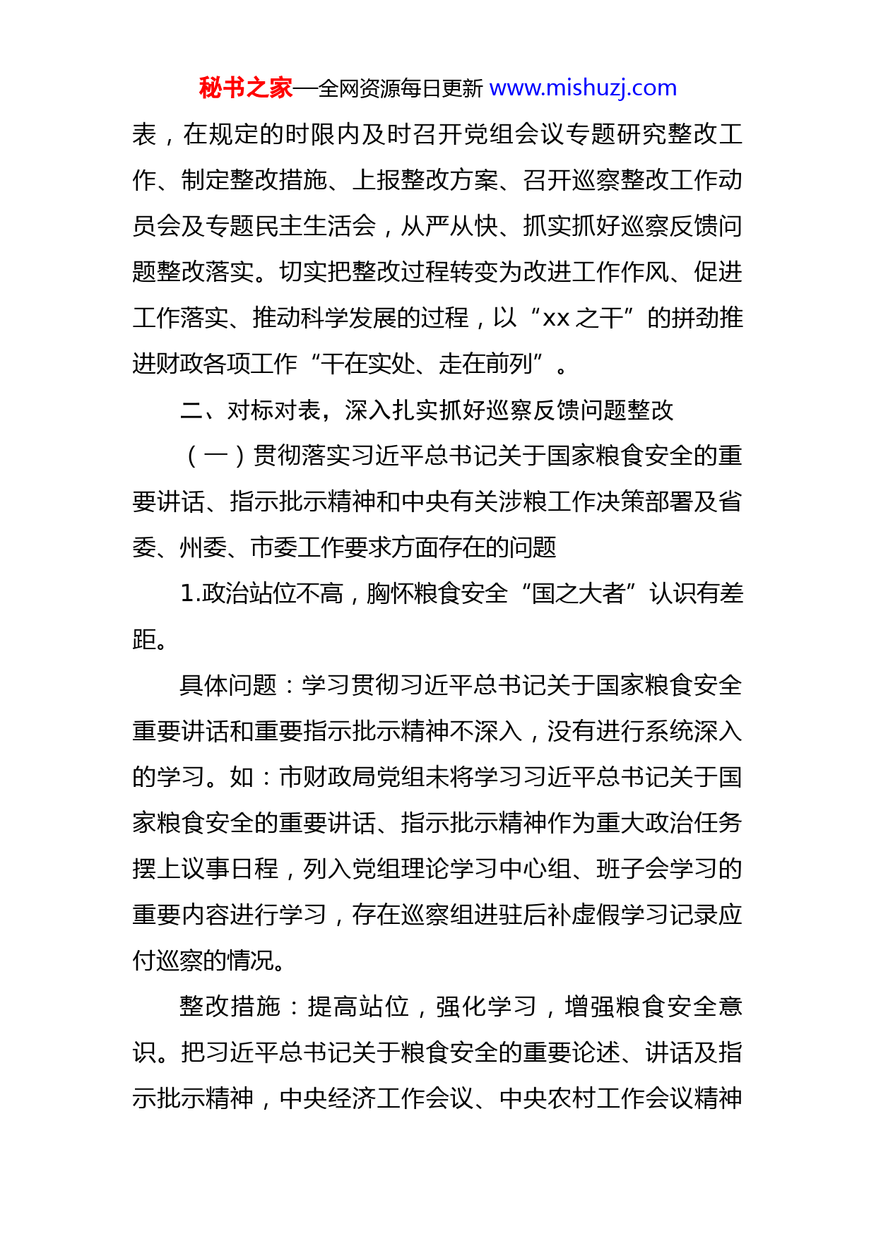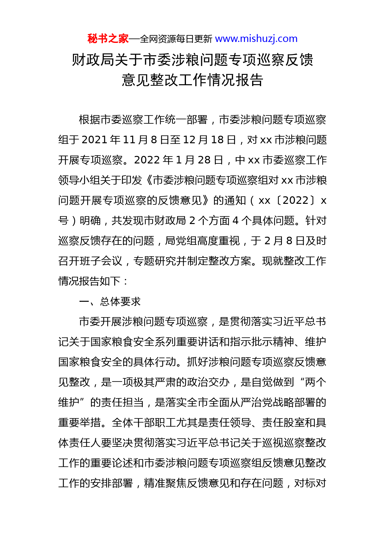 秘书之家—全网资源每日更新www.mishuzj.com财政局关于市委涉粮问题专项巡察反馈意见整改工作情况报告根据市委巡察工作统一部署,市委涉粮问题专项巡察组于2021年11月8日至12月18日,对xx市涉粮问题开展专项巡察。2022年1月28日,中xx市委巡察工作领导小组关于印发《市委涉粮问题专项巡察组对xx市涉粮问题开展专项巡察的反馈意见》的通知(xx〔2022〕x号)明确,共发现市财政局2个方面4个具体问题。针对巡察反馈存在的问题,局党组高度重视,于2月8日及时召开班子会议,专题研究并制定整改方案。现就整改工作情况报告如下:一、总体要求市委开展涉粮问题专项巡察,是贯彻落实习近平总书记关于国家粮食安全系列重要讲话和指示批示精神、维护国家粮食安全的具体行动。抓好涉粮问题专项巡察反馈意见整改,是一项极其严肃的政治交办,是自觉做到“两个维护”的责任担当,是落实全市全面从严治党战略部署的重要举措。全体干部职工尤其是责任领导、责任股室和具体责任人要坚决贯彻落实习近平总书记关于巡视巡察整改工作的重要论述和市委涉粮问题专项巡察组反馈意见整改工作的安排部署,精准聚焦反馈意见和存在问题,对标对秘书之家—全网资源每日更新www.mishuzj.com表,在规定的时限内及时召开党组会议专题研究整改工作、制定整改措施、上报整改方案、召开巡察整改工作动员会及专题民主生活会,从严从快、抓实抓好巡察反馈问题整改落实。切实把整改过程转变为改进工作作风、促进工作落实、推动科学发展的过程,以“xx之干”的拼劲推进财政各项工作“干在实处、走在前列”。二、对标对表,深入扎实抓好巡察反馈问题整改(一)贯彻落实习近平总书记关于国家粮食安全的重要讲话、指示批示精神和中央有关涉粮工作决策部署及省委、州委、市委工作要求方面存在的问题1.政治站位不高,胸怀粮食安全“国之大者”认识有差距。具体问题:学习贯彻习近平总书记关于国家粮食安全重要讲话和重要指示批示精神不深入,没有进行系统深入的学习。如:市财政局党组未将学习习近平总书记关于国家粮食安全的重要讲话、指示批示精神作为重大政治任务摆上议事日程,列入党组理论学习中心组、班子会学习的重要内容进行学习,存在巡察组进驻后补虚假学习记录应付巡察的情况。整改措施:提高站位,强化学习,增强粮食安全意识。把习近平总书记关于粮食安全的重要论述、讲话及指示批示精神,中央经济工作会议、中央农村工作会议精神秘书之家—全网资源每日更新www.mishuzj.com和粮食流通、粮食储备及监管等方面的政策法规学习和贯彻落实纳入财政局重要议事日程,列入班子和党组理论中心组(扩大)学习第一议题。2月下旬组织学习“新时代国家粮食安全观亟待确立——深入学习习近平总书记关于粮食安全的重要论述”;3月初传达学习“习近平总书记关于粮食安全重要论述及指示批示内容摘要”。牵头领导:责任领导:责任股室:责任人:整改时限:立行立改,长期坚持。整改情况:2021年11月15日党员大会组织学习《汲取涉粮案件教训》;2021年11月25日理论中心组(扩大)学习《保险护航安心种粮(政策解读)》;2021年12月10日理论中心组(扩大)学习《牢牢把握粮食安全主动权》;2022年2月8日党组会议《专题研究市委涉粮问题专项巡察反馈意见整改方案》;2022年2月17日财政局班子专题学习研究粮食安全问题;2022年2月23日理论中心组(扩大)学习《深入学习习近平总书记关于粮食安全的重要论述》。2.工作重视不够,贯彻落实新时期国家粮食安全战略不到位。秘书之家—全网资源每日更新www.mishuzj.com具体问题:对新时期国家粮食安全战略重要性认识不足,大局意识不强,未深入研究粮食安全工作,分析粮食工作对地方经济社会稳定发展的积极作用。如:市财政局仅在班子会议中传达过部分与资金有关的文件精神,对涉粮资金安排、使用和监管乏力。整改措施:一是在2月底前研究并提出粮食风险基金配套、粮食资金补助和仓储工程款项清算计划,报请市人民政府研究批复后筹集资金清算。牵头领导:责任领导:责任股室:责任人:整改时限:2022年3月30日前整改到位,长期坚持。整改情况:2022年2月8日,市财政局党组会议《专题研究市委涉粮专项巡察反馈意见整改方案》,就涉及的资金等问题进行研究。二是根据《xx省人民政府关于进一步完善粮食风险基金管理办法的通知》要求,将市级粮食风险基金纳入财政预算给予保障。牵头领导:责任领导:秘书之家—全网资源每日更新www.mishuzj.com责任股室:责任人:整改时限:立行立改,长期坚持。整改情况:根据市财政局建议并经人大批复,已将2022年度市级配套粮食风险基金xxx万元纳入财政预算。三是拟定于3月份对粮食资金开展专项检查。牵头领导:责任领导:责任股室:责任人:整改时限:立行立改,长期坚持。整改情况:已于2022年2月22、23日对2017年以来的涉粮进行了专项检查。(二)粮食业务主管部门落实监管责任方面存在的问题3.粮食领域监管责任缺失。具体问题:对市级储备粮数量、质量、储存安全监管不到位。市发改局粮食业务主管部门职能作用发挥不充分,牵头组织市财政局、市场监管局等部门开展涉粮领域综合监管和执法不力,各部门间协作联动不够,未形成协同负责、齐抓共管的工作格局。如:2018年至2020年,市发改局未组