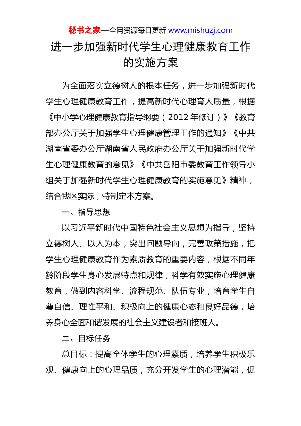 秘书之家—全网资源每日更新www.mishuzj.com进一步加强新时代学生心理健康教育工作的实施方案为全面落实立德树人的根本任务,进一步加强新时代学生心理健康教育工作,提高新时代心理育人质量,根据《中小学心理健康教育指导纲要(2012年修订)》《教育部办公厅关于加强学生心理健康管理工作的通知》《中共湖南省委办公厅湖南省人民政府办公厅关于加强新时代学生心理健康教育的意见》《中共岳阳市委教育工作领导小组关于加强新时代学生心理健康教育的实施意见》精神,结合我区实际,特制定本方案。一、指导思想以习近平新时代中国特色社会主义思想为指导,坚持立德树人、以人为本,突出问题导向,完善政策措施,把学生心理健康教育作为素质教育的重要内容,根据不同年龄阶段学生身心发展特点和规律,科学有效实施心理健康教育,做到内容科学、流程规范、队伍专业,培育学生自尊自信、理性平和、积极向上的健康心态和良好品德,培养身心全面和谐发展的社会主义建设者和接班人。二、目标任务总目标:提高全体学生的心理素质,培养学生积极乐观、健康向上的心理品质,充分开发学生的心理潜能,促秘书之家—全网资源每日更新www.mishuzj.com进学生身心和谐可持续发展,为学生健康成长和幸福生活奠定基础。主要任务:以发展性教育为主,预防性教育为辅,面向全体学生,开展发展性的心理健康教育。对于少数有心理困扰和心理障碍的学生,给予科学有效的心理咨询和辅导。三、基本原则1.科学性原则。以素质教育思想为指导,以心理教育理论为基础,根据学生身心发展的特点与规律,采用科学的方法,实施有针对性、实效性的心理健康教育。2.普及性原则。中小学心理健康教育是学校素质教育的重要内容,主要对象为全体学生。3.发展性原则。心理健康教育的重点在于增强适应能力、优化心理素质、开发潜能,促进学生的健康发展。4.主体性原则。充分尊重学生的主体地位,鼓励学生主动参与,引导学生自我认识,自我教育,做自我发展的主人。5.预防性原则。有计划、有步骤地进行心理健康教育,使学生能了解有关心理健康常识,培养自我心理调节能力,避免和减少心理问题的产生,对个别严重心理问题能及时甄别和转介。四、主要内容秘书之家—全网资源每日更新www.mishuzj.com普及心理健康基本知识,树立心理健康意识,了解简单的心理调节方法,认识心理异常现象,以及初步掌握心理保健常识,其重点是学会学习、人际交往、生涯规划以及生活和社会适应等方面的常识。小学阶段低年级:帮助学生适应新的环境、新的集体、新的学习生活和感受学习知识的乐趣;乐与老师、同学交往,在谦让、友善的交往中体验友情。小学阶段中、高年级:帮助学生在学习生活中品尝解决困难的快乐,调整学习心态,提高学习兴趣与自信心,正确对待自己的学习成绩,克服厌学心理,体验学习成功的乐趣,培养面临毕业升学的进取态度;培养集体意识,在班级活动中,善于与更多的同学交往,养成开朗、合群、乐学、自立的健康人格,培养自主、自动参与活动的能力。初中阶段:帮助学生适应中学的学习环境和学习要求,培养正确的学习观念,发展学习能力,学会科学用脑,改善学习方法;把握升学选择的方向;了解自己,克服青春期的烦恼,逐步学会调节和控制自己的情绪,抑制自己的冲动行为;加强自我认识,客观地评价自己,积极与同学、老师和家长进行有效的沟通;逐步适应生活和社会的各种变化,培养对挫折的耐受能力。高中阶段:帮助学生适应高中学习环境,发展创造性秘书之家—全网资源每日更新www.mishuzj.com思维,开发学习的潜能,在克服困难取得成绩的学习生活中获得积极的情感体验;在了解自己的能力、特长、兴趣和社会就业条件的基础上,确立自己的职业志向,进行职业的选择和准备;正确认识自己的人际关系状况,正确对待与异性伙伴的交往,建立对他人积极的情感反应和体验。提高承受挫折和应对挫折的能力,形成良好的意志品质。五、主要举措(一)创新心理健康教育工作体系1.强化心理健康教育课程建设。将心理健康教育纳入课程,充分发挥课堂教学主渠道作用,各学校统筹利用班团队课、综合实践课、地方课程或学校课程,确保每个班级每两周开设1课时心理健康教育课。课程开展应遵循各年龄段学生心理发展特点,内容主要有人际交往、情绪调节、亲子关系、学习解压、生涯规划、生命教育、挫折教育等,形式主要有团体辅导、心理训练、情境设计、问题辨析、角色扮演、游戏辅导、心理情景剧、专题讲座等。2.规范心理辅导场所建设。全面加强心理辅导室场所建设,力争实现心理辅导室全覆盖。到2022年底,在校学生1000人左右的中小学校和所有乡镇中心学校全面建成心理辅导室,建立健全值秘书之家—全网资源每日更新www.mishuzj.com班、预约、辅导、回信、档案建设及移交等管理制度,确保每周开放时间不少于5小时;对办学规模较小的学校,可加强校际联系,成立片区心理辅导中心或通过走教支教等方式予以保障。3.丰富心理健康教育资源建设。加强学校心理辅导室与阳光服务中心、家长学校等平台融合,创造条件开通24小时阳光心理援助热线、网络预约专线和咨询邮箱等线上线下相结合的心理疏导途径,做好常态化心理咨询服务(或购买社会机构的服务)。到2024年,