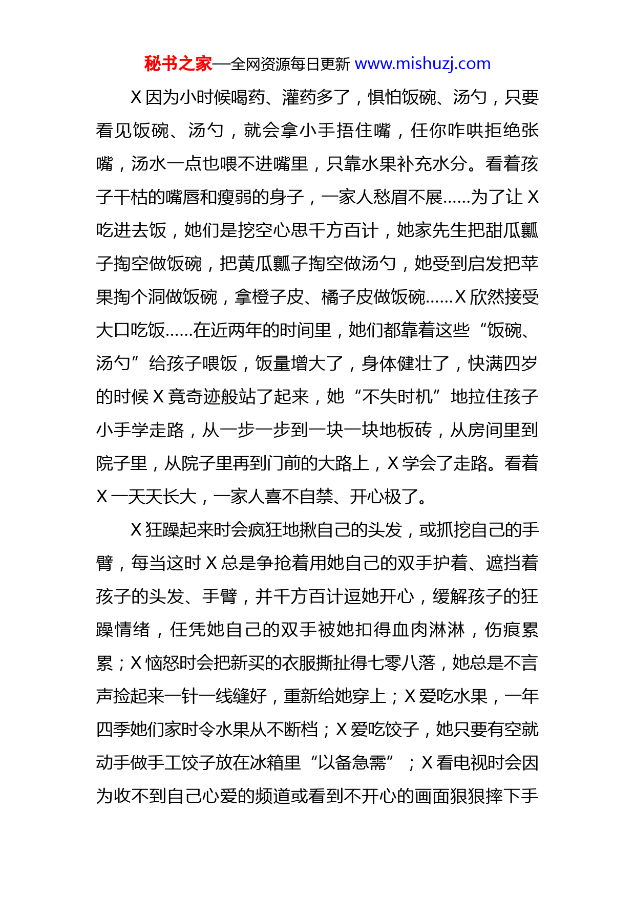 秘书之家—全网资源每日更新www.mishuzj.com道德模范先进事迹材料X,女,大专文化,中共党员,1964年8月生于X市X镇X村,19X年参加工作到X乡人民政府,先后担任宣传干事、文化站长、妇联主任,19X年过渡为国家公务员,20X年调任X市文化局,竞聘上岗剧目创作室主任至今。国家二级编剧,X省戏剧家协会会员、中国戏剧家协会会员、文化和旅游部“千人计划”第三期学员。X对工作认真负责、爱岗敬业,为人诚实守信、团结友善。2001年她收养了遗弃女孩儿X,并在收养证书的承诺栏内诚恳地写下了承诺:“先抚养孩子成人,再培养孩子成才!”就是这一声“承诺”,成就了X“诚实诚恳、信用信任”的“完美人生”。X三个月时候被诊断出“小头畸形”(脑瘫),福利院的院长打电话让她把孩子送过去由福利院抚养,并说“早晚想她了,你来看看”!可她望着目光呆痴、孤立无助的孩子,想象着孩子的艰难人生,母爱的本能在她的心底油然而生,她们夫妇达成共识决计养下去,第二天就抱孩子住进了X儿童医院。之后的几年间是一段艰辛的求治之路……X儿童医院、X脑瘫医院……求治的结果:花钱多、疗效小,并有专家告诉她“这是国际难题”……秘书之家—全网资源每日更新www.mishuzj.comX因为小时候喝药、灌药多了,惧怕饭碗、汤勺,只要看见饭碗、汤勺,就会拿小手捂住嘴,任你咋哄拒绝张嘴,汤水一点也喂不进嘴里,只靠水果补充水分。看着孩子干枯的嘴唇和瘦弱的身子,一家人愁眉不展……为了让X吃进去饭,她们是挖空心思千方百计,她家先生把甜瓜瓤子掏空做饭碗,把黄瓜瓤子掏空做汤勺,她受到启发把苹果掏个洞做饭碗,拿橙子皮、橘子皮做饭碗……X欣然接受大口吃饭……在近两年的时间里,她们都靠着这些“饭碗、汤勺”给孩子喂饭,饭量增大了,身体健壮了,快满四岁的时候X竟奇迹般站了起来,她“不失时机”地拉住孩子小手学走路,从一步一步到一块一块地板砖,从房间里到院子里,从院子里再到门前的大路上,X学会了走路。看着X一天天长大,一家人喜不自禁、开心极了。X狂躁起来时会疯狂地揪自己的头发,或抓挖自己的手臂,每当这时X总是争抢着用她自己的双手护着、遮挡着孩子的头发、手臂,并千方百计逗她开心,缓解孩子的狂躁情绪,任凭她自己的双手被她扣得血肉淋淋,伤痕累累;X恼怒时会把新买的衣服撕扯得七零八落,她总是不言声捡起来一针一线缝好,重新给她穿上;X爱吃水果,一年四季她们家时令水果从不断档;X爱吃饺子,她只要有空就动手做手工饺子放在冰箱里“以备急需”;X看电视时会因为收不到自己心爱的频道或看到不开心的画面狠狠摔下手秘书之家—全网资源每日更新www.mishuzj.com里的遥控器,或把手里的遥控器砸向电视机,一年内她们家曾经换下过三台电视机,摔坏的遥控器不计其数,但是她们全家人从无责怪、从无怨言,常常为电视机没有掉下来砸伤孩子而庆幸。远在外地工作的儿子时不时打电话回来问问“X这些日又长能(处)了没有?又有进步没有?”X就是这样在她们温馨的家庭里被呵护着、被珍爱着。曾被医学界判为“不治顽症”、“终生不能行走”的“痉挛性从重型偏瘫”女孩儿,如今竟奇迹般直立行走,且日常用语、日常用具清晰辨认,手拿电视遥控可以自如搜索到自己心爱的频道,控制音量大小,来了客人搬凳让座,看到自己心爱的饭菜端上餐桌,她会点头致谢。更不可思议的是,“无有任何语言功能”(专家的话)的X竟能清晰、亲昵地呼出“爸爸”“妈妈”……这些都被医学界专家称为“奇迹”。二十年了,屈指算来,七千多个日日夜夜,她茹苦含辛养育着与自己无任何血缘关系的脑瘫女孩儿,喂她吃喝、帮她拉撒,助她站立、教她行走,与她如影随行、和她相伴左右,不离不弃、无怨无悔。就是这样,X凭着坚强的毅力,克服了常人望而生畏的困难,趟出了一条常人不敢涉足的道路……《X日报》曾以《X》、《X》杂志以《X》为题先后报道了这一事迹;《X日报》、《X信息》也曾做过报道;她秘书之家—全网资源每日更新www.mishuzj.com家先生远在贵州的老战友不远千里寄来字画“大爱无疆、善行天下”!20X年被“X省委宣传部、X省文明办、X省妇女联合会”等五部局授予“X省最美家庭”,20X年跟随“X省最美家庭报告团”巡回报告,在社会上产生广泛影响,20X年被中华全国妇女联合会授予“全国五好家庭”。二十年来,她在生活和工作中精彩地扮演着“双重角色”,她一方面尽心竭力用爱心构筑着她的特殊家庭,关爱着她的智障女儿,另一方面,她不忘初心使命牢记编剧职责,悉心创作。20X年,她从中国文明网上看到“感动X十大人物X”女士义务收养X名孤残儿童,履行着一名共产党员服务人民、奉献社会的最高宗旨,让“春潮涌动在X大地”……她震惊了——“我养育一个孤残儿,就被累得筋疲力尽、呲牙咧嘴,陈大姐竟然为X个孤残儿撑起一片蓝天?”此后她又看到一篇文章说:在中国社会转型期,由于社会道德的滑坡、家庭责任感的缺失加之人口流动、天灾人祸,孤残儿童在一些地区出现成倍增长趋势,如何保障他们的生活、成长和教育,是全社会共同关注的大问题。看到这里,编剧的责任感和创作激情在她胸中涌动:她要以陈玉芳为原型,以自己的亲身经历做铺垫,创作一秘书之家—全网资源每日更新www.mishuzj.com部关爱孤残儿的戏剧。她到X采访了陈玉芳,走进了X的生活,很快