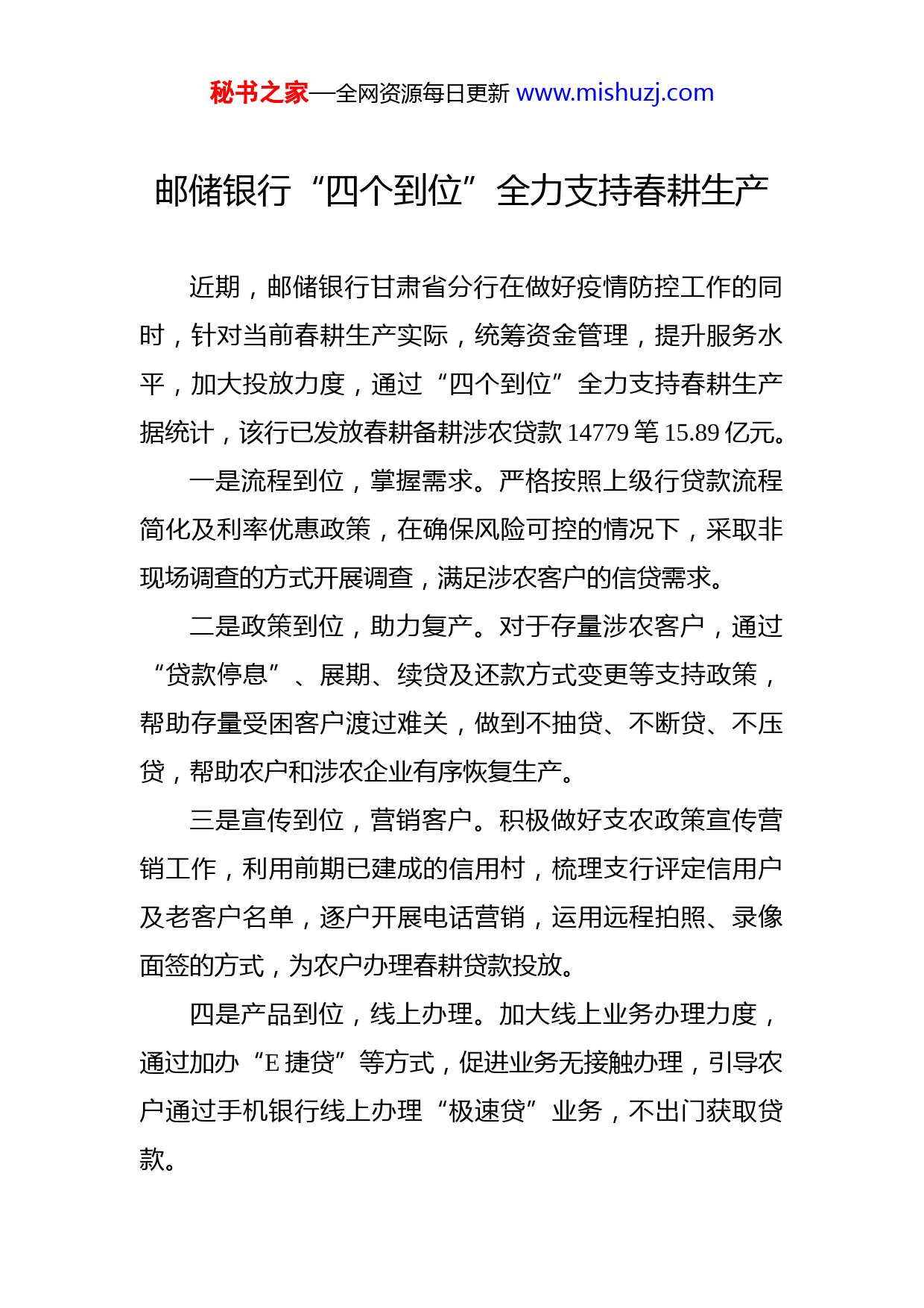 秘书之家—全网资源每日更新www.mishuzj.com邮储银行“四个到位”全力支持春耕生产近期,邮储银行甘肃省分行在做好疫情防控工作的同时,针对当前春耕生产实际,统筹资金管理,提升服务水平,加大投放力度,通过“四个到位”全力支持春耕生产据统计,该行已发放春耕备耕涉农贷款14779笔15.89亿元。一是流程到位,掌握需求。严格按照上级行贷款流程简化及利率优惠政策,在确保风险可控的情况下,采取非现场调查的方式开展调查,满足涉农客户的信贷需求。二是政策到位,助力复产。对于存量涉农客户,通过“贷款停息”、展期、续贷及还款方式变更等支持政策,帮助存量受困客户渡过难关,做到不抽贷、不断贷、不压贷,帮助农户和涉农企业有序恢复生产。三是宣传到位,营销客户。积极做好支农政策宣传营销工作,利用前期已建成的信用村,梳理支行评定信用户及老客户名单,逐户开展电话营销,运用远程拍照、录像面签的方式,为农户办理春耕贷款投放。四是产品到位,线上办理。加大线上业务办理力度,通过加办“E捷贷”等方式,促进业务无接触办理,引导农户通过手机银行线上办理“极速贷”业务,不出门获取贷款。秘书之家—全网资源每日更新www.mishuzj.com