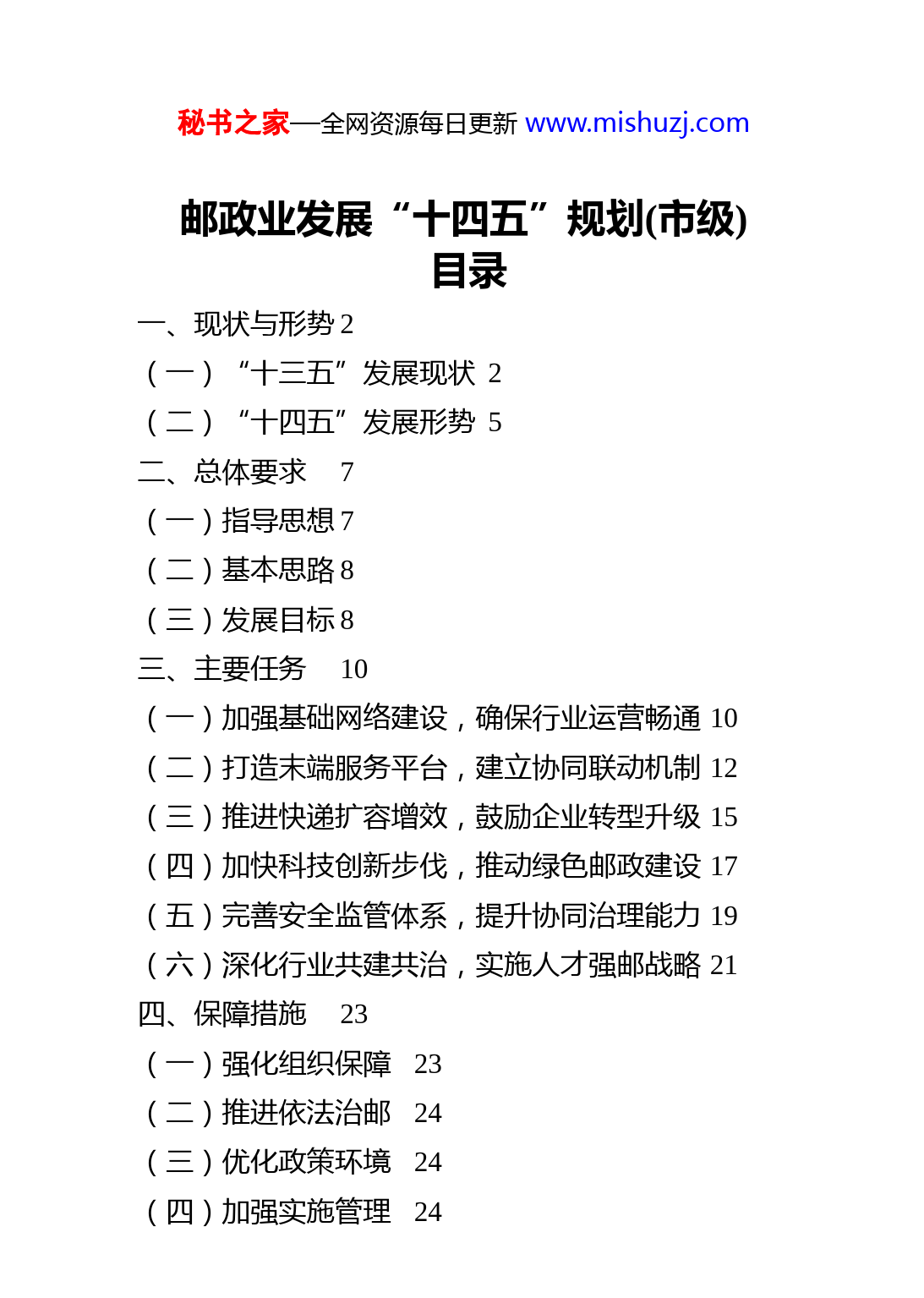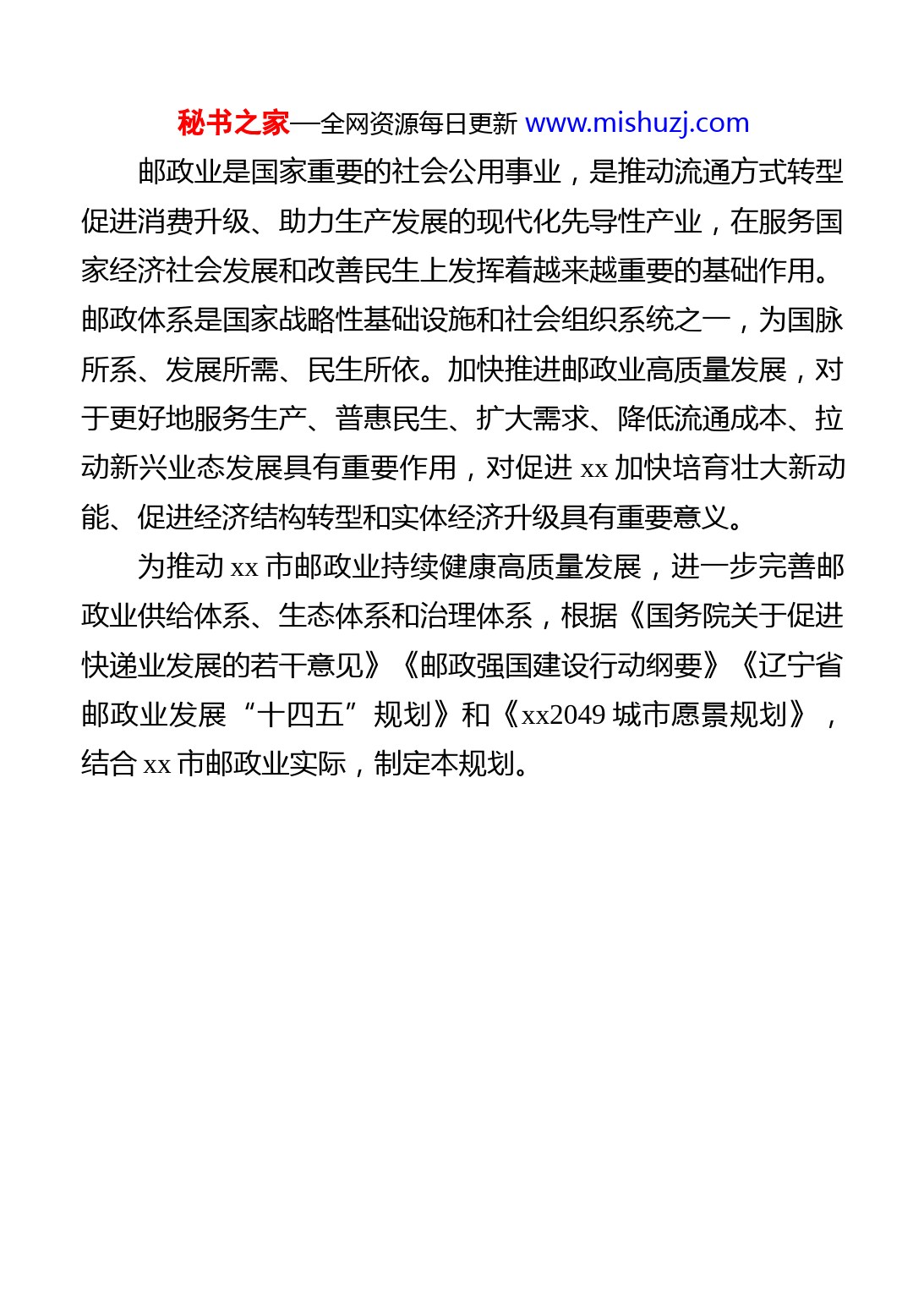 秘书之家—全网资源每日更新www.mishuzj.com邮政业发展“十四五”规划(市级)目录一、现状与形势2(一)“十三五”发展现状2(二)“十四五”发展形势5二、总体要求7(一)指导思想7(二)基本思路8(三)发展目标8三、主要任务10(一)加强基础网络建设,确保行业运营畅通10(二)打造末端服务平台,建立协同联动机制12(三)推进快递扩容增效,鼓励企业转型升级15(四)加快科技创新步伐,推动绿色邮政建设17(五)完善安全监管体系,提升协同治理能力19(六)深化行业共建共治,实施人才强邮战略21四、保障措施23(一)强化组织保障23(二)推进依法治邮24(三)优化政策环境24(四)加强实施管理24秘书之家—全网资源每日更新www.mishuzj.com邮政业是国家重要的社会公用事业,是推动流通方式转型促进消费升级、助力生产发展的现代化先导性产业,在服务国家经济社会发展和改善民生上发挥着越来越重要的基础作用。邮政体系是国家战略性基础设施和社会组织系统之一,为国脉所系、发展所需、民生所依。加快推进邮政业高质量发展,对于更好地服务生产、普惠民生、扩大需求、降低流通成本、拉动新兴业态发展具有重要作用,对促进xx加快培育壮大新动能、促进经济结构转型和实体经济升级具有重要意义。为推动xx市邮政业持续健康高质量发展,进一步完善邮政业供给体系、生态体系和治理体系,根据《国务院关于促进快递业发展的若干意见》《邮政强国建设行动纲要》《辽宁省邮政业发展“十四五”规划》和《xx2049城市愿景规划》,结合xx市邮政业实际,制定本规划。秘书之家—全网资源每日更新www.mishuzj.com一、现状与形势(一)“十三五”发展现状“十三五”时期,xx市邮政业改革发展实现了量质齐升。以xx市获评“第二批电商和快递协同发展试点城市”和“中国快递示范城市”为标志,“xx沿渤海快递产业带”、“xx现代新邮路”、末端投递服务体系架构基本成型,发展规模快速扩大、基础设施逐步升级、服务网络不断完善、服务能力显著增强、服务均等水平提升、普惠民生扎实推进、监管效能有效提升、安全保障稳固有力、供给侧改革有序推进、产业发展协同联动,为“十四五”时期继续推进行业高质量发展奠定了坚实基础。发展规模快速扩大,基础设施逐步升级。“十三五”时期xx市邮政业量、质并进,在全市经济和社会发展中的基础性、公共性、服务性、先导性作用日益显著。“十三五”时期,xx市邮政行业业务总量和业务收入实现翻番,2019年业务总量完成xx.xx亿元,行业规模达“十二五”末的x.x倍,年均增速达xx.x%,业务总量占全省邮政业的比重维持在xx%以上;业务收入实现xx.xx亿元,占xx市服务业增加值的比重由“十二五”末的x.xx%跃升至2019年的x.xx%,业务规模居全省第二位;全市普遍服务、快递服务业务量(出港件)分别达到x.xx亿件和x.xx亿件,快递业务规模年均增速达xx%;全市依秘书之家—全网资源每日更新www.mishuzj.com法取得快递经营许可证的企业达到xxx家,各类营业场所超过xxxx个,全行业新增就业岗位xxxx个以上。“三园一带、仓配一体”的“xx沿渤海快递产业带”初具规模;全市新增快递服务示范点和旗舰店xx处,建成邮政文明窗口xx处,乡镇快递网点覆盖率xxx%。服务网络不断完善、服务能力显著增强。“十三五”时期法定四项邮政普遍服务业务开办水平提高,“县县设分拨、乡乡有网点、村村通快递”基本实现、公共配送网络布局建设成效显著。2019年,全市邮政普遍服务营业场所xxx个,平均营业网点服务面积xx.x平方公里、服务人口x.xx万人;新建住宅楼信报箱安装率xxx%,行政村村邮站及其他接收邮件的场所覆盖率xxx%。新增快递末端网点xxx余个,重点快递企业中心城区网点覆盖率xxx%、次中心城区和重点镇网点覆盖率xx%以上;新增商业网点快件综合服务站xxx余个、标准化校园综合服务站xx个,全面实现在连高校“快递进校园”。揽收、分拣、运输、投递等环节的自动化、标准化、信息化水平显著提升。“点多、线长、面广、全面沟通城乡”的现代化邮政服务网络基本形成。服务均等水平提升,普惠民生扎实推进。“十三五”时期以邮政普遍服务为基础,现代化邮政基础设施体系基本形成,普惠邮政发展成效初显。2019年,xx市邮政业实现邮政普遍服务全市城区每日投递频次x.x次,农村每周平均投递频次秘书之家—全网资源每日更新www.mishuzj.comx.xx次;同城快递xx小时投递率达到xx%以上,基本实现当日达、次晨达。快件延误率、损毁率、丢失率分别在千分之八、万分之一、十万分之五以内;用户申诉受理率xxx%,用户申诉处理满意率xx%以上。全行业新增弹力筐xxxx个,配置托盘、隔板的营业网点数量超过xx%,已基本实现快件不着地,全市快递电子面单使用率超过xx%,推广应用新能源车辆xxxx余台,全市校园快递服务站纸箱回收率超过xx%。建成xxx处“新型村邮站”,叠加快递、电商、金融等功能,实现庄河市行政村全覆盖。建成xxx组智能信包箱并依据需求实现位置动态调整,为“智慧城市”建设提供重要支撑。监管效能有效提升,安全保障稳固有力。“十三五”时期行业安全监管水平和智慧化监管能力持续提升。2019年现场检查企业xxx家,出检xxx人次、各类调查测试xxx余处次;完成行业内xxx家“三新”单位核实认定;举办“x·xx”系列活动,发放宣传材料x.x万份,解答群众咨询xxx余人次;积极落