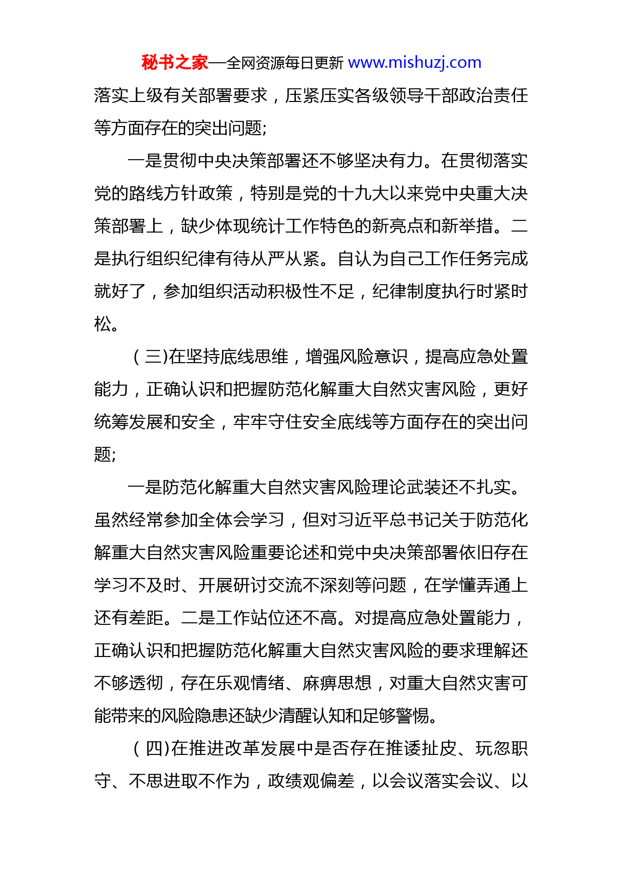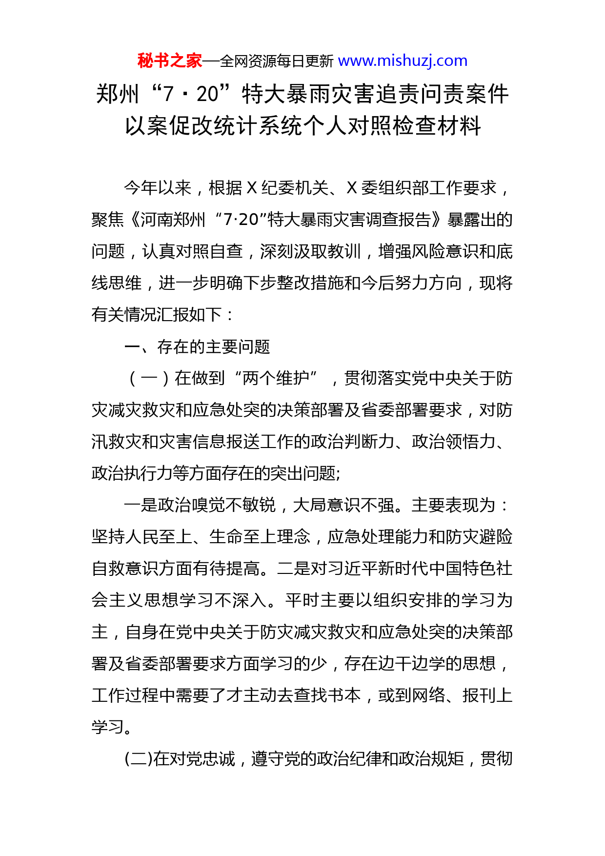 秘书之家—全网资源每日更新www.mishuzj.com郑州“7·20”特大暴雨灾害追责问责案件以案促改统计系统个人对照检查材料今年以来,根据X纪委机关、X委组织部工作要求,聚焦《河南郑州“7·20”特大暴雨灾害调查报告》暴露出的问题,认真对照自查,深刻汲取教训,增强风险意识和底线思维,进一步明确下步整改措施和今后努力方向,现将有关情况汇报如下:一、存在的主要问题(一)在做到“两个维护”,贯彻落实党中央关于防灾减灾救灾和应急处突的决策部署及省委部署要求,对防汛救灾和灾害信息报送工作的政治判断力、政治领悟力、政治执行力等方面存在的突出问题;一是政治嗅觉不敏锐,大局意识不强。主要表现为:坚持人民至上、生命至上理念,应急处理能力和防灾避险自救意识方面有待提高。二是对习近平新时代中国特色社会主义思想学习不深入。平时主要以组织安排的学习为主,自身在党中央关于防灾减灾救灾和应急处突的决策部署及省委部署要求方面学习的少,存在边干边学的思想,工作过程中需要了才主动去查找书本,或到网络、报刊上学习。(二)在对党忠诚,遵守党的政治纪律和政治规矩,贯彻秘书之家—全网资源每日更新www.mishuzj.com落实上级有关部署要求,压紧压实各级领导干部政治责任等方面存在的突出问题;一是贯彻中央决策部署还不够坚决有力。在贯彻落实党的路线方针政策,特别是党的十九大以来党中央重大决策部署上,缺少体现统计工作特色的新亮点和新举措。二是执行组织纪律有待从严从紧。自认为自己工作任务完成就好了,参加组织活动积极性不足,纪律制度执行时紧时松。(三)在坚持底线思维,增强风险意识,提高应急处置能力,正确认识和把握防范化解重大自然灾害风险,更好统筹发展和安全,牢牢守住安全底线等方面存在的突出问题;一是防范化解重大自然灾害风险理论武装还不扎实。虽然经常参加全体会学习,但对习近平总书记关于防范化解重大自然灾害风险重要论述和党中央决策部署依旧存在学习不及时、开展研讨交流不深刻等问题,在学懂弄通上还有差距。二是工作站位还不高。对提高应急处置能力,正确认识和把握防范化解重大自然灾害风险的要求理解还不够透彻,存在乐观情绪、麻痹思想,对重大自然灾害可能带来的风险隐患还缺少清醒认知和足够警惕。(四)在推进改革发展中是否存在推诿扯皮、玩忽职守、不思进取不作为,政绩观偏差,以会议落实会议、以秘书之家—全网资源每日更新www.mishuzj.com文件落实文件等形式主义、官僚主义问题;一是存在“好人”主义,谈具体事务多,敞开心扉谈思想、讲问题少,特别是在开展批评与自我批评时顾虑和担心比较多,往往以自我批评为主,相互批评大多是“蜻蜓点水”、浅尝即止,“红红脸、出出汗”还不够。二是“守纪律讲规矩”的意识有待加强。通过深入开展以案促改专题研讨、加强对党章党规党纪学习等,个人纪律规矩意识明显增强,思想和行动更加自觉。但也存在对纪律规矩掌握不全面、考勤制度执行不到位的问题。(五)在深入贯彻落实发展新理念,对防汛工作认识不足,统一指挥缺失、应急响应滞后、防范组织不力、抢险处置不当等履职尽责方面存在的突出问题;一是存在学用脱节现象。虽然也经常学习党的十九届历中全会精神,学习新发展理念以及市委有关防汛工作精神等,但学用结合不好,没能真正把统计工作和防汛救灾切实结合起来,二是基层工作开展的不够扎实,服务措施不够有力。深入群众、深入企业一线还不够,知其然而不知其所以然,解决实际问题的思路和办法不多。(六)在坚持以人民为中心的发展思想,满足人民对美好生活新期待、切实维护群众利益,建设系统集成、协同高效的防灾减灾和应急处突制度机制,提高综合治理成效等制度执行方面存在的突出问题。秘书之家—全网资源每日更新www.mishuzj.com一是联系群众不深入。无从谈起官僚主义,但工作中密切联系群众还是少,实际与群众沟通的水平较低,工作视野不开阔。二是为民服务的意识还需增强。潜意识中在处理对上负责和对群众负责的关系上出现偏差、造成联系基层、服务群众不深入,为民解难事、办实事上还不够有力有效。二、深刻剖析问题根源(一)理想信念有所弱化。虽然能够认真学习党的创新理论特别是习近平新时代中国特色社会主义思想,但有时不能持之以恒,存在零散化、碎片化、快餐化的现象,缺乏“挤”和“钻”的精神,学习内容上采取实用主义,存在“现用现学、急用急学、不用缓学”的现象,对自我“充电”和改造主观世界缺乏长期规划,没有与时俱进地用党的先进理论来武装头脑、指导自己的言行,(二)宗旨意识不够牢固。没有真正在思想上、行动上树立起全心全意为人民服务的公仆意识。坐在机关决策、处理的多,对实际企业运营情况关注了解不够,对实际工作中遇到的新情况、新问题缺乏深入的研究和思考。调研走访过程中,对重要指标研究的多,对实际问题关心的少;与群众沟通交流的少。(三)党性锤炼有所懈怠。在日常工作中,认为提高统计数据质量、提升政府统计公信力,研究经济社会运行秘书之家—全网资源每日更新www.mishuzj.com态势是自己的主要职责。在政治纪律的执行上有所松懈,面对全面从严治党的新形势、新任务、新要求,在坚持不懈加强党性锻炼