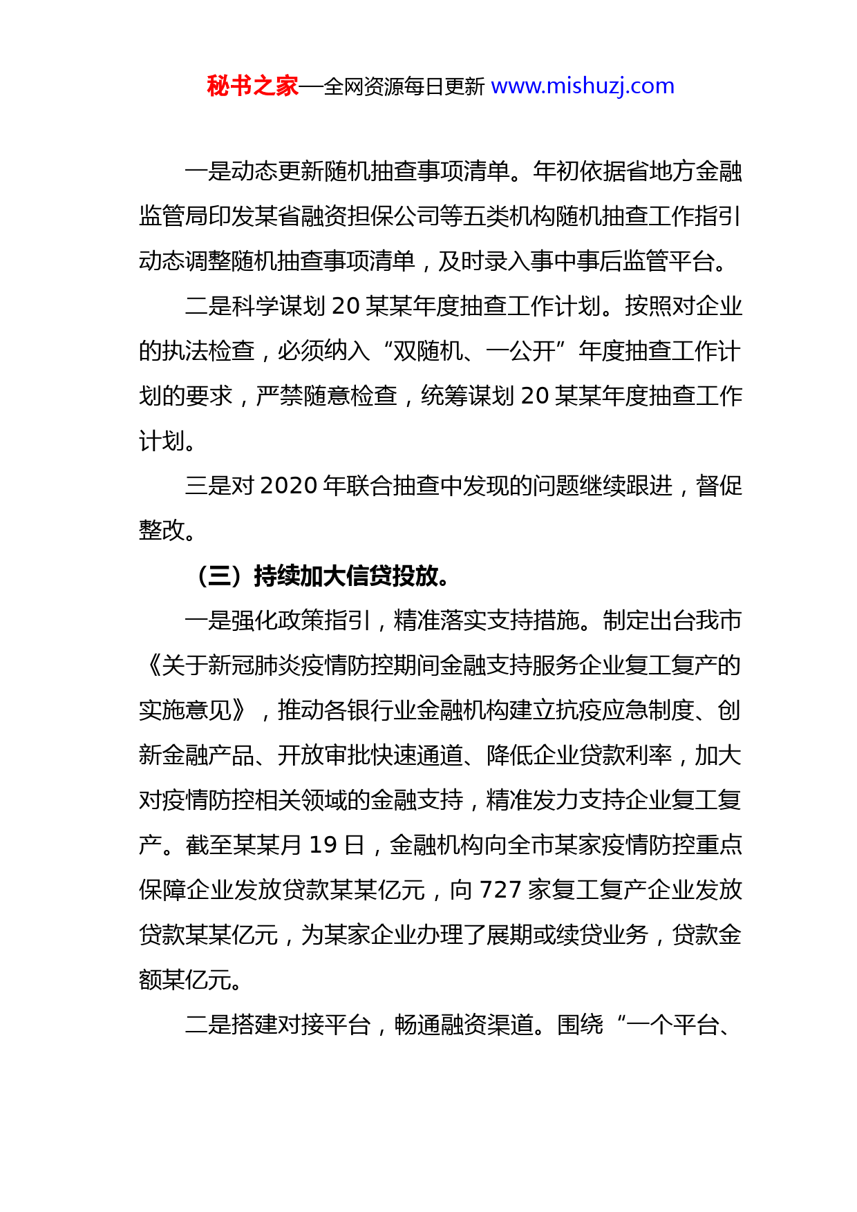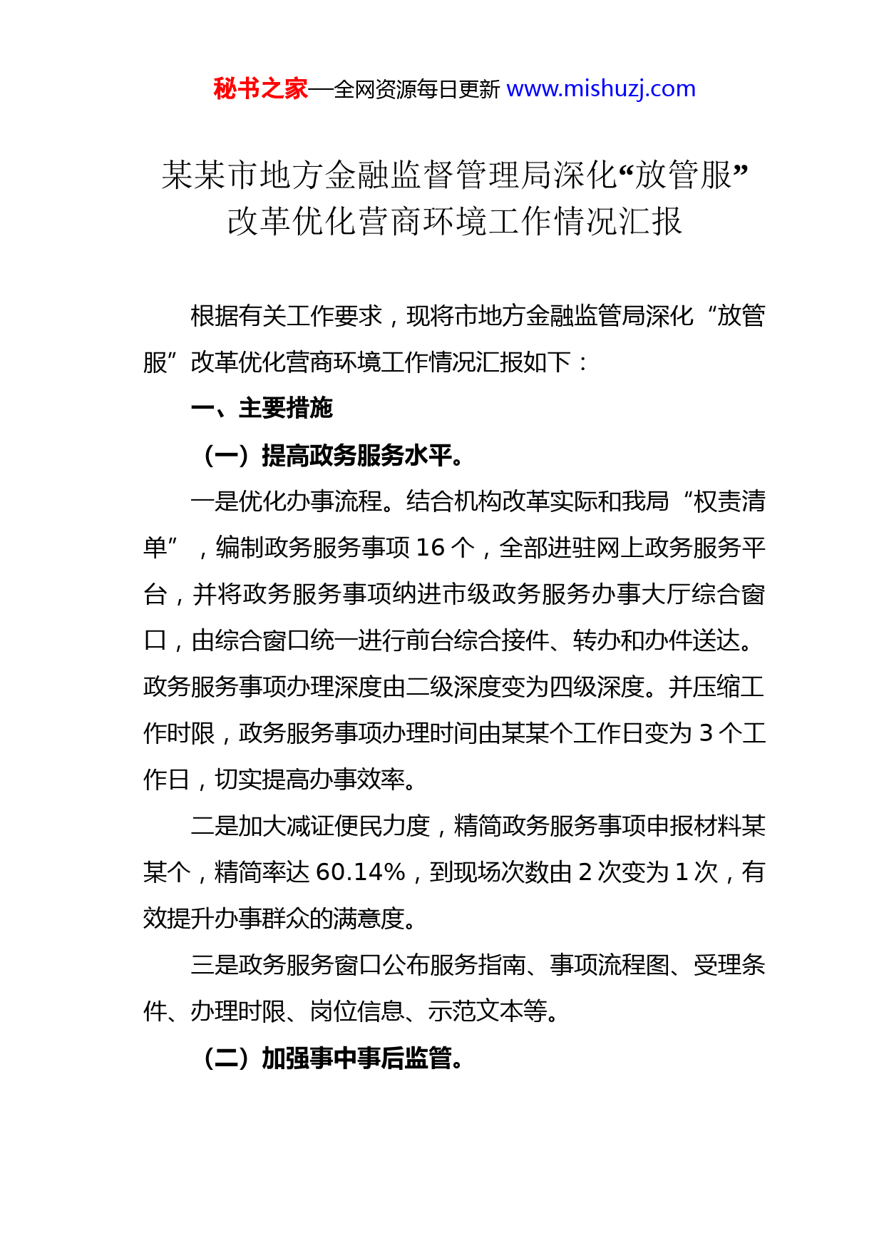 秘书之家—全网资源每日更新www.mishuzj.com“”某某市地方金融监督管理局深化放管服改革优化营商环境工作情况汇报根据有关工作要求,现将市地方金融监管局深化“放管服”改革优化营商环境工作情况汇报如下:一、主要措施(一)提高政务服务水平。一是优化办事流程。结合机构改革实际和我局“权责清单”,编制政务服务事项16个,全部进驻网上政务服务平台,并将政务服务事项纳进市级政务服务办事大厅综合窗口,由综合窗口统一进行前台综合接件、转办和办件送达。政务服务事项办理深度由二级深度变为四级深度。并压缩工作时限,政务服务事项办理时间由某某个工作日变为3个工作日,切实提高办事效率。二是加大减证便民力度,精简政务服务事项申报材料某某个,精简率达60.14%,到现场次数由2次变为1次,有效提升办事群众的满意度。三是政务服务窗口公布服务指南、事项流程图、受理条件、办理时限、岗位信息、示范文本等。(二)加强事中事后监管。秘书之家—全网资源每日更新www.mishuzj.com一是动态更新随机抽查事项清单。年初依据省地方金融监管局印发某省融资担保公司等五类机构随机抽查工作指引动态调整随机抽查事项清单,及时录入事中事后监管平台。二是科学谋划20某某年度抽查工作计划。按照对企业的执法检查,必须纳入“双随机、一公开”年度抽查工作计划的要求,严禁随意检查,统筹谋划20某某年度抽查工作计划。三是对2020年联合抽查中发现的问题继续跟进,督促整改。(三)持续加大信贷投放。一是强化政策指引,精准落实支持措施。制定出台我市《关于新冠肺炎疫情防控期间金融支持服务企业复工复产的实施意见》,推动各银行业金融机构建立抗疫应急制度、创新金融产品、开放审批快速通道、降低企业贷款利率,加大对疫情防控相关领域的金融支持,精准发力支持企业复工复产。截至某某月19日,金融机构向全市某家疫情防控重点保障企业发放贷款某某亿元,向727家复工复产企业发放贷款某某亿元,为某家企业办理了展期或续贷业务,贷款金额某亿元。二是搭建对接平台,畅通融资渠道。围绕“一个平台、秘书之家—全网资源每日更新www.mishuzj.com三项机制”,采取金融知识和形势讲座、金融产品推介、金融政策培训等多种形式,丰富银企对接渠道,促进务实沟通合作,真正搭建好企业融资服务桥梁。今年以来我局主动对接发改委、经信局、商务局、住建局等部门,及时收集疫情防控重点保障企业和复工复产企业名单,分6批向银行机构推荐某家企业和某个重点项目,鼓励引导各金融机构通过多种方式主动开展“线上”对接,结合企业生产经营和资金需求情况,创新金融产品和金融服务,加大信贷投放。举行了20某某年一季度全市复工复产对接会,对接项目某个,签约金额某亿元。三是加强督促考核,强化正向激励。制定《某市金融机构服务实体经营绩效评价激励办法》,做好金融机构服务实体经济绩效评价激励工作,着重考核民营企业贷款、制造业中长期贷款、小微企业贷款等主要指标,促进信贷持续稳步增长。3月末,全市各项贷款余额某亿元,较年初增加某亿元,同比多增某亿元,同比增长某%,增速居全省第某位;全市小微企业贷款余额(含个体工商户和小微企业主贷款)某亿元,较年初增加某亿元,同比增长某%;小微企业贷款户数某万户,较年初增加某户,较去年同期增加某万户。(四)着力扩大直接融资。秘书之家—全网资源每日更新www.mishuzj.com一是持续推进企业上市挂牌。深入摸排上市挂牌后备资源,引导企业申报上市挂牌奖补资金,研究更新上市挂牌奖补政策,1-3月,全市新增省股交中心“科创板”挂牌企业7家,截至3月末,全市上市企业1家、“新三板”累计挂牌企业15家、省股交中心挂牌企业某家。1-3月,全市实现直接融资某亿元。二是大力引导企业债权融资,鼓励企业通过企业债、公司债、中期票据等债权工具多样化融资,1-3月份全市债权融资某某亿元。三是加快市级股权投资基金运作,加强市级基金募投激励约束,引导各类投资基金对种子期、初创期的企业进行股权投资,截至目前市县两级已设立股权投资基金10只,总规模某某亿元,募集到位资金某某亿元,已投资项目某个,投资金额某亿元。(五)发挥融资担保增信作用。一是深入推进新型政银担业务,不断提升业务规模。3月末,全市新型政银担业务在保余额某某亿元,在保户数某某户。新增额某亿元,服务企业户数某户。已将科技型融资担保业务全部纳入新型政银担风险分担机制,3月末,我市科技融资担保在保余额某亿元,较年初新增某亿元,在保户秘书之家—全网资源每日更新www.mishuzj.com数某户,较年初新增某户。二是进一步降低企业融资成本。3月末,我市9家政策性融资担保机构平均担保费率0.7%,较年初降低某个百分点。(六)深入开展“四送一服双联”活动。落实驻企联络员、卫生健康指导员“两员”制度,我局认真制定落实企业复工疫情防控方案,成立了规上企业复工指导联络组,并对“四送一服双联”包保的3户重点企业和2个项目进行了走访调研,实地查看了相关企业的防疫工作开展情况,了解企业复工工作中存在的问题和困难。金融局联络组又陪同市政府副市长某某赴颍东区某突飞电器有限公司等3家企业两个重点项目实地调研企业复工复产情况,并召开座谈会。现场为企业