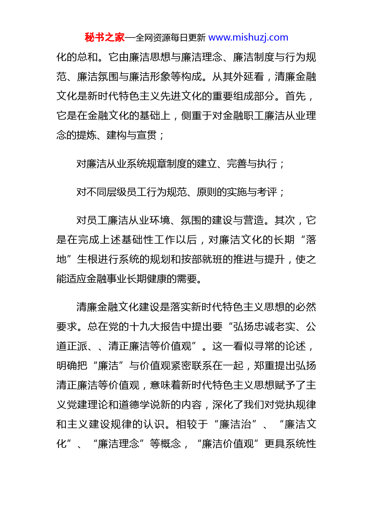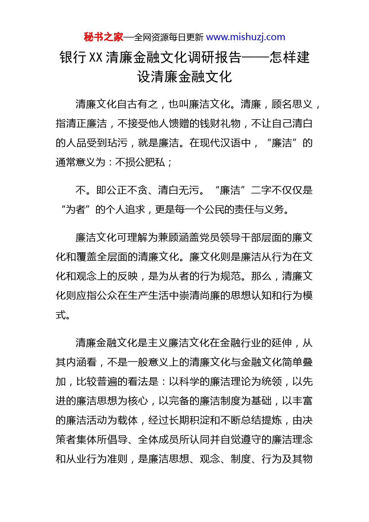 秘书之家—全网资源每日更新www.mishuzj.com银行XX清廉金融文化调研报告——怎样建设清廉金融文化清廉文化自古有之,也叫廉洁文化。清廉,顾名思义,指清正廉洁,不接受他人馈赠的钱财礼物,不让自己清白的人品受到玷污,就是廉洁。在现代汉语中,“廉洁”的通常意义为:不损公肥私;不。即公正不贪、清白无污。“廉洁”二字不仅仅是“为者”的个人追求,更是每一个公民的责任与义务。廉洁文化可理解为兼顾涵盖党员领导干部层面的廉文化和覆盖全层面的清廉文化。廉文化则是廉洁从行为在文化和观念上的反映,是为从者的行为规范。那么,清廉文化则应指公众在生产生活中崇清尚廉的思想认知和行为模式。清廉金融文化是主义廉洁文化在金融行业的延伸,从其内涵看,不是一般意义上的清廉文化与金融文化简单叠加,比较普遍的看法是:以科学的廉洁理论为统领,以先进的廉洁思想为核心,以完备的廉洁制度为基础,以丰富的廉洁活动为载体,经过长期积淀和不断总结提炼,由决策者集体所倡导、全体成员所认同并自觉遵守的廉洁理念和从业行为准则,是廉洁思想、观念、制度、行为及其物秘书之家—全网资源每日更新www.mishuzj.com化的总和。它由廉洁思想与廉洁理念、廉洁制度与行为规范、廉洁氛围与廉洁形象等构成。从其外延看,清廉金融文化是新时代特色主义先进文化的重要组成部分。首先,它是在金融文化的基础上,侧重于对金融职工廉洁从业理念的提炼、建构与宣贯;对廉洁从业系统规章制度的建立、完善与执行;对不同层级员工行为规范、原则的实施与考评;对员工廉洁从业环境、氛围的建设与营造。其次,它是在完成上述基础性工作以后,对廉洁文化的长期“落地”生根进行系统的规划和按部就班的推进与提升,使之能适应金融事业长期健康的需要。清廉金融文化建设是落实新时代特色主义思想的必然要求。总在党的十九大报告中提出要“弘扬忠诚老实、公道正派、、清正廉洁等价值观”。这一看似寻常的论述,明确把“廉洁”与价值观紧密联系在一起,郑重提出弘扬清正廉洁等价值观,意味着新时代特色主义思想赋予了主义党建理论和道德学说新的内容,深化了我们对党执规律和主义建设规律的认识。相较于“廉洁治”、“廉洁文化”、“廉洁理念”等概念,“廉洁价值观”更具系统性秘书之家—全网资源每日更新www.mishuzj.com哲理性和指导性,是主义党建理论和道德学说在当代的创造性运用和。那么,怎样建设清廉金融文化呢?带着这个课题,支行XX带队深入部门、深入基层一线,通过采取指导党建工作的开展、查看规章制度的落实、与干部员工的座谈讨论了解对干部员工的思想教育、梳理业务操作流程等形式进行广泛调研,总结归纳建设清廉金融文化的几点建议:新时代特色主义清廉文化是在既吸收、借鉴民族优秀传统文化成果,又深刻总结我们党长期以来反腐倡廉工作的基础上的,是我们党立党为公、执为民的执理念在廉洁文化形态上的反映,是我们党执的进步和升华。构建清廉金融文化,对内在于提高金融人自我修养,提升自律意识;对外则要严明规则,夯实制度根本和文化根基,打造整体合规氛围。“清廉”者,首先要经得起。世间繁华如飞花,红尘浮华迷人眼。古往今来,经不住利益而“落马”之有人在。其次要耐得住寂寞。身处金融系统,靠近老百姓的钱口袋,深知重重,更要提醒自己常怀警戒之心做到经济上清廉、治上清正、作风上清白。秘书之家—全网资源每日更新www.mishuzj.com当前,一些干部、高管身处要职,却治意识、纪律意识淡漠,“亲”“清”关系不明,被利益二字蒙蔽双眼,或背离了依法监管、为民监管、廉洁监管的初衷,或无视职责要求,知法犯法,从金融的监管者、管理者沦为金融风险的制造者、金融的带头者。他们的腐化堕落,不仅严重败坏了党风风,触犯法律,更使人民群众利益遭受了严重损失,最终一失足成千古恨。正所谓“垢尘不污玉,灵凰不啄膻”“苍蝇不叮无缝的”。作为金融工作者要明白“智者不为非其事,廉者不求非其有”的道理,面对利益和人情交换,要自觉亮起红灯,守住底线,以廉为遵,洁身自爱。制度的执行力需要有制度的系统性来支撑。在银行业廉洁风险的防控中,需要建立一整套机制,都需要把岗位作为最小的防控单位,不给廉洁风险防控留死角。对所有查找出来的廉洁风险点,从初期就要进行梳理、归纳、分析、总结,使大风险化小,小风险化无。银行内部部门之间,应该在廉洁风险的防控上一个整体,XX部门应服从防控大局,协调配合,将廉洁风险防控手段和措施进行整合大力挖掘部门XX自条线的风险点,注重防控流程的再造、梳理和总结,设置指标参数,划分XX项权力的合理界限,使每一项权力都要经受防控流程的监控和评估。要拓宽防秘书之家—全网资源每日更新www.mishuzj.com控的范围和领域。有针对性的对权力的运行进行跟踪,不给权力留任何钻空子的机会,使制度跟得上形势,主动适应权力的XX种复杂性和多样性。总之,清廉金融文化建设是新时代金融治理体系的现实需要,是营造风清气正金融从业氛围和优良金融治生态的迫切要求,是金融行业反腐倡廉斗争的一项系统工程,需要全共同参与、共同监督、共同配合,方能奏效。就此而言,清廉金融文化建设任重道远。