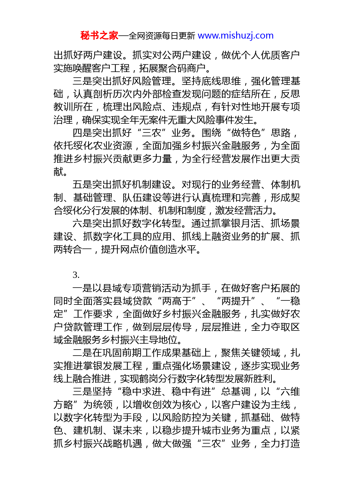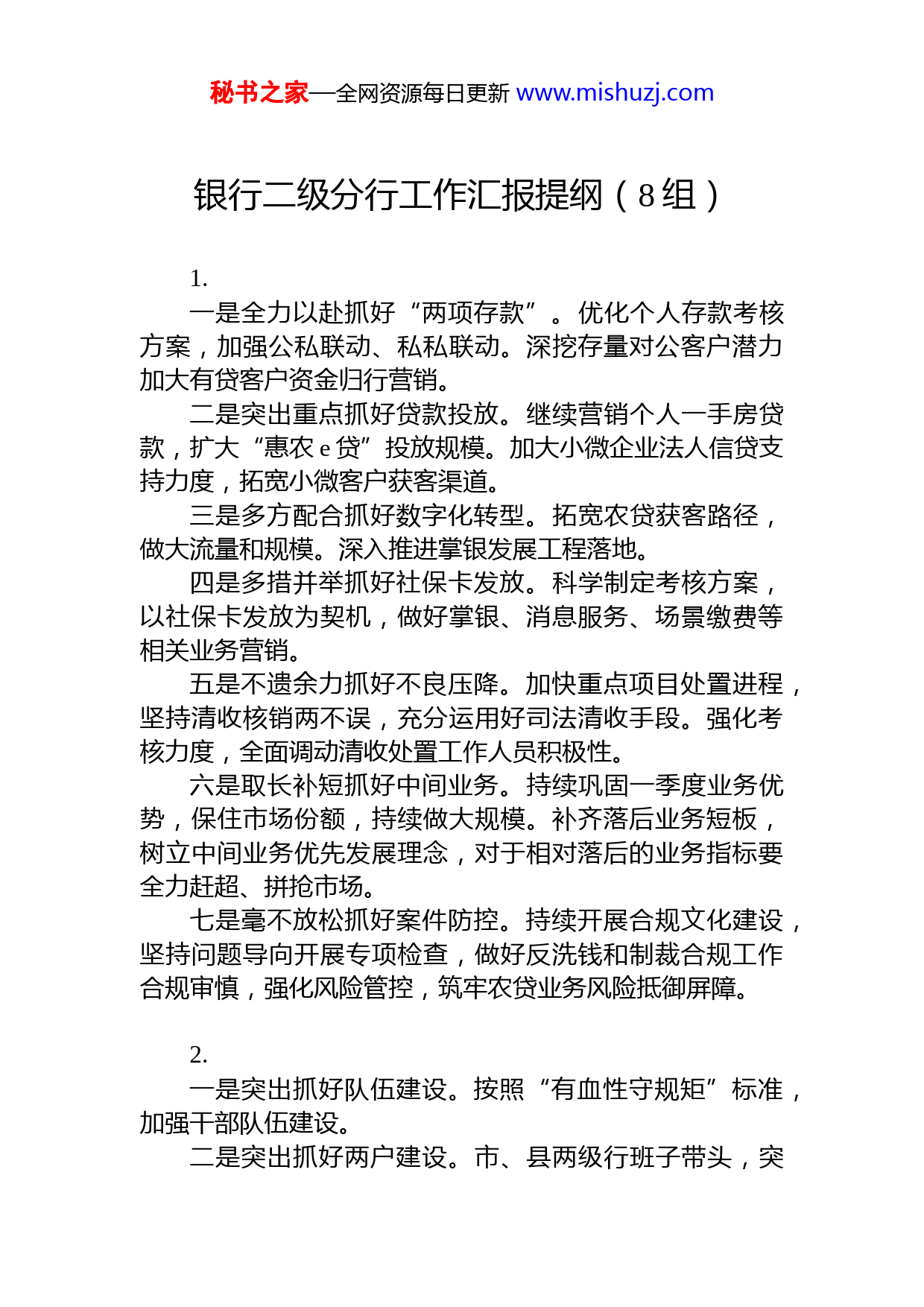 秘书之家—全网资源每日更新www.mishuzj.com银行二级分行工作汇报提纲(8组)1.一是全力以赴抓好“两项存款”。优化个人存款考核方案,加强公私联动、私私联动。深挖存量对公客户潜力加大有贷客户资金归行营销。二是突出重点抓好贷款投放。继续营销个人一手房贷款,扩大“惠农e贷”投放规模。加大小微企业法人信贷支持力度,拓宽小微客户获客渠道。三是多方配合抓好数字化转型。拓宽农贷获客路径,做大流量和规模。深入推进掌银发展工程落地。四是多措并举抓好社保卡发放。科学制定考核方案,以社保卡发放为契机,做好掌银、消息服务、场景缴费等相关业务营销。五是不遗余力抓好不良压降。加快重点项目处置进程,坚持清收核销两不误,充分运用好司法清收手段。强化考核力度,全面调动清收处置工作人员积极性。六是取长补短抓好中间业务。持续巩固一季度业务优势,保住市场份额,持续做大规模。补齐落后业务短板,树立中间业务优先发展理念,对于相对落后的业务指标要全力赶超、拼抢市场。七是毫不放松抓好案件防控。持续开展合规文化建设,坚持问题导向开展专项检查,做好反洗钱和制裁合规工作合规审慎,强化风险管控,筑牢农贷业务风险抵御屏障。2.一是突出抓好队伍建设。按照“有血性守规矩”标准,加强干部队伍建设。二是突出抓好两户建设。市、县两级行班子带头,突秘书之家—全网资源每日更新www.mishuzj.com出抓好两户建设。抓实对公两户建设,做优个人优质客户实施唤醒客户工程,拓展聚合码商户。三是突出抓好风险管理。坚持底线思维,强化管理基础,认真剖析历次内外部检查发现问题的症结所在,反思教训所在,梳理出风险点、违规点,有针对性地开展专项治理,确保实现全年无案件无重大风险事件发生。四是突出抓好“三农”业务。围绕“做特色”思路,依托绥化农业资源,全面加强乡村振兴金融服务,为全面推进乡村振兴贡献更多力量,为全行经营发展作出更大贡献。五是突出抓好机制建设。对现行的业务经营、体制机制、基础管理、队伍建设等进行认真梳理和完善,形成契合绥化分行发展的体制、机制和制度,激发经营活力。六是突出抓好数字化转型。通过抓掌银月活、抓场景建设、抓数字化工具的应用、抓线上融资业务的扩展、抓两转合一,提升网点价值创造水平。3.一是以县域专项营销活动为抓手,在做好客户拓展的同时全面落实县域贷款“两高于”、“两提升”、“一稳定”工作要求,全面做好乡村振兴金融服务,扎实做好农户贷款管理工作,做到层层传导,层层推进,全力夺取区域金融服务乡村振兴主导地位。二是在巩固前期工作成果基础上,聚焦关键领域,扎实推进掌银发展工程,重点强化场景建设,逐步实现业务线上融合推进,实现鹤岗分行数字化转型发展新胜利。三是坚持“稳中求进、稳中有进”总基调,以“六维方略”为统领,以增收创效为核心,以客户建设为主线,以数字化转型为手段,以风险防控为关键,抓基础、做特色、建机制、谋未来,以稳步提升城市业务为重点,以紧抓乡村振兴战略机遇,做大做强“三农”业务,全力打造秘书之家—全网资源每日更新www.mishuzj.com鹤岗县域金融服务领军银行为目标,确保实现各项业务指标市场份额稳步提升。4.一是坚定信心,专题研究方案落实目标,全面贯彻落实省行工作会议要求。二是真抓实干,按月制定目标,明确奖惩,积极推进公私联动、业务联动,不断增强主体业务市场竞争力。三是主动作为,聚焦重点领域,按月动态调整目标、措施,推动营销成效再提升。四是有效发展,按照既定目标,找准突破口,加快推进数字化转型成果落地见效。五是规范管理,加强信贷业务流程管理,切实抓好消费者权益保护,做好重要时间节点信访维稳工作。5.一是以综合绩效为核心,算好“成本、收入、综合、考核”四本经济账。充分发挥综合绩效风向标、指挥棒的作用,狠抓精细管理,科学制定方案。二是以补短强弱为目标,全力打好“稳存增存、贷款投放、客户建设、中间业务、不良清收压降”五场攻坚战夯实客户基础,稳定存款增长,挖掘客户潜力,扩大市场规模,三是以数字化转型为依托,抓好“巩固掌银阵地,抓好场景建设,用好数字化工具,做好线上融资产品推广”四项重点工作。四是以规范经营为目标,筑牢“信用风险、案件风险、舆情风险、安全风险”四道防线。压紧压实风险管理责任,不断提升风险防控能力。6.秘书之家—全网资源每日更新www.mishuzj.com一是加强业务经营。围绕重点业务、短板指标,持续抓好存款组织工作,推动资产业务稳步增长,拓宽中间业务收入渠道,深入推进转型发展,提升普惠金融服务能力全面夯实客户基础,打造县域金融领军银行。二是抓好案防风控。抓好信用风险防控,强化电信诈骗治理工作,增强案件防控能力。加强意识形态管控,牢牢把握意识形态工作主导权,严格防控舆情风险,营造合规文化氛围,巩固来之不易的疫情防控成果,为全行安全运营营造稳定环境。三是强化落实推动。紧跟总省行工作部署,找准切入点和突破口,采取有针对性的措施,继续保持优势项目,尽快改善短板项目。逐一推进各项决策落地,逐一抓好各项部署落实,做到稳中求进、稳中有进。四是扎实开展党史学习教育。将党史学习教育与统筹推进各项工作结合起来,进一步加大