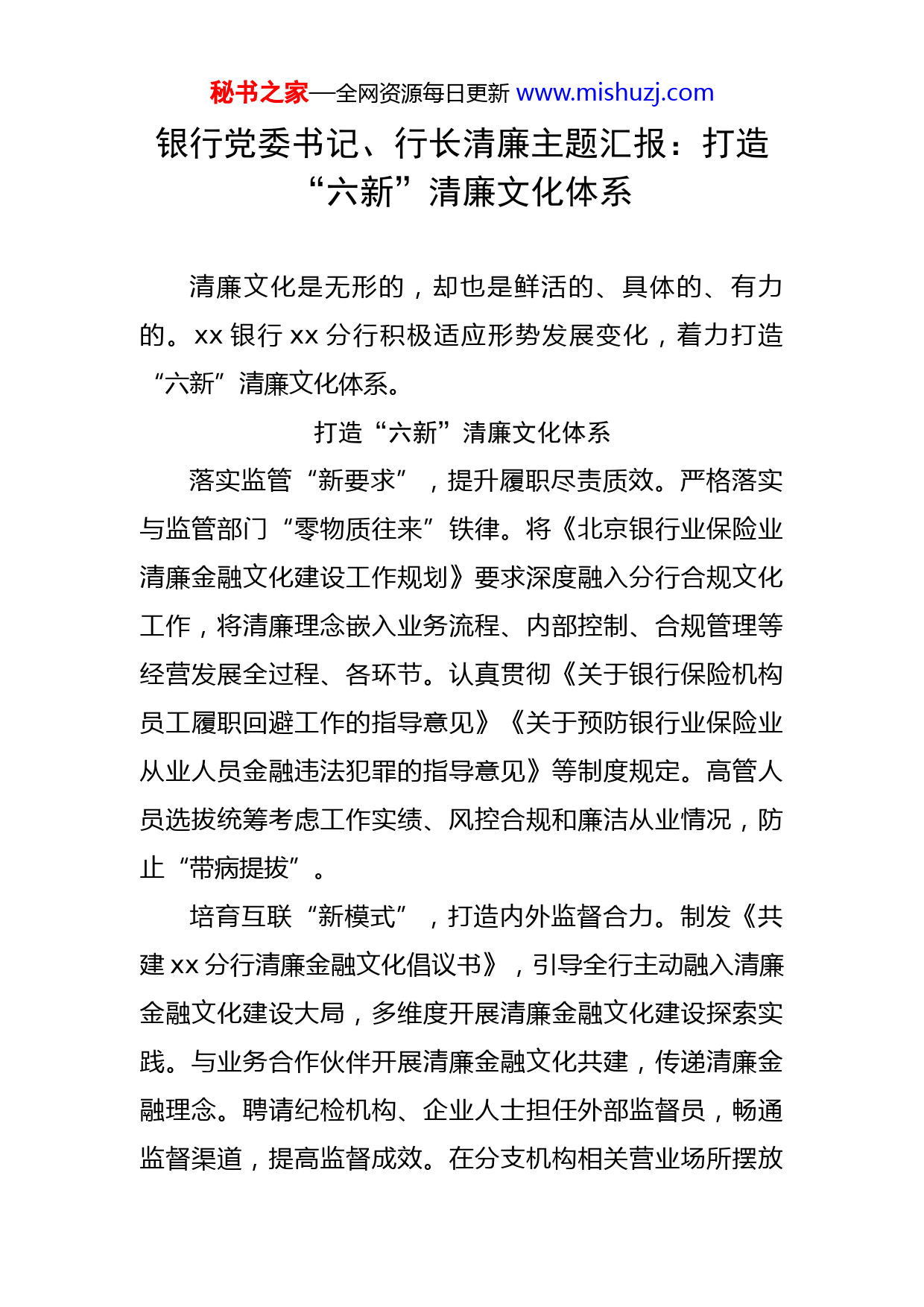 秘书之家—全网资源每日更新www.mishuzj.com银行党委书记、行长清廉主题汇报:打造“六新”清廉文化体系清廉文化是无形的,却也是鲜活的、具体的、有力的。xx银行xx分行积极适应形势发展变化,着力打造“六新”清廉文化体系。打造“六新”清廉文化体系落实监管“新要求”,提升履职尽责质效。严格落实与监管部门“零物质往来”铁律。将《北京银行业保险业清廉金融文化建设工作规划》要求深度融入分行合规文化工作,将清廉理念嵌入业务流程、内部控制、合规管理等经营发展全过程、各环节。认真贯彻《关于银行保险机构员工履职回避工作的指导意见》《关于预防银行业保险业从业人员金融违法犯罪的指导意见》等制度规定。高管人员选拔统筹考虑工作实绩、风控合规和廉洁从业情况,防止“带病提拔”。培育互联“新模式”,打造内外监督合力。制发《共建xx分行清廉金融文化倡议书》,引导全行主动融入清廉金融文化建设大局,多维度开展清廉金融文化建设探索实践。与业务合作伙伴开展清廉金融文化共建,传递清廉金融理念。聘请纪检机构、企业人士担任外部监督员,畅通监督渠道,提高监督成效。在分支机构相关营业场所摆放秘书之家—全网资源每日更新www.mishuzj.com“清廉金融文化名片”,亮明廉洁从业身份,并在网点电子宣传屏、海报充分展示清廉金融文化建设要求,打造“阳光监督”。构建教育“新形式”,强化廉洁自律意识。深入学习习近平总书记关于清廉文化的重要论述,并将党规党纪、党中央和中央纪委会议精神作为清廉金融文化学习的重要内容,加强相关理论学习。多渠道定期发布廉洁文化图文和视频资料,依托行内网络大学,组织员工观看廉洁文化教育基地网上展厅和廉洁文化宣传片。建立分层分类教育模式,突出重点领域、关键岗位警示教育,筑牢思想防线。着重讲好新入行员工“廉洁第一课”,帮助员工系好职业生涯第一粒纽扣。对任初、任期满管理人员开展廉洁从业教育谈话,提醒教育管理人员自觉抵制诱惑,明确行为底线,增强拒腐防变能力。与内控合规“价值创造年”主题活动有机结合,积极开展“清廉金融文化进基层”活动,通过送教上门、专题座谈、案例沙龙、行长导学等多种形式,推动全行以案为鉴、警钟长鸣,树牢“合规就是生命线”的底线思维,营造遵规守纪的良好氛围。打造宣传“新平台”,营造清廉文化氛围。积极组织辖内单位党委书记、纪委书记谈清廉金融文化主题征文;举办清廉金融文化大讲堂;选树一批艰苦奋斗、廉洁奉公的模范标兵,通过网点电子宣传屏幕、工行xx公众号、团秘书之家—全网资源每日更新www.mishuzj.com刊等多种渠道宣传,持续扩大清廉金融文化影响力、号召力。结合校园招聘,开展“送清廉金融文化进校园”活动,通过发放清廉宣传手册、组织专题招聘宣讲等方式,传播廉洁金融文化。强化考核“新导向”,以考核推进文化建设。强化考核“指挥棒”导向引领作用,将经营管理支行及主要负责人清廉金融文化建设情况、监督检查情况纳入考核体系。深入开展对选人用人、项目审批、信贷管理、集中采购、招投标等重点领域的廉洁风险排查,强化对权力集中、资金密集、资源富集部门和岗位的监督。打造合作“新机制”,深化银地联动协作。加强与xx市纪委监委交流,建立廉政工作联系机制、日常工作沟通机制、办案信息交互机制。学习xx市纪委监委金融反腐先进工作经验,强化协同配合。依托xx市清廉教育资源,组织开展警示教育参观,促进清廉教育最优化。筑牢“两个从严”文化根基回顾清廉文化建设实践,我们深刻体会到清廉文化建设不是表象的、孤立的、静态的,必须融入从严治党这个根本,体现与时俱进这个特征。首先,突出“三个强化”,党建铸魂夯实以“两个从严”为内核的文化根基。党建引领、从严治理是工行xx分行各项经营管理工作的首要方针和根本保障。在清廉金融秘书之家—全网资源每日更新www.mishuzj.com文化建设上自觉将全面从严治党、从严治行作为出发点和着力点,有力促进夯基固本。一是强化党委主体责任。清廉文化有效性首先在于顶层设计和系统引导,分行党委对此同样负有主体责任。成立以党委书记挂帅、纪委书记任副组长,纪委办公室、办公室、企业文化部(团委)、人力资源部、内控合规部、工会办公室主要负责人组成的领导小组,研究出台分行清廉金融文化建设实施方案,使得清廉文化建设体系清、责任明、内容全,有利于分阶段、分步骤有序开展各项工作。二是强化全面从严要求。将“严”的主基调广泛渗透到清廉文化建设正向引导中。与此同时,积极学习同业、客户和系统兄弟行先进经验,加强文化融合,汲取智慧力量,一体推进工行廉洁文化、合规文化、信贷文化建设,汇聚廉洁自律正能量。三是强化党员示范作用。各级党委班子以身作则,以不同形式、在不同场合、从不同角度,广泛开展清廉金融文化宣讲,运用生动语言、鲜活案例,积极传递廉洁从业理念,让基层员工听得进、记得住、理解透,不断增强文化认同感和参与积极性。其次,突出“两个契合”,着眼发展塑造具有新时期内涵的鲜明特色。紧紧围绕清廉金融文化建设的时代特征、首都特色、行业特点和企业特性,更好服务经营发展。秘书之家—全网资源每日更新www.mishuzj.