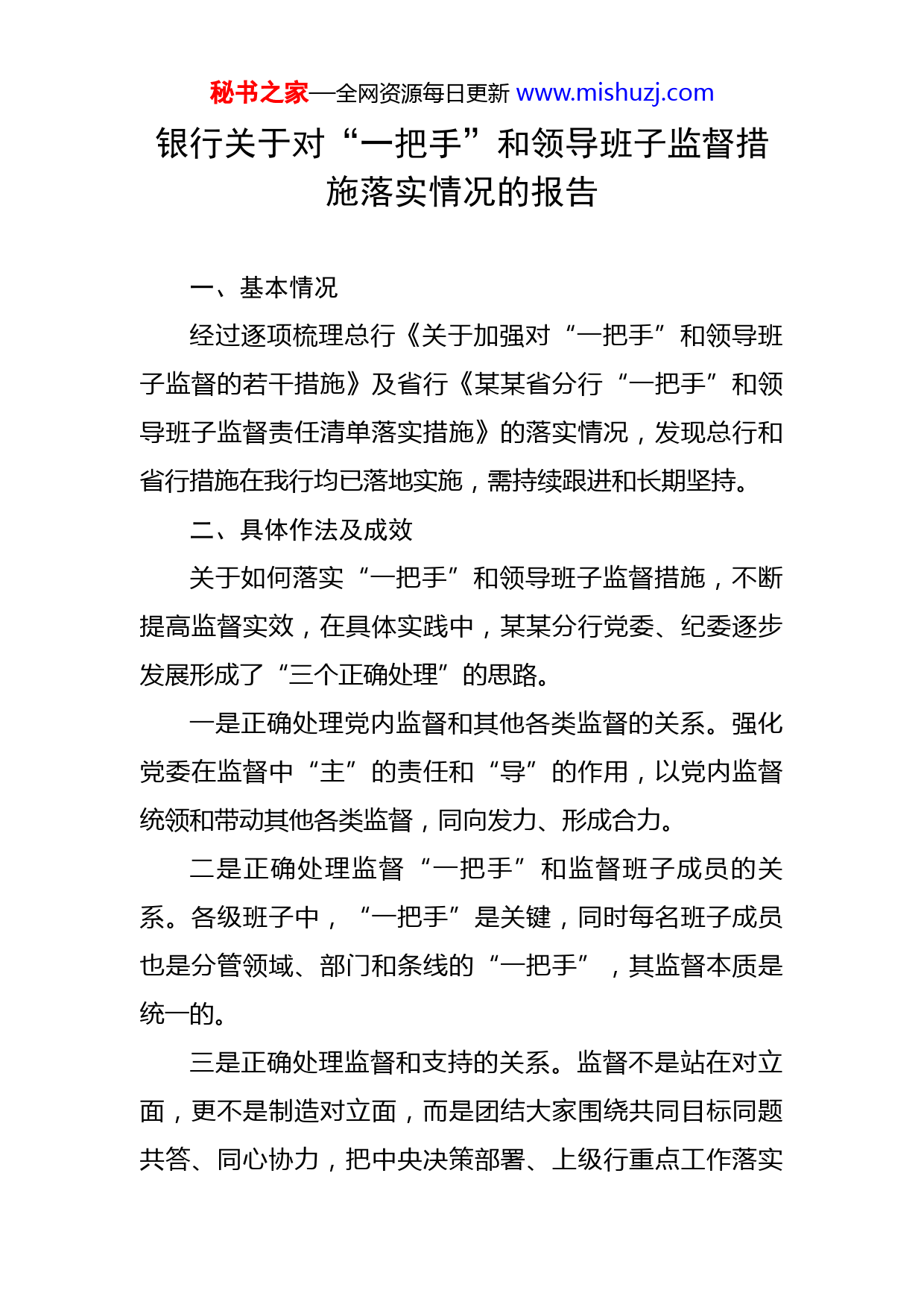 秘书之家—全网资源每日更新www.mishuzj.com银行关于对“一把手”和领导班子监督措施落实情况的报告一、基本情况经过逐项梳理总行《关于加强对“一把手”和领导班子监督的若干措施》及省行《某某省分行“一把手”和领导班子监督责任清单落实措施》的落实情况,发现总行和省行措施在我行均已落地实施,需持续跟进和长期坚持。二、具体作法及成效关于如何落实“一把手”和领导班子监督措施,不断提高监督实效,在具体实践中,某某分行党委、纪委逐步发展形成了“三个正确处理”的思路。一是正确处理党内监督和其他各类监督的关系。强化党委在监督中“主”的责任和“导”的作用,以党内监督统领和带动其他各类监督,同向发力、形成合力。二是正确处理监督“一把手”和监督班子成员的关系。各级班子中,“一把手”是关键,同时每名班子成员也是分管领域、部门和条线的“一把手”,其监督本质是统一的。三是正确处理监督和支持的关系。监督不是站在对立面,更不是制造对立面,而是团结大家围绕共同目标同题共答、同心协力,把中央决策部署、上级行重点工作落实秘书之家—全网资源每日更新www.mishuzj.com好。特别是在对下监督中,既保持监督力度,又持监督温度,落实“三个区分开来”要求,为担当尽责者撑腰鼓劲。近年来,我们的主要作法有:第一,抓责任履行,压实管党治行政治责任。从党组织集体、主要负责人、班子成员三个层面,把落实“两个责任”分解到位、落实到位。全行各级组织和主要负责同志坚决扛起扛稳党建、党风廉政建设“两个责任”,把党风廉政建设工作摆在突出位置来谋划推动,做到与业务管理同部署、同推动、同考核。党委书记作为第一责任人,定期与班子成员和下级“一把手”谈心谈话、警示提醒;班子成员履行“一岗双责”,加强班子内部监督。第二,抓精准监督,规范“关键少数”权力运行。纪行纪检组发挥“派”的优势和“驻”的权威,做“长牙的老虎”,敢抓敢管,动真碰硬。一是紧盯重点领域。对问题易发多发的授信等领域和资源配置权力比较集中的人、财、物管理部门加强监督,督导协助相关部门完善制度机制,堵住根源漏洞。二是紧盯权力。强化对权力配置、使用和运行的制约和监督,完善发现问题、纠正偏差、精准问责有效机制,消除权力监督的真空地带。去年以来,驻行纪检组推动相关部门梳理责任清单、权力清单和制度清单,不断查找并堵塞廉洁风险点。三是紧盯“四风”问秘书之家—全网资源每日更新www.mishuzj.com题。密切关注享乐主义、奢靡之风新动向、新表现,抓住具体问题,顶住时间节点,强化日常监督。四是形成监督合力。不断完善党委全面监督、纪检条线专责监督、其他条线部门职能监督、基层支部日常监督、党员和群众民主监督的“五位一体”监督体系。第三,抓警示教育,营造清廉文化氛围。开展案例警示教育、职业道德教育、传统文化教育和廉洁从业教育,促使干部员工把廉洁从业各项规定作为思想自觉、行动习惯和价值追求。实施典型引路,大力弘扬遵章守纪、依法合规、廉洁自律的先进典型,加强正面激励,推进廉洁文化建设再上新台阶。以2021年为例,在强化警示教育方面,推动党委利用XX等人典型案例及林传伟案件开展警示教育活动,开好民主生活会,对照检查、“问警自省”;落实“XX教育月”活动安排,进行视频学习、组织撰写心得体会,实现机构100%覆盖;组织全辖党员干部观看电视专题片《正风反腐就在身边》,征集感想体会近40篇。在推进清廉文化建设方面,持续推进清廉文化“进班子、进网点、进岗位、进家庭”,向中层干部发放《家属助廉倡议书》,引导全行干部员工牢固树立纪律规矩法律意识。第四,抓制度建设,构建常态化监督体系。不断创新党内监督方式,将述责述廉、党内谈话作为加强对“一把秘书之家—全网资源每日更新www.mishuzj.com手”监督的重要抓手。建立干部廉洁档案,为全面掌握领导干部有关情况提供一张详实“体检表”,让“一把手”亮出“家底”,切实增强了领导干部的廉洁自律意识。自2018年以来,每年年初安排下一级“一把手”述职述责述党建,压实“一把手”管党治党责任。第五,抓肃纪执纪,保持严管高压态势。采取有力手段,推进监督执纪问责工作。一是用好“四种形态”。特别在第一种形态上下更大功夫,干部有问题就批评、教育、处理,常咬耳朵、常扯袖子,抓早抓小、关口前移。二是监督纪律执行。近年来,对省行巡察反馈问题涉及的责任人以及其他问题的多名责任人的进行责任认定和处理。近年来,某某分行全面加强党的领导和贯彻落实全面从严治党,始终坚持落实党要管党、从严治党要求,采取一系列有效措施,把政治纪律和规矩立起来、严起来,政治生态持续向好。三、存在不足及原因分析一是日常监督不到位。日常监督主要通过巡察、派驻、履责报告、检查考核等形式开展监督,监督抓手不丰富、不具体,推动“一把手”和领导班子成员切实把责任扛起来的措施不够,发现的问题都趋于表面化,深层次问题不多。秘书之家—全网资源每日更新www.mishuzj.com二是监督机制不健全。制度落实不到位,加强对“一把手”的监督,考核评价是关键,但目前监督中缺乏有针对性的考核,不能全面准确反映“一把手”责任落实情况;考