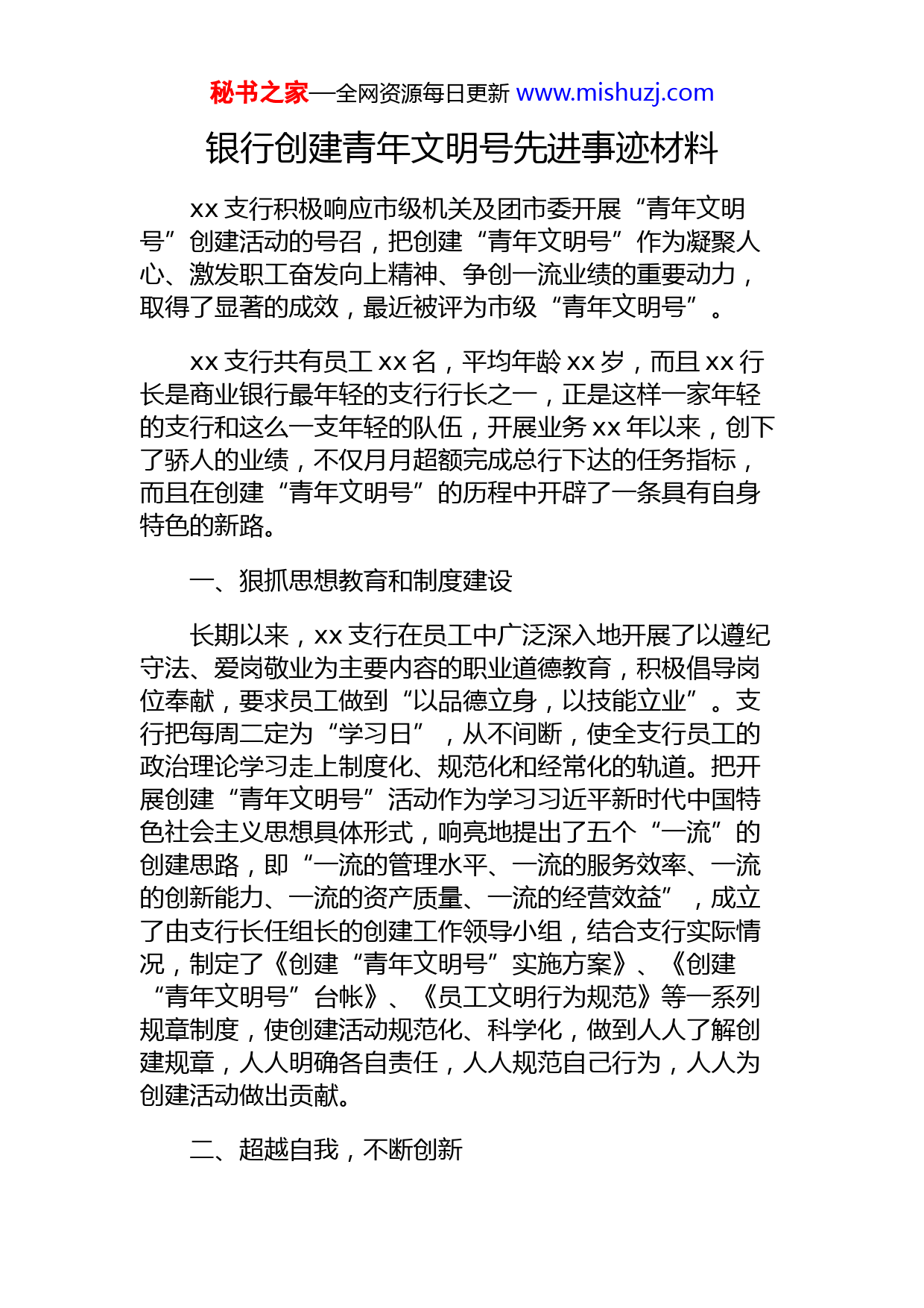 秘书之家—全网资源每日更新www.mishuzj.com银行创建青年文明号先进事迹材料xx支行积极响应市级机关及团市委开展“青年文明号”创建活动的号召,把创建“青年文明号”作为凝聚人心、激发职工奋发向上精神、争创一流业绩的重要动力,取得了显著的成效,最近被评为市级“青年文明号”。xx支行共有员工xx名,平均年龄xx岁,而且xx行长是商业银行最年轻的支行行长之一,正是这样一家年轻的支行和这么一支年轻的队伍,开展业务xx年以来,创下了骄人的业绩,不仅月月超额完成总行下达的任务指标,而且在创建“青年文明号”的历程中开辟了一条具有自身特色的新路。一、狠抓思想教育和制度建设长期以来,xx支行在员工中广泛深入地开展了以遵纪守法、爱岗敬业为主要内容的职业道德教育,积极倡导岗位奉献,要求员工做到“以品德立身,以技能立业”。支行把每周二定为“学习日”,从不间断,使全支行员工的政治理论学习走上制度化、规范化和经常化的轨道。把开展创建“青年文明号”活动作为学习习近平新时代中国特色社会主义思想具体形式,响亮地提出了五个“一流”的创建思路,即“一流的管理水平、一流的服务效率、一流的创新能力、一流的资产质量、一流的经营效益”,成立了由支行长任组长的创建工作领导小组,结合支行实际情况,制定了《创建“青年文明号”实施方案》、《创建“青年文明号”台帐》、《员工文明行为规范》等一系列规章制度,使创建活动规范化、科学化,做到人人了解创建规章,人人明确各自责任,人人规范自己行为,人人为创建活动做出贡献。二、超越自我,不断创新秘书之家—全网资源每日更新www.mishuzj.comxx支行的发展史,其实就是一部不断创新突破、不断超越自我的历史。支行凝聚广大青年员工的聪明才智,以“敢为天下先”的精神,以“敢吃第一只螃蟹”的雄心,积极探索,大胆尝试,进行了一系列的改革创新,努力实现“人无我有、人有我优、人优我新”的思想理念,时时事事争在全行的前头:与小区物业管理开展合作;开展银企联谊会;实施大堂经理制;开辟重点客户接待室;在营业厅内播放背景音乐……创新拓宽了业务新领域,创新走活了全行一盘棋,创新带来了xx支行翻天覆地的变化,截止到目前,xx支行对公业务开户数比年初翻了一番,黄金客户大幅增加,营销客户超额完成任务,各项经营指标均创历史最好水平,这一系列的创新不仅为支行带来了巨大的经济效益,而且树立了商业银行良好的外部形象。三、强化服务,加强学习,赢得客户xx支行针对银行作为服务性行业的特点,牢固树立“客户是上帝”的观念,从抓好服务质量入手,努力把文明优质服务送给每一个客户,在员工中提倡依靠“三心”赢得客户,即:用诚心的服客户、用细心的服务感动客户、用耐心的服务吸引客户。就是靠着这种诚心、耐心和细心的服务,吸引着客户,支行的存款向插了翅膀一样,平均以每月xx万的速度递增,创造了惊人的业绩。支行还利用自身的特点和优势,在客户理财、服务方式等方面进行了大胆的创新,开辟了重点客户接待室,实行大堂经理制和首问负责制,增进了银行与客户之间的距离。开展优质文明服务,关键是要拥有过硬的业务技能和水平,为此,支行始终把业务技能训练和业务知识学习放在重要的位置抓紧抓实,坚持考核,并引入奖惩机制,使每位员工增强了危机感,自觉地把压力变为动力,如今,努力学习、不断钻研已经成为全支行员工的自觉行动,尊重知识、热爱学习在xx支行蔚然成风秘书之家—全网资源每日更新www.mishuzj.com有一个明确的创建目标,有总行党组的大力支持,有一个灵活的创建机制,有一支高素质的员工队伍,是xx运行创建“青年文明号”的扎实基矗“海阔凭鱼跃,天高任鸟飞”,是这个时代给予了我们这群幸运的年轻人广阔的舞台。争创“青年文明号”不是目的,只是一个过程,我们要在争创的过程中,自己觉得工作有了目标,做人有了方向,这才是班组追求的最高境界。免责声明:图文来源网络征集,版权归原作者所有。若侵犯了您的合法权益,请作者持权属证明与本站联系,我们将及时更正、删除!谢谢!