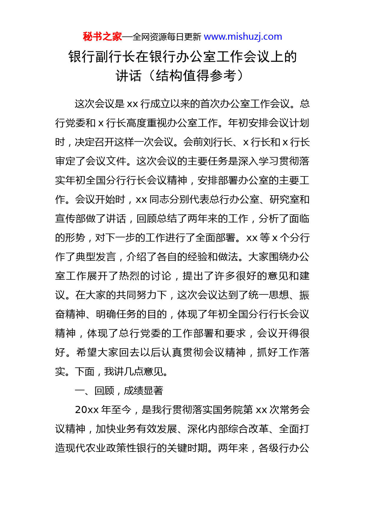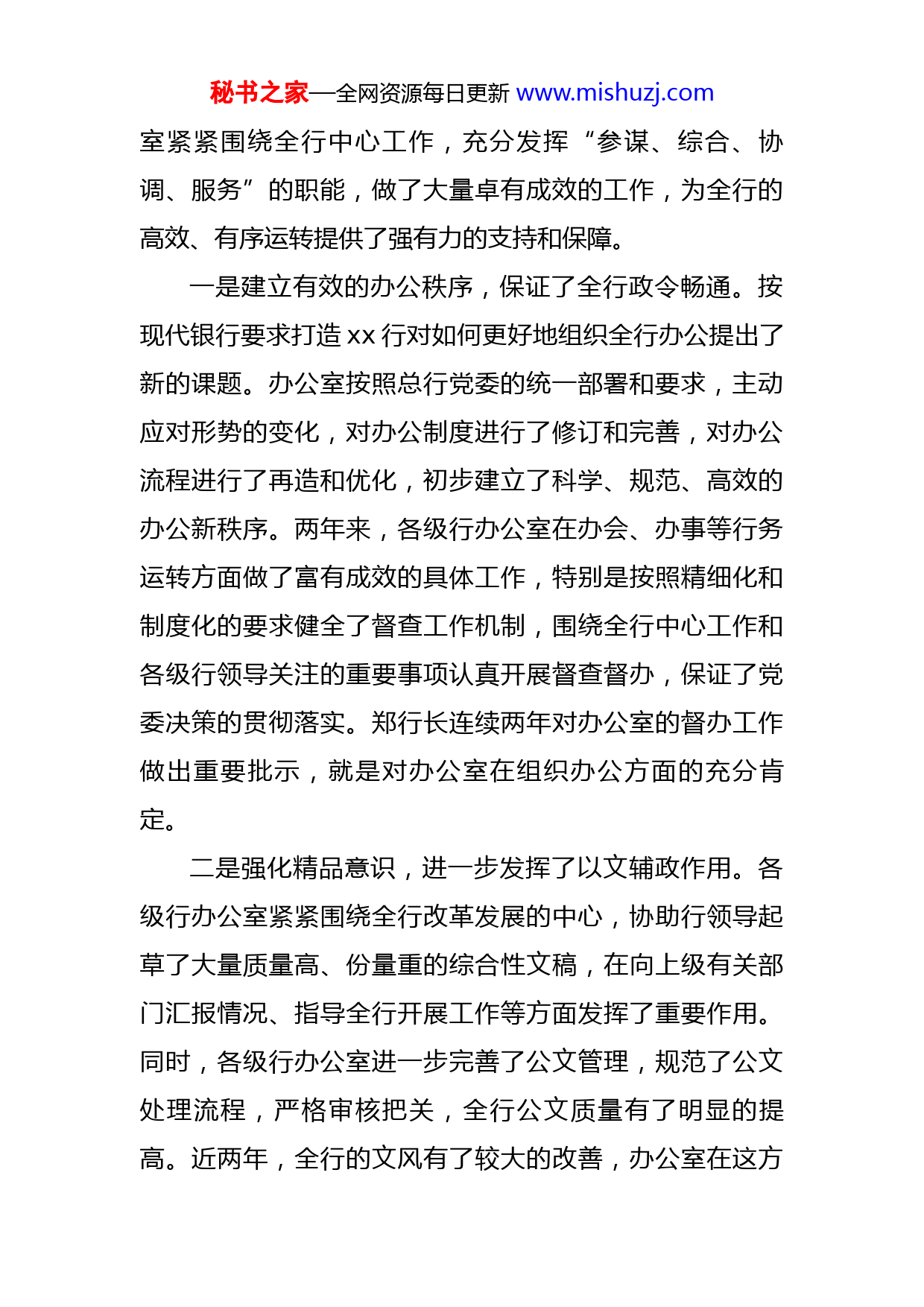 秘书之家—全网资源每日更新www.mishuzj.com银行副行长在银行办公室工作会议上的讲话(结构值得参考)这次会议是xx行成立以来的首次办公室工作会议。总行党委和x行长高度重视办公室工作。年初安排会议计划时,决定召开这样一次会议。会前刘行长、x行长和x行长审定了会议文件。这次会议的主要任务是深入学习贯彻落实年初全国分行行长会议精神,安排部署办公室的主要工作。会议开始时,xx同志分别代表总行办公室、研究室和宣传部做了讲话,回顾总结了两年来的工作,分析了面临的形势,对下一步的工作进行了全面部署。xx等x个分行作了典型发言,介绍了各自的经验和做法。大家围绕办公室工作展开了热烈的讨论,提出了许多很好的意见和建议。在大家的共同努力下,这次会议达到了统一思想、振奋精神、明确任务的目的,体现了年初全国分行行长会议精神,体现了总行党委的工作部署和要求,会议开得很好。希望大家回去以后认真贯彻会议精神,抓好工作落实。下面,我讲几点意见。一、回顾,成绩显著20xx年至今,是我行贯彻落实国务院第xx次常务会议精神,加快业务有效发展、深化内部综合改革、全面打造现代农业政策性银行的关键时期。两年来,各级行办公秘书之家—全网资源每日更新www.mishuzj.com室紧紧围绕全行中心工作,充分发挥“参谋、综合、协调、服务”的职能,做了大量卓有成效的工作,为全行的高效、有序运转提供了强有力的支持和保障。一是建立有效的办公秩序,保证了全行政令畅通。按现代银行要求打造xx行对如何更好地组织全行办公提出了新的课题。办公室按照总行党委的统一部署和要求,主动应对形势的变化,对办公制度进行了修订和完善,对办公流程进行了再造和优化,初步建立了科学、规范、高效的办公新秩序。两年来,各级行办公室在办会、办事等行务运转方面做了富有成效的具体工作,特别是按照精细化和制度化的要求健全了督查工作机制,围绕全行中心工作和各级行领导关注的重要事项认真开展督查督办,保证了党委决策的贯彻落实。郑行长连续两年对办公室的督办工作做出重要批示,就是对办公室在组织办公方面的充分肯定。二是强化精品意识,进一步发挥了以文辅政作用。各级行办公室紧紧围绕全行改革发展的中心,协助行领导起草了大量质量高、份量重的综合性文稿,在向上级有关部门汇报情况、指导全行开展工作等方面发挥了重要作用。同时,各级行办公室进一步完善了公文管理,规范了公文处理流程,严格审核把关,全行公文质量有了明显的提高。近两年,全行的文风有了较大的改善,办公室在这方秘书之家—全网资源每日更新www.mishuzj.com面既发挥了公文管理职能,也起了表率作用。三是深入开展了信息调研,服务各级行领导决策。办公室已经建立起一个覆盖全行的信息网络,培养了一支素质高、反应快的信息采编队伍,充分发挥了信息反映主渠道的作用,利用系统信息网络平台,报送和反映了大量有价值的信息,不仅为各级行领导及时了解掌握基层工作动态提供了信息支持,还为我行争取宽松的外部环境发挥了积极作用。总行办公室的信息反映工作,连续四年受到中办、国办的表彰。许多省级分行办公室的信息反映工作也做得有声有色。同时,办公室把调研工作作为一件大事来抓,充分发挥联系范围广、政策水平高、综合能力强的优势,有针对性地开展综合性和专题性调研,形成了一批有价值的研究成果,为各级行党委决策提供了重要参考。四是加强新闻宣传,扩大了我行的社会影响力。总行党委对新闻宣传工作非常重视,党委领导亲自接受采访,多次发表署名文章,为推动我行新闻宣传工作的开展起到了示范作用。两年来,各级行办公室坚持“突出重点,及时反映”的原则,围绕我行强化信贷xx职能、深化内部综合改革、完善经营管理机制、加强企业文化建设等方面所取得的进展,充分利用多种手段,积极开展宣传报道,扩大了我行的影响力,树立和强化了我行“建设新农村的银秘书之家—全网资源每日更新www.mishuzj.com行”的崭新形象。与此同时,我行新闻宣传队伍的危机应对水平有了较大提高,初步建立了多部门协作、上下联动的危机预警和应对机制。对媒体的失实、不负责任的报道进行了澄清或必要的引导,努力排除了影响我行改革发展的外部舆论干扰。五是规范视觉形象及宣传语,不断加快企业文化建设步伐。两年来,我行初步建立起了具有现代金融品质和xx行特色的企业文化框架,全行办公室在其中做了大量基础性工作。我行的核心理念和宣传语已经深入人心,成为全系统每位员工价值取向的统一标准。我们聘请了专业公司对全行视觉识别系统进行了整体设计,并编制了《xx银行视觉形象识别系统手册》,使全行的视觉形象建设有了完整统一的执行标准。六是加强办公自动化建设,全行办公手段有了很大提升。在各级行领导和信息技术等部门的支持下,办公室积极推动全行办公自动化建设,大大提高了全行的公文传输效率和组织办公的现代化水平。电子公文处理系统功能不断完善,满足了各级行网上办文的应用需要,形成了以总、分行办公室为枢纽,面向各管理层、各业务条线和具体工作人员的办公网络系统。我行视频会议系统得到广泛应用,总行机关行务行办会议引入了视频系统,有些分行也开始充分利用