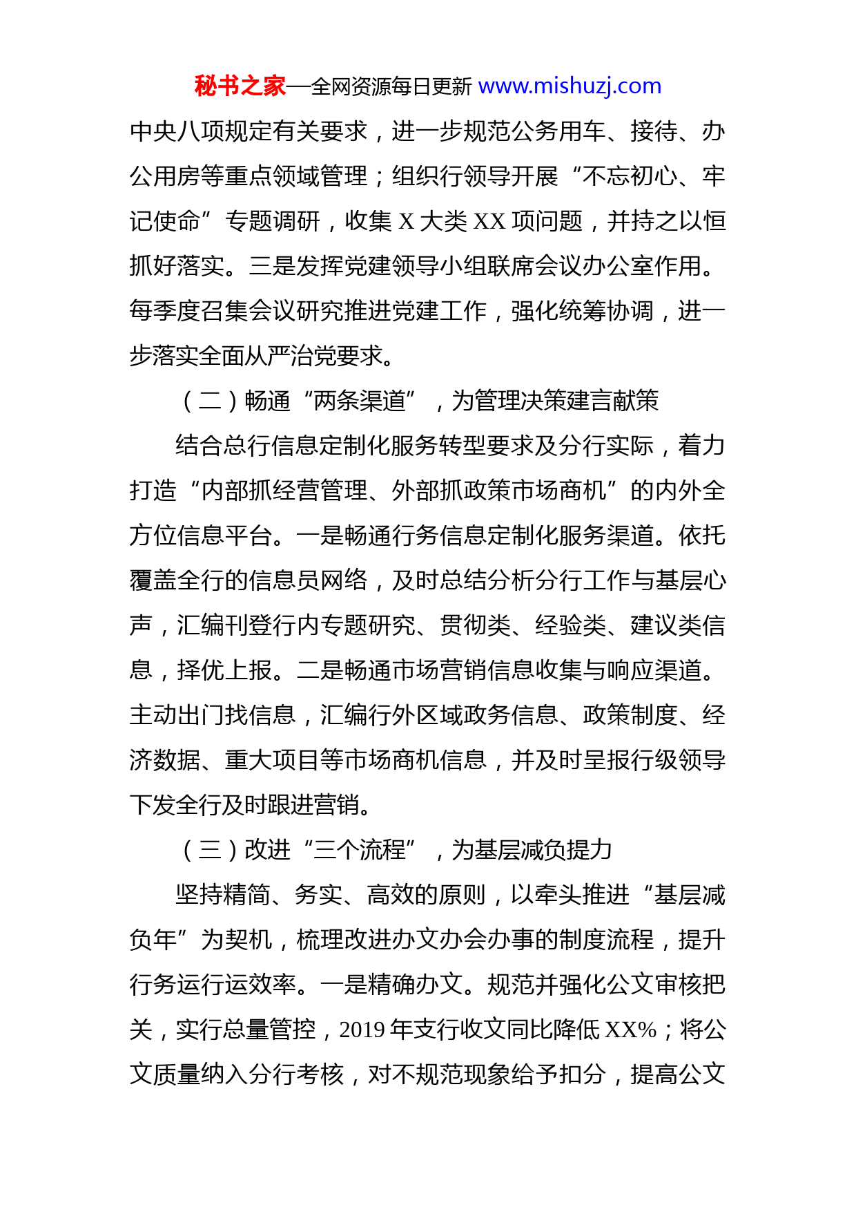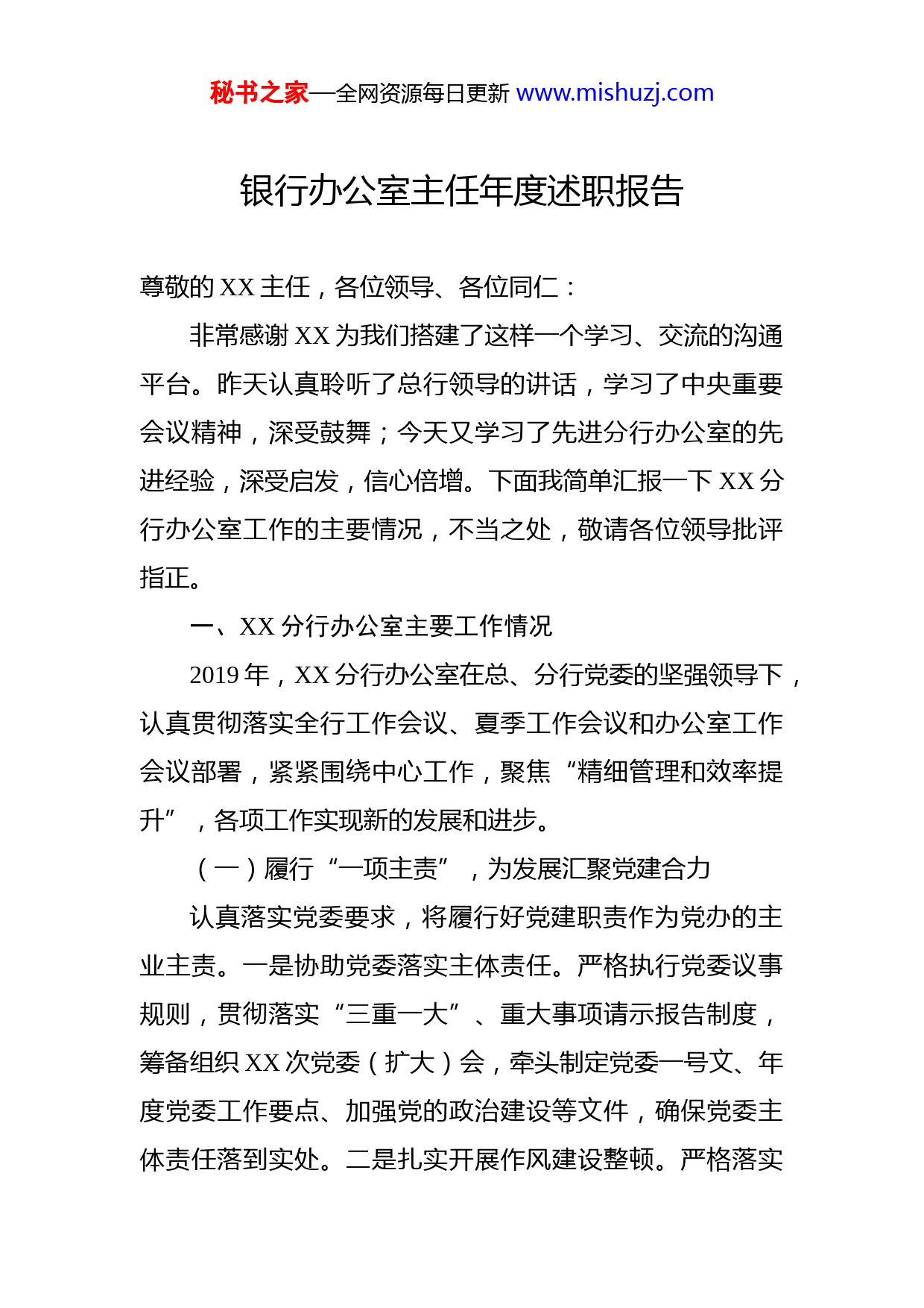 秘书之家—全网资源每日更新www.mishuzj.com银行办公室主任年度述职报告尊敬的XX主任,各位领导、各位同仁:非常感谢XX为我们搭建了这样一个学习、交流的沟通平台。昨天认真聆听了总行领导的讲话,学习了中央重要会议精神,深受鼓舞;今天又学习了先进分行办公室的先进经验,深受启发,信心倍增。下面我简单汇报一下XX分行办公室工作的主要情况,不当之处,敬请各位领导批评指正。一、XX分行办公室主要工作情况2019年,XX分行办公室在总、分行党委的坚强领导下,认真贯彻落实全行工作会议、夏季工作会议和办公室工作会议部署,紧紧围绕中心工作,聚焦“精细管理和效率提升”,各项工作实现新的发展和进步。(一)履行“一项主责”,为发展汇聚党建合力认真落实党委要求,将履行好党建职责作为党办的主业主责。一是协助党委落实主体责任。严格执行党委议事规则,贯彻落实“三重一大”、重大事项请示报告制度,筹备组织XX次党委(扩大)会,牵头制定党委一号文、年度党委工作要点、加强党的政治建设等文件,确保党委主体责任落到实处。二是扎实开展作风建设整顿。严格落实秘书之家—全网资源每日更新www.mishuzj.com中央八项规定有关要求,进一步规范公务用车、接待、办公用房等重点领域管理;组织行领导开展“不忘初心、牢记使命”专题调研,收集X大类XX项问题,并持之以恒抓好落实。三是发挥党建领导小组联席会议办公室作用。每季度召集会议研究推进党建工作,强化统筹协调,进一步落实全面从严治党要求。(二)畅通“两条渠道”,为管理决策建言献策结合总行信息定制化服务转型要求及分行实际,着力打造“内部抓经营管理、外部抓政策市场商机”的内外全方位信息平台。一是畅通行务信息定制化服务渠道。依托覆盖全行的信息员网络,及时总结分析分行工作与基层心声,汇编刊登行内专题研究、贯彻类、经验类、建议类信息,择优上报。二是畅通市场营销信息收集与响应渠道。主动出门找信息,汇编行外区域政务信息、政策制度、经济数据、重大项目等市场商机信息,并及时呈报行级领导下发全行及时跟进营销。(三)改进“三个流程”,为基层减负提力坚持精简、务实、高效的原则,以牵头推进“基层减负年”为契机,梳理改进办文办会办事的制度流程,提升行务运行运效率。一是精确办文。规范并强化公文审核把关,实行总量管控,2019年支行收文同比降低XX%;将公文质量纳入分行考核,对不规范现象给予扣分,提高公文秘书之家—全网资源每日更新www.mishuzj.com质效。二是精细办会。强化会议管理,压缩会议规模,提高会议质量,会议同比减少XX%。规范会务服务,紧扣“会前预案、会中协调、会后总结”3个环节,努力做到“人员、责任、服务”3个到位。三是精准办事。督促各部门大幅精简报告报表、优化督查检查方式,2019年精简取消报告报表XX项,实际开展督查检查事项共XX项,同比下降XX%。以“内部一般性事务和文件往来,实行负责人签字制度,原则不再加盖行务公章”为原则,清理行务公章使用范围,已精减XX项,精减率XX%。(四)守好“四个领域”,为稳健经营保驾护航一是从“严”字入手,深化信访管理。分行办公室高度重视信访维稳工作,、将信访工作纳入党委主体责任考核,通过加大考核力度,促进各级机构和相关部门强化信访工作责任落实。本年度妥善处置信访事项XX件,在系统内外树立了良好形象。二是从“实”处着力,强化印章管理。认真落实总行行务公章大检查、分行季度检查,通过现场和非现场方式,对全辖行务公章进行检查和通报,检查结果纳入考核,检查面达到100%。三是从“高”处着眼,细化保密管理。认真学习落实总行领导关于保密工作的重要批示,加强保密宣传教育,落实涉密人员管理,加强机要室保密管理,多措并举提升保密管理水平。四是从“快”上立足,优化舆情管理。积极有效应对处置负面舆秘书之家—全网资源每日更新www.mishuzj.com情,及时化解重点舆情;严格执行舆情报告制度,及时报告重点舆情信息,受到银保监局通报点评表扬;开展了全辖声誉风险演练和声誉风险排查,巩固和强化了源头管控基础。二、工作中存在的不足在总行办公室的正确领导下,XX分行办公室取得了一点成绩,但由于受自身能力、素质和人员数量的限制,忙于事务性工作较多,工作还存在一些不足:一是在深刻领会和认真贯彻落实总分行党委战略部署和各项要求的能力上还有一定差距;二是在较高标准服务全行行务运转方面还有不足,工作精细化水平亟待提高;三是办公室员工个人专业能力尚显不足。三、下一步工作思路下一步,XX分行将组织召开办公室条线会议,认真传达总行办公室工作会议精神,对标对标先进行,创新探索管理方式,深化提升服务效率,夯实工作基础,重点做好三个方面工作:一是强化理论学习。分行将继续深刻领会XX在“不忘初心、牢记使命”主题教育中的重要讲话精神,结合自身思想和工作实际,制定学习计划,潜心读原著、学原文、悟原理,以高标准要求自己,不断强化为全行发展服务的宗旨意识,在困难中迎接挑战,在实践中增长才干,在奋秘书之家—全网资源每日更新www.mishuzj.com斗中收获果实,在服务发展中实现价值。二是贯彻落实好总行重点部署工作。聚焦党建工作,加强党建理论和实务学习,努力推动分行党建工作迈上新台阶;