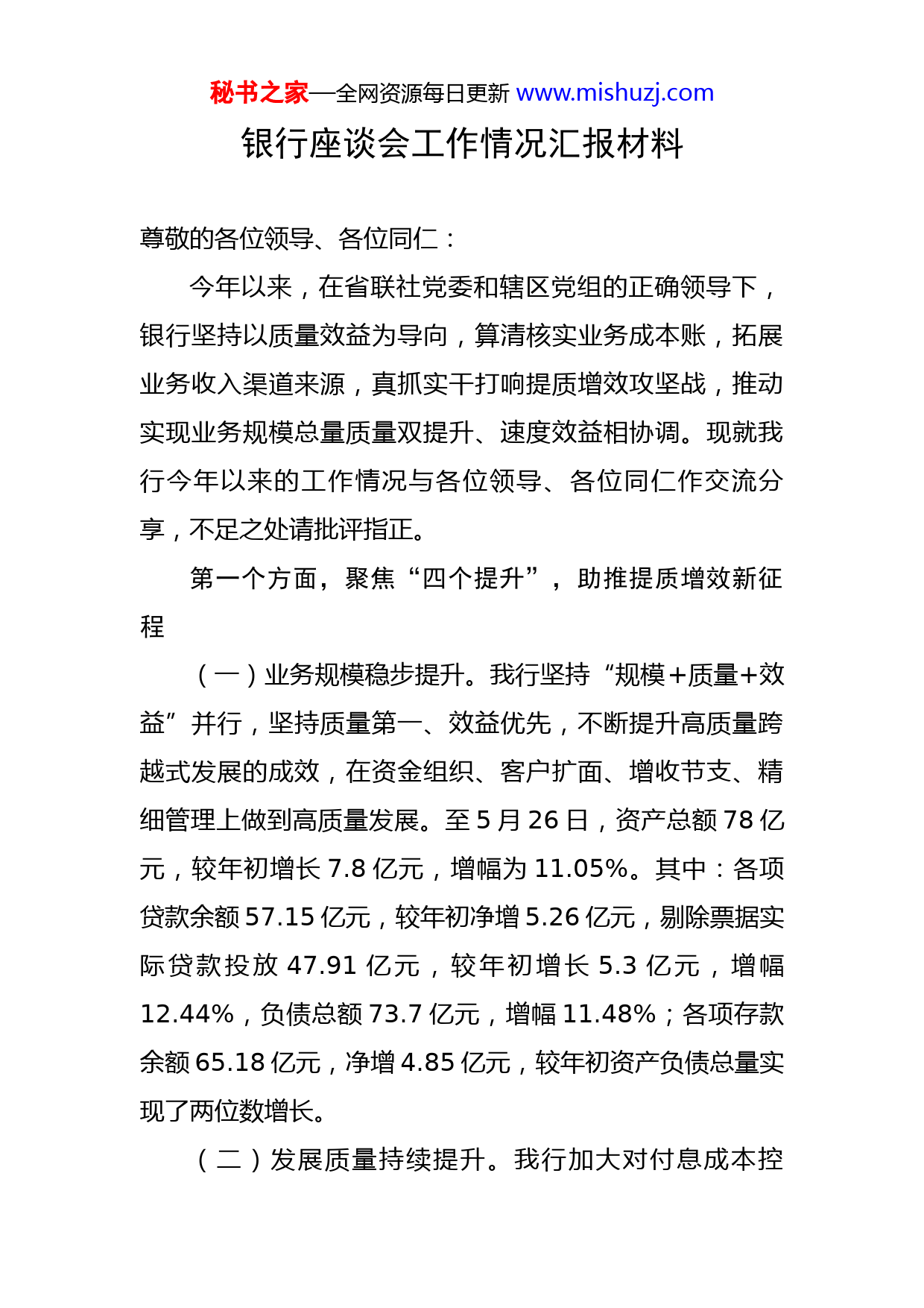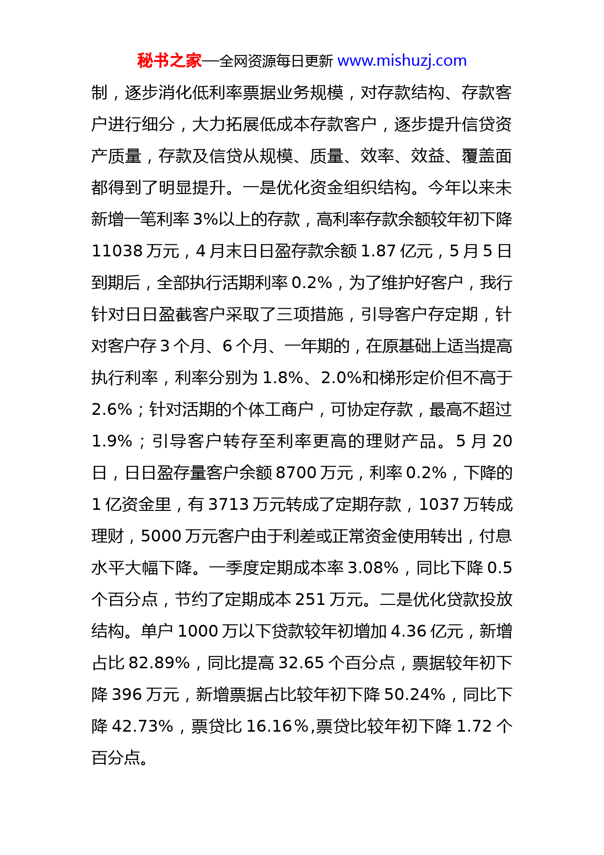 秘书之家—全网资源每日更新www.mishuzj.com银行座谈会工作情况汇报材料尊敬的各位领导、各位同仁:今年以来,在省联社党委和辖区党组的正确领导下,银行坚持以质量效益为导向,算清核实业务成本账,拓展业务收入渠道来源,真抓实干打响提质增效攻坚战,推动实现业务规模总量质量双提升、速度效益相协调。现就我行今年以来的工作情况与各位领导、各位同仁作交流分享,不足之处请批评指正。第一个方面,聚焦“四个提升”,助推提质增效新征程(一)业务规模稳步提升。我行坚持“规模+质量+效益”并行,坚持质量第一、效益优先,不断提升高质量跨越式发展的成效,在资金组织、客户扩面、增收节支、精细管理上做到高质量发展。至5月26日,资产总额78亿元,较年初增长7.8亿元,增幅为11.05%。其中:各项贷款余额57.15亿元,较年初净增5.26亿元,剔除票据实际贷款投放47.91亿元,较年初增长5.3亿元,增幅12.44%,负债总额73.7亿元,增幅11.48%;各项存款余额65.18亿元,净增4.85亿元,较年初资产负债总量实现了两位数增长。(二)发展质量持续提升。我行加大对付息成本控秘书之家—全网资源每日更新www.mishuzj.com制,逐步消化低利率票据业务规模,对存款结构、存款客户进行细分,大力拓展低成本存款客户,逐步提升信贷资产质量,存款及信贷从规模、质量、效率、效益、覆盖面都得到了明显提升。一是优化资金组织结构。今年以来未新增一笔利率3%以上的存款,高利率存款余额较年初下降11038万元,4月末日日盈存款余额1.87亿元,5月5日到期后,全部执行活期利率0.2%,为了维护好客户,我行针对日日盈截客户采取了三项措施,引导客户存定期,针对客户存3个月、6个月、一年期的,在原基础上适当提高执行利率,利率分别为1.8%、2.0%和梯形定价但不高于2.6%;针对活期的个体工商户,可协定存款,最高不超过1.9%;引导客户转存至利率更高的理财产品。5月20日,日日盈存量客户余额8700万元,利率0.2%,下降的1亿资金里,有3713万元转成了定期存款,1037万转成理财,5000万元客户由于利差或正常资金使用转出,付息水平大幅下降。一季度定期成本率3.08%,同比下降0.5个百分点,节约了定期成本251万元。二是优化贷款投放结构。单户1000万以下贷款较年初增加4.36亿元,新增占比82.89%,同比提高32.65个百分点,票据较年初下降396万元,新增票据占比较年初下降50.24%,同比下降42.73%,票贷比16.16%,票贷比较年初下降1.72个百分点。秘书之家—全网资源每日更新www.mishuzj.com(三)经营效益逐步提升。我行以财务预算引领业务发展,实行“先算后干”,实行财务精细化管理,做实减费让利,有效拓宽增收渠道。目前,实现各项收入1.47亿元,预计至5月底同比增长960万元,其中利息收入1.27亿元,同比上升860万元;各项支出10390万元,较上年增加309万元,其中利息支出4210万元,较上年减少331万元,管理费用2312万元,较上年增长180万元,减值损失3395万元,较上年增长493万元;拨备前利润6500万元,同比增加807万元;贷款收息率5.51%,同比下降0.55个百分点;存款付息率1.94%,同比下降0.34个百分点;资金收益率2.59%,同比上升0.08个百分点;净息差2.85%,同比上升0.16个百分点;净利差2.74%,同比上升0.02个百分点。在存贷利差持续收窄的情况下,充分挖掘增收节支潜力,保持了财务效益稳定。(四)监管指标有效提升。各项监管指标均优于监管指标。至4月末,不良贷款率2.6%,同比下降0.84个百分点;拨备覆盖率222.83%,同比增长62.54个百分点;资本充足率11.76%,同比下降1.26个百分点;成本收入比30.91%,同比下降3.34个百分点。第二个方面,存在两项不足之处(一)定期存款增长较快。新增存款中低成本存款占比较低,至4月末,定期存款余额423627万元,占各项秘书之家—全网资源每日更新www.mishuzj.com存款比例64%,新增定期存款64250万元,占新增各项存款的比例104%,存款结构有待进一步调整,长短搭配的负债规模需进一步优化。(二)贷款收息率降幅较大。至5月25日,贷款余额47.56亿元,贷款加权利率6.42%,较上年同期下降0.21个百分点,其中贷款利率低于6.42%的贷款余额有24.63亿元,其中三个贷款产品贷款加权利率在5%以内,分别为财园个商E贷1.42亿元、加权利率4.64%,公职人员贷款百福薪易贷1.7亿元、加权利率4.82%,财园信贷通2.3亿元、加权利率4.69%,累计发放5.42亿元。原因有:一是受LPR市场利率连续下调因素的影响,财园信贷通贷款2.3亿元,财政惠农通贷款0.8亿元,分别拉低贷款利率0.02、0.01个百分点;二是为留存存量优质企业客户及他行挖转优质客户共1.46亿元,执行利率加权下降1.35个百分点,拉低贷款利率0.042个百分点;三是公职人员薪易贷去年7月至12月,共投放1.7亿元,较贷款加权利率下降1.6个百分点,拉低贷款利率0.058个百分点。人均经济利润14.7万元,较上年同期增长6.5万元,与全省水平多0.3万元。主要原因是拔备利润增长500余万元,表内外不良贷款少增350万元,抵债资产少接收1300万元。第三个方面,我行将以“四个第一”为下一步提质增秘书之家—全网资源每日更新www.mishuzj.com效的重点方向一把加快发展作为第一要务。一是优化机制,强考核,大力拓展低成本存款。加大低成本存款净增目标考核权重,成立一对一拓展团,专项考核专项激励,根据前期摸排,重点营销,将财政资金、失地农民土地赔偿金以及重点项目资金分别落实具体班子、部门负责人、支行行长和员工,四级联动,各司其职,目前在跟进的重点是