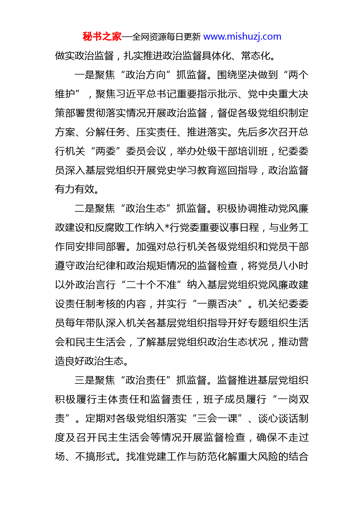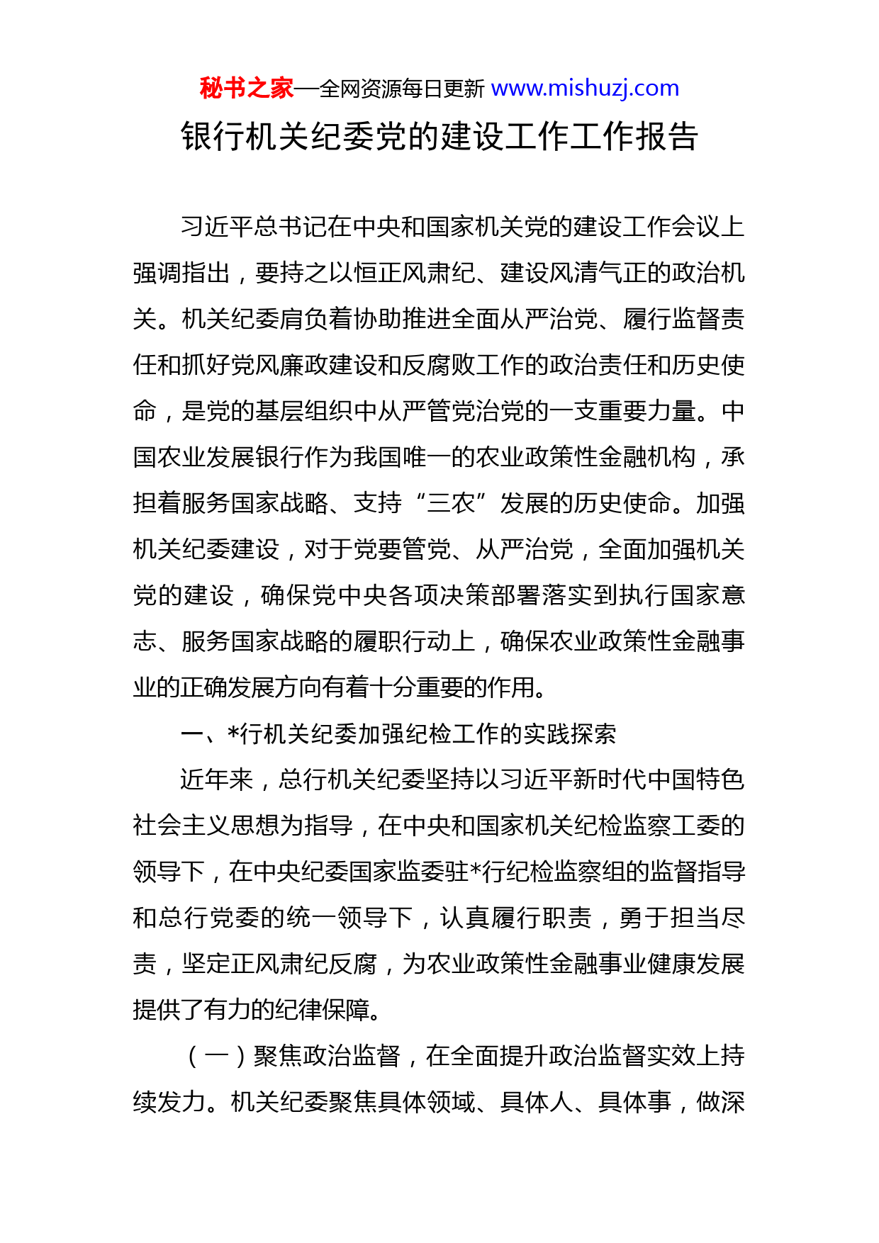 秘书之家—全网资源每日更新www.mishuzj.com银行机关纪委党的建设工作工作报告习近平总书记在中央和国家机关党的建设工作会议上强调指出,要持之以恒正风肃纪、建设风清气正的政治机关。机关纪委肩负着协助推进全面从严治党、履行监督责任和抓好党风廉政建设和反腐败工作的政治责任和历史使命,是党的基层组织中从严管党治党的一支重要力量。中国农业发展银行作为我国唯一的农业政策性金融机构,承担着服务国家战略、支持“三农”发展的历史使命。加强机关纪委建设,对于党要管党、从严治党,全面加强机关党的建设,确保党中央各项决策部署落实到执行国家意志、服务国家战略的履职行动上,确保农业政策性金融事业的正确发展方向有着十分重要的作用。一、行机关纪委加强纪检工作的实践探索近年来,总行机关纪委坚持以习近平新时代中国特色社会主义思想为指导,在中央和国家机关纪检监察工委的领导下,在中央纪委国家监委驻行纪检监察组的监督指导和总行党委的统一领导下,认真履行职责,勇于担当尽责,坚定正风肃纪反腐,为农业政策性金融事业健康发展提供了有力的纪律保障。(一)聚焦政治监督,在全面提升政治监督实效上持续发力。机关纪委聚焦具体领域、具体人、具体事,做深秘书之家—全网资源每日更新www.mishuzj.com做实政治监督,扎实推进政治监督具体化、常态化。一是聚焦“政治方向”抓监督。围绕坚决做到“两个维护”,聚焦习近平总书记重要指示批示、党中央重大决策部署贯彻落实情况开展政治监督,督促各级党组织制定方案、分解任务、压实责任、推进落实。先后多次召开总行机关“两委”委员会议,举办处级干部培训班,纪委委员深入基层党组织开展党史学习教育巡回指导,政治监督有力有效。二是聚焦“政治生态”抓监督。积极协调推动党风廉政建设和反腐败工作纳入行党委重要议事日程,与业务工作同安排同部署。加强对总行机关各级党组织和党员干部遵守政治纪律和政治规矩情况的监督检查,将党员八小时以外政治言行“二十个不准”纳入基层党组织党风廉政建设责任制考核的内容,并实行“一票否决”。机关纪委委员每年带队深入机关各基层党组织指导开好专题组织生活会和民主生活会,了解基层党组织政治生态状况,推动营造良好政治生态。三是聚焦“政治责任”抓监督。监督推进基层党组织积极履行主体责任和监督责任,班子成员履行“一岗双责”。定期对各级党组织落实“三会一课”、谈心谈话制度及召开民主生活会等情况开展监督检查,确保不走过场、不搞形式。找准党建工作与防范化解重大风险的结合秘书之家—全网资源每日更新www.mishuzj.com点、切入点,监督推动“总行机关强化党建统领,坚决打好防范化解重大风险攻坚战”活动,督促各基层党组织排查、整改风险点,扎实推进党建与业务工作的深度融合。(二)聚焦作风建设,在持续纠治“四风”上持续发力。通过开展问题自查、线索排查、查处典型问题、通报典型案例,持续发力、严防“四风”问题反弹。一是突出“防”,增强纪律规矩意识。在重要节点及时向全体干部、员工发送廉洁提醒短信,早打招呼、早敲警钟。及时通报行内外查处的“四风”问题典型案例,充分发挥震慑和警示作用。制定下发《关于严格规范举办婚丧喜庆事宜有关纪律要求的通知》,严明条纪律红线,强化“两报告一承诺机制”,机关员工按要求及时报告婚丧喜庆事宜操办情况,有效防止大操大办和借机敛财等问题发生。二是营造“势”,形成监督无处不在的氛围。在行官网设立“四风”问题举报邮箱,公布“四风”问题举报电话,建立重要节假日“四风”问题举报值班制度,有效畅通举报渠道;针对节日期间易发、多发和隐形变异“四风”问题开展监督检查,督促各党组织每月排查违反中央八项规定精神问题,让“四风”问题无处遁形。采取“不打招呼、直击现场”的方式,先后多次对总行机关疫情防控情况进行督促检查;坚决整治餐饮浪费,对机关行政服务部门开展现场检查,督促厉行节约,杜绝餐饮浪费。秘书之家—全网资源每日更新www.mishuzj.com三是体现“严”,快查严处顶风违纪者。动员千遍,不如问责一次。紧盯领导干部这个“关键少数”,聚焦收送节礼这个易发多发问题,对在节日期间顶风违纪个别党员领导干部,坚决查处、严肃问责,并通报曝光。监督推动“灯下黑”问题专项整治,督促机关各党组织对查摆出的问题及时进行整改。(三)聚焦监督主业,在做实日常监督管理上持续发力。机关纪委坚持把监督抓在日常、严在经常、实在平常,加强对党员干部特别是处级领导干部的日常监督和管理。一是定准“点”,提升监督精准度。围绕权力相对集中和廉政风险较大的信贷、财会、人事等领域和环节,盯住重点人和重点事,找准权力运行风险点,筑牢廉政风险“防火墙”。印发《总行机关廉政风险岗位分级管理工作方案》,对处级及以下干部实行一、二、三级风险等级管理。印发《总行机关廉政风险岗位分级管理评估工作方案》,每年选取部分部室具有人、财、物管理职能的处长岗位开展廉政风险评估,督促各基层党组织查找风险、制定措施、完善制度、防控风险。二是连成“线”,织牢织密监督网。紧紧抓住压实基层党支部主体责任这条“主线”,