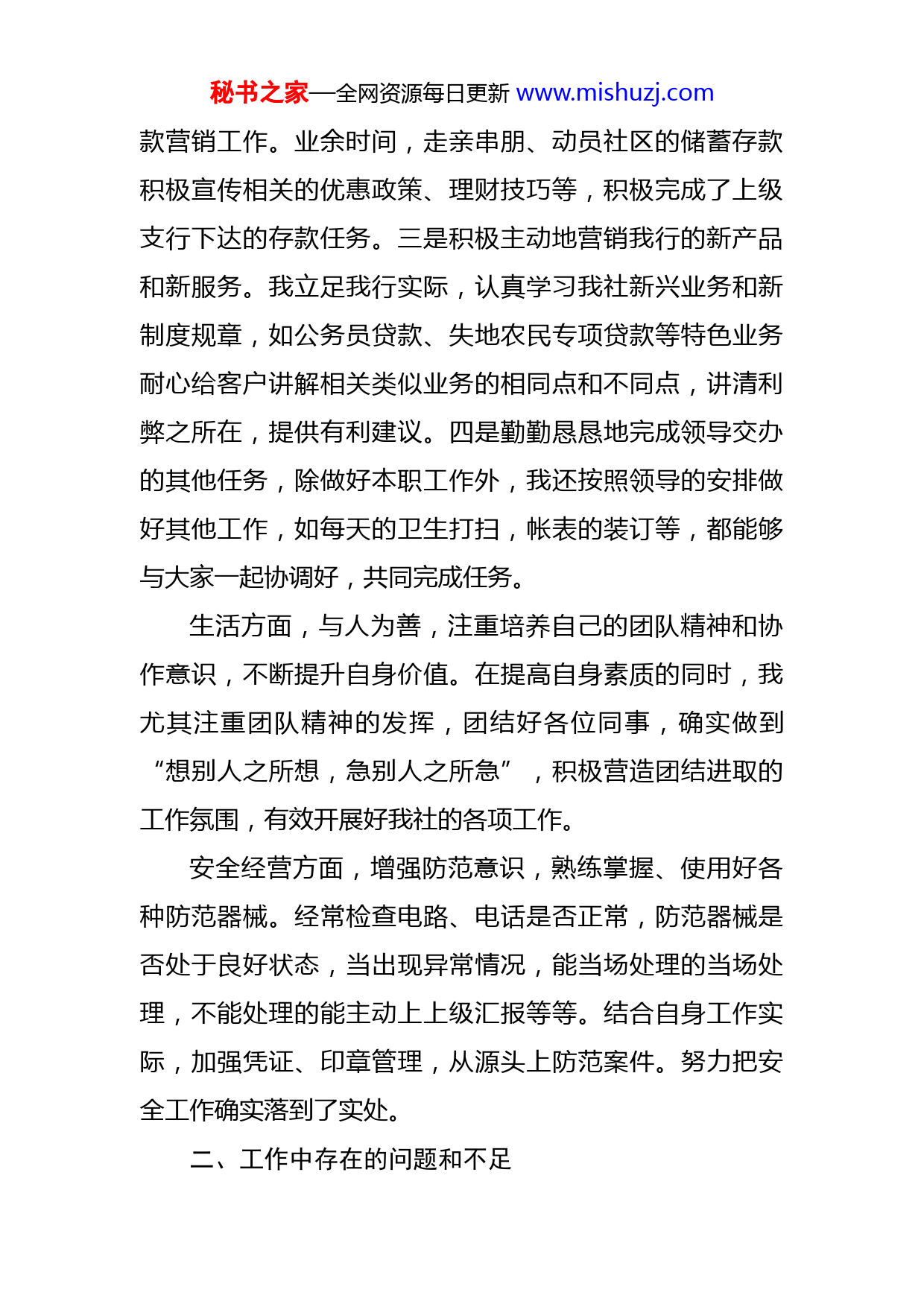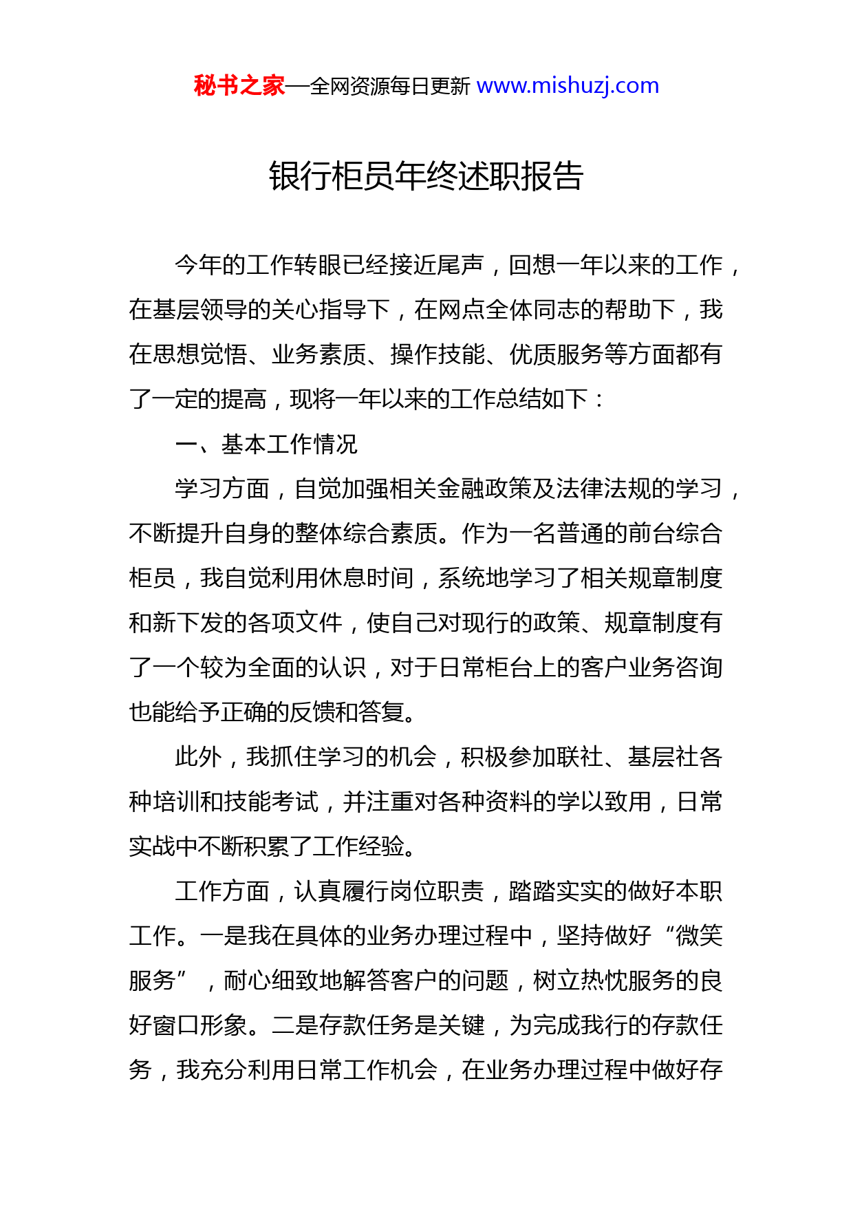 秘书之家—全网资源每日更新www.mishuzj.com银行柜员年终述职报告今年的工作转眼已经接近尾声,回想一年以来的工作,在基层领导的关心指导下,在网点全体同志的帮助下,我在思想觉悟、业务素质、操作技能、优质服务等方面都有了一定的提高,现将一年以来的工作总结如下:一、基本工作情况学习方面,自觉加强相关金融政策及法律法规的学习,不断提升自身的整体综合素质。作为一名普通的前台综合柜员,我自觉利用休息时间,系统地学习了相关规章制度和新下发的各项文件,使自己对现行的政策、规章制度有了一个较为全面的认识,对于日常柜台上的客户业务咨询也能给予正确的反馈和答复。此外,我抓住学习的机会,积极参加联社、基层社各种培训和技能考试,并注重对各种资料的学以致用,日常实战中不断积累了工作经验。工作方面,认真履行岗位职责,踏踏实实的做好本职工作。一是我在具体的业务办理过程中,坚持做好“微笑服务”,耐心细致地解答客户的问题,树立热忱服务的良好窗口形象。二是存款任务是关键,为完成我行的存款任务,我充分利用日常工作机会,在业务办理过程中做好存秘书之家—全网资源每日更新www.mishuzj.com款营销工作。业余时间,走亲串朋、动员社区的储蓄存款积极宣传相关的优惠政策、理财技巧等,积极完成了上级支行下达的存款任务。三是积极主动地营销我行的新产品和新服务。我立足我行实际,认真学习我社新兴业务和新制度规章,如公务员贷款、失地农民专项贷款等特色业务耐心给客户讲解相关类似业务的相同点和不同点,讲清利弊之所在,提供有利建议。四是勤勤恳恳地完成领导交办的其他任务,除做好本职工作外,我还按照领导的安排做好其他工作,如每天的卫生打扫,帐表的装订等,都能够与大家一起协调好,共同完成任务。生活方面,与人为善,注重培养自己的团队精神和协作意识,不断提升自身价值。在提高自身素质的同时,我尤其注重团队精神的发挥,团结好各位同事,确实做到“想别人之所想,急别人之所急”,积极营造团结进取的工作氛围,有效开展好我社的各项工作。安全经营方面,增强防范意识,熟练掌握、使用好各种防范器械。经常检查电路、电话是否正常,防范器械是否处于良好状态,当出现异常情况,能当场处理的当场处理,不能处理的能主动上上级汇报等等。结合自身工作实际,加强凭证、印章管理,从源头上防范案件。努力把安全工作确实落到了实处。二、工作中存在的问题和不足秘书之家—全网资源每日更新www.mishuzj.com有成绩就一定有不足之处,在正确进行自我分析和定位的基础上,回顾一年来的工作,仍存在很多的问题和不足,具体表现在以下几个方面:一是学习的积极主动性还不够,因家庭因素、工作开展因素的客观因素的影响,导致存在学习的连续性不足,存在业务素质提高不快,对旧有知识回顾不足的问题,学习效率低的情况。二是创新意识和进取意识不足,在自觉主动学习方面,与年轻大学生相比还存在一定的差距,不能有效的结合自身专业特长和岗位实际进行业务创新或针对岗位需求自觉进行相关考试认证。三是工作方式简单,尚停留在较低层次的任务完成要求上,工作开展的实际效率和效果还有待提高。三、工作愿景新年新气象,在新的一年即将开始之际,我将立足自身实际,客观分析自身所存在的问题和不足,结合县联社和我社发展的实际情况,有目的、有针对性的解决自身存在的实际问题,重点做好以下几个方面的工作:一是继续加强学习,不断提高自身的综合能力和业务技能,我将结合自身工作开展的实际,有计划的报考银行从业资格证的相关科目考试,职称资格考试,针对自身进取不足的实际,自觉提高整体综合素质。秘书之家—全网资源每日更新www.mishuzj.com二是不断提升自身综合技能,如专业技能、服务能力和营销能力,有效提升自己的整体综合素质。三是充分理解客户的心态,进行换位思考,积极探索客户维护和服务的方式、方法,不断提升现有客户的忠诚度和诚信度。四是熟练掌握各种业务技能特别是计算机操作技能、财会业务等技能,努力适应时代发展需要,更好地迎接转型的要求。我将努力克服自身的不足,严格服从领导安排,积极开拓进取,不断提高自身综合素质,有效履行岗位职责,当好参谋助手,与全体伙伴们一起,团结一致,为我行经营效益的提高作出自己最大的努力。
