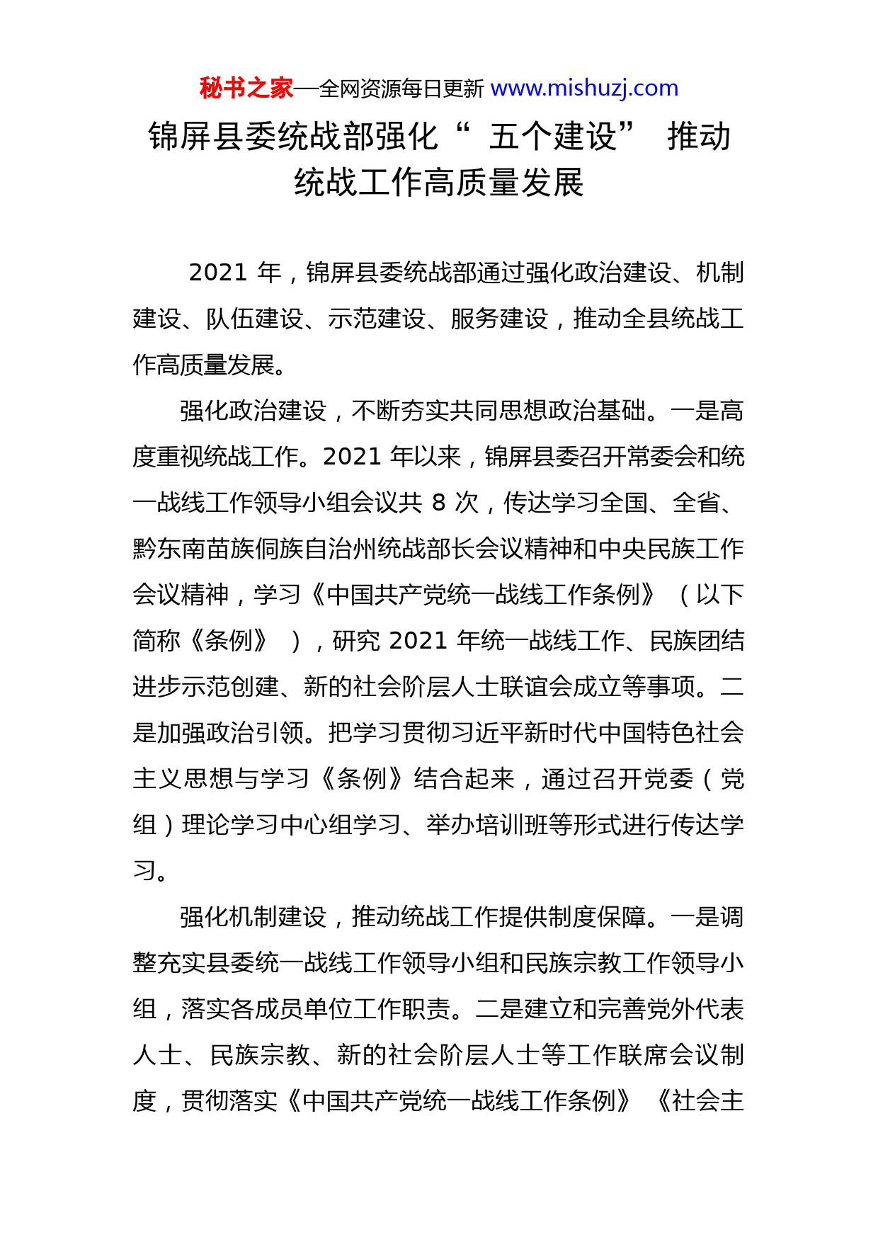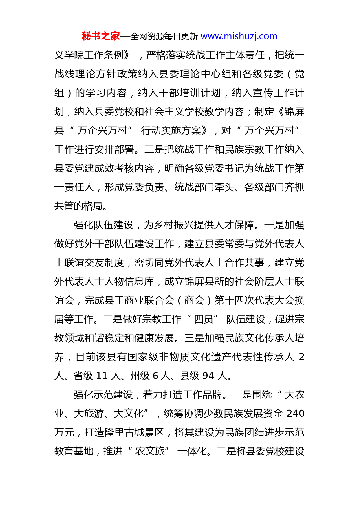 秘书之家—全网资源每日更新www.mishuzj.com锦屏县委统战部强化“五个建设”推动统战工作高质量发展2021年,锦屏县委统战部通过强化政治建设、机制建设、队伍建设、示范建设、服务建设,推动全县统战工作高质量发展。强化政治建设,不断夯实共同思想政治基础。一是高度重视统战工作。2021年以来,锦屏县委召开常委会和统一战线工作领导小组会议共8次,传达学习全国、全省、黔东南苗族侗族自治州统战部长会议精神和中央民族工作会议精神,学习《中国共产党统一战线工作条例》(以下简称《条例》),研究2021年统一战线工作、民族团结进步示范创建、新的社会阶层人士联谊会成立等事项。二是加强政治引领。把学习贯彻习近平新时代中国特色社会主义思想与学习《条例》结合起来,通过召开党委(党组)理论学习中心组学习、举办培训班等形式进行传达学习。强化机制建设,推动统战工作提供制度保障。一是调整充实县委统一战线工作领导小组和民族宗教工作领导小组,落实各成员单位工作职责。二是建立和完善党外代表人士、民族宗教、新的社会阶层人士等工作联席会议制度,贯彻落实《中国共产党统一战线工作条例》《社会主秘书之家—全网资源每日更新www.mishuzj.com义学院工作条例》,严格落实统战工作主体责任,把统一战线理论方针政策纳入县委理论中心组和各级党委(党组)的学习内容,纳入干部培训计划,纳入宣传工作计划,纳入县委党校和社会主义学校教学内容;制定《锦屏县“万企兴万村”行动实施方案》,对“万企兴万村”工作进行安排部署。三是把统战工作和民族宗教工作纳入县委党建成效考核内容,明确各级党委书记为统战工作第一责任人,形成党委负责、统战部门牵头、各级部门齐抓共管的格局。强化队伍建设,为乡村振兴提供人才保障。一是加强做好党外干部队伍建设工作,建立县委常委与党外代表人士联谊交友制度,密切同党外代表人士合作共事,建立党外代表人士人物信息库,成立锦屏县新的社会阶层人士联谊会,完成县工商业联合会(商会)第十四次代表大会换届等工作。二是做好宗教工作“四员”队伍建设,促进宗教领域和谐稳定和健康发展。三是加强民族文化传承人培养,目前该县有国家级非物质文化遗产代表性传承人2人、省级11人、州级6人、县级94人。强化示范建设,着力打造工作品牌。一是围绕“大农业、大旅游、大文化”,统筹协调少数民族发展资金240万元,打造隆里古城景区,将其建设为民族团结进步示范教育基地,推进“农文旅”一体化。二是将县委党校建设秘书之家—全网资源每日更新www.mishuzj.com为铸牢中华民族共同体意识教育培训基地(阵地),把党的民族政策及相关法律法规纳入干部队伍必修课;将城关二小打造为民族团结进步互观互学基地,让全县各族干部群众在互观互学中提高思想认识。三是探索“三联动”促进机制创新、“三同步”推进提质增效、“三用情”彰显为民情怀的“三个三”民族团结进步和谐发展机制,引领全县各族群众不断铸牢中华民族共同体意识。目前,该县成功创建国家级民族团结进步示范单位2个、省级7个、州级85个、县级237个;2021年1月,该县被国家民委命名为“全国民族团结进步示范县”。强化服务建设,汇聚合力共促发展。一是利用民贸民品优惠贷款贴息政策,争取贴息资金35.88万元,撬动贷款2640万元,助力该县民贸民品企业做大做强;投入少数民族发展资金30万元,改善各族群众住房条件,受益群众21户97人。二是持续推进“万企兴万村”行动,引导全县33家民营企业结对帮扶64个村,实施项目89个,累计投入帮扶资金3104万元,惠及7109人。三是组织动员60家民营企业先后入驻“贵商智慧服务云平台”,助力民营经济转型升级,为锦屏民营经济高质量发展注入新活力。