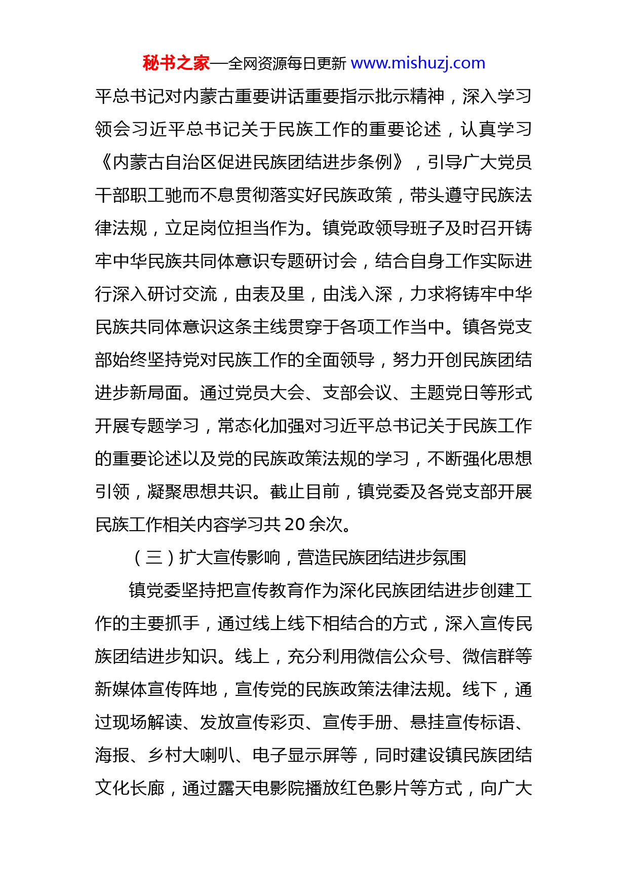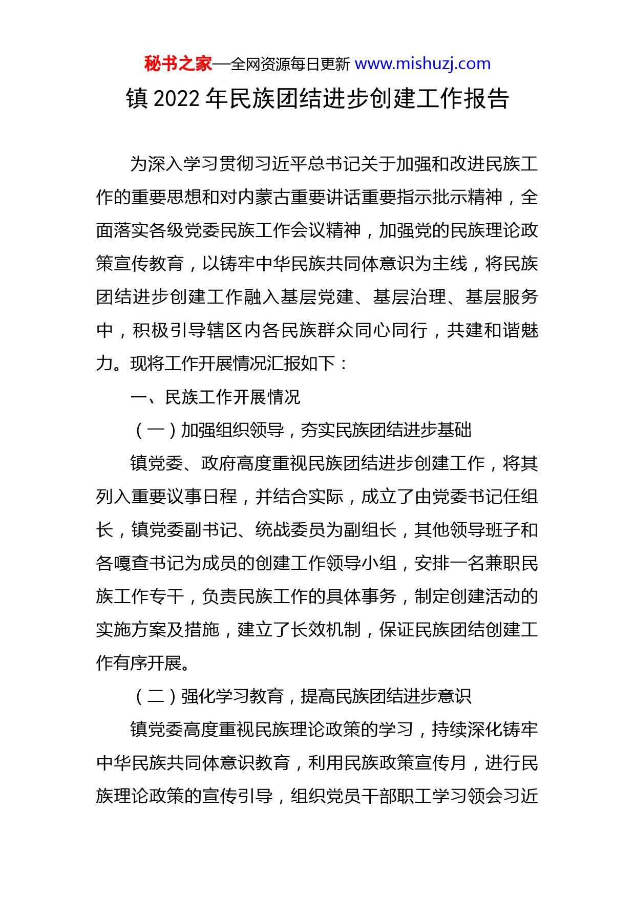 秘书之家—全网资源每日更新www.mishuzj.com镇2022年民族团结进步创建工作报告为深入学习贯彻习近平总书记关于加强和改进民族工作的重要思想和对内蒙古重要讲话重要指示批示精神,全面落实各级党委民族工作会议精神,加强党的民族理论政策宣传教育,以铸牢中华民族共同体意识为主线,将民族团结进步创建工作融入基层党建、基层治理、基层服务中,积极引导辖区内各民族群众同心同行,共建和谐魅力。现将工作开展情况汇报如下:一、民族工作开展情况(一)加强组织领导,夯实民族团结进步基础镇党委、政府高度重视民族团结进步创建工作,将其列入重要议事日程,并结合实际,成立了由党委书记任组长,镇党委副书记、统战委员为副组长,其他领导班子和各嘎查书记为成员的创建工作领导小组,安排一名兼职民族工作专干,负责民族工作的具体事务,制定创建活动的实施方案及措施,建立了长效机制,保证民族团结创建工作有序开展。(二)强化学习教育,提高民族团结进步意识镇党委高度重视民族理论政策的学习,持续深化铸牢中华民族共同体意识教育,利用民族政策宣传月,进行民族理论政策的宣传引导,组织党员干部职工学习领会习近秘书之家—全网资源每日更新www.mishuzj.com平总书记对内蒙古重要讲话重要指示批示精神,深入学习领会习近平总书记关于民族工作的重要论述,认真学习《内蒙古自治区促进民族团结进步条例》,引导广大党员干部职工驰而不息贯彻落实好民族政策,带头遵守民族法律法规,立足岗位担当作为。镇党政领导班子及时召开铸牢中华民族共同体意识专题研讨会,结合自身工作实际进行深入研讨交流,由表及里,由浅入深,力求将铸牢中华民族共同体意识这条主线贯穿于各项工作当中。镇各党支部始终坚持党对民族工作的全面领导,努力开创民族团结进步新局面。通过党员大会、支部会议、主题党日等形式开展专题学习,常态化加强对习近平总书记关于民族工作的重要论述以及党的民族政策法规的学习,不断强化思想引领,凝聚思想共识。截止目前,镇党委及各党支部开展民族工作相关内容学习共20余次。(三)扩大宣传影响,营造民族团结进步氛围镇党委坚持把宣传教育作为深化民族团结进步创建工作的主要抓手,通过线上线下相结合的方式,深入宣传民族团结进步知识。线上,充分利用微信公众号、微信群等新媒体宣传阵地,宣传党的民族政策法律法规。线下,通过现场解读、发放宣传彩页、宣传手册、悬挂宣传标语、海报、乡村大喇叭、电子显示屏等,同时建设镇民族团结文化长廊,通过露天电影院播放红色影片等方式,向广大秘书之家—全网资源每日更新www.mishuzj.com群众宣传党的民族理论政策和法律法规,讲好民族团结进步故事,传播民族团结最强音,不断铸牢中华民族共同体意识。截止目前,镇微信公众号上转发铸牢中华民族共同体意识、内蒙古自治区实施《中华人民共和国国家通用语言文字法》办法、《内蒙古自治区促进民族团结进步条例》等相关内容20余次,共发放各类宣传资料、手册500余份,悬挂宣传标语6条,撰写各类信息简报60余篇。(四)丰富活动载体,增强民族团结进步情怀为使辖区各民族群众守望相助,相互交往交流交融,让各民族群众“像石榴籽一样紧紧抱在一起”,增强各族群众的民族团结进步情怀,镇党委积极动员,充分发动各级党支部、党群服务中心、工青妇等群团组织,开展主题党日、主题团日、朗读比赛、走访慰问、515国际家庭节、迎“七一”、喜迎XX大等系列活动,利用“民族团结进步活动月”和“全民国防教育日”,联合团区委、区各中小学校等部门开展全区中小学生“同心营”系列活动,将民族理论政策以群众喜闻乐见的方式贯穿于各类活动当中,采取分众化、差异化的活动模式,范围覆盖各个年龄层次的人群,寓教于乐,寓学于乐,使“中华民族一家亲,同心共筑中国梦”的理念传递到千家万户。截止目前,镇共举办各类民族团结进步活动40余次。(五)坚持依法治理民族事务,推进民族团结进步创秘书之家—全网资源每日更新www.mishuzj.com建一是各党支部、红色堡垒户对《内蒙古自治区促进民族团结进步条例》进行了专题学习,对《条例》出台的背景、重大意义和主要内容进行全面解读。二是申请少数民族发展项目资金20万元,实施《镇布达图嘎查人居环境提升工程项目》,并在镇第十四届人民代表大会第二次会上票决通过。三是整理汇编镇近三年民族团结进步创建工作档案。二、下一步工作计划一是加强理论学习,提高民族团结进步创建思想认识。坚定不移加强党对民族工作的领导,秉持“重在平时、重在交心、重在行动、重在基层”的工作理念,按照人文化、实体化、大众化总要求,全面深入持久开展民族团结进步创建工作,挖掘培树民族工作的先进典型和事迹,注重发挥好示范引领作用。二是改进宣传方式,拓展民族团结进步创建宣传空间。推进“互联网+民族团结”行动,充分运用新技术、新媒体打造实体化的宣传载体,扩大中国特色民族理论创新成果的网上传播,促进各民族群众文化交流互鉴,把互联网空间打造成促进民族团结进步、铸牢中华民族共同体意识的新平台。三是坚持改革创新,完善民族团结进步示范创建体制秘书之家—全网资源每日更新www.mishuzj.com机制。把创建工作纳入全镇经济社会
