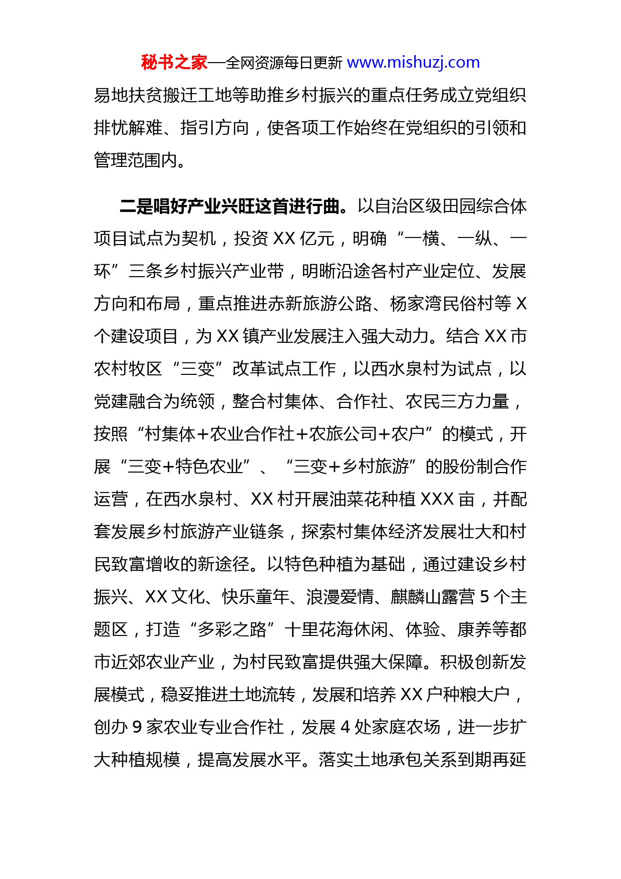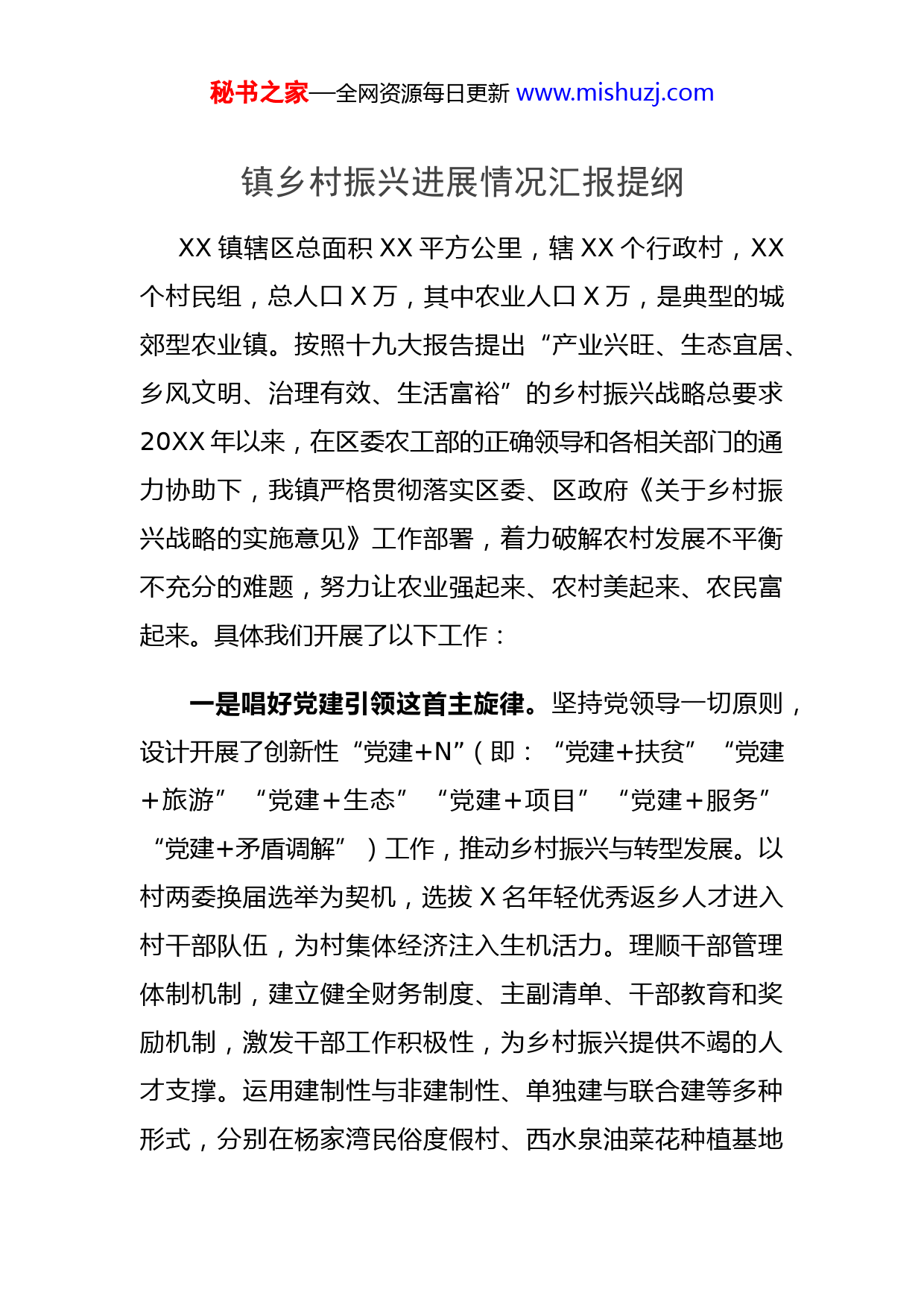 秘书之家—全网资源每日更新www.mishuzj.com镇乡村振兴进展情况汇报提纲XX镇辖区总面积XX平方公里,辖XX个行政村,XX个村民组,总人口X万,其中农业人口X万,是典型的城郊型农业镇。按照十九大报告提出“产业兴旺、生态宜居、乡风文明、治理有效、生活富裕”的乡村振兴战略总要求20XX年以来,在区委农工部的正确领导和各相关部门的通力协助下,我镇严格贯彻落实区委、区政府《关于乡村振兴战略的实施意见》工作部署,着力破解农村发展不平衡不充分的难题,努力让农业强起来、农村美起来、农民富起来。具体我们开展了以下工作:一是唱好党建引领这首主旋律。坚持党领导一切原则,设计开展了创新性“党建+N”(即:“党建+扶贫”“党建+旅游”“党建+生态”“党建+项目”“党建+服务”“党建+矛盾调解”)工作,推动乡村振兴与转型发展。以村两委换届选举为契机,选拔X名年轻优秀返乡人才进入村干部队伍,为村集体经济注入生机活力。理顺干部管理体制机制,建立健全财务制度、主副清单、干部教育和奖励机制,激发干部工作积极性,为乡村振兴提供不竭的人才支撑。运用建制性与非建制性、单独建与联合建等多种形式,分别在杨家湾民俗度假村、西水泉油菜花种植基地秘书之家—全网资源每日更新www.mishuzj.com易地扶贫搬迁工地等助推乡村振兴的重点任务成立党组织排忧解难、指引方向,使各项工作始终在党组织的引领和管理范围内。二是唱好产业兴旺这首进行曲。以自治区级田园综合体项目试点为契机,投资XX亿元,明确“一横、一纵、一环”三条乡村振兴产业带,明晰沿途各村产业定位、发展方向和布局,重点推进赤新旅游公路、杨家湾民俗村等X个建设项目,为XX镇产业发展注入强大动力。结合XX市农村牧区“三变”改革试点工作,以西水泉村为试点,以党建融合为统领,整合村集体、合作社、农民三方力量,按照“村集体+农业合作社+农旅公司+农户”的模式,开展“三变+特色农业”、“三变+乡村旅游”的股份制合作运营,在西水泉村、XX村开展油菜花种植XXX亩,并配套发展乡村旅游产业链条,探索村集体经济发展壮大和村民致富增收的新途径。以特色种植为基础,通过建设乡村振兴、XX文化、快乐童年、浪漫爱情、麒麟山露营5个主题区,打造“多彩之路”十里花海休闲、体验、康养等都市近郊农业产业,为村民致富提供强大保障。积极创新发展模式,稳妥推进土地流转,发展和培养XX户种粮大户,创办9家农业专业合作社,发展4处家庭农场,进一步扩大种植规模,提高发展水平。落实土地承包关系到期再延秘书之家—全网资源每日更新www.mishuzj.com长XX年重大决策部署,完成XX万亩土地确权,保护农民土地权益。制定《XX镇农村集体资金资产资源管理实施细则》和《针对村财务管理过程出现具体问题处理的说明》进一步规范村集体经济的使用和管理,保证村民的合法利益。同时,镇党委政府将脱贫攻坚与产业发展相结合,通过发展虫草等特色作物种植,肉羊、肉驴等规模养殖,联合企业开展农产品收购,引进光伏发电等方式,激发贫困户内生动力,实现以产业发展促脱贫攻坚,以脱贫攻坚助乡村振兴。三是唱好生态宜居这首交响乐。大力实施基础设施配套工程建设,突出抓好水、电、路、网等宜居工程基础设施配套建设,全面落实土地整治、危房改造等措施,完成村庄及道路硬化XX万平方米,新建三眼井游客接待中心XX平方米,墙体美化XX平方米,架设路灯XX盏,安设垃圾桶XX个。建立“二级河长、三级管理、五支队伍”河长制工作管理体系,认真落实“河长制”各项任务,以柳条沟河、三道井子河流域及支流治理为重点,营造生态河道,组建XX支村民河道排查整治小队,形成严密管护网络,不断改善水生态环境。大力实施环境治理工程,结合XX区“六个零容忍”、“十个严管理”以及农村“清五堆”、“治五乱”工作要求,拆除新增既有违法建筑3万余平方秘书之家—全网资源每日更新www.mishuzj.com米,各类违规户外广告和牌匾XX余块,取缔露天烧烤XX余个。投资XX万元,对农村公共区域、周边旗县区接壤处、国有林地等区域的既有垃圾和堆放杂物进行拉网式排查,清理各类垃圾XXX吨、各类杂物近万吨,查处各类“五乱”现象1万处,彻底改变了“垃圾围村”的现状。实施XX个美丽乡村工程项目,开展实施“三级领导、四级联动”征收工作机制,全力推进XX国道拓宽、高铁供电线路塔基、旅游公路改造升级等重点工作,切实改善镇村建设水平。四是唱好乡风文明这首咏叹调。积极倡导乡贤文化,建立健全村规民约,在全镇开展“立家规、传家训”活动,强化村民道德实践养成。充分利用草原书屋、北疆先锋、理论宣讲团打造多样的平台和阵地,普及社会主义核心价值观,切实加强农村意识形态引导。依托浓厚的文化底蕴和资源禀赋,大力弘扬德善孝敬等优良传统,开展“最美好儿媳”、XX好人、善行义举榜等评选活动和“百家宴”等邻里互动活动,使孝老敬亲、邻里守望的观念深入人心挖掘农村文化特色,在9个行政村分别开设布贴画、板画、皮影等手工制作教程,一村一品,主题鲜明。打造农村文化精品,开展农民文化节活动,其中秧歌大赛已成为XX镇农民文化活动品牌。秘书之家—全网资源每日更新www.mishuzj.com五是唱好脱贫攻坚这首最强音。深入开展“大排查大整治”活动。整合区