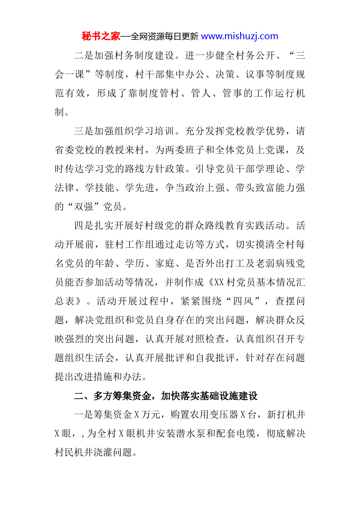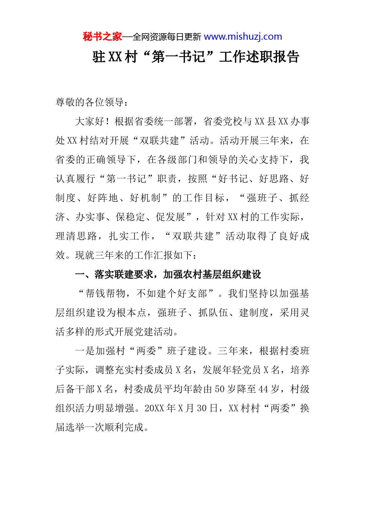 秘书之家—全网资源每日更新www.mishuzj.com驻XX村“第一书记”工作述职报告尊敬的各位领导:大家好!根据省委统一部署,省委党校与XX县XX办事处XX村结对开展“双联共建”活动。活动开展三年来,在省委的正确领导下,在各级部门和领导的关心支持下,我认真履行“第一书记”职责,按照“好书记、好思路、好制度、好阵地、好机制”的工作目标,“强班子、抓经济、办实事、保稳定、促发展”,针对XX村的工作实际,理清思路,扎实工作,“双联共建”活动取得了良好成效。现就三年来的工作汇报如下:一、落实联建要求,加强农村基层组织建设“帮钱帮物,不如建个好支部”。我们坚持以加强基层组织建设为根本点,强班子、抓队伍、建制度,采用灵活多样的形式开展党建活动。一是加强村“两委”班子建设。三年来,根据村委班子实际,调整充实村委成员X名,发展年轻党员X名,培养后备干部X名,村委成员平均年龄由50岁降至44岁,村级组织活力明显增强。20XX年X月30日,XX村村“两委”换届选举一次顺利完成。秘书之家—全网资源每日更新www.mishuzj.com二是加强村务制度建设。进一步健全村务公开、“三会一课”等制度,村干部集中办公、决策、议事等制度规范有效,形成了靠制度管村、管人、管事的工作运行机制。三是加强组织学习培训。充分发挥党校教学优势,请省委党校的教授来村,为两委班子和全体党员上党课,及时传达学习党的路线方针政策。引导党员干部学理论、学法律、学技能、学先进,争当政治上强、带头致富能力强的“双强”党员。四是扎实开展好村级党的群众路线教育实践活动。活动开展前,驻村工作组通过走访等方式,切实摸清全村每名党员的年龄、学历、家庭、是否外出打工及老弱病残党员能否参加活动等情况,并制作成《XX村党员基本情况汇总表》。活动开展过程中,紧紧围绕“四风”,查摆问题,解决党组织和党员自身存在的突出问题,解决群众反映强烈的突出问题,认真开展对照检查,认真组织召开专题组织生活会,认真开展批评和自我批评,针对存在问题提出改进措施和办法。二、多方筹集资金,加快落实基础设施建设一是筹集资金X万元,购置农用变压器X台,新打机井X眼,,为全村X眼机井安装潜水泵和配套电缆,彻底解决村民机井浇灌问题。秘书之家—全网资源每日更新www.mishuzj.com二是自筹资金X万元,出工备土7000多立方,夯实路基,整修道路X公里。筹集资金X万元,对XX村周边的三座桥梁进行了修缮加固,极大地方便了群众出行。三是筹集资金X万元,对现有的村支部、村委会办公活动场所进行了粉刷、装修,增添新的办公桌椅、文件橱及电脑、电视等设施,对办公场所各个功能区进行了规整、设置。通过整治,办公活动场所面貌焕然一新。四是响应城乡环卫一体化的号召,筹资X万余元,雇用挖掘机、铲车等机械和大量人工,对村内外的环境卫生进行彻底全面的清理整治,填埋臭水坑,平整绿化街道,添置垃圾箱,美化、绿化、净化了环境。三、坚持因地制宜,促进村民致富和集体增收有集体收入,特别是在促进农民增收过程中增加村级集体经营性收入,满足村级组织正常运转和服务群众需要,这是“双联共建”活动“五有”工作目标之一。从转变村干部和群众思想观念入手,结合XX村的有利条件和优势,因地制宜引进致富增收的项目,是我们驻村帮扶的重点。一是通过土地流转,整合村民承包地X亩,建成一处绿化苗木培育基地,拓宽群众致富渠道。二是是借助XX村紧靠XX县城的区位优势,利用废弃厂房和场地,因地制宜的引进服装加工厂、外加剂厂、餐饮企业、奶牛养殖基地。这些项目总投资XX余万元,全部投产后能吸纳XX余人就秘书之家—全网资源每日更新www.mishuzj.com业。这对增加村集体收入和村民收入、吸纳村民就业、促进村服务业发展都起到了示范作用。四、强化宗旨意识,切实解决群众关心问题一是扎实开展扶贫帮困活动。20XX年X月3日,省委党校向贫困户赠送了桌、椅、橱子XX件;X月4日,省委党校再一次向困难户赠送电视机X台,切实解决了他们的实际困难,密切了党群干群关系。二是购置了价值X万余元的图书和书柜,建设农村书屋。三是请XX县医院专家大夫来XX,为全村XX岁以上的老年人免费健康查体。四是改革旧有的婚丧嫁娶大操大办的陋习,做到一切从简,受到群众欢迎。三年的驻村工作,我尽力为XX村做了些事情,这是“第一书记”的职责,也是一种荣耀。深入基层第一线,也让我得到了学习、锻炼和提高,提升了干好工作的素质、境界和能力。我将认真总结这段难忘的工作经历,把基层学到的好传统、好精神、好经验、好做法,贯彻到今后的工作中去,以更加过硬的工作作风、更加饱满的精神状态、更加务实的工作态度,再创佳绩。
