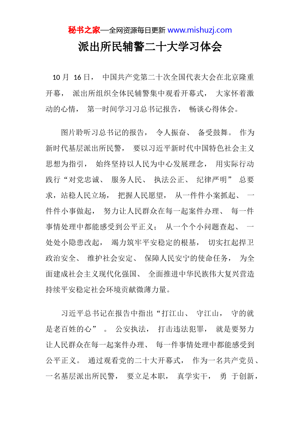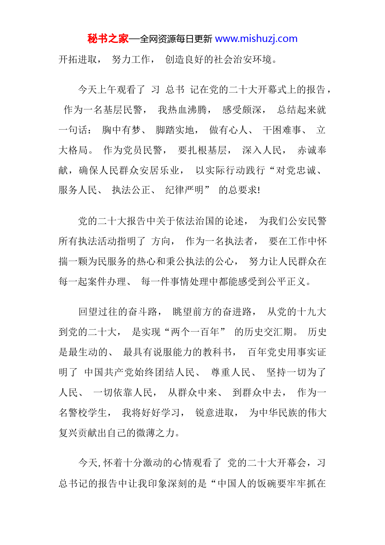 秘书之家—全网资源每日更新www.mishuzj.com派出所民辅警二十大学习体会10月16日,中国共产党第二十次全国代表大会在北京隆重开幕,派出所组织全体民辅警集中观看开幕式,大家怀着激动的心情,第一时间学习习总书记报告,畅谈心得体会。图片聆听习总书记的报告,令人振奋、备受鼓舞。作为新时代基层派出所民警,要以习近平新时代中国特色社会主义思想为指引,始终坚持以人民为中心发展理念,用实际行动践行“对党忠诚、服务人民、执法公正、纪律严明”总要求,站稳人民立场,把握人民愿望,从一件件小案抓起、一件件小事做起,努力让人民群众在每一起案件办理、每一件事情处理中都能感受到公平正义;从一个个小问题查起、一处处小隐患改起,竭力筑牢平安稳定的根基,切实扛起捍卫政治安全、维护社会安定、保障人民安宁的使命任务,为全面建成社会主义现代化强国、全面推进中华民族伟大复兴营造持续平安稳定社会环境贡献微薄力量。习近平总书记在报告中指出“打江山、守江山,守的就是老百姓的心”。公安执法,打击违法犯罪,就是要努力让人民群众在每一起案件办理、每一件事情处理中都能感受到公平正义。通过观看党的二十大开幕式,作为一名共产党员、一名基层派出所民警,要立足本职,真学实干,勇于创新,秘书之家—全网资源每日更新www.mishuzj.com开拓进取,努力工作,创造良好的社会治安环境。今天上午观看了习总书记在党的二十大开幕式上的报告,作为一名基层民警,我热血沸腾,感受颇深,总结起来就一句话:胸中有梦、脚踏实地,做有心人、干困难事、立大格局。作为党员民警,要扎根基层,深入人民,赤诚奉献,确保人民群众安居乐业,以实际行动践行“对党忠诚、服务人民、执法公正、纪律严明”的总要求!党的二十大报告中关于依法治国的论述,为我们公安民警所有执法活动指明了方向,作为一名执法者,要在工作中怀揣一颗为民服务的热心和秉公执法的公心,努力让人民群众在每一起案件办理、每一件事情处理中都能感受到公平正义。回望过往的奋斗路,眺望前方的奋进路,从党的十九大到党的二十大,是实现“两个一百年”的历史交汇期。历史是最生动的、最具有说服能力的教科书,百年党史用事实证明了中国共产党始终团结人民、尊重人民、坚持一切为了人民、一切依靠人民,从群众中来、到群众中去,作为一名警校学生,我将好好学习,锐意进取,为中华民族的伟大复兴贡献出自己的微薄之力。今天,怀着十分激动的心情观看了党的二十大开幕会,习总书记的报告中让我印象深刻的是“中国人的饭碗要牢牢抓在秘书之家—全网资源每日更新www.mishuzj.com中国人自己手中”,体现了总书记的高瞻远瞩和为民情怀。坚持党的全面领导,是历史的必然、人民的选择,只有在党的领导下,中国人民才能获得更高的幸福感和安全感。作为派出所辅警,我将认真学习总书记的讲话报告,立足岗位,尽力工作,为辖区平安稳定贡献绵薄之力。