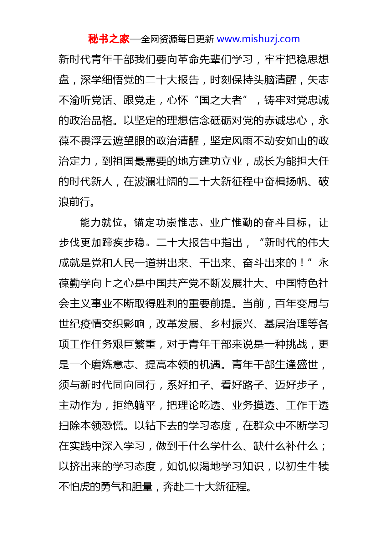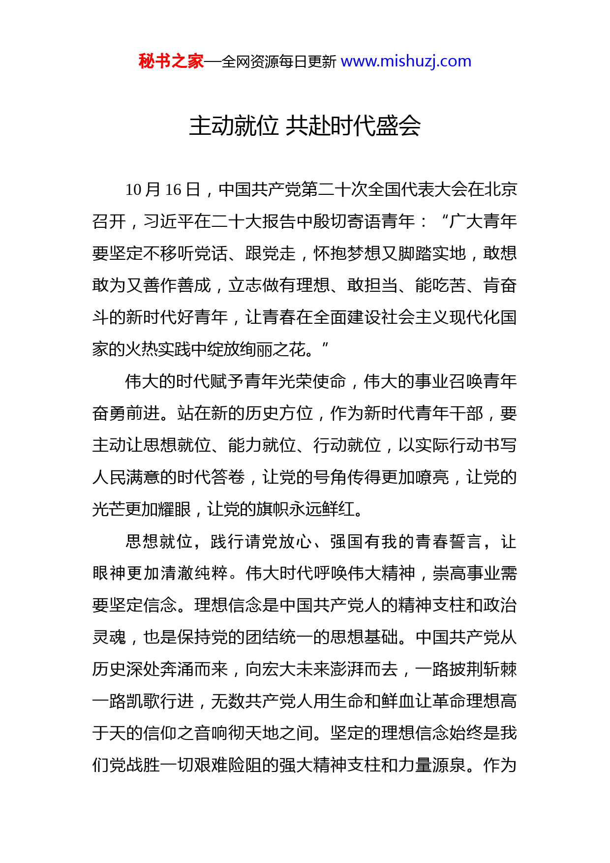 秘书之家—全网资源每日更新www.mishuzj.com主动就位共赴时代盛会10月16日,中国共产党第二十次全国代表大会在北京召开,习近平在二十大报告中殷切寄语青年:“广大青年要坚定不移听党话、跟党走,怀抱梦想又脚踏实地,敢想敢为又善作善成,立志做有理想、敢担当、能吃苦、肯奋斗的新时代好青年,让青春在全面建设社会主义现代化国家的火热实践中绽放绚丽之花。”伟大的时代赋予青年光荣使命,伟大的事业召唤青年奋勇前进。站在新的历史方位,作为新时代青年干部,要主动让思想就位、能力就位、行动就位,以实际行动书写人民满意的时代答卷,让党的号角传得更加嘹亮,让党的光芒更加耀眼,让党的旗帜永远鲜红。思想就位,践行请党放心、强国有我的青春誓言,让眼神更加清澈纯粹。伟大时代呼唤伟大精神,崇高事业需要坚定信念。理想信念是中国共产党人的精神支柱和政治灵魂,也是保持党的团结统一的思想基础。中国共产党从历史深处奔涌而来,向宏大未来澎湃而去,一路披荆斩棘一路凯歌行进,无数共产党人用生命和鲜血让革命理想高于天的信仰之音响彻天地之间。坚定的理想信念始终是我们党战胜一切艰难险阻的强大精神支柱和力量源泉。作为秘书之家—全网资源每日更新www.mishuzj.com新时代青年干部我们要向革命先辈们学习,牢牢把稳思想盘,深学细悟党的二十大报告,时刻保持头脑清醒,矢志不渝听党话、跟党走,心怀“国之大者”,铸牢对党忠诚的政治品格。以坚定的理想信念砥砺对党的赤诚忠心,永葆不畏浮云遮望眼的政治清醒,坚定风雨不动安如山的政治定力,到祖国最需要的地方建功立业,成长为能担大任的时代新人,在波澜壮阔的二十大新征程中奋楫扬帆、破浪前行。能力就位,锚定功崇惟志、业广惟勤的奋斗目标,让步伐更加蹄疾步稳。二十大报告中指出,“新时代的伟大成就是党和人民一道拼出来、干出来、奋斗出来的!”永葆勤学向上之心是中国共产党不断发展壮大、中国特色社会主义事业不断取得胜利的重要前提。当前,百年变局与世纪疫情交织影响,改革发展、乡村振兴、基层治理等各项工作任务艰巨繁重,对于青年干部来说是一种挑战,更是一个磨炼意志、提高本领的机遇。青年干部生逢盛世,须与新时代同向同行,系好扣子、看好路子、迈好步子,主动作为,拒绝躺平,把理论吃透、业务摸透、工作干透扫除本领恐慌。以钻下去的学习态度,在群众中不断学习在实践中深入学习,做到干什么学什么、缺什么补什么;以挤出来的学习态度,如饥似渴地学习知识,以初生牛犊不怕虎的勇气和胆量,奔赴二十大新征程。秘书之家—全网资源每日更新www.mishuzj.com行动就位,厚植我将无我、不负人民的为民情怀,让状态更加朝气蓬勃。有责任有担当,青春才会闪光。在党的二十大报告中,“人民”累计出现了百余次,这足以突显“人民”二字的分量。我们党把全心全意为人民服务作为宗旨。过去五年,中国共产党完成了脱贫攻坚、全面建成小康社会的历史任务,实现第一个百年奋斗目标,向人民、向历史交出了一份优异的答卷。现在,中国共产党团结带领中国人民又踏上了实现第二个百年奋斗目标新的赶考之路。站在高点的新起点上,作为青年干部,干事创业的第一站往往是上面千条线、下面一根针的基层,要用真情服务提升民心温度。在干事创业中解决好我是谁、为了谁、依靠谁的问题,以使命压实担当,在面对面、手拉手心贴心的交流互动中拉近彼此距离,尽心干好每一份工作细心处理好每一个难题,暖心服务好每一位群众。