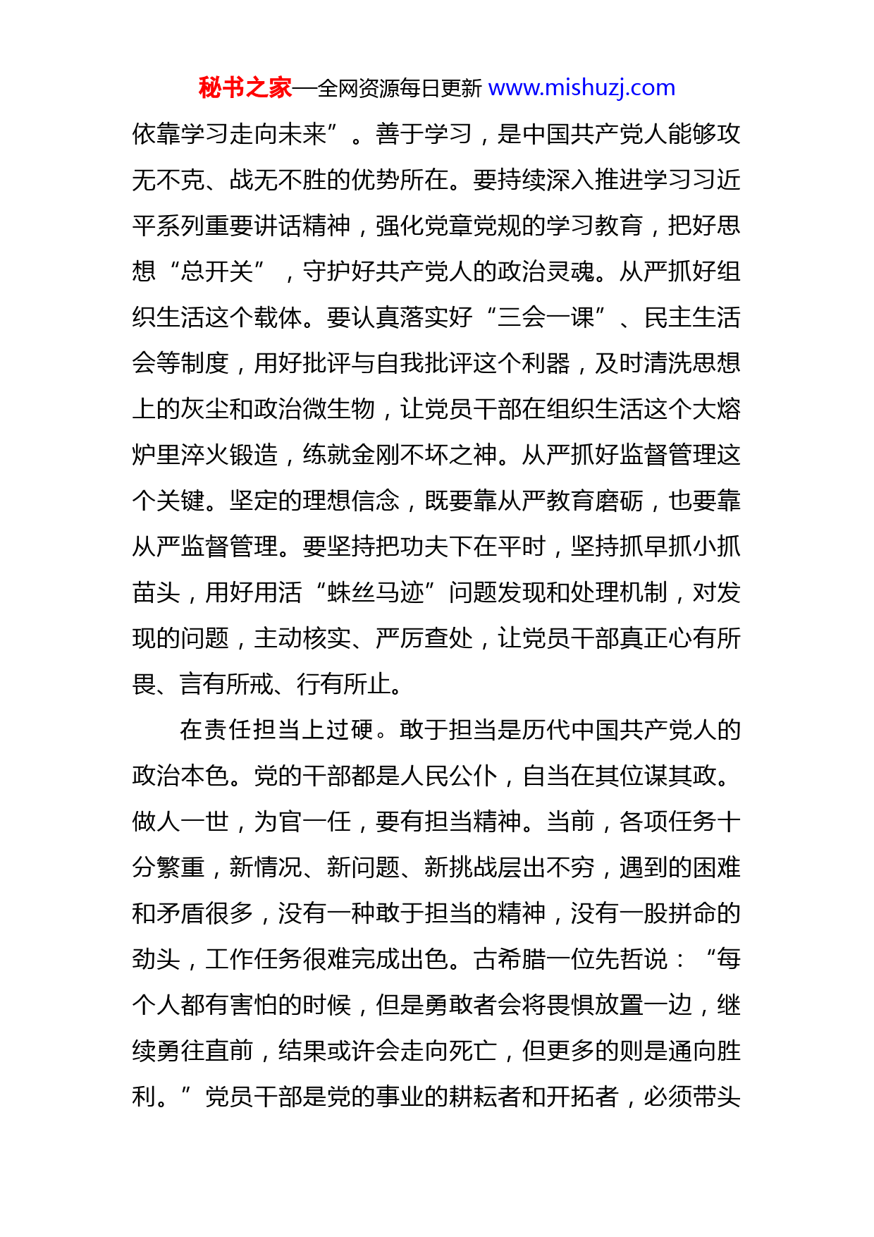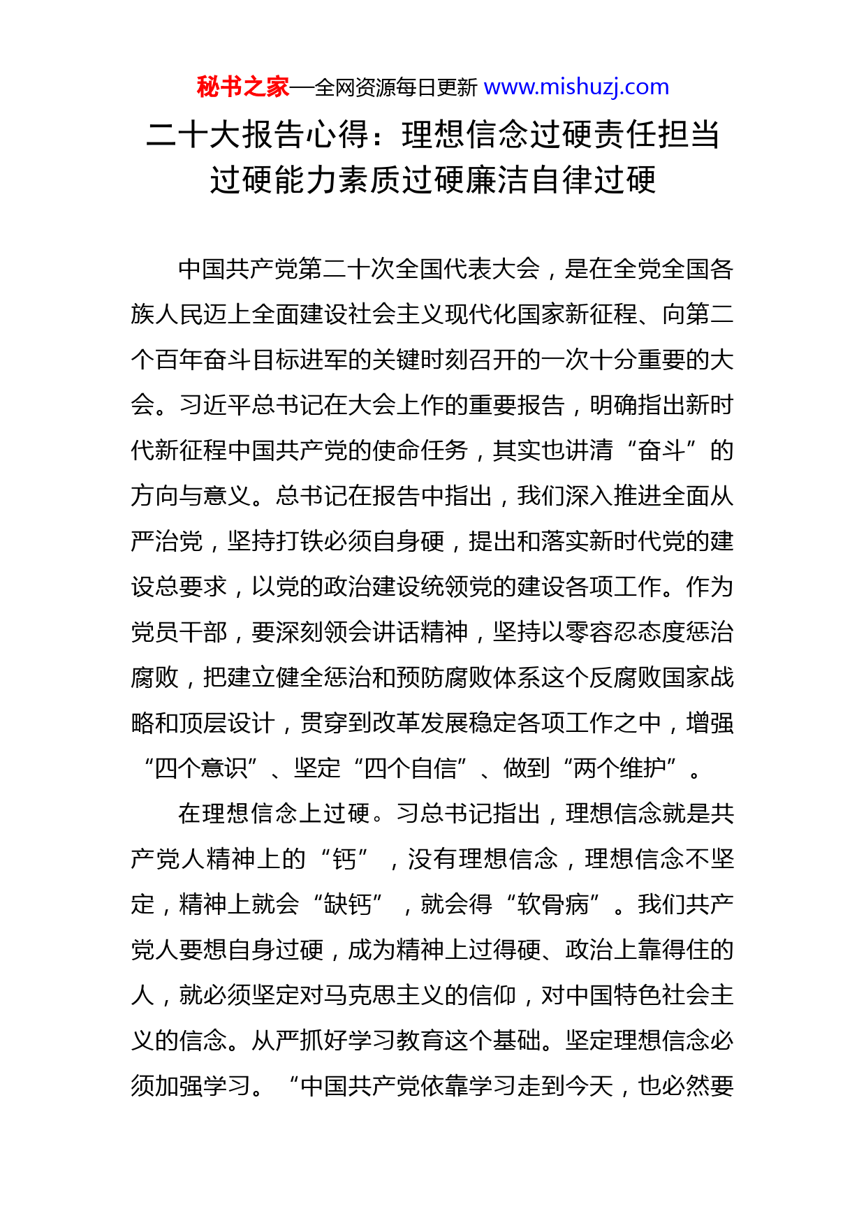 秘书之家—全网资源每日更新www.mishuzj.com二十大报告心得:理想信念过硬责任担当过硬能力素质过硬廉洁自律过硬中国共产党第二十次全国代表大会,是在全党全国各族人民迈上全面建设社会主义现代化国家新征程、向第二个百年奋斗目标进军的关键时刻召开的一次十分重要的大会。习近平总书记在大会上作的重要报告,明确指出新时代新征程中国共产党的使命任务,其实也讲清“奋斗”的方向与意义。总书记在报告中指出,我们深入推进全面从严治党,坚持打铁必须自身硬,提出和落实新时代党的建设总要求,以党的政治建设统领党的建设各项工作。作为党员干部,要深刻领会讲话精神,坚持以零容忍态度惩治腐败,把建立健全惩治和预防腐败体系这个反腐败国家战略和顶层设计,贯穿到改革发展稳定各项工作之中,增强“四个意识”、坚定“四个自信”、做到“两个维护”。在理想信念上过硬。习总书记指出,理想信念就是共产党人精神上的“钙”,没有理想信念,理想信念不坚定,精神上就会“缺钙”,就会得“软骨病”。我们共产党人要想自身过硬,成为精神上过得硬、政治上靠得住的人,就必须坚定对马克思主义的信仰,对中国特色社会主义的信念。从严抓好学习教育这个基础。坚定理想信念必须加强学习。“中国共产党依靠学习走到今天,也必然要秘书之家—全网资源每日更新www.mishuzj.com依靠学习走向未来”。善于学习,是中国共产党人能够攻无不克、战无不胜的优势所在。要持续深入推进学习习近平系列重要讲话精神,强化党章党规的学习教育,把好思想“总开关”,守护好共产党人的政治灵魂。从严抓好组织生活这个载体。要认真落实好“三会一课”、民主生活会等制度,用好批评与自我批评这个利器,及时清洗思想上的灰尘和政治微生物,让党员干部在组织生活这个大熔炉里淬火锻造,练就金刚不坏之神。从严抓好监督管理这个关键。坚定的理想信念,既要靠从严教育磨砺,也要靠从严监督管理。要坚持把功夫下在平时,坚持抓早抓小抓苗头,用好用活“蛛丝马迹”问题发现和处理机制,对发现的问题,主动核实、严厉查处,让党员干部真正心有所畏、言有所戒、行有所止。在责任担当上过硬。敢于担当是历代中国共产党人的政治本色。党的干部都是人民公仆,自当在其位谋其政。做人一世,为官一任,要有担当精神。当前,各项任务十分繁重,新情况、新问题、新挑战层出不穷,遇到的困难和矛盾很多,没有一种敢于担当的精神,没有一股拼命的劲头,工作任务很难完成出色。古希腊一位先哲说:“每个人都有害怕的时候,但是勇敢者会将畏惧放置一边,继续勇往直前,结果或许会走向死亡,但更多的则是通向胜利。”党员干部是党的事业的耕耘者和开拓者,必须带头秘书之家—全网资源每日更新www.mishuzj.com弘扬大无畏的担当精神,迎难而上,知难而进。大事难事见担当,困境逆境显襟怀。作为党员干部必须要事不避难、奋勇向前,以逢山开路、遇河架桥的精神,在难题面前敢闯敢试,在矛盾面前敢抓敢管,方能战胜挑战,赢得机遇,不断开创事业发展新局面。在能力素质上过硬。党员是党的细胞,党员队伍建设是党的建设的基础,党员队伍的状况决定着党的作用和力量。党员能力素质的优劣,在党内关系到党的性质和战斗力,在党外影响着党的形象和凝聚力。强化主动学习意识。全面加强对党的创新理论和习总书记系列重要讲话精神的学习,不断对思想“总开关”改造,持续深化理论武装,辨明是非、锤炼党性、提升素养,切实武装头脑指导工作。强化能力危机意识。要着眼长远想事谋事,立足当前干事成事,保持本领的恐慌感、能力的危机感。学如逆水行舟,不进则退。要保持如坐针毡、寝食难安的紧张状态,与上级比差距、与同级比不足、与下级比奉献,少一点安逸感、满足感、荣誉感,谨小慎微全面过硬。强化创新意识。惟创新者进,惟创新者强,惟创新者胜。党员干部是部队建设的中坚力量,必须在创新中走前列、思变中当样板、求进中当楷模,凡是利于部队建设科学发展,官兵进步全面成才,就要大气魄、大阔步、大尺度展开,坚决杜绝畏首畏尾、裹脚不前。要具备战略眼光和创新思秘书之家—全网资源每日更新www.mishuzj.com维,于高处下笔,于新处着手,真正不为传统模式所扰,不为条条框框所限,不为地域思维所惑,力使求变创新入脑入心根深蒂固。在廉洁自律上过硬。习总书记多次讲,推进党的事业,必须抓住领导干部这个“关键少数”。“关键少数”的关键是以身作则,在廉洁自律上做出好样子。《论语》道:“其身正,不令而行;其身不正,虽令不从”。领导干部的一言一行,群众都看在眼里、记在心里。筑牢防线。作为党员领导干部,处在权力核心,筑牢思想防线,就要经得住诱惑、耐得住寂寞、守得住底线,做到功名利禄心不动、灯红酒绿眼不迷、不义之财手不伸。就要时刻警醒“高官”与“高墙”只因一念之差、“做官”与“坐牢”只是一步之遥,严守为官从政的戒律。防微杜渐。哪怕是一件极为微小的事情,只要是与廉洁自律相违背,那就坚决不能干。只有先从小处着手,才能从大处防变。千里之堤,溃于蚁穴。必须时时刻刻把握住自己,认真做好每一件小事,管好每一个小节,防微杜渐,洁身自好,防患于未然。树好形象。坚持带头遵规守纪。要求别人做到