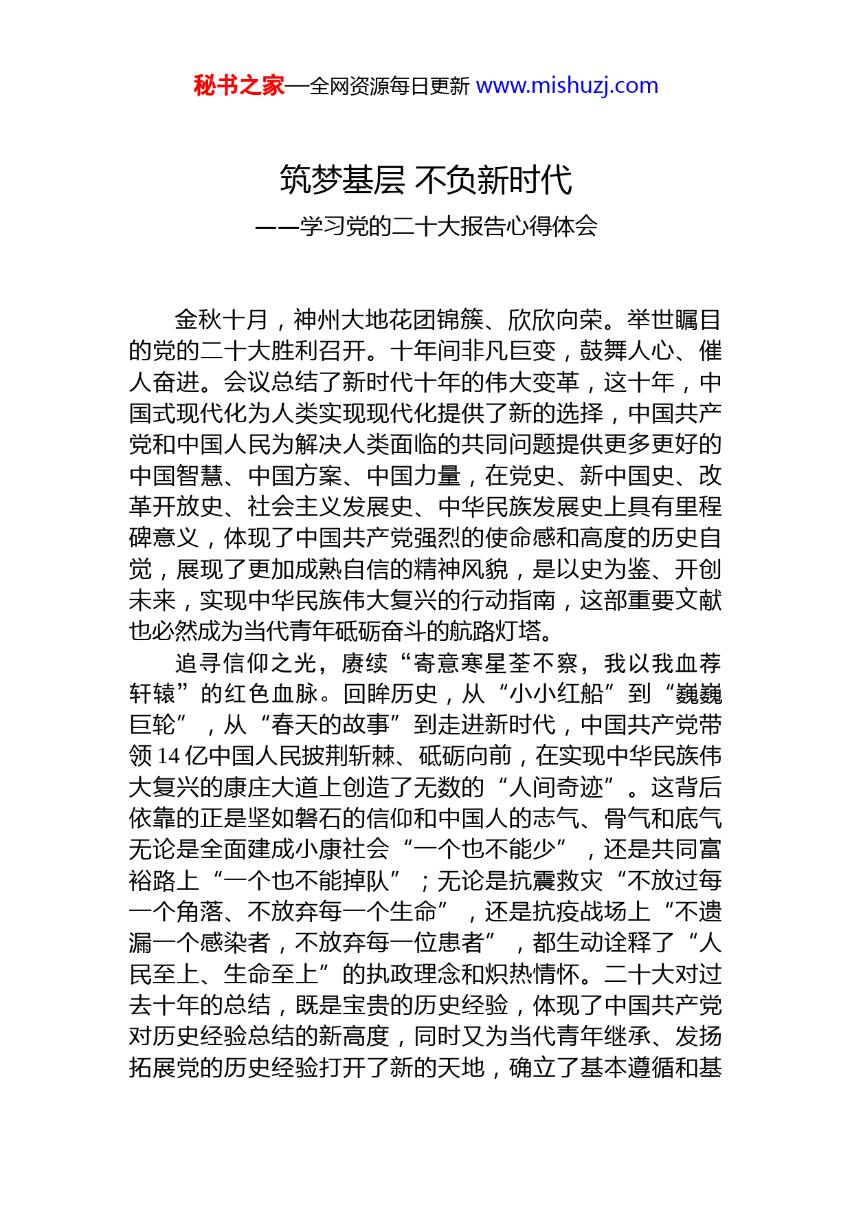 秘书之家—全网资源每日更新www.mishuzj.com筑梦基层不负新时代——学习党的二十大报告心得体会金秋十月,神州大地花团锦簇、欣欣向荣。举世瞩目的党的二十大胜利召开。十年间非凡巨变,鼓舞人心、催人奋进。会议总结了新时代十年的伟大变革,这十年,中国式现代化为人类实现现代化提供了新的选择,中国共产党和中国人民为解决人类面临的共同问题提供更多更好的中国智慧、中国方案、中国力量,在党史、新中国史、改革开放史、社会主义发展史、中华民族发展史上具有里程碑意义,体现了中国共产党强烈的使命感和高度的历史自觉,展现了更加成熟自信的精神风貌,是以史为鉴、开创未来,实现中华民族伟大复兴的行动指南,这部重要文献也必然成为当代青年砥砺奋斗的航路灯塔。追寻信仰之光,赓续“寄意寒星荃不察,我以我血荐轩辕”的红色血脉。回眸历史,从“小小红船”到“巍巍巨轮”,从“春天的故事”到走进新时代,中国共产党带领14亿中国人民披荆斩棘、砥砺向前,在实现中华民族伟大复兴的康庄大道上创造了无数的“人间奇迹”。这背后依靠的正是坚如磐石的信仰和中国人的志气、骨气和底气无论是全面建成小康社会“一个也不能少”,还是共同富裕路上“一个也不能掉队”;无论是抗震救灾“不放过每一个角落、不放弃每一个生命”,还是抗疫战场上“不遗漏一个感染者,不放弃每一位患者”,都生动诠释了“人民至上、生命至上”的执政理念和炽热情怀。二十大对过去十年的总结,既是宝贵的历史经验,体现了中国共产党对历史经验总结的新高度,同时又为当代青年继承、发扬拓展党的历史经验打开了新的天地,确立了基本遵循和基秘书之家—全网资源每日更新www.mishuzj.com本框架。作为基层工作者,更要追寻信仰之光,赓续红色血脉,无论在何种情境下,都要将强大的理想信念汇聚成一往无前的“钢铁洪流”,积极投身到基层的火热实践场上,努力创造新时代的更大荣光。追寻奋斗之光,淬炼“黄沙百战穿金甲,不破楼兰终不还”的奋勇担当。这十年,作为基层工作者,我们见证了许多发展的奇迹。从打赢脱贫攻坚战让近1亿人口摘掉绝对贫困的帽子,到全面建成小康社会让千年梦想照进现实全面建设社会主义现代化国家新征程顺利开启,国家经济实力、科技实力、综合国力跃上新台阶……感天动地的奋斗史诗、震古烁今的伟大成就,书写在民族复兴的伟大征程上,刻印在中华儿女的共同记忆中。作为基层工作者,我曾有无数个日日夜夜与广大村民朋友们奋战在乡村振兴第一线,近年来,我村在党的引领下,陆续发展了玻璃栈道、特色民宿、等产业,看到广大群众生活日益向好,更加坚定了我们永远跟党走、一心谋发展的信心和决心。未来,我们村将继续坚持党建引领乡村振兴,积极调整产业结构,做强文旅、加工、种养等特色产业,进一步增强文化自信,促进文化繁荣,以充足的干劲、有力的举措、扎实的作风奋力奔向下一个五年。追寻奉献之光,汲取“踏平坎坷成大道,斗罢艰险又出发”的实干精神。党的百年奋斗表明,建成社会主义现代化强国,实现中华民族伟大复兴,是一场接力跑,需要一棒接着一棒跑下去,每一代人都为下一代人跑出一个好成绩。不忘初心,方得始终。中国共产党立志于中华民族千秋伟业,百年恰是风华正茂。过去百年,党向人民、向历史交出了一份优异的答卷。对于基层工作者来说,学习贯彻党的二十大精神,最关键的是要落实到本职岗位上和具体行动中。新征程路上,面对各种风险挑战,只有提升思想境界,胸怀国之大者,永葆奉献精神,始终把国家和秘书之家—全网资源每日更新www.mishuzj.com人民的利益放在首位,立足岗位、脚踏实地,把“小我”融入“大我”,把个人梦想融入国家发展、时代进步的大潮中,努力在“风雨的洗礼”中昂首阔步,才能迈向未来续写民族新诗篇。伟大成就振奋人心,历史使命催人奋进。站在新的历史起点上,我们更要积极响应党中央号召,更加紧密地团结在以习近平同志为核心的党中央周围,清心溯源、不忘本来,筑牢信仰之基,厚植爱国情怀,主动发挥农村基层工作人员主观能动性,埋头苦干,从自身做起,从点滴做起,用勤劳的双手、一流的业绩成就属于自己的人生精彩以实际行动助力乡村振兴发展,助力全面建成小康伟大目标实现。