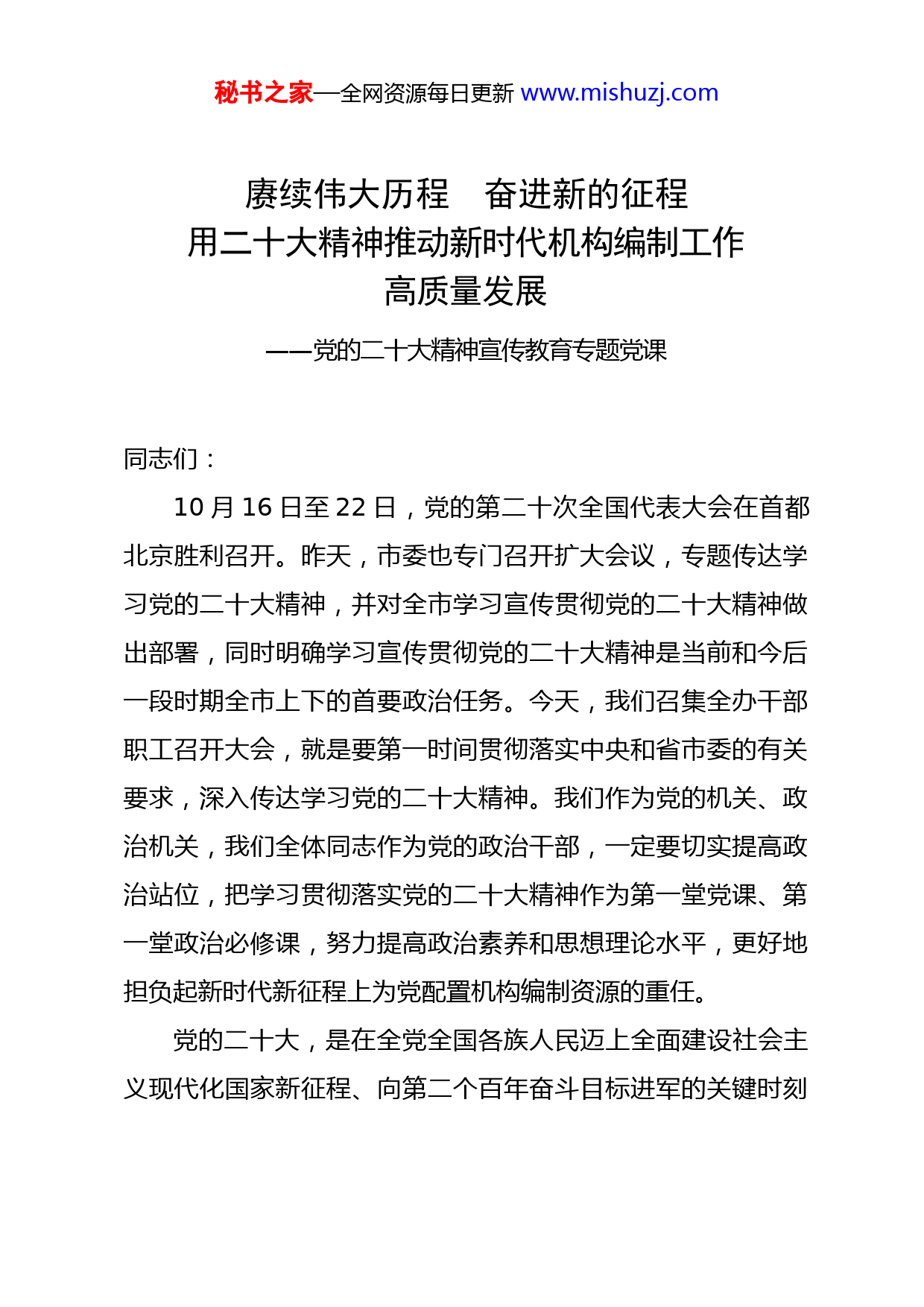 秘书之家—全网资源每日更新www.mishuzj.com赓续伟大历程奋进新的征程用二十大精神推动新时代机构编制工作高质量发展——党的二十大精神宣传教育专题党课同志们:10月16日至22日,党的第二十次全国代表大会在首都北京胜利召开。昨天,市委也专门召开扩大会议,专题传达学习党的二十大精神,并对全市学习宣传贯彻党的二十大精神做出部署,同时明确学习宣传贯彻党的二十大精神是当前和今后一段时期全市上下的首要政治任务。今天,我们召集全办干部职工召开大会,就是要第一时间贯彻落实中央和省市委的有关要求,深入传达学习党的二十大精神。我们作为党的机关、政治机关,我们全体同志作为党的政治干部,一定要切实提高政治站位,把学习贯彻落实党的二十大精神作为第一堂党课、第一堂政治必修课,努力提高政治素养和思想理论水平,更好地担负起新时代新征程上为党配置机构编制资源的重任。党的二十大,是在全党全国各族人民迈上全面建设社会主义现代化国家新征程、向第二个百年奋斗目标进军的关键时刻秘书之家—全网资源每日更新www.mishuzj.com召开的一次十分重要的大会。这次大会全面回顾了过去五年的工作和新时代十年的伟大变革,总结了马克思主义中国化时代化取得的重大理论创新成果,提出了新时代新征程中国共产党人的使命任务,发出了为全面建设社会主义现代化国家、全面推进中华民族伟大复兴而团结奋斗的动员令。大会选举产生二十届中央委员会和中央纪律检查委员会,为推动党和国家事业发展提供了坚强政治保证和组织保证。大会开得非常成功,是一次不忘初心、牢记使命、高举旗帜、团结奋进的大会,在中国特色社会主义事业发展进程中具有划时代的里程碑意义。学习贯彻党的二十大精神,重点要在学习报告、学习党章上下功夫,学深悟透、融会贯通,结合实际落实好党的二十大对各项工作的新要求新部署。下面,主要和大家交流三个方面。一、把握精神实质,完整准确全面地领会二十大报告的核心要义党的二十大精神,集中体现在总书记所作的工作报告中。报告主题鲜明、举旗定向,气势磅礴、激荡人心,擘画了以中国式现代化全面推进中华民族伟大复兴的宏伟蓝图,进一步指明了党和国家事业的前进方向,是一篇闪耀着马克思主义真理光芒的纲领性文献,是我们党迈进新时代、开启新征程、续写秘书之家—全网资源每日更新www.mishuzj.com新篇章的政治宣言和行动指南,给人以信仰的感召、方向的指引、前进的力量、胜利的信心。报告共分15个部分,前3个部分讲成就经验、指导思想、使命任务,对过去五年工作和新时代十年的伟大变革进行了总结,作出了开辟马克思主义中国化时代化新境界的重要论断,提出了新时代新征程的历史使命,明确了以中国式现代化全面推进中华民族伟大复兴的战略部署,提出了基本实现社会主义现代化、建成富强民主文明和谐美丽的社会主义现代化强国的阶段性安排;从第4个部分开始,由经济到党建,分章作出战略部署。报告提出了一系列新思想新论断新部署,与会代表高度认同,在近2个小时的报告过程中,掌声一次次回荡在雄伟的人民大会堂。我们在聆听报告时,也能切身感受到,掌声就是党和人民的心声,就是凝聚力和向心力,充分反映了全党全军全国各族人民对习总书记的衷心拥戴,对党和国家事业发展历史性成就的无比自豪,对全面建设社会主义现代化国家、全面推进中华民族伟大复兴的坚定信心。学习党的二十大报告,我觉得要准确把握好6个方面的精神实质。第一,准确把握报告的鲜明主题。党的二十大报告的主题是,高举中国特色社会主义伟大旗帜,全面贯彻新时代中国特色社会主义思想,弘扬伟大建党精神,自信自强、守正创新,秘书之家—全网资源每日更新www.mishuzj.com踔厉奋发、勇毅前行,为全面建设社会主义现代化国家、全面推进中华民族伟大复兴而团结奋斗。这是大会的方向和灵魂,明确宣示我们党举什么旗、走什么路、以什么样的精神状态、担负什么样的历史使命、实现什么样的奋斗目标。报告指出,中国共产党已走过百年奋斗历程。我们党立志于中华民族千秋伟业,致力于人类和平与发展崇高事业,责任无比重大,使命无上光荣。全党同志务必不忘初心、牢记使命,务必谦虚谨慎、艰苦奋斗,务必敢于斗争、善于斗争,坚定历史自信,增强历史主动,谱写新时代中国特色社会主义更加绚丽的华章。我们要深刻理解和牢牢把握这个主题,始终牢记“三个务必”,立足本职工作,始终保持永不懈怠的精神状态和一往无前的奋斗姿态,在实现中华民族伟大复兴的宏伟目标进程中展现应有的作为,作出应有的贡献。第二,准确把握过去五年的工作和新时代10年伟大变革的重要意义。党的二十大报告从理论创新、党的领导、战略部署、脱贫攻坚、新发展理念、全面深化改革等十六个方面,对新时代十年党和国家事业取得的历史性成就、发生的历史性变革进行总结和概括。习近平总书记在报告中指出,十九大以来的五年,党中央统筹中华民族伟大复兴战略全局和世界百年未有之大变局,就党和国家事业发展作出重大战略部署,团结带秘书之家—全网资源每日更新www.mishuzj.com领全党全军全国各族人民有效应对严岭复杂的国际形势和接踵而至的巨大风险挑战,以奋发有为的精神把新时代中国