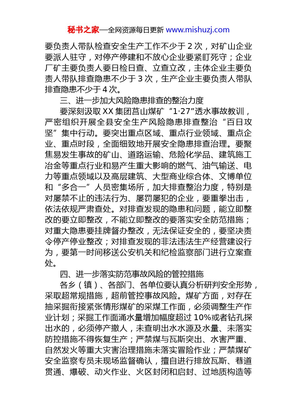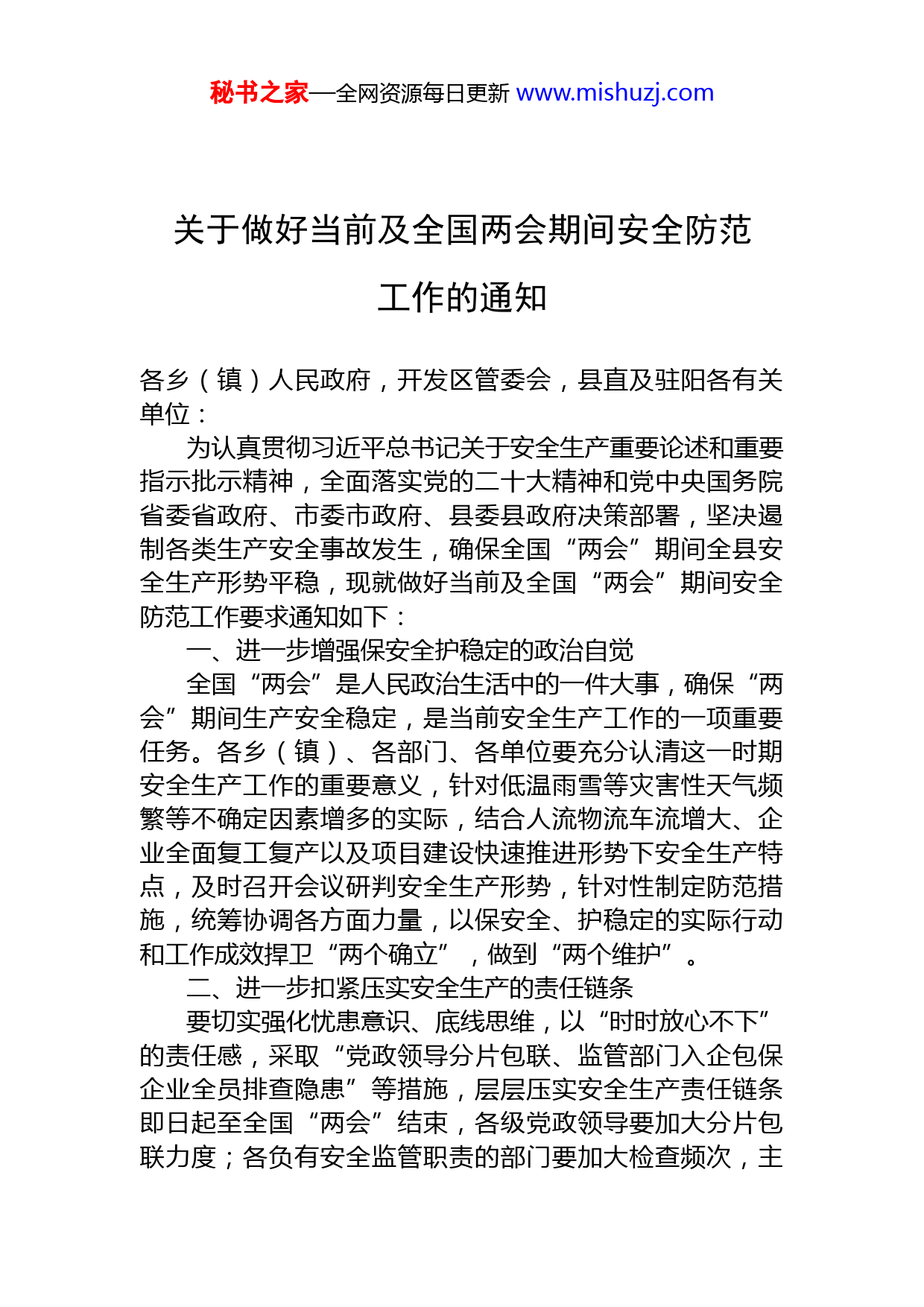 秘书之家—全网资源每日更新www.mishuzj.com关于做好当前及全国两会期间安全防范工作的通知各乡(镇)人民政府,开发区管委会,县直及驻阳各有关单位:为认真贯彻习近平总书记关于安全生产重要论述和重要指示批示精神,全面落实党的二十大精神和党中央国务院省委省政府、市委市政府、县委县政府决策部署,坚决遏制各类生产安全事故发生,确保全国“两会”期间全县安全生产形势平稳,现就做好当前及全国“两会”期间安全防范工作要求通知如下:一、进一步增强保安全护稳定的政治自觉全国“两会”是人民政治生活中的一件大事,确保“两会”期间生产安全稳定,是当前安全生产工作的一项重要任务。各乡(镇)、各部门、各单位要充分认清这一时期安全生产工作的重要意义,针对低温雨雪等灾害性天气频繁等不确定因素增多的实际,结合人流物流车流增大、企业全面复工复产以及项目建设快速推进形势下安全生产特点,及时召开会议研判安全生产形势,针对性制定防范措施,统筹协调各方面力量,以保安全、护稳定的实际行动和工作成效捍卫“两个确立”,做到“两个维护”。二、进一步扣紧压实安全生产的责任链条要切实强化忧患意识、底线思维,以“时时放心不下”的责任感,采取“党政领导分片包联、监管部门入企包保企业全员排查隐患”等措施,层层压实安全生产责任链条即日起至全国“两会”结束,各级党政领导要加大分片包联力度;各负有安全监管职责的部门要加大检查频次,主秘书之家—全网资源每日更新www.mishuzj.com要负责人带队检查安全生产工作不少于2次,对矿山企业要派人驻守,对停产停建和不放心企业要紧盯死守;企业厂矿主要负责人要日检日查、立查立改,主体企业主要负责人带队排查隐患不少于3次,生产企业主要负责人带队排查隐患不少于4次。三、进一步加大风险隐患排查的整治力度要深刻汲取XX集团莒山煤矿“1·27”透水事故教训,严密组织开展全县安全生产风险隐患排查整治“百日攻坚”集中行动。要突出重点区域、重点行业领域、重点企业、重点时段,全面细致地开展安全隐患排查治理。要聚焦易发生事故的矿山、道路运输、危险化学品、建筑施工冶金等重点行业和易产生重大影响的燃气、油气输送、电力等重点领域以及高层建筑、大型商业综合体、文博单位和“多合一”人员密集场所,加大排查整治力度,特别是对屡禁不止的违法行为、屡罚屡犯的企业,要重拳出击,依法依规严肃查处。对排查发现的隐患和问题,能立即整改的要立即整改,不能立即整改的要落实安全防范措施;对重大隐患要挂牌督办整改,无法保证安全的,要坚决责令停产停业整改;对排查发现的非法违法生产经营建设行为,要第一时间移送公安机关和纪检监察部门进行立案查处。四、进一步落实防范事故风险的管控措施各乡(镇)、各部门、各单位要认真分析研判安全形势,采取超常规措施,超前管控事故风险。煤矿方面,对存在抽采掘衔接紧张情形煤矿的采煤工作面,必须调整生产作业计划;采掘工作面涌水量增加幅度超过10%或者钻孔探出水的,必须停产撤人,未查明出水水源及水量、未落实防控措施不得恢复生产;严禁煤与瓦斯突出、水害严重、自然发火等重大灾害治理措施未落实冒险作业;严禁煤矿安全监察专员未现场监督确认,擅自进行排放瓦斯、巷道贯通、爆破、动火作业、火区封闭和启封、过地质构造等秘书之家—全网资源每日更新www.mishuzj.com关键作业,“两会”期间所有煤矿一律暂停搬家倒面。危险化学品方面,“两会”期间原则上不得进行开停车和组织试生产,不得安排高空、动火、受限空间等特殊作业和检维修作业,紧急情况确需开展的,必须按照重大事项向监管部门上报审批,企业负责人要全程在场,盯紧看牢。冶金方面,“两会”期间禁止对高炉、转炉、煤气柜等重点设备设施进行检维修和各类高风险作业。交通运输方面从严审批和监管危化品运输,严禁极端天气下运输危化品坚决停止公路运输铁水包作业,持续加大“两客一危一货”车辆和桥梁、隧道等重点路段的管控力度,严查重处农村“双违”、酒驾醉驾、“三超一疲劳”等严重违法行为。建筑施工方面,“两会”期间原则上停止高支模、深基坑、起重机械、脚手架等危险性较大的工程,确需施工的,必须升级管控措施,按照“谁签字、谁负责”的原则全程盯守管控。城镇燃气方面,对存在占压、安全距离不足、随意交叉穿越等隐患风险的燃气管道和未安装燃气报警装置的餐饮经营单位要坚决停止运营。文化旅游方面,对所有旅游景区的索道、大型游乐设施设备和文化场所内电梯、大功率电器等进行全面检查,对不符合安全要求的要坚决停止运营和使用。地质灾害方面,当前正处于融冻期,要重点围绕紧邻高陡边坡的村庄、工矿企业、居民区中小学校舍等人口稠密区域,以及公路铁路沿线和在建工程设施等开展春季地质灾害隐患排查,做到每点必查、不留死角,按照“谁引发、谁治理”原则,及时整改落实;对一时无法处理的地质灾害隐患要造册登记,落实好地质灾害点监测责任人,针对性编制“防、抢、撤”预案,加强监测预警;对威胁人民群众生命财产安全的,要第一时间开展工程治理和避险转移。森林防火方面,针对春季森林火险的形势特点,认真开展清坟边、清(耕)地边、