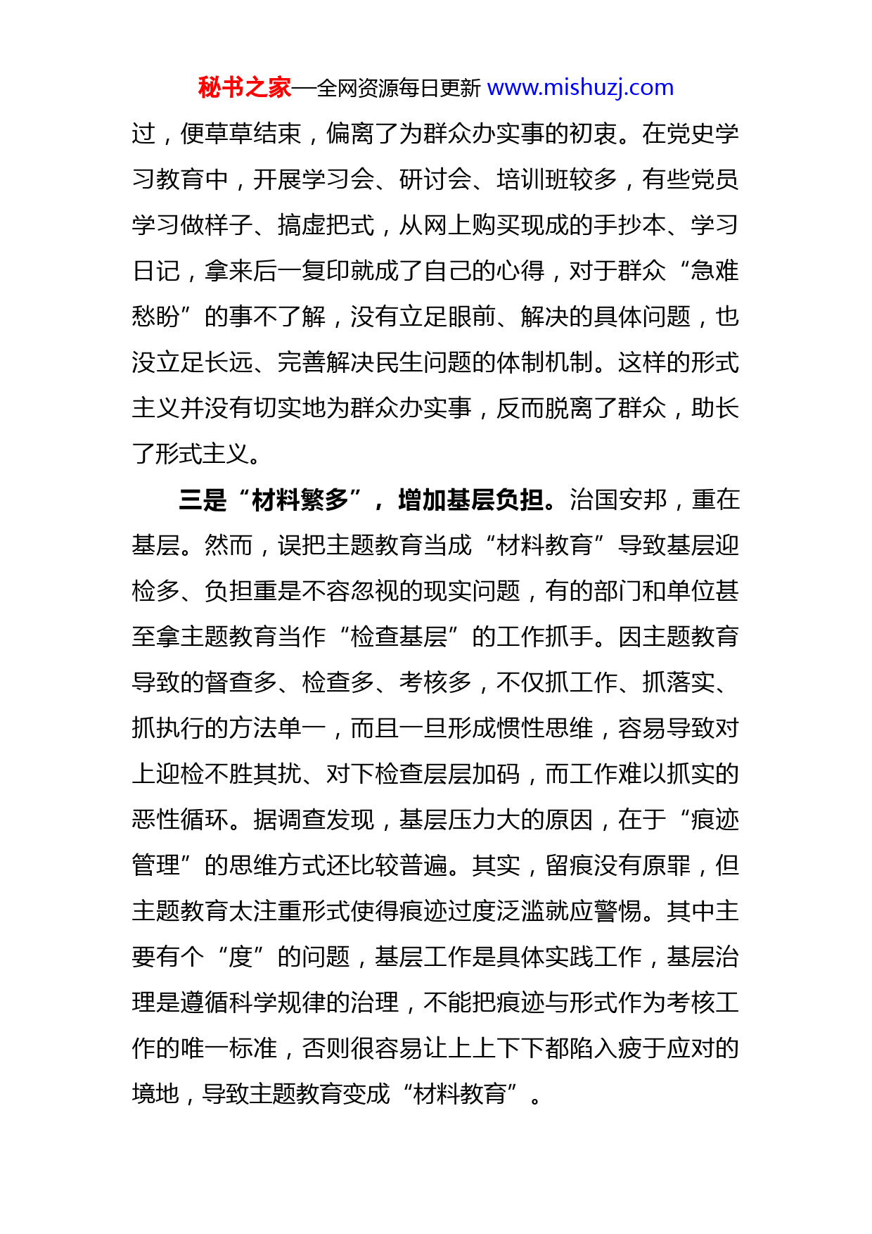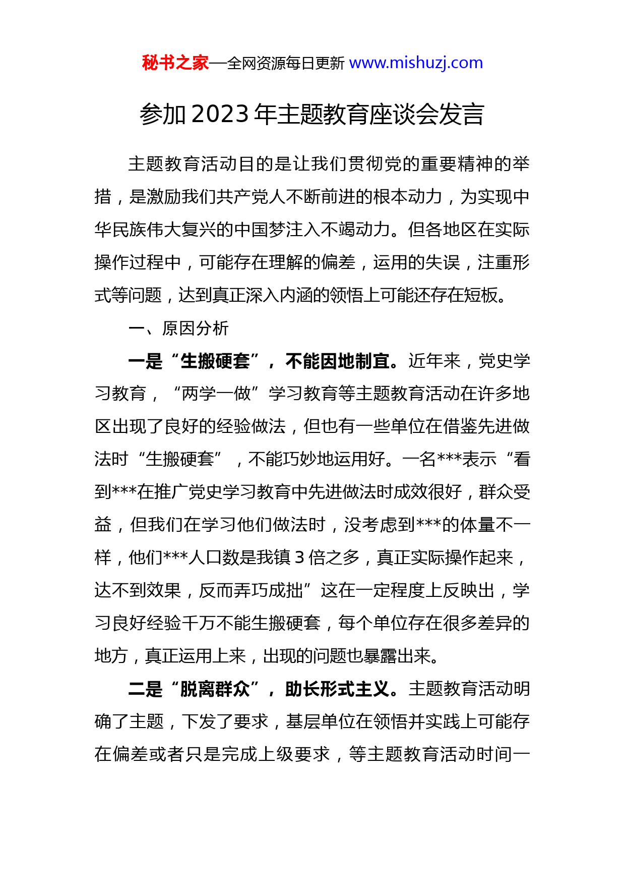 秘书之家—全网资源每日更新www.mishuzj.com参加2023年主题教育座谈会发言主题教育活动目的是让我们贯彻党的重要精神的举措,是激励我们共产党人不断前进的根本动力,为实现中华民族伟大复兴的中国梦注入不竭动力。但各地区在实际操作过程中,可能存在理解的偏差,运用的失误,注重形式等问题,达到真正深入内涵的领悟上可能还存在短板。一、原因分析一是“生搬硬套”,不能因地制宜。近年来,党史学习教育,“两学一做”学习教育等主题教育活动在许多地区出现了良好的经验做法,但也有一些单位在借鉴先进做法时“生搬硬套”,不能巧妙地运用好。一名表示“看到在推广党史学习教育中先进做法时成效很好,群众受益,但我们在学习他们做法时,没考虑到的体量不一样,他们人口数是我镇3倍之多,真正实际操作起来,达不到效果,反而弄巧成拙”这在一定程度上反映出,学习良好经验千万不能生搬硬套,每个单位存在很多差异的地方,真正运用上来,出现的问题也暴露出来。二是“脱离群众”,助长形式主义。主题教育活动明确了主题,下发了要求,基层单位在领悟并实践上可能存在偏差或者只是完成上级要求,等主题教育活动时间一秘书之家—全网资源每日更新www.mishuzj.com过,便草草结束,偏离了为群众办实事的初衷。在党史学习教育中,开展学习会、研讨会、培训班较多,有些党员学习做样子、搞虚把式,从网上购买现成的手抄本、学习日记,拿来后一复印就成了自己的心得,对于群众“急难愁盼”的事不了解,没有立足眼前、解决的具体问题,也没立足长远、完善解决民生问题的体制机制。这样的形式主义并没有切实地为群众办实事,反而脱离了群众,助长了形式主义。三是“材料繁多”,增加基层负担。治国安邦,重在基层。然而,误把主题教育当成“材料教育”导致基层迎检多、负担重是不容忽视的现实问题,有的部门和单位甚至拿主题教育当作“检查基层”的工作抓手。因主题教育导致的督查多、检查多、考核多,不仅抓工作、抓落实、抓执行的方法单一,而且一旦形成惯性思维,容易导致对上迎检不胜其扰、对下检查层层加码,而工作难以抓实的恶性循环。据调查发现,基层压力大的原因,在于“痕迹管理”的思维方式还比较普遍。其实,留痕没有原罪,但主题教育太注重形式使得痕迹过度泛滥就应警惕。其中主要有个“度”的问题,基层工作是具体实践工作,基层治理是遵循科学规律的治理,不能把痕迹与形式作为考核工作的唯一标准,否则很容易让上上下下都陷入疲于应对的境地,导致主题教育变成“材料教育”。秘书之家—全网资源每日更新www.mishuzj.com二、意见建议一是打消“上下左右一个样”的顾虑。在别的地区形成了很多好的经验做法,可以借鉴,但借鉴不等于照抄照搬,必须把握特殊性、增强针对性。领导干部发挥“领头雁”的作用尤为关键,针对不同层级、不同领域、不同对象,采取分众化、差异化、互动化方式,对主题教育内容要求、组织方式等作出制度性安排,既保证全覆盖,又增强针对性和实效性,切实推动主题教育从“有形”向“有效”转变。二是打消“关起门来搞教育”的顾虑。主题教育搞得好不好,人民群众看得最清楚、感受最真切。让群众参与进来,要打开“门”听取意见,坚持“面对面”与“背靠背”相结合,真正把话题说开、把问题检准,把为民办实事,提升群众幸福感、安全感、获得感作为检验主题教育成果的“试金石”,对群众不满意的要及时“返工补课”,决不能草草收场,切实让人民群众享受到主题教育带来的“红利”。三是打消“材料教育增负担”的顾虑。要控制好“量”,主题教育不是“材料教育”,盲目追求数量,出现“文山会海”等问题,势必造成形式主义,要坚持举措服从主题、形式服务内容、材料服务实效。不做表面文章,不搞防止单纯抢时间、赶进度,避免搞形式上的“花秘书之家—全网资源每日更新www.mishuzj.com样翻新”,切实做一件、实一件、成一件,让基层党员干部有更多的时间来抓学习、抓整改、抓落实,把更多精力用于服务群众、推动发展上。